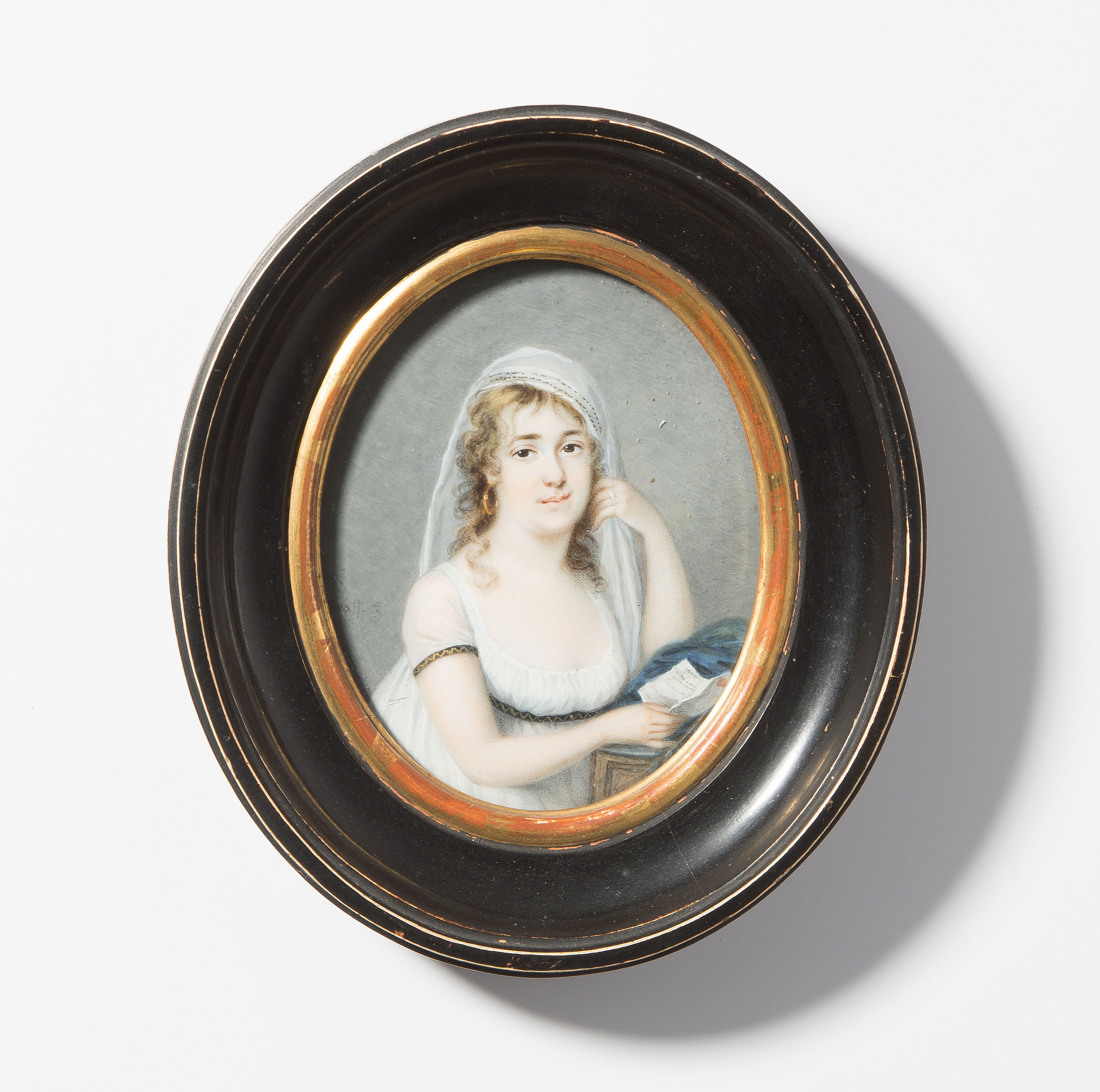 19.Jh. Gouachemalerei auf Elfenbein. Links sign. Graff f. (Anton Graff, Winterthur 1736–1813 Dresden). Darstellung einer jungen Dame in weissem, dekolletiertem Kleid mit feinem Tüllschleier, einen Brief in ihrer rechten Hand haltend. Rückseitig Inschrift: Johanna Burckhard, geb. Ryhner 4.Juni 1769 – 20. Juli 1823. Gerahmt. 6,2x7,7 cm.