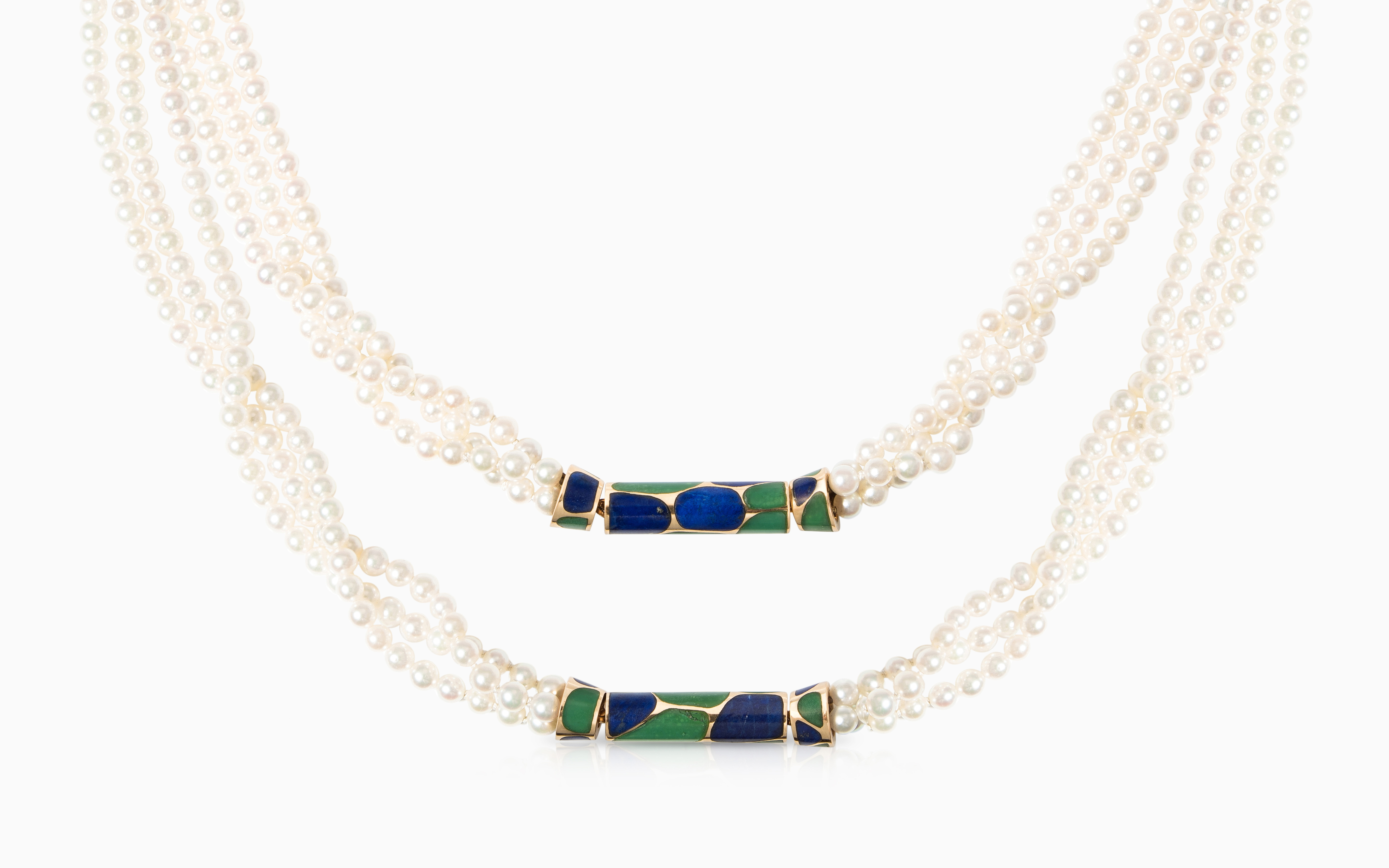 Juwelier Binder, Zürich. 1980er Jahre. 750 Gebgold. 4 Sautoirs aus Akoyaperlen Ø 4 mm, Zylinderförmige Zierstücke mit eingeschliffenem Lapislazuli und Chrysopras. L ca. 84 cm.