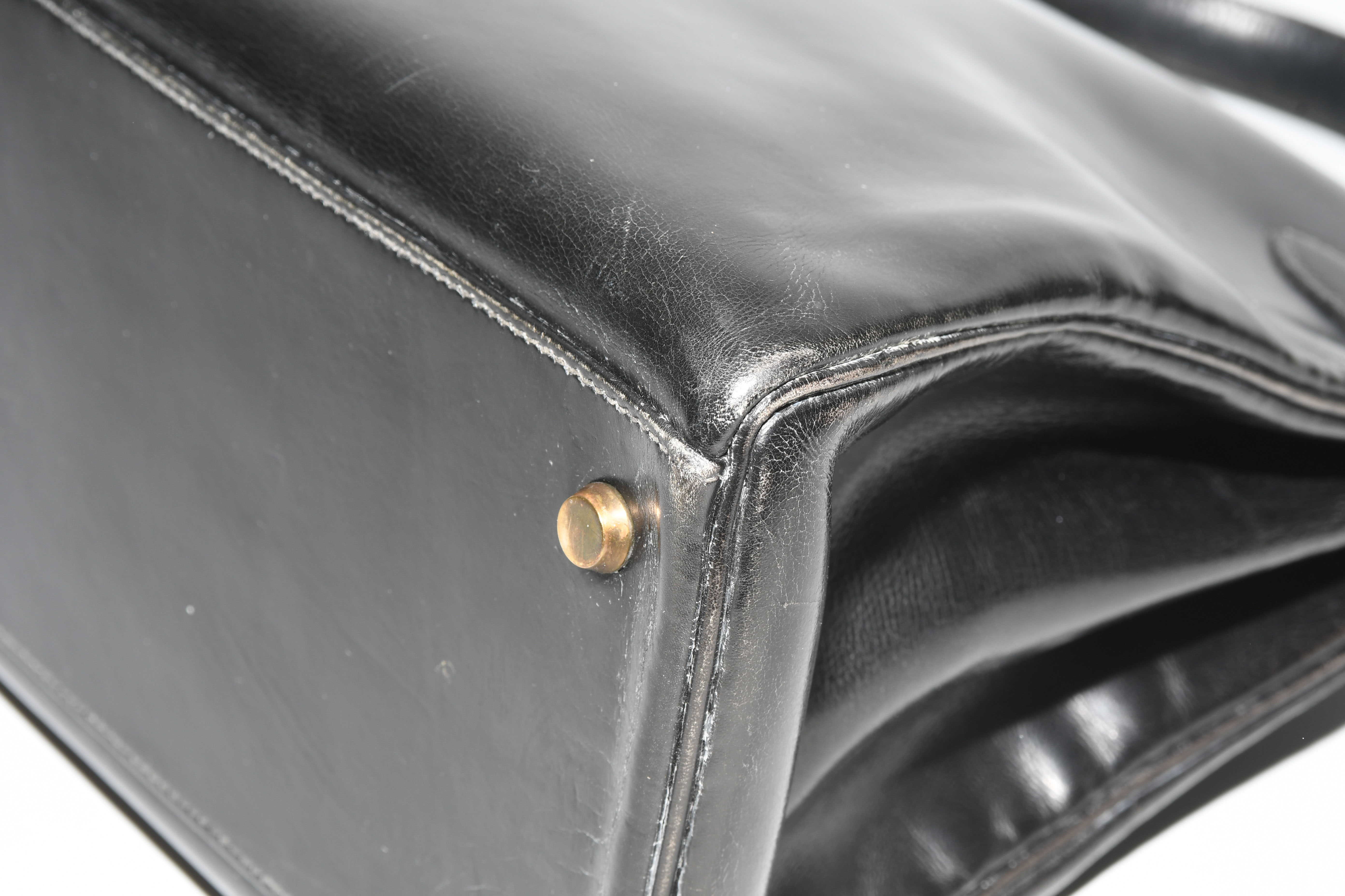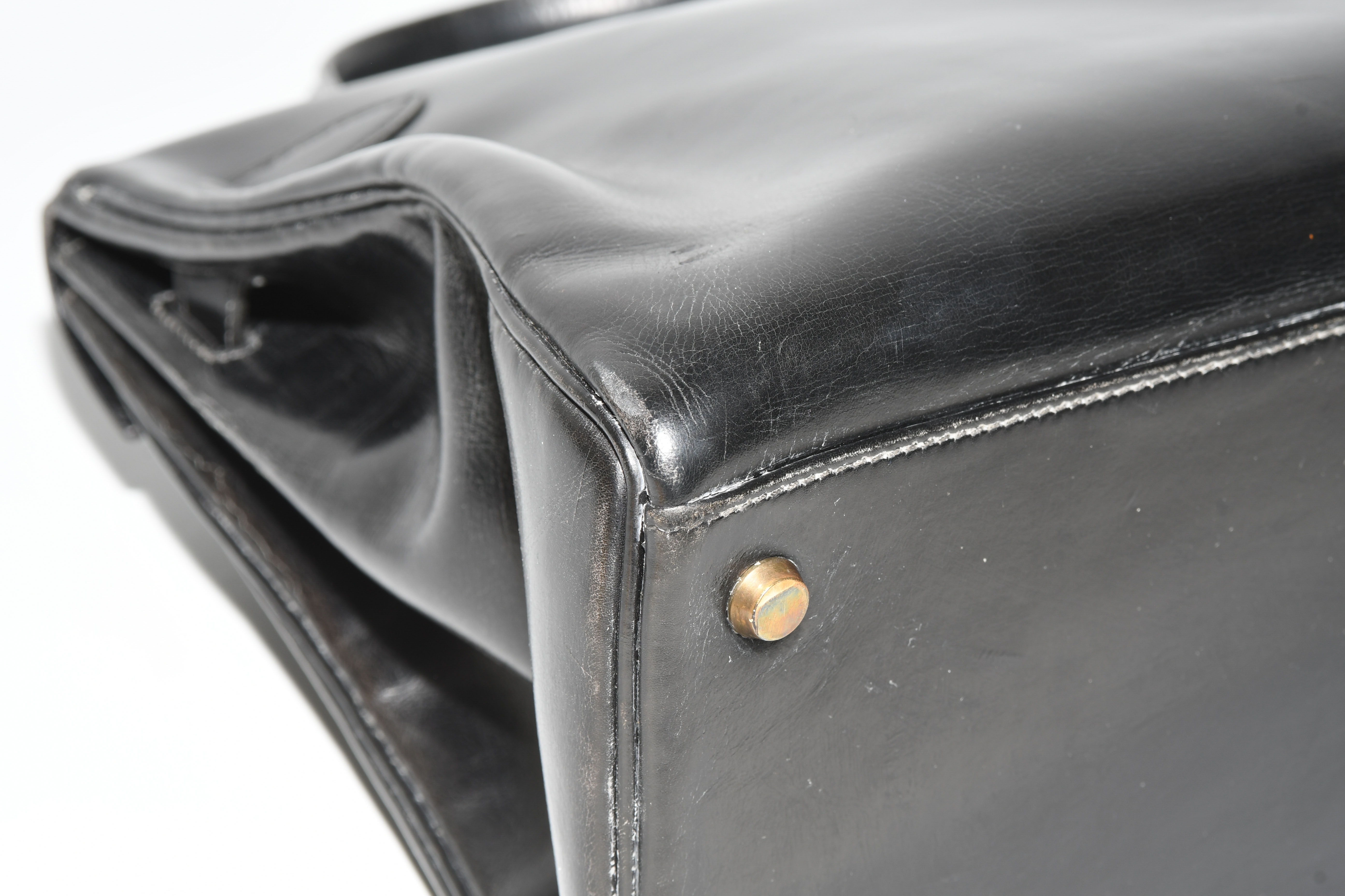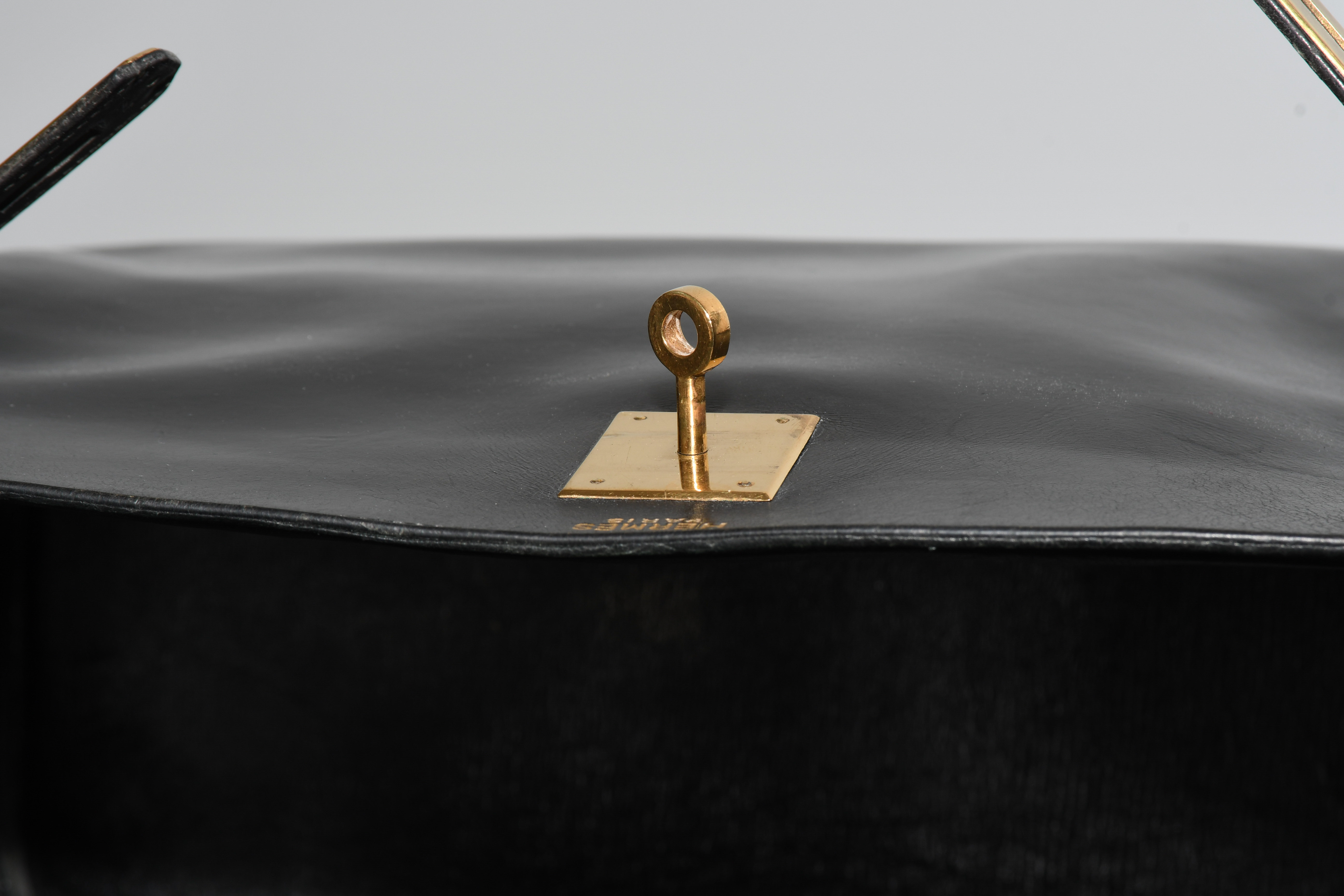 Aus dem Jahr 1970. Gemarkt Hermès Paris. Aus schwarzem Leder. Vergoldete Metallbeschläge. Hängeschloss und Clochette mit zwei Schlüsseln. 32x22x12 cm.