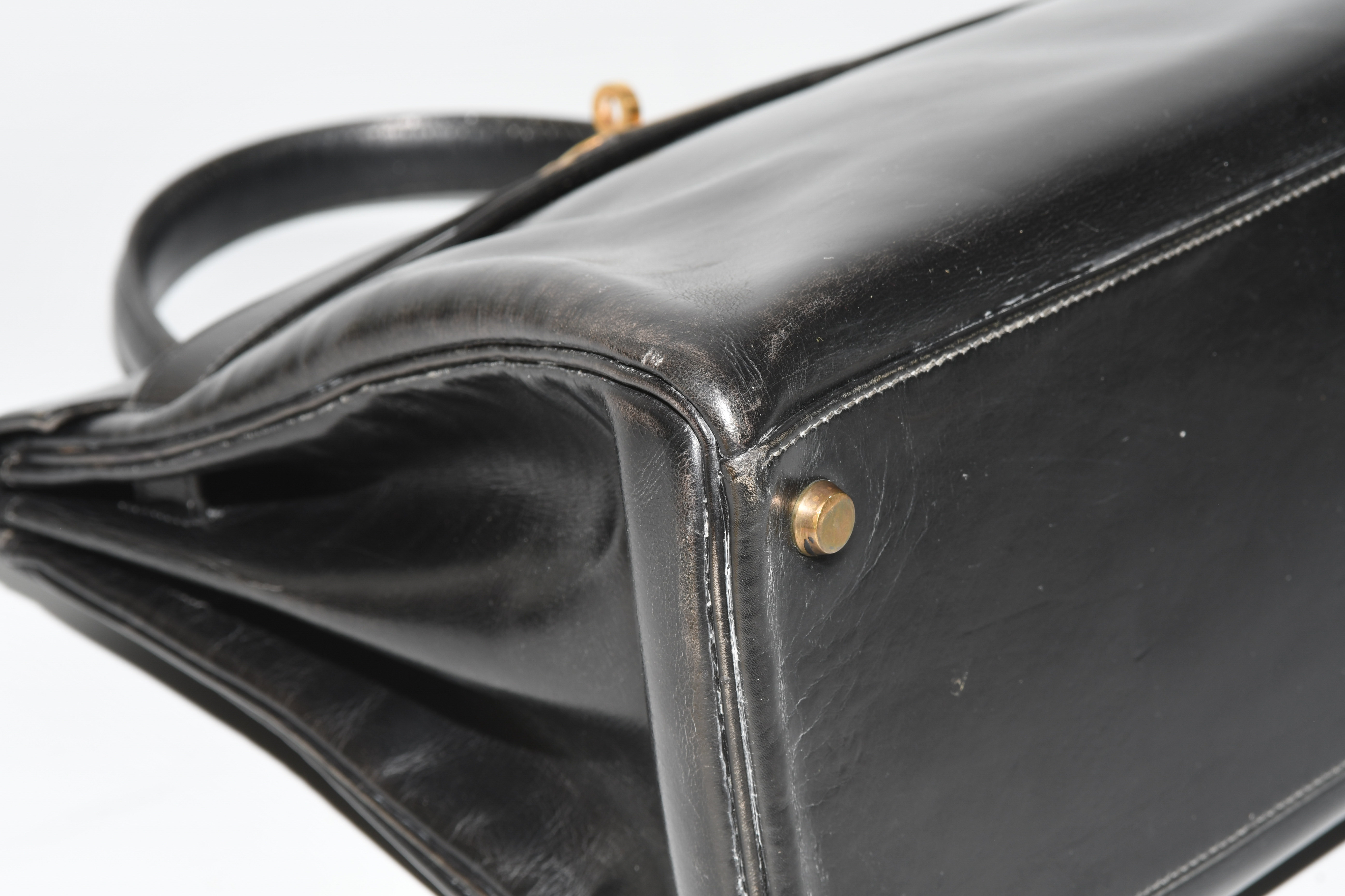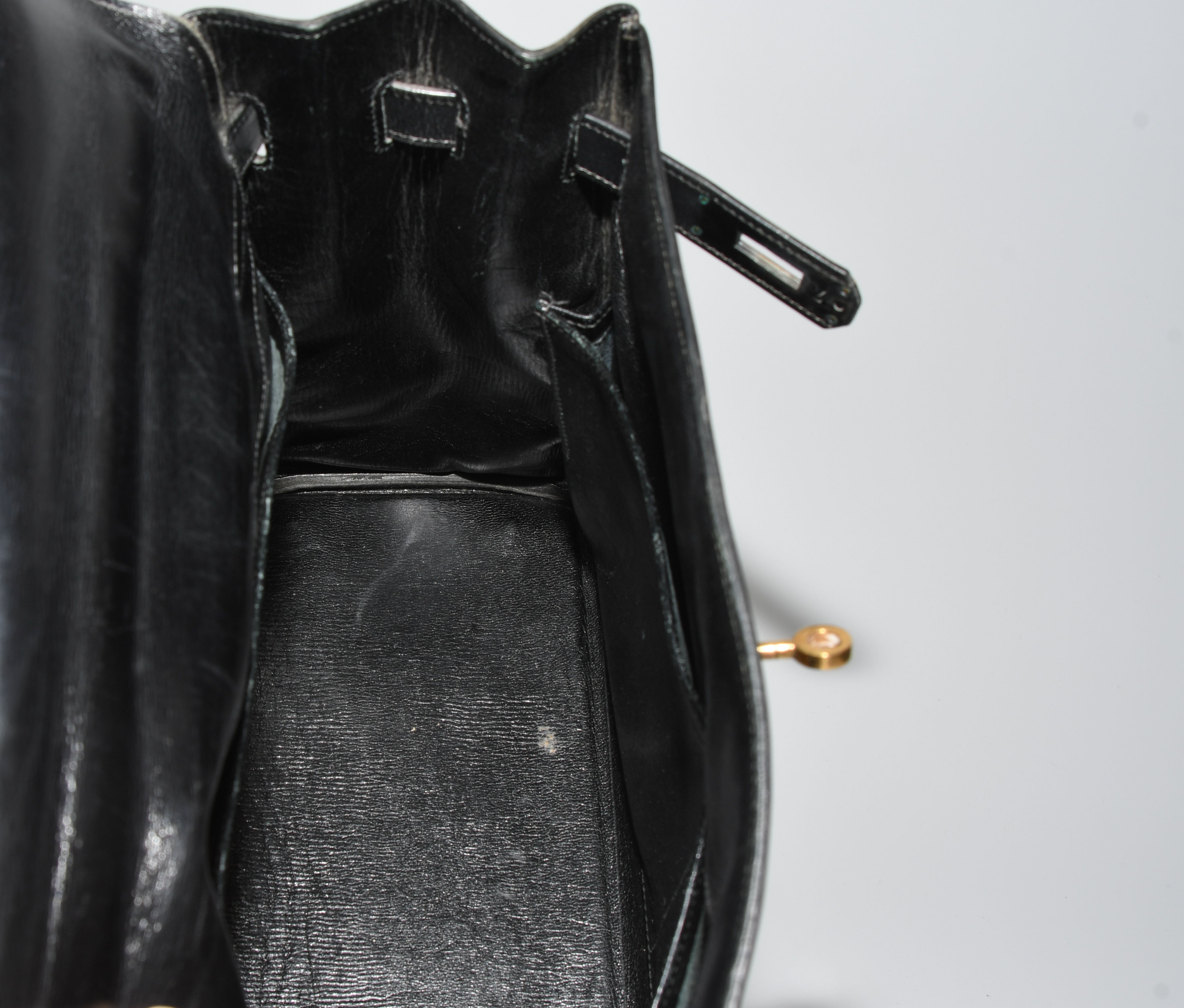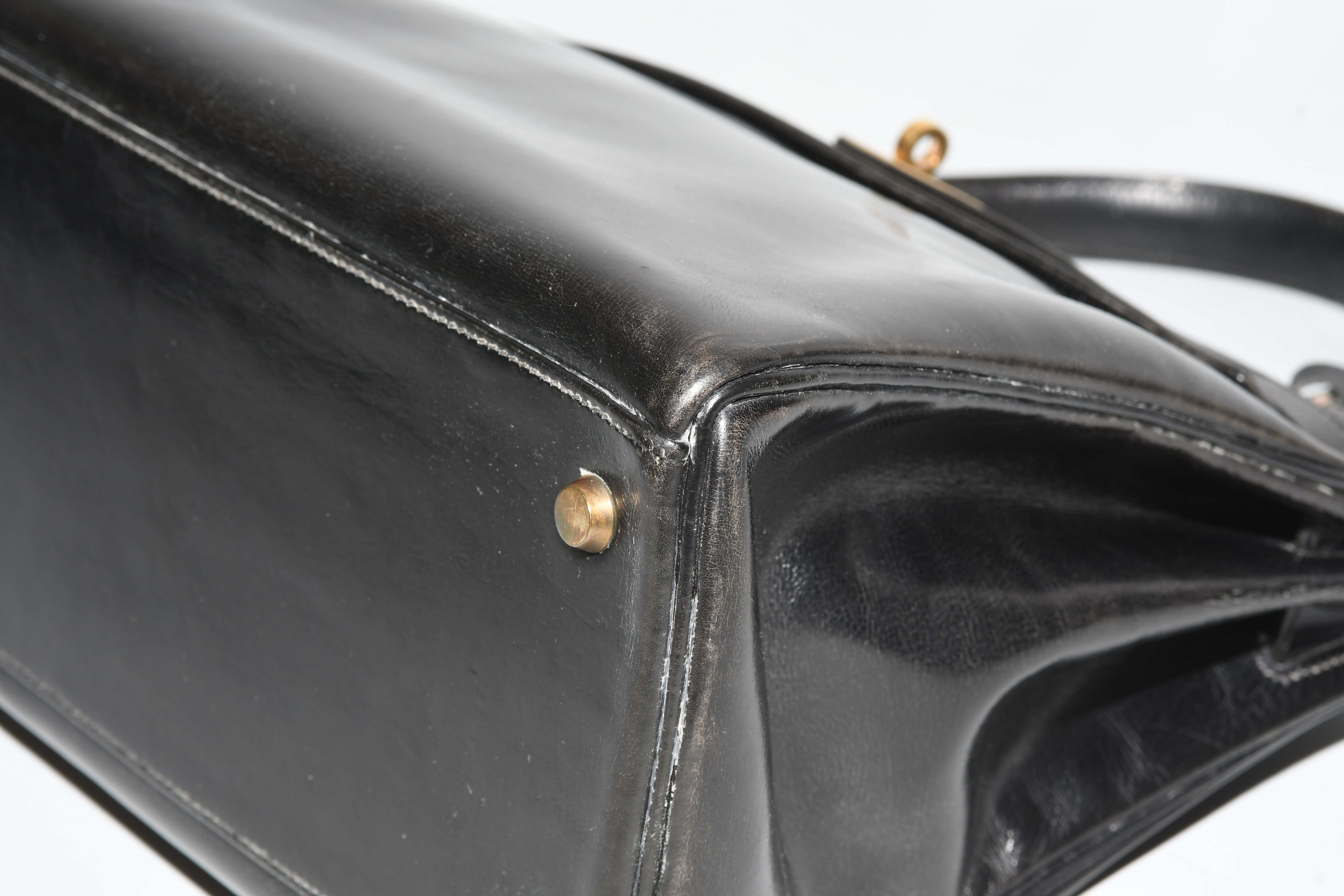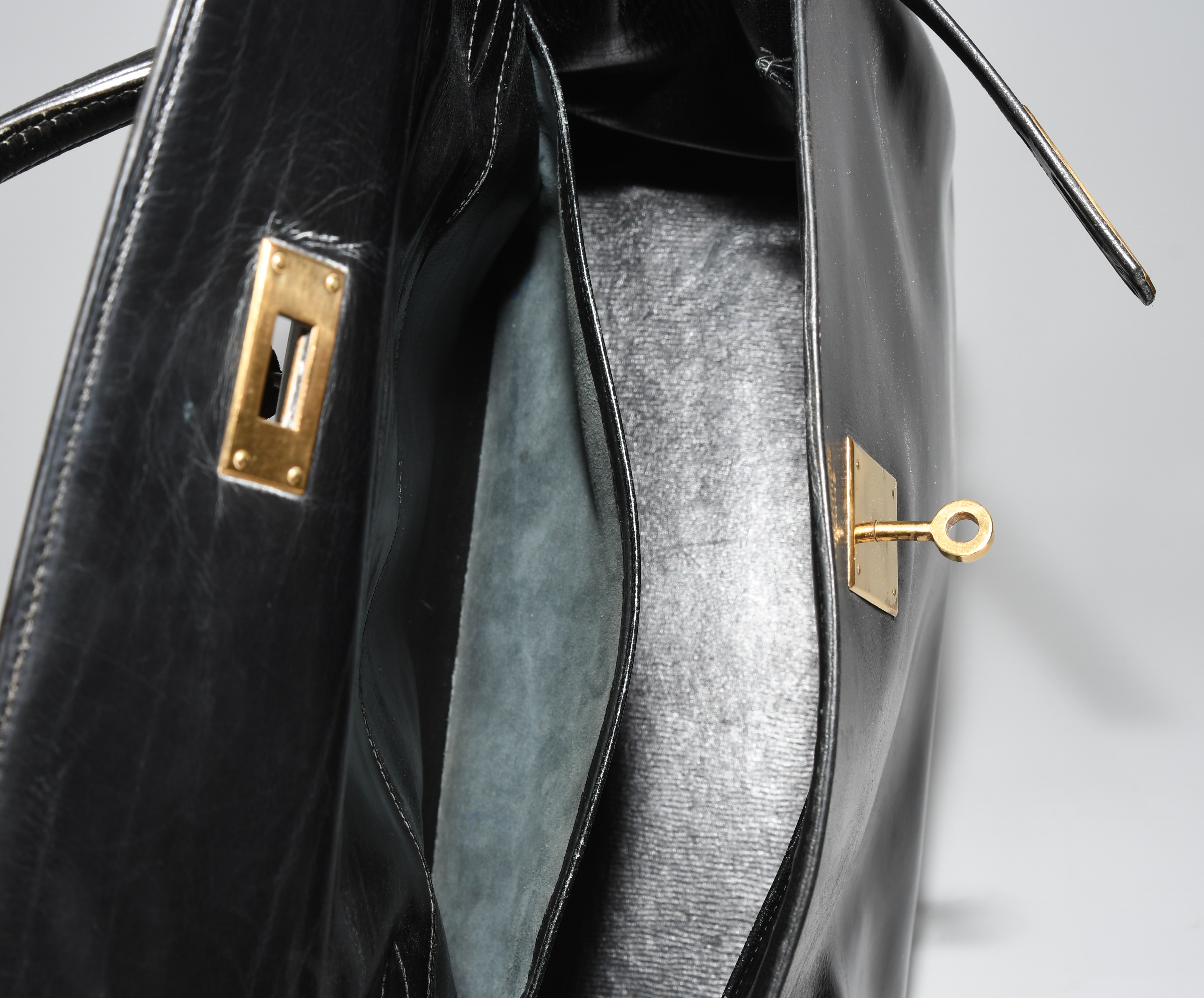 Aus dem Jahr 1970. Gemarkt Hermès Paris. Aus schwarzem Leder. Vergoldete Metallbeschläge. Hängeschloss und Clochette mit zwei Schlüsseln. 32x22x12 cm.