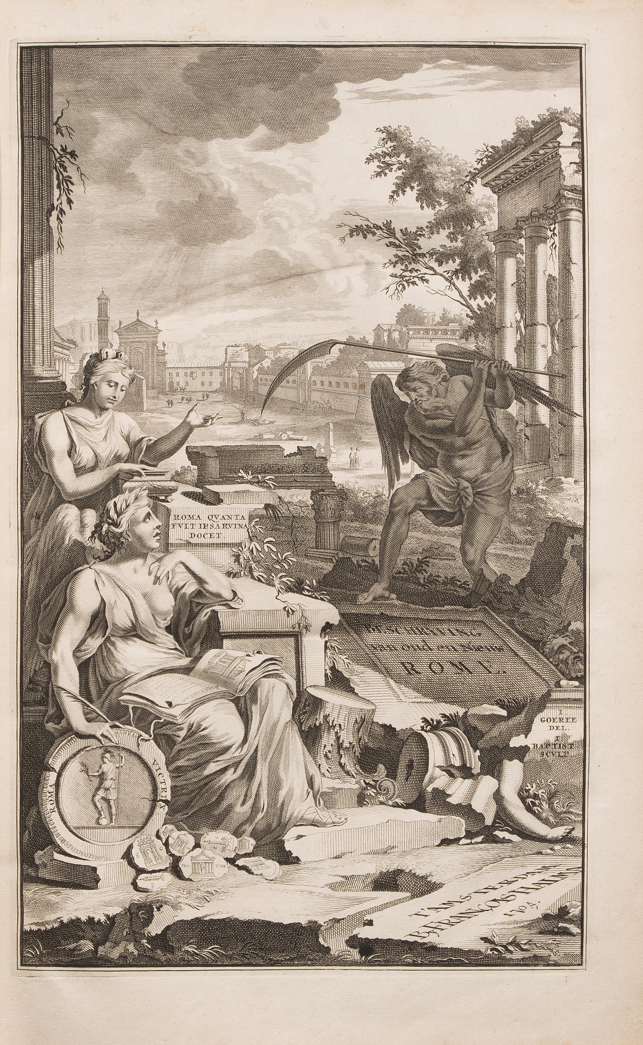 Beschryving van Oud en Nieuw Rome. Verdeelt in drie Deelen. In 't Fransch beschreven door den Heer François Desseine. En in ’t Nederduitsch vertaalt. Amsterdam, Halma, 1704. Fol. 3 Teile in 2 Bänden. Mit 3 gest. Frontispizen und insgesamt 103 gest. (teils doppelseitigen und ausfaltbaren) Tafeln, Karten und Plänen, sowie einigen Kupferstichen im Text. Beigegeben: Basilius Kennet: De Aaloudheden van Rome... Amsterdam, Halma, 1704.Fol. Mit gest. Frontispiz und insgesamt 19 gest. (teils doppelseitigen und ausfaltbaren) Tafeln, Karten und Plänen, sowie einigen Kupferstichen im Text. Lederbände der Zeit mit goldgeprägten Rücken und Deckeln. - Einbände etwas beschabt und leicht bestossen. Ein Gelenk eingerissen, 2 Bände mit kl. Lederverlust am Rücken. Innen vereinzelt minimal stockfleckig und gebräunt. Insgesamt gute Erhaltung, dieses reich illustrierten Werkes.
