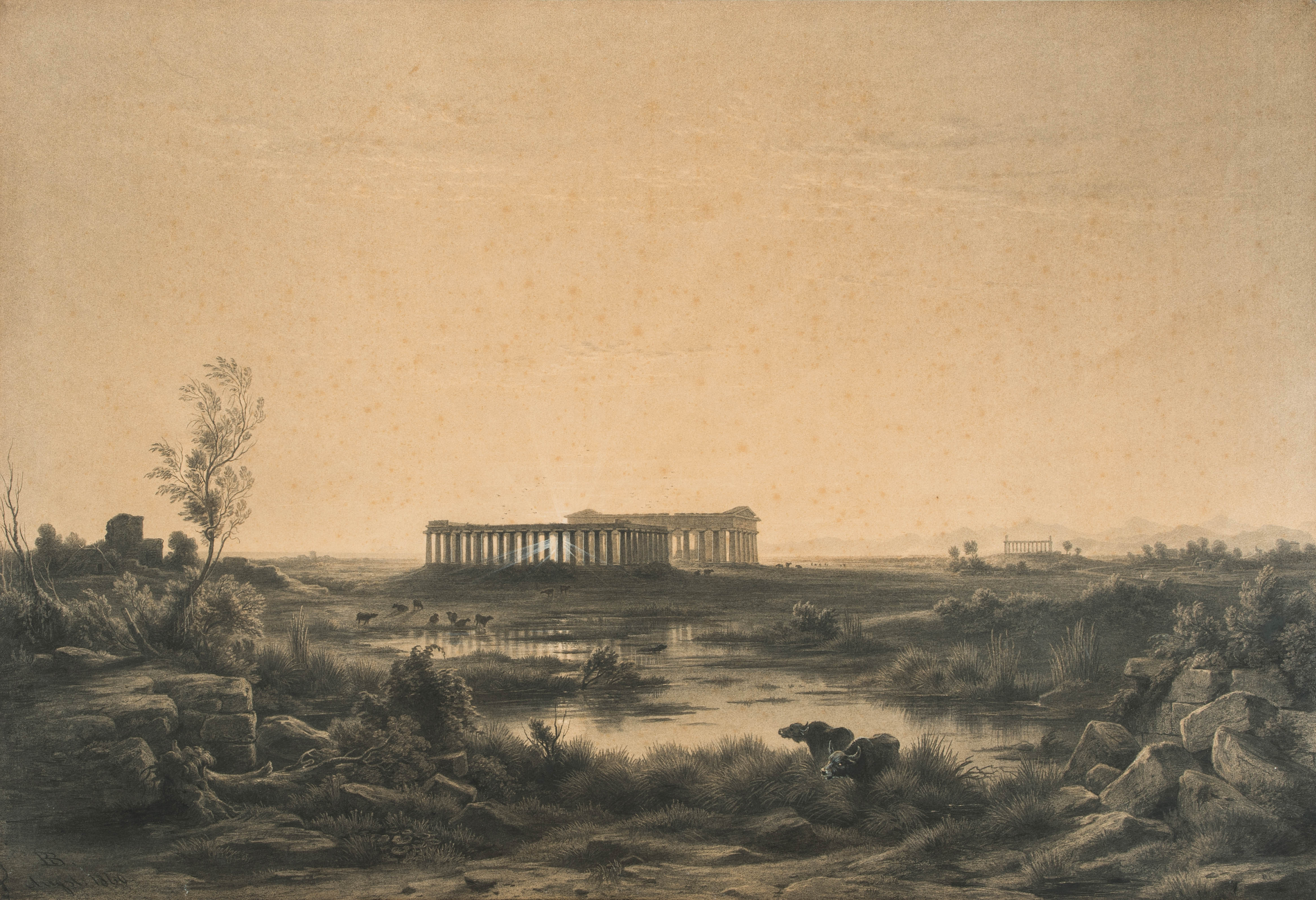 Paestum. Kreidezeichnung. Unten links monogrammiert und 1860 datiert. 68x99 cm. - Alt aufgezogen und leicht stockfleckig.
