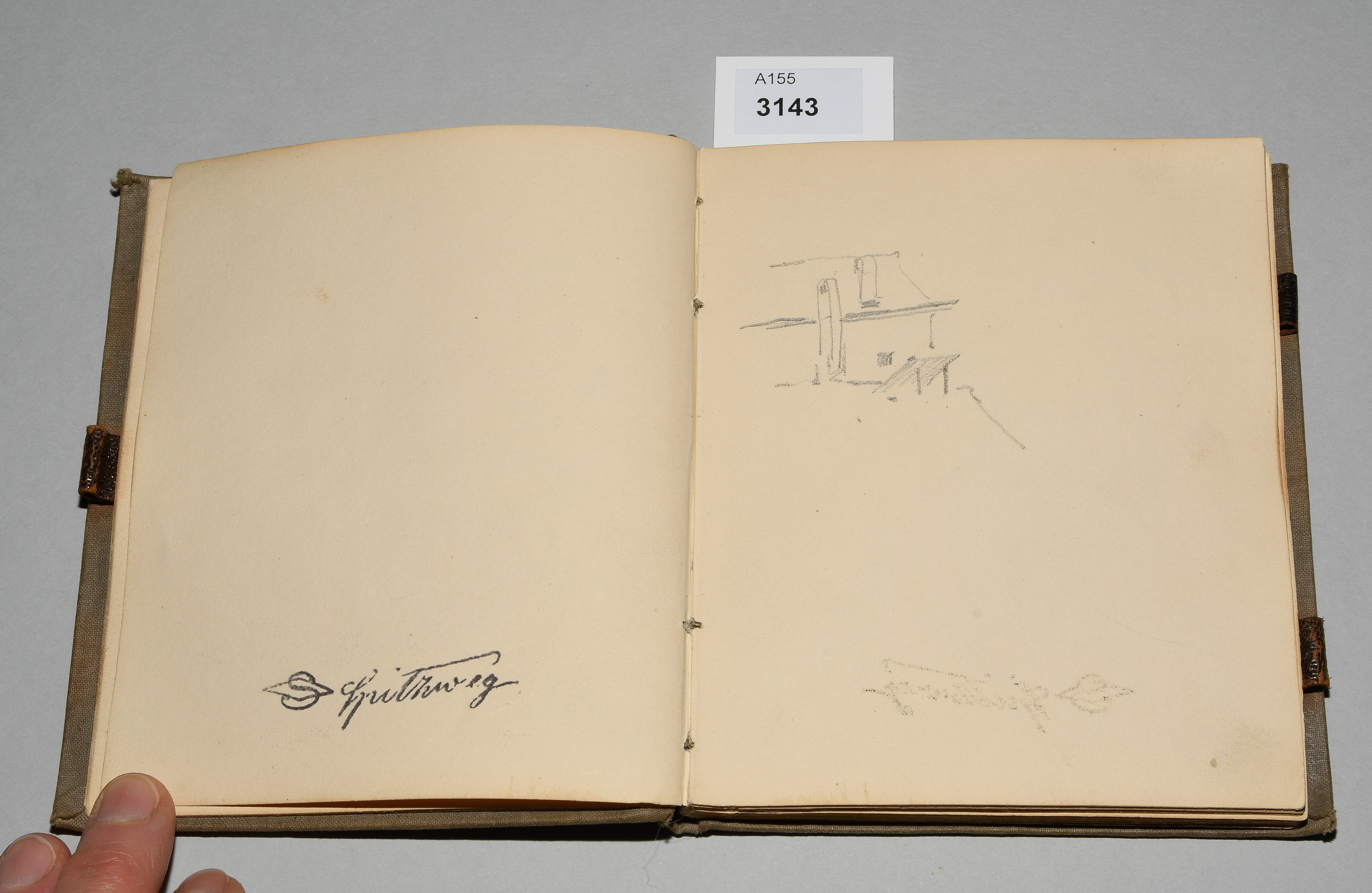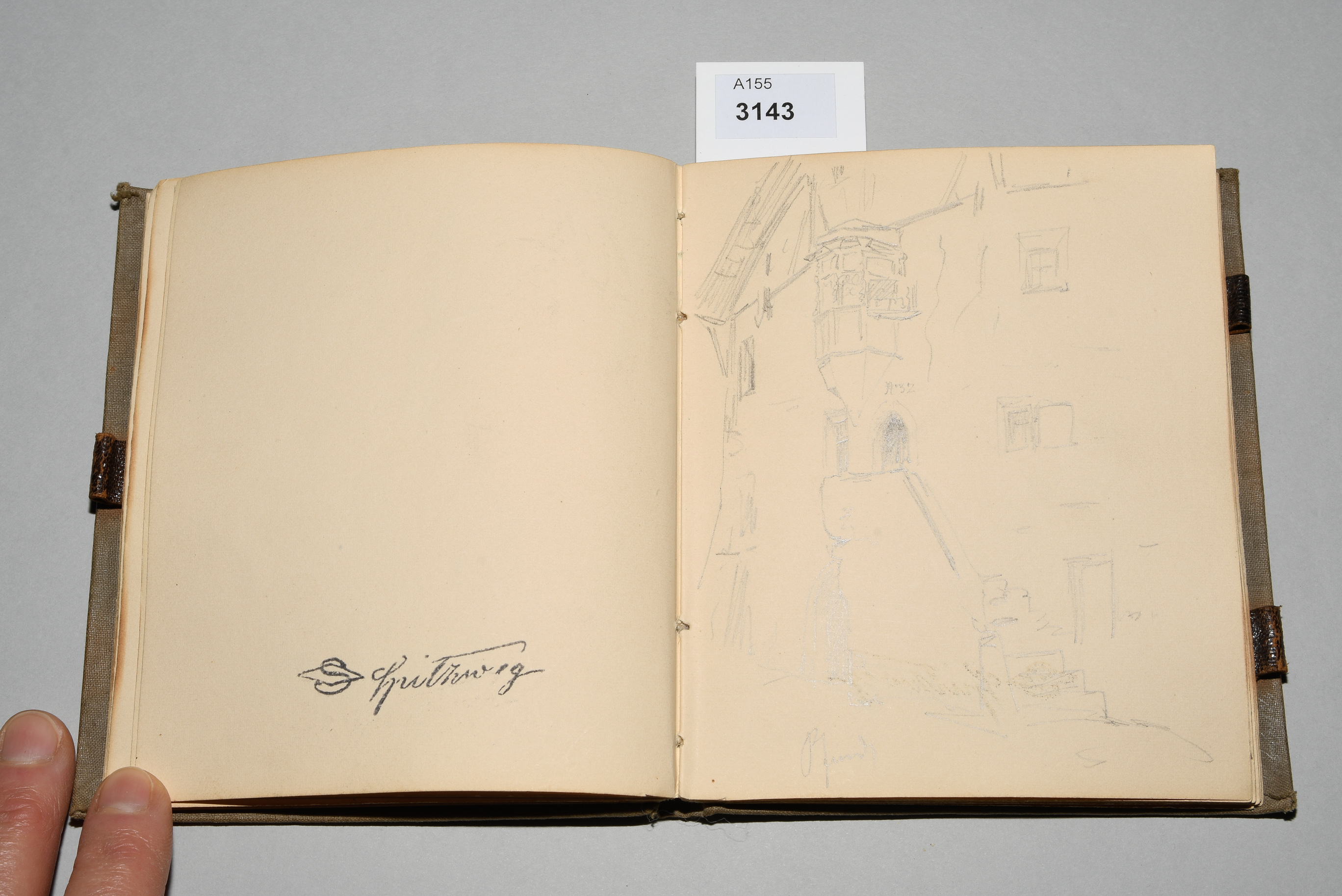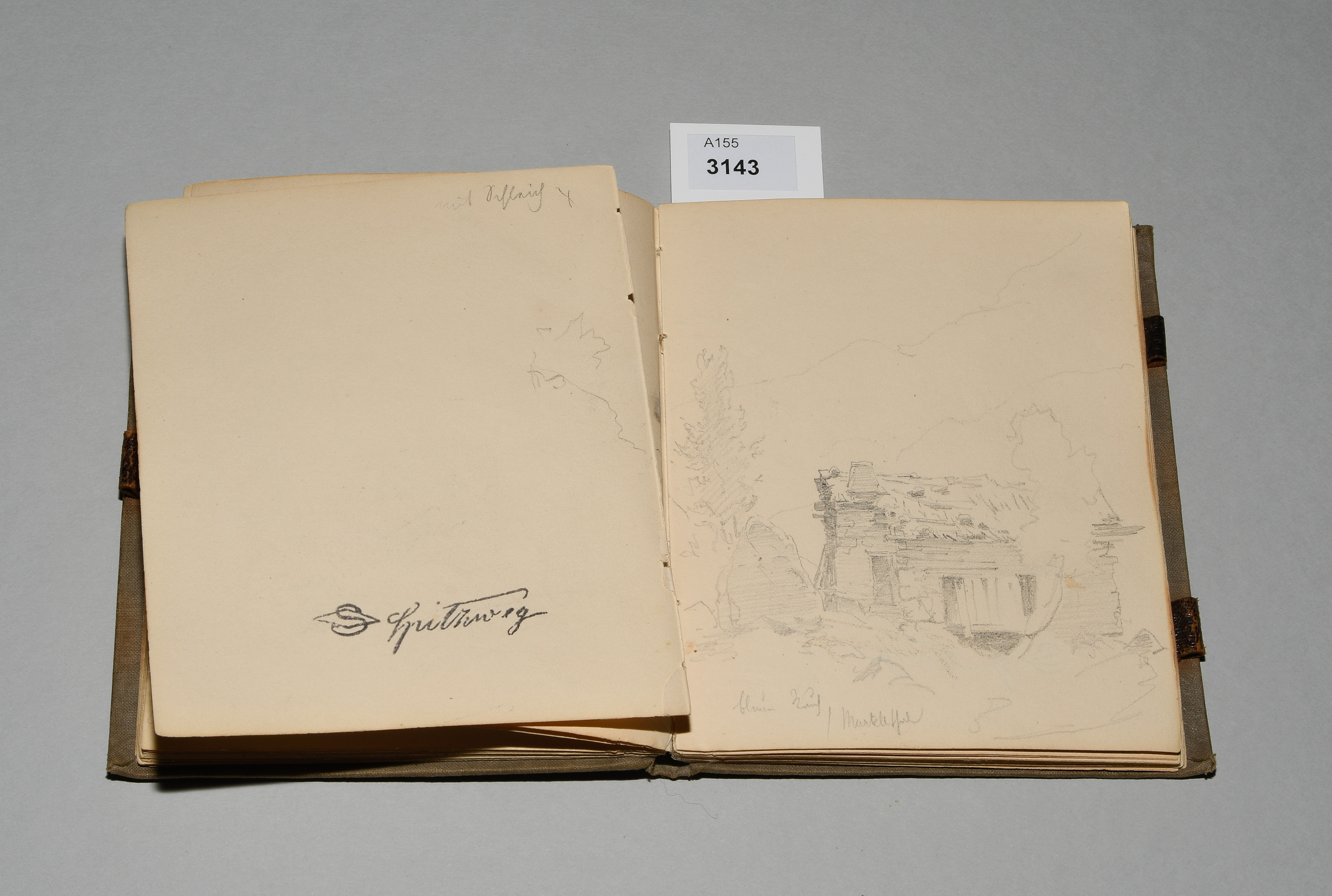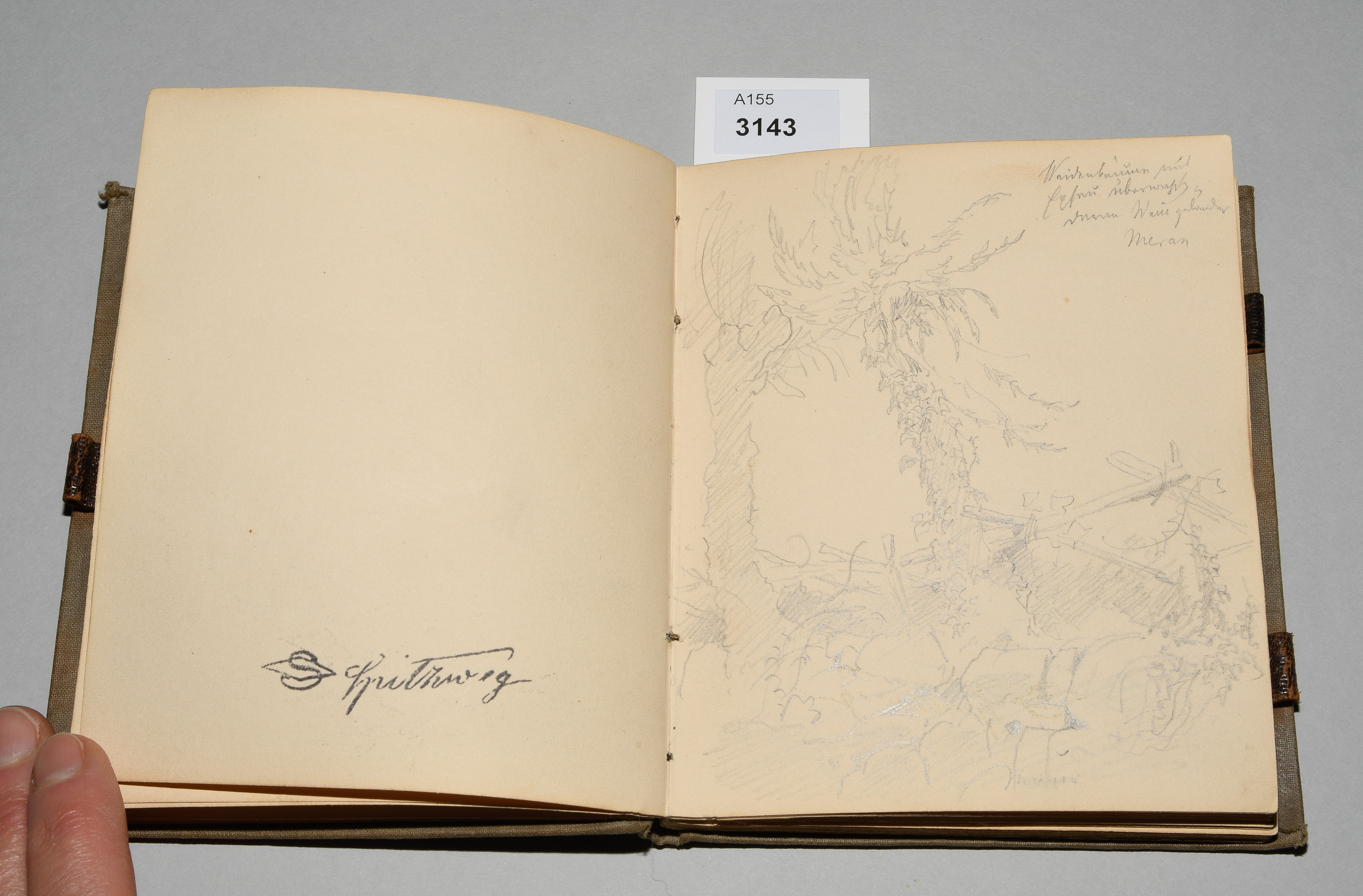 Skizzenbuch der Italienreise, die Spitzweg im Jahre 1846 mit Eduard Schleich d. Ä. (1812-1874) und Bernhard Stange (1807-1880) nach Südtirol und Norditalien unternahm. Mit zahlreichen hs. Einträgen (Reisenotizen: Zugsverbindungen, Hotels, Kuriositäten) und Bleistiftskizzen: Land- und Ortschaften (Landeck, Klausen, Löwenberg, Meran, Riva), einzelne architekt. Motive (got. Masswerk u. ä.) und Figurenstudien.