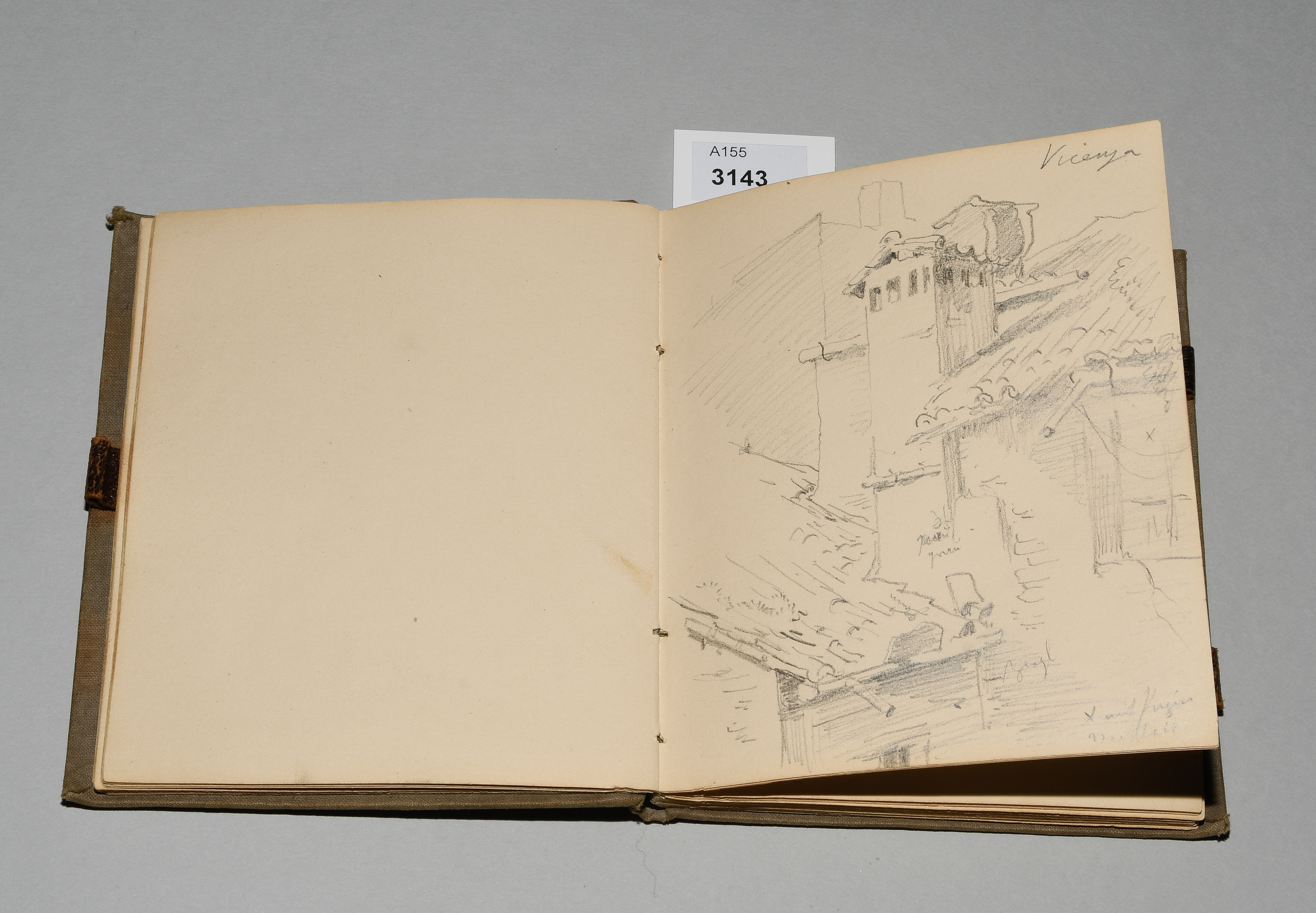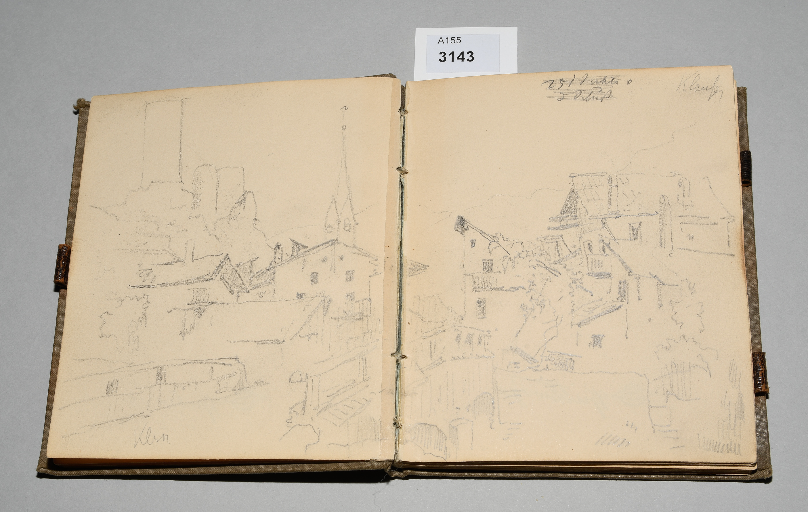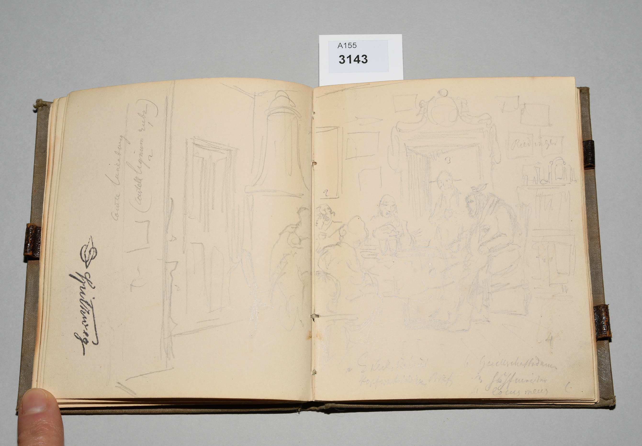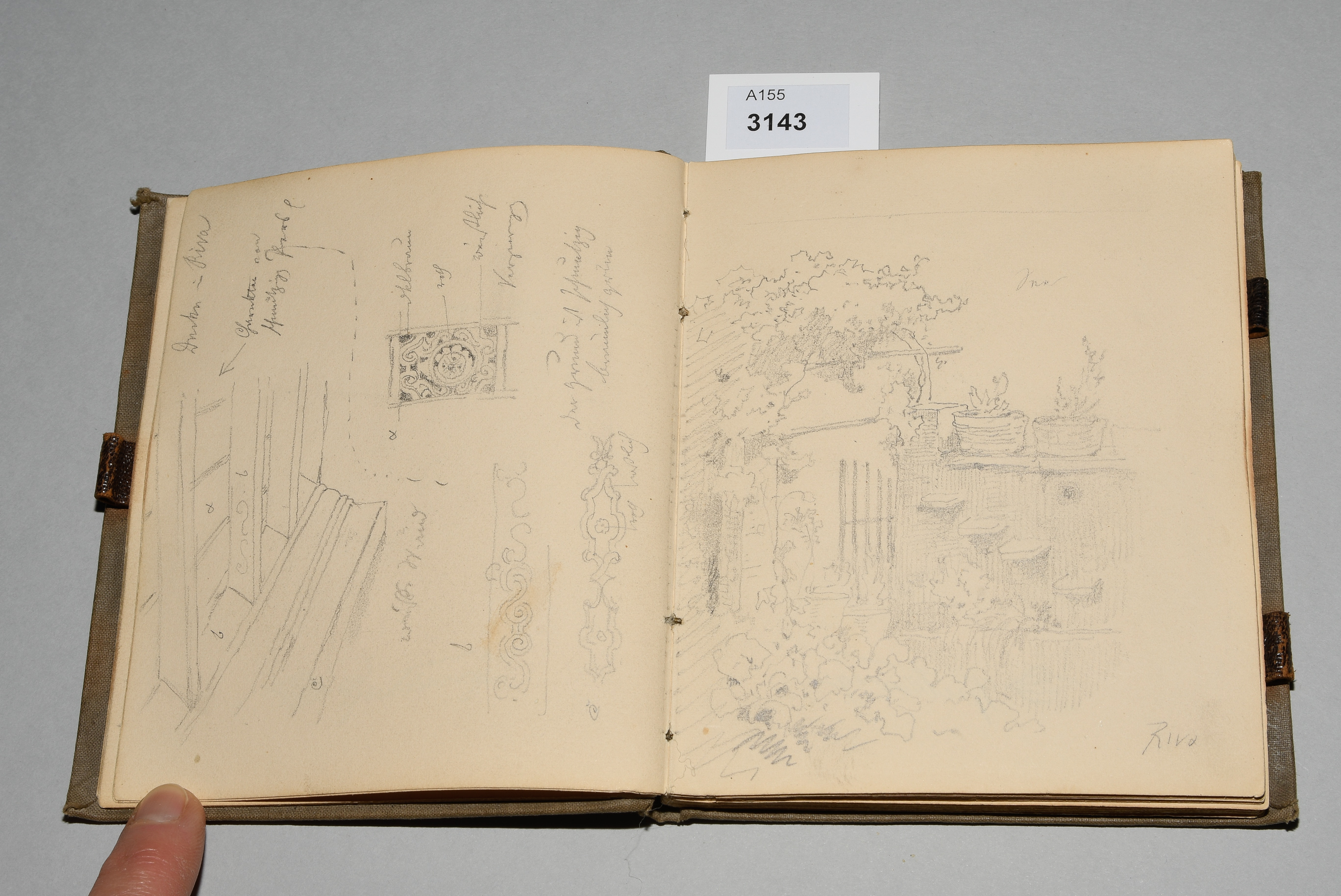 Skizzenbuch der Italienreise, die Spitzweg im Jahre 1846 mit Eduard Schleich d. Ä. (1812-1874) und Bernhard Stange (1807-1880) nach Südtirol und Norditalien unternahm. Mit zahlreichen hs. Einträgen (Reisenotizen: Zugsverbindungen, Hotels, Kuriositäten) und Bleistiftskizzen: Land- und Ortschaften (Landeck, Klausen, Löwenberg, Meran, Riva), einzelne architekt. Motive (got. Masswerk u. ä.) und Figurenstudien.
