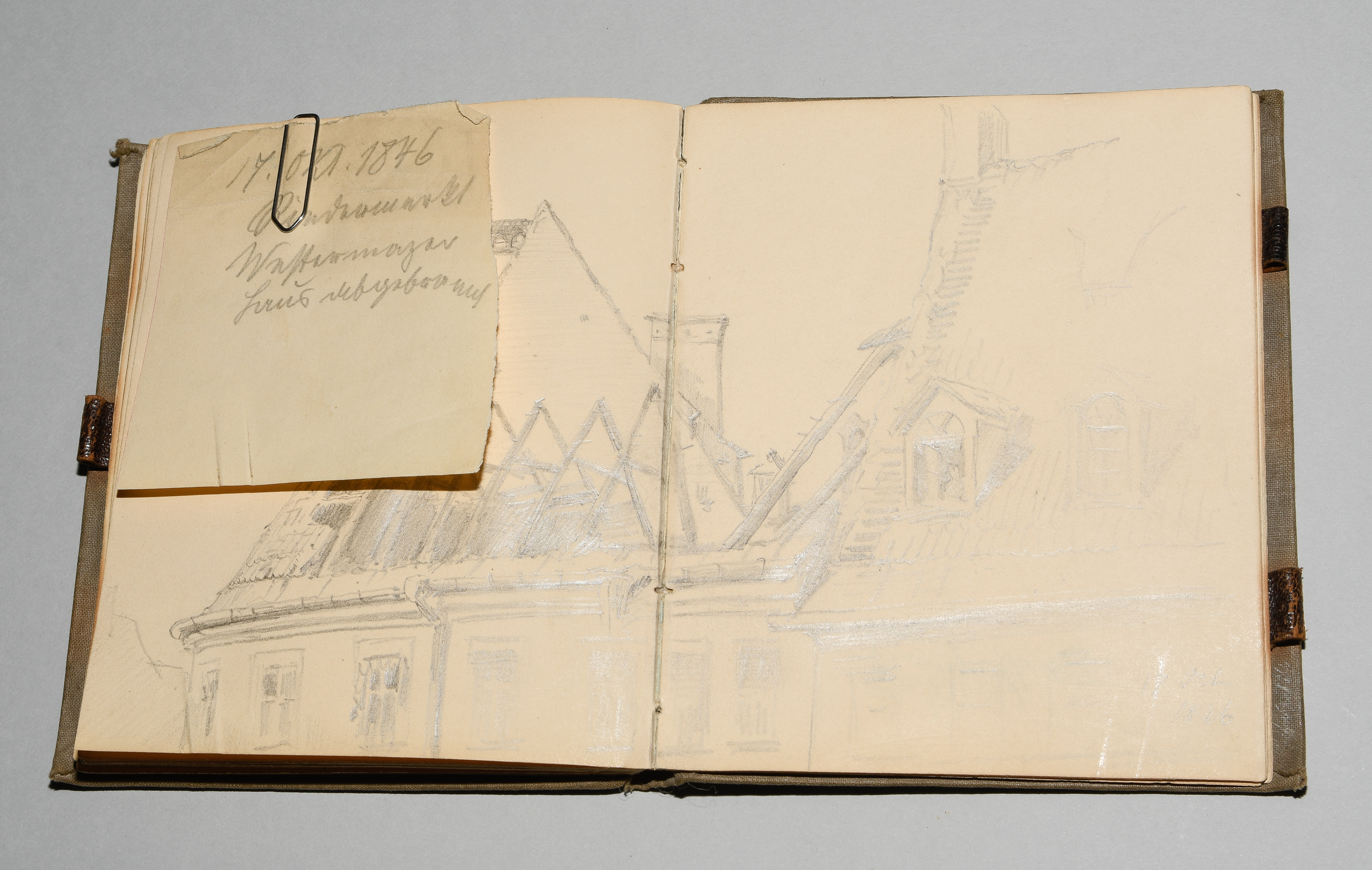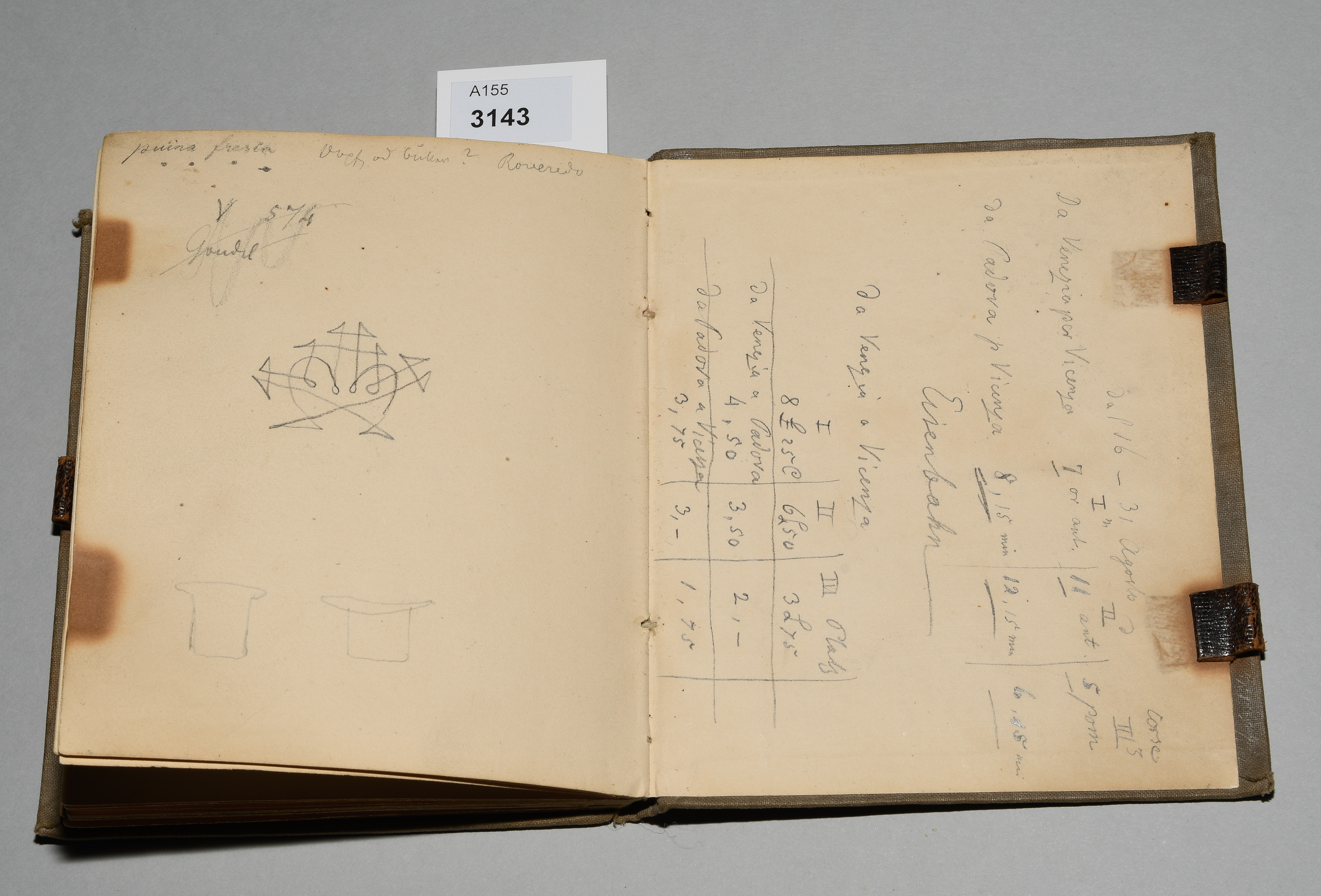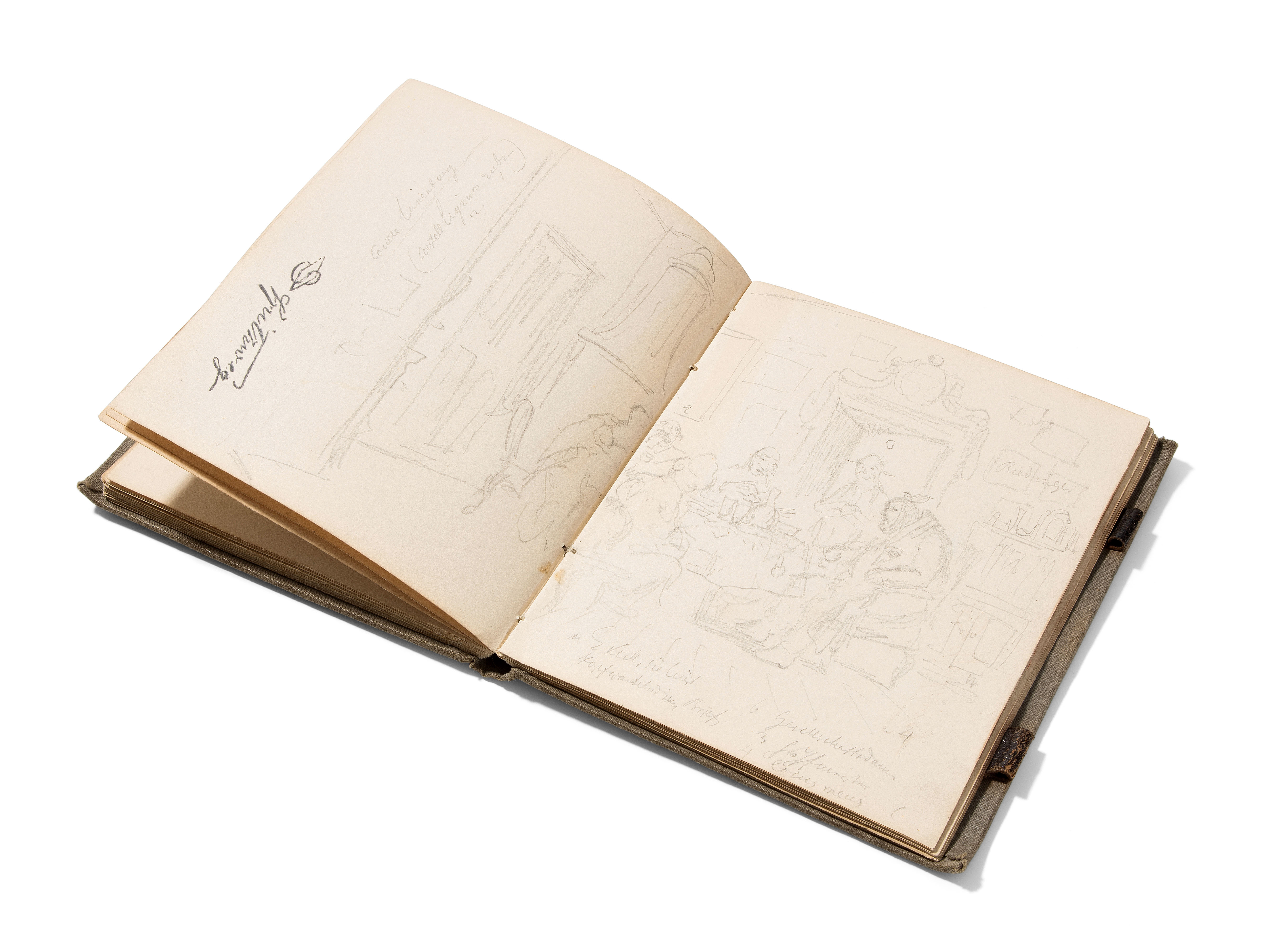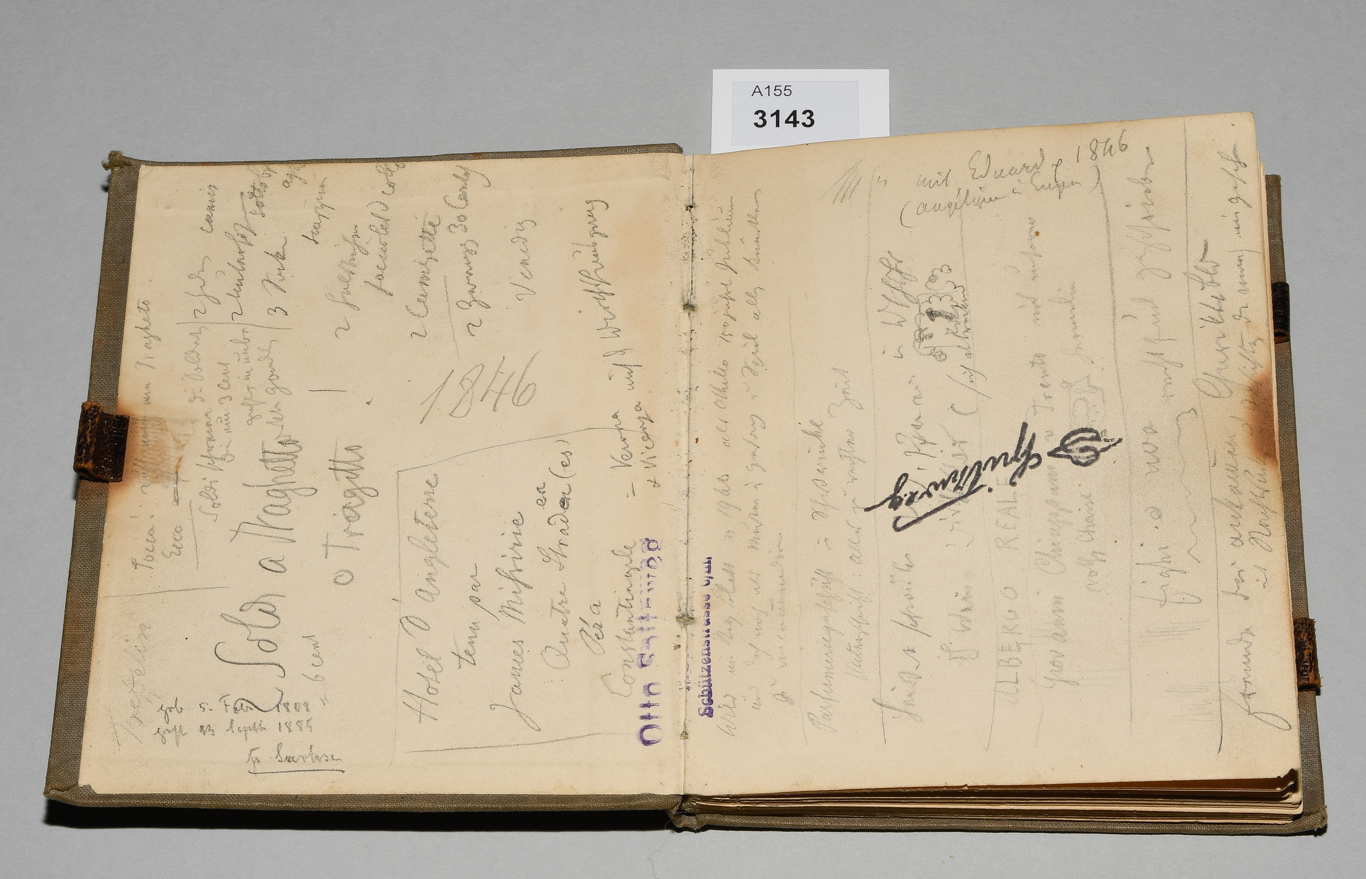 Skizzenbuch der Italienreise, die Spitzweg im Jahre 1846 mit Eduard Schleich d. Ä. (1812-1874) und Bernhard Stange (1807-1880) nach Südtirol und Norditalien unternahm. Mit zahlreichen hs. Einträgen (Reisenotizen: Zugsverbindungen, Hotels, Kuriositäten) und Bleistiftskizzen: Land- und Ortschaften (Landeck, Klausen, Löwenberg, Meran, Riva), einzelne architekt. Motive (got. Masswerk u. ä.) und Figurenstudien.