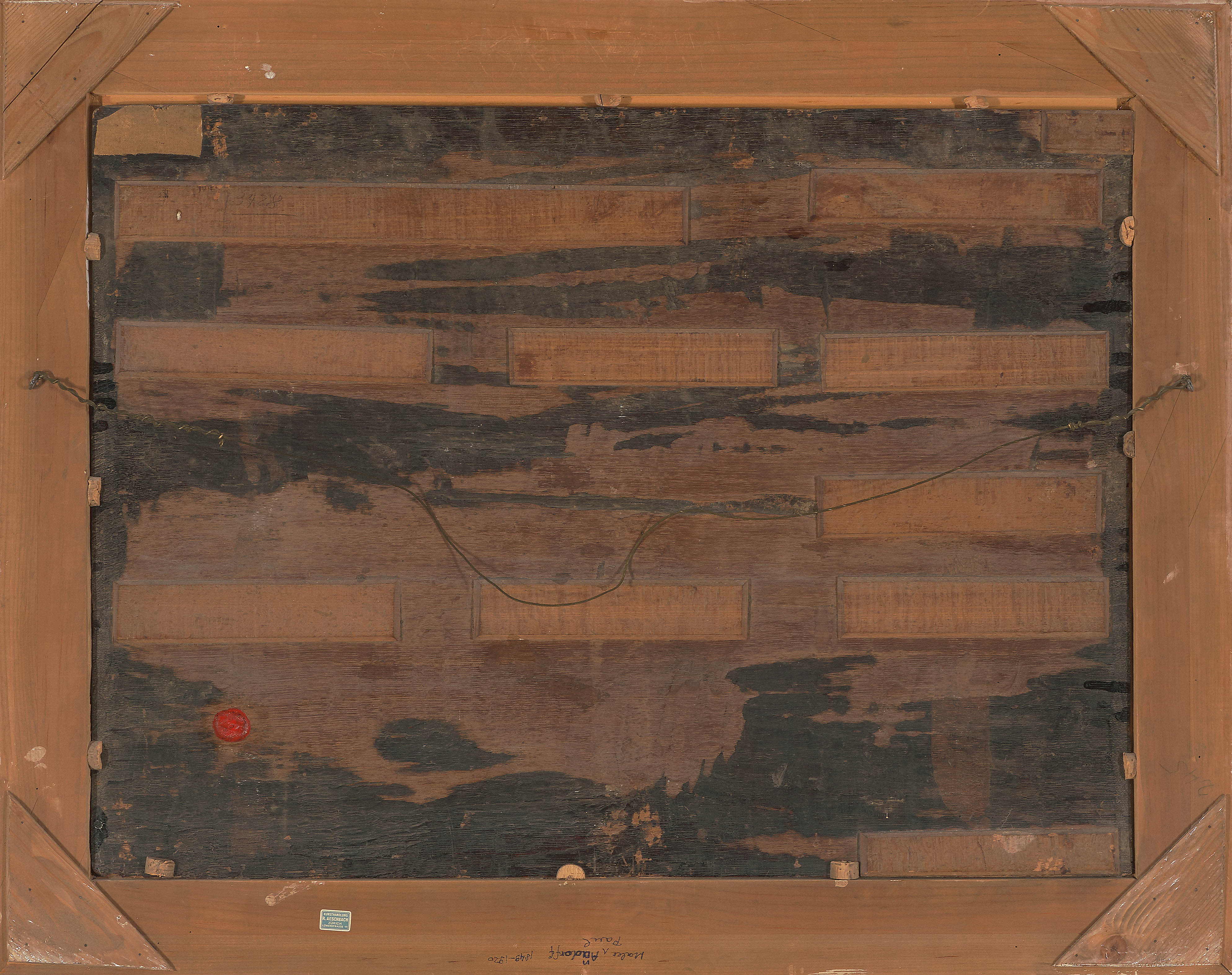 Der Aufbruch der Jagdgesellschaft. Öl auf Holz. Verso Wachssiegel "Audorff". 62x84 cm.