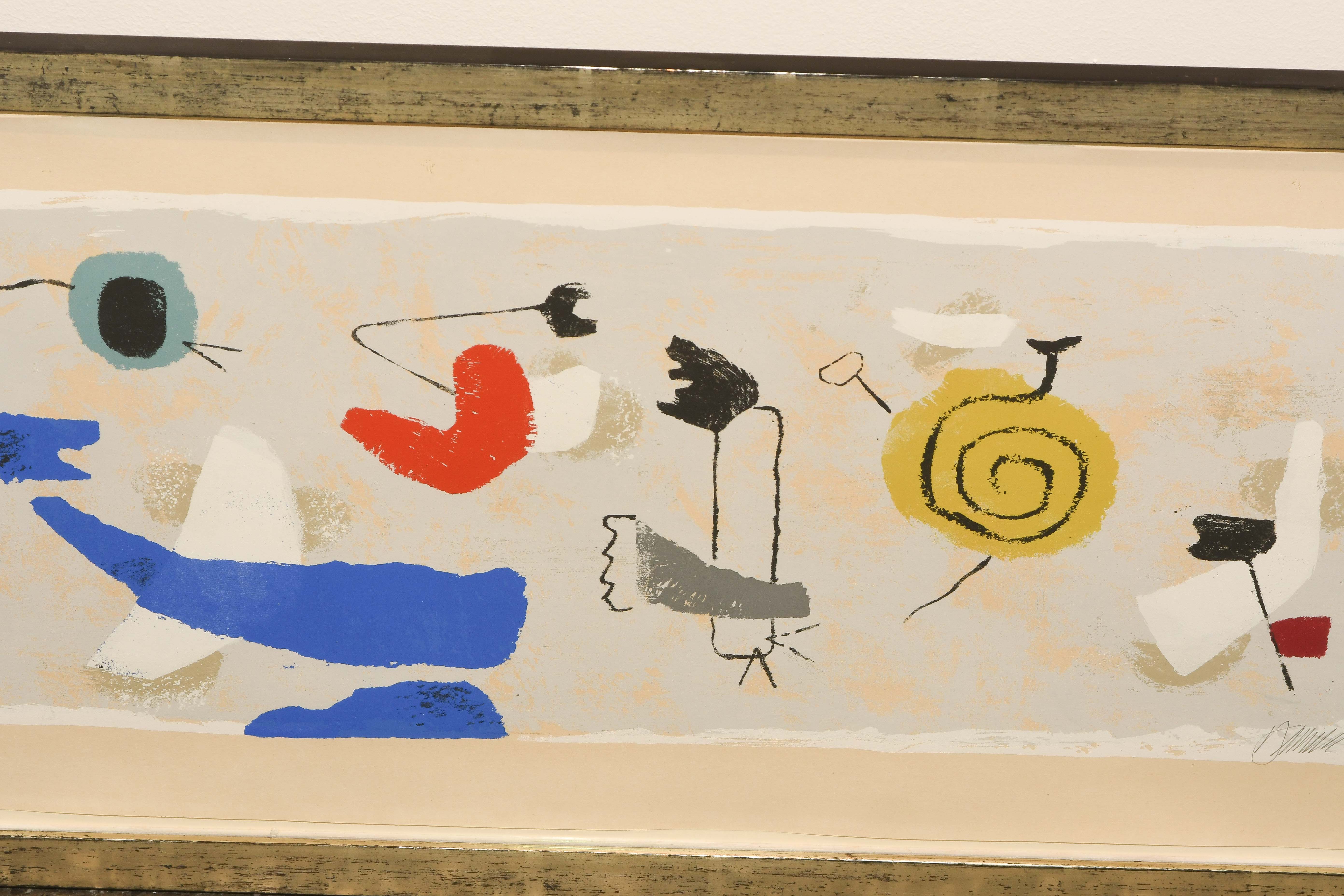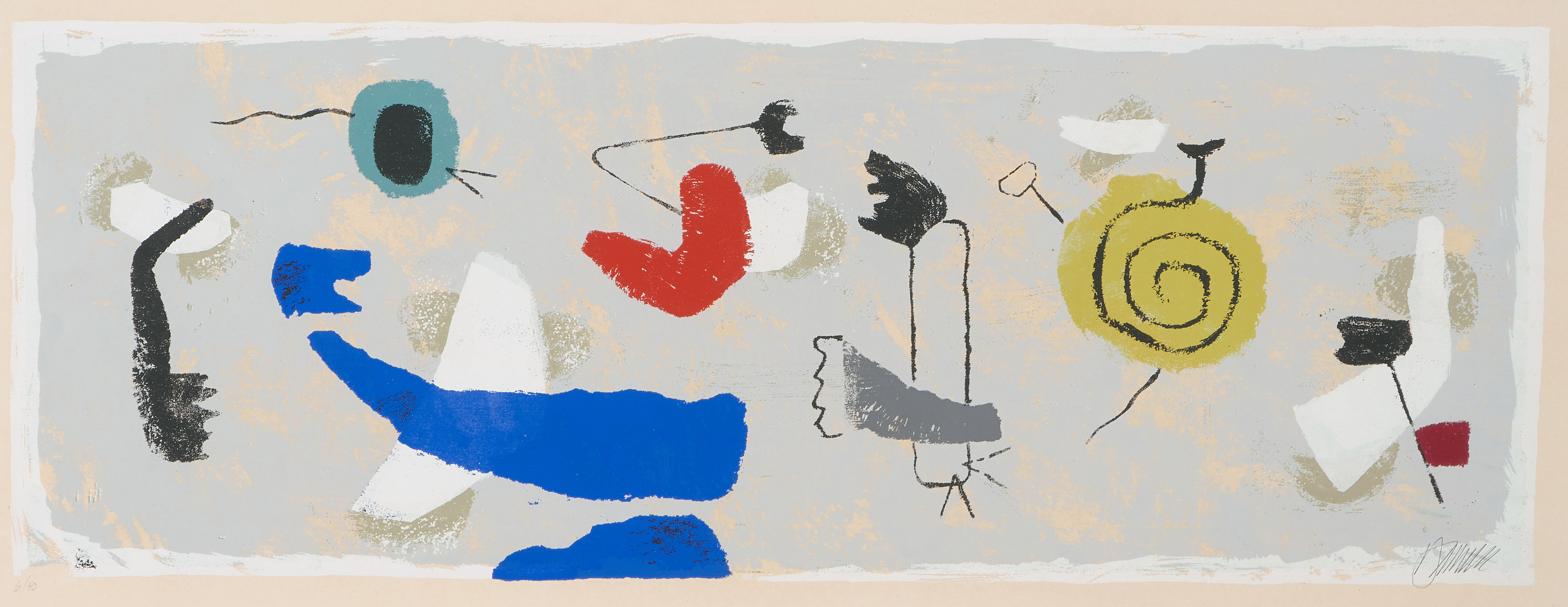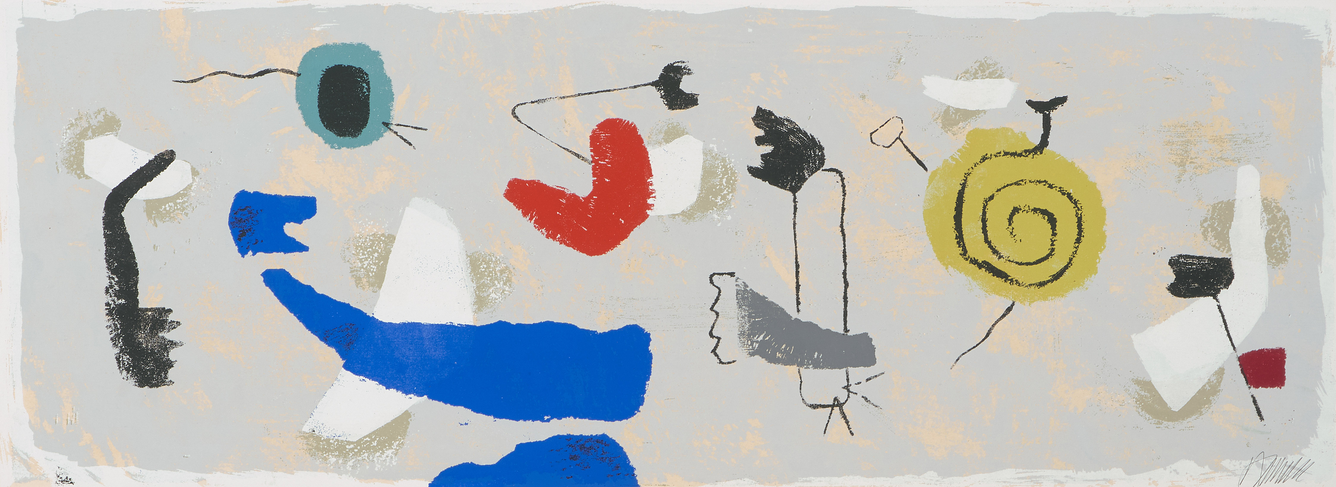 "Schwebend. Fries mit gelber Spirale". 1952. Farbserigraphie. 6/50. Unten rechts in Bleistift signiert. Blattgrösse 31,2x73 cm. Gerahmt. -Blatt minimst gebräunt. Verso am oberen Rand an Rückkarton montiert.