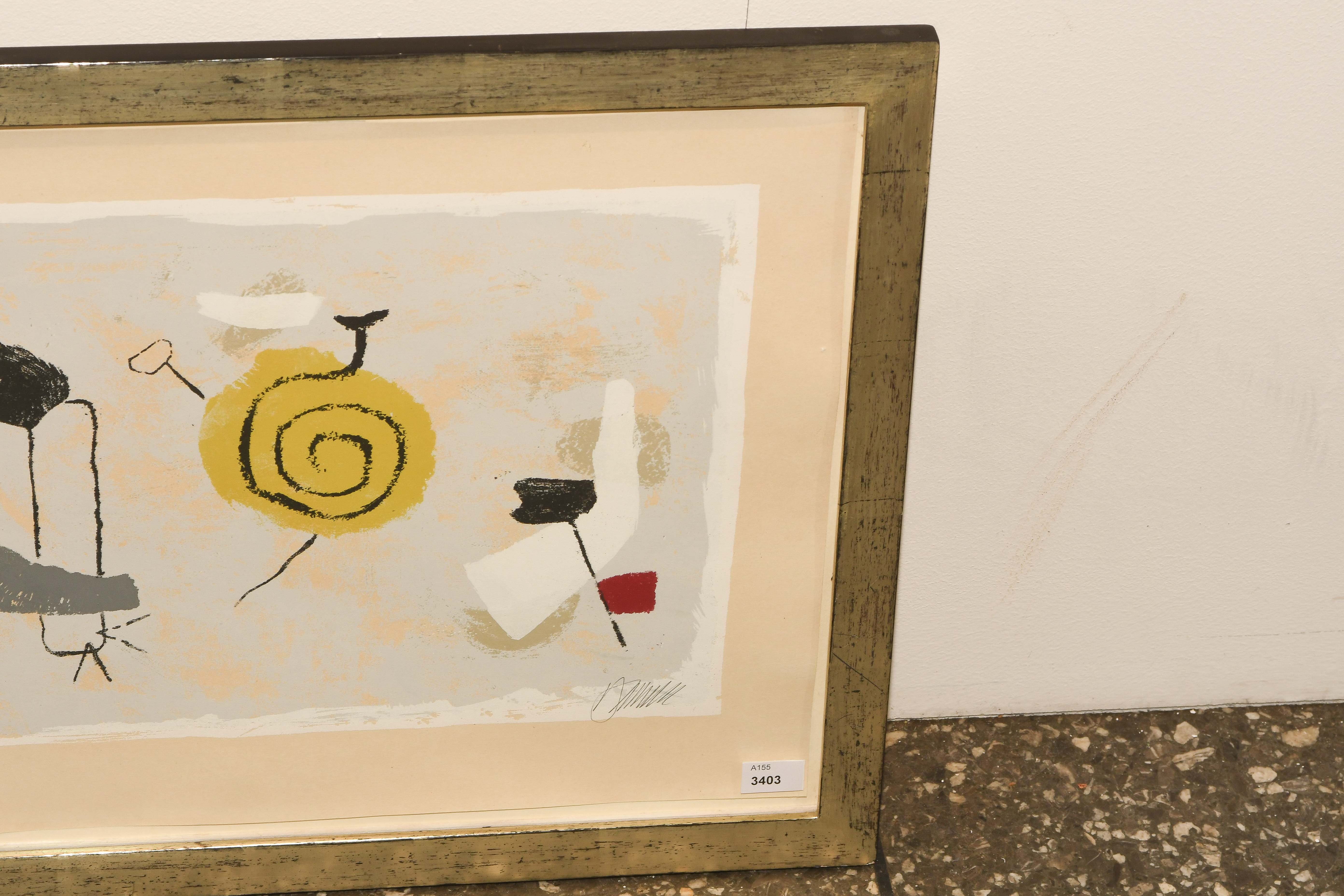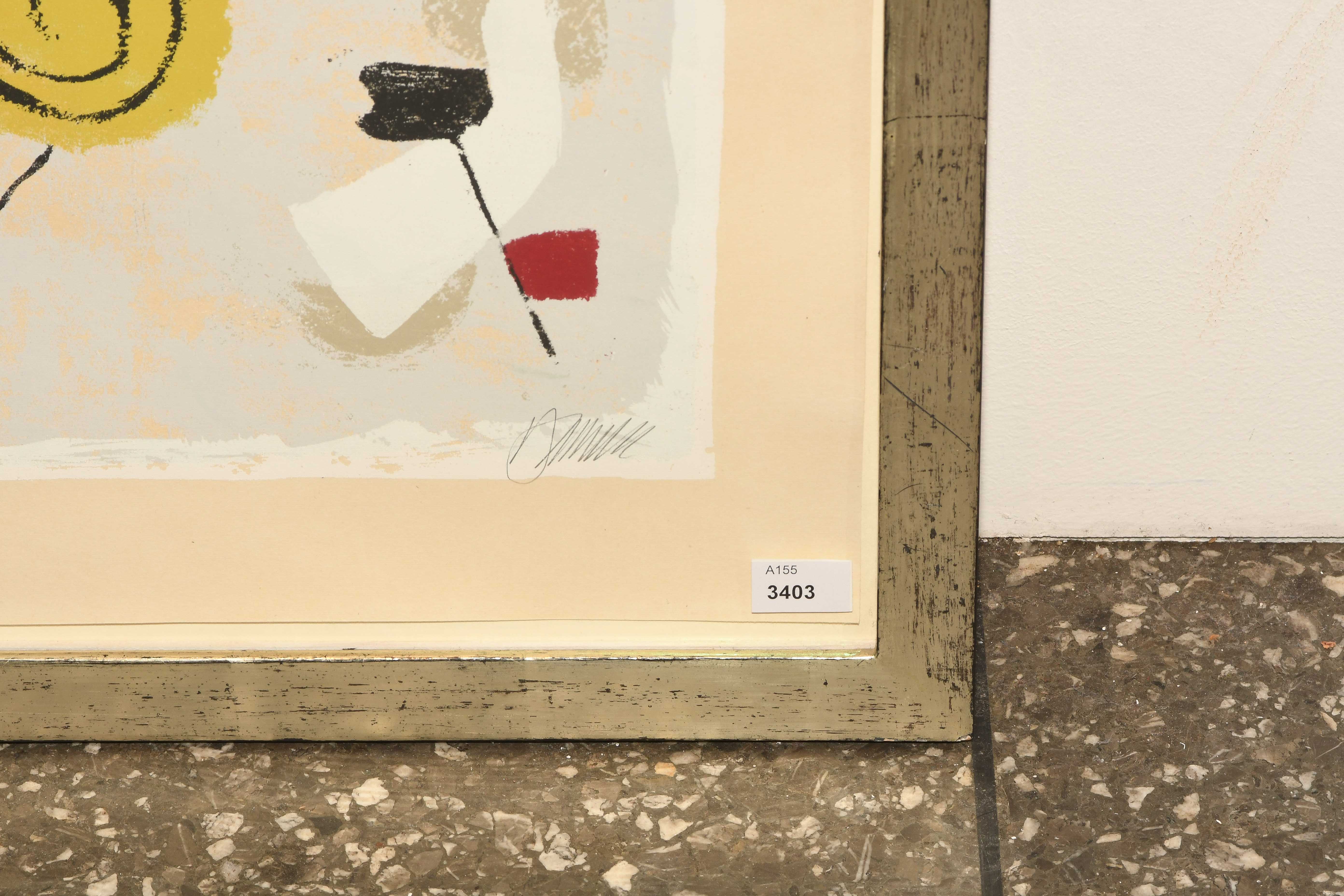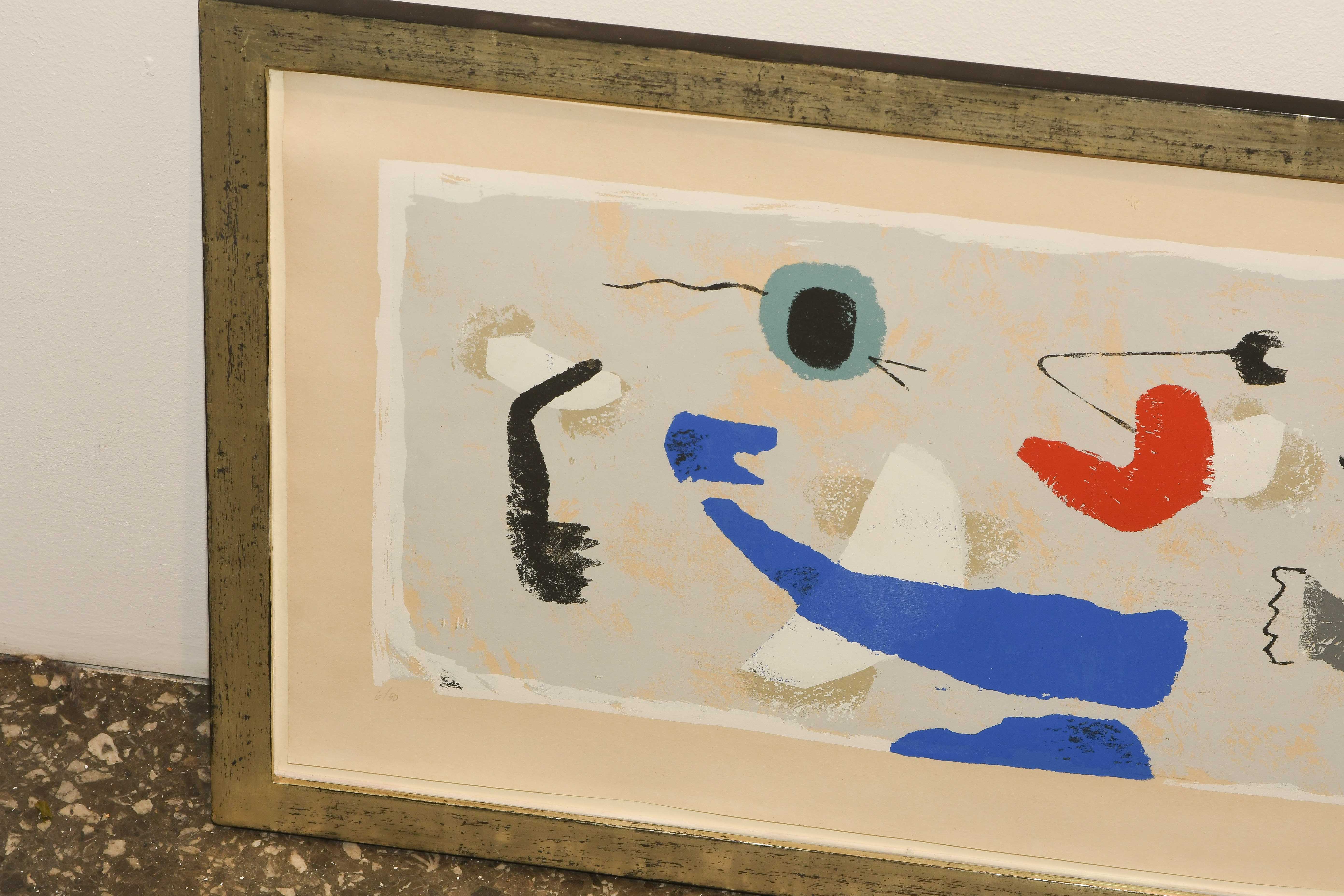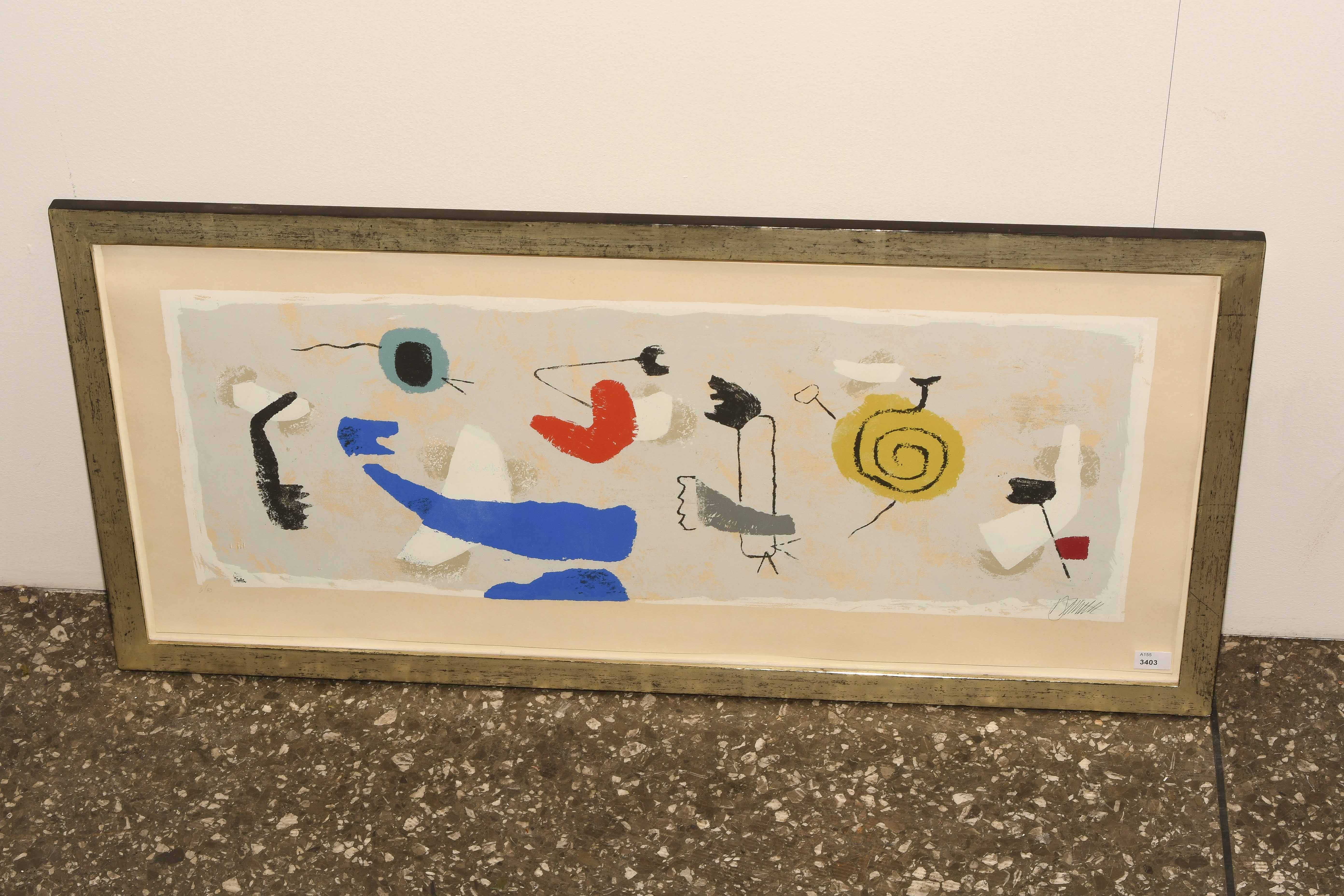 "Schwebend. Fries mit gelber Spirale". 1952. Farbserigraphie. 6/50. Unten rechts in Bleistift signiert. Blattgrösse 31,2x73 cm. Gerahmt. -Blatt minimst gebräunt. Verso am oberen Rand an Rückkarton montiert.