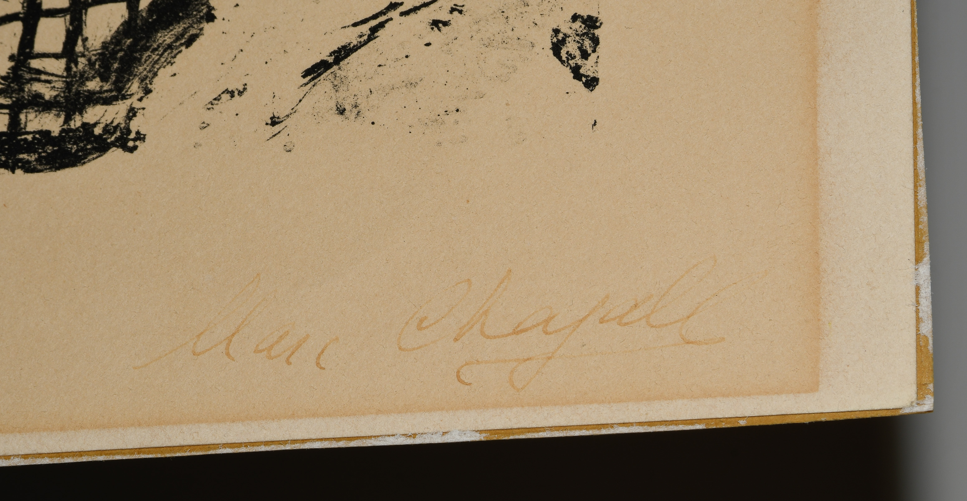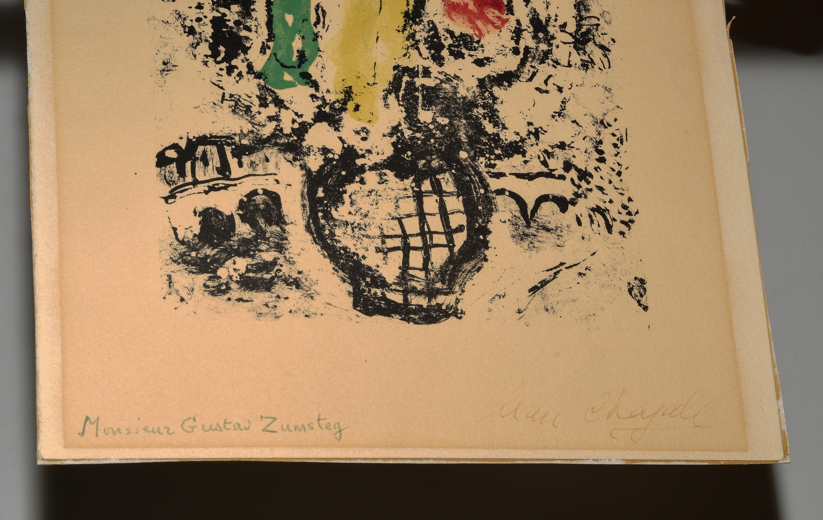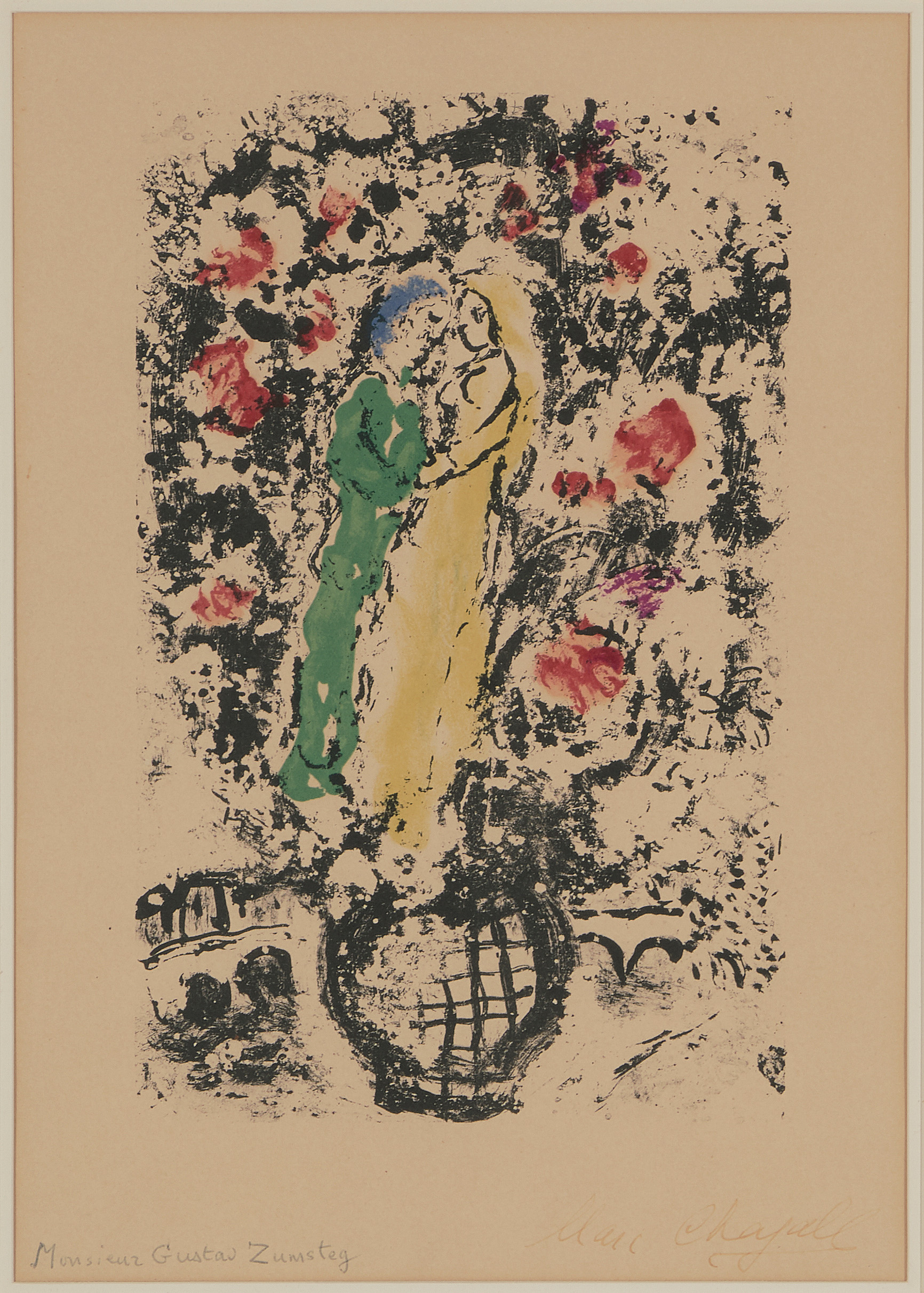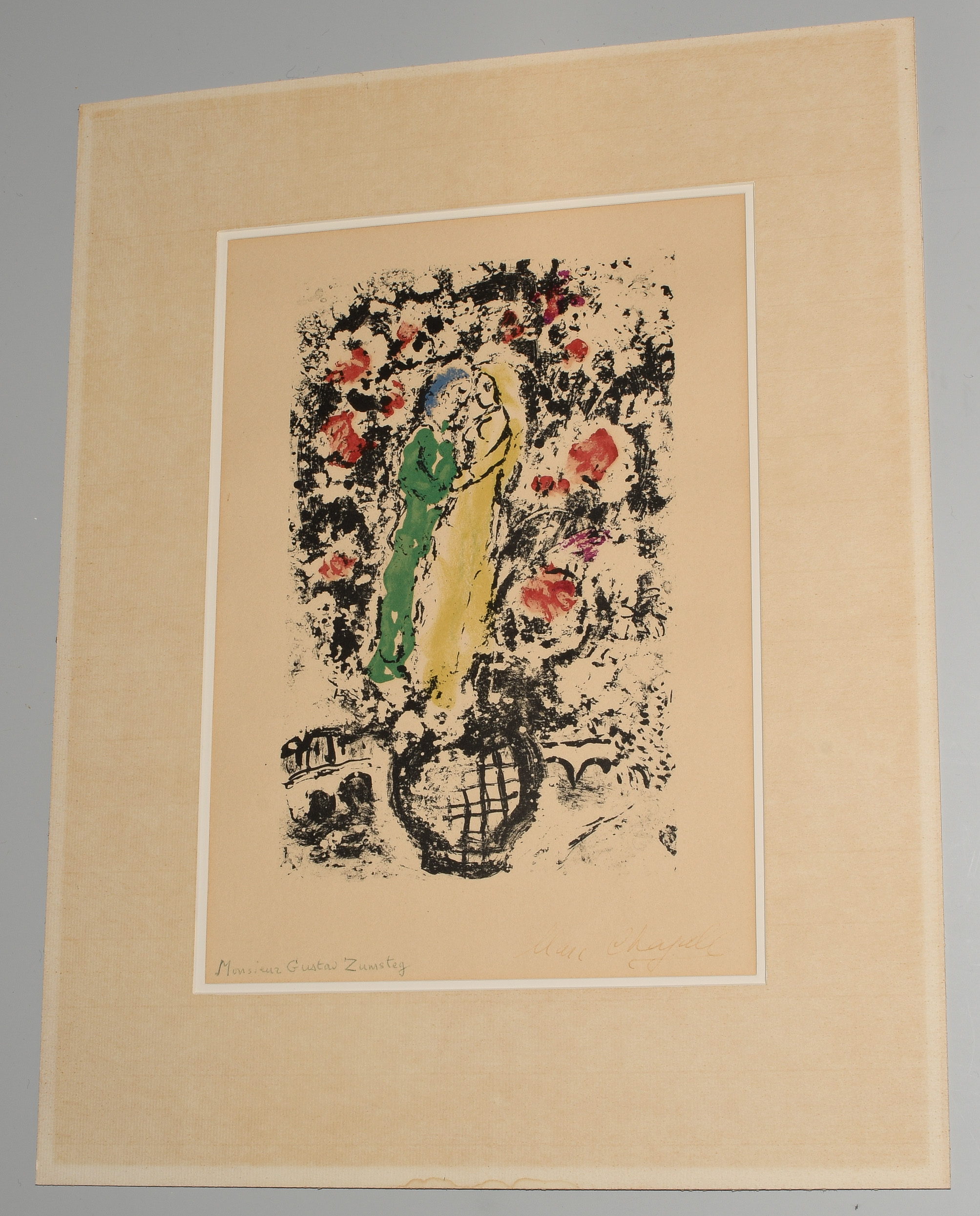 "Bateau-Mouche". 1959. Farblithographie. Unten rechts in Tusche signiert. Unten links mit Kugelschreiber bezeichnet: "Monsieur Gustav Zumsteg". Verso gedruckt: "Lithographie originale de Marc Chagall". Blattgrösse 32x23,5 cm. Gerahmt. -Blatt leicht gebräunt. Hellerer Lichtrand. Wenige Knitter. Verso an allen vier Rändern an Passepartout montiert.