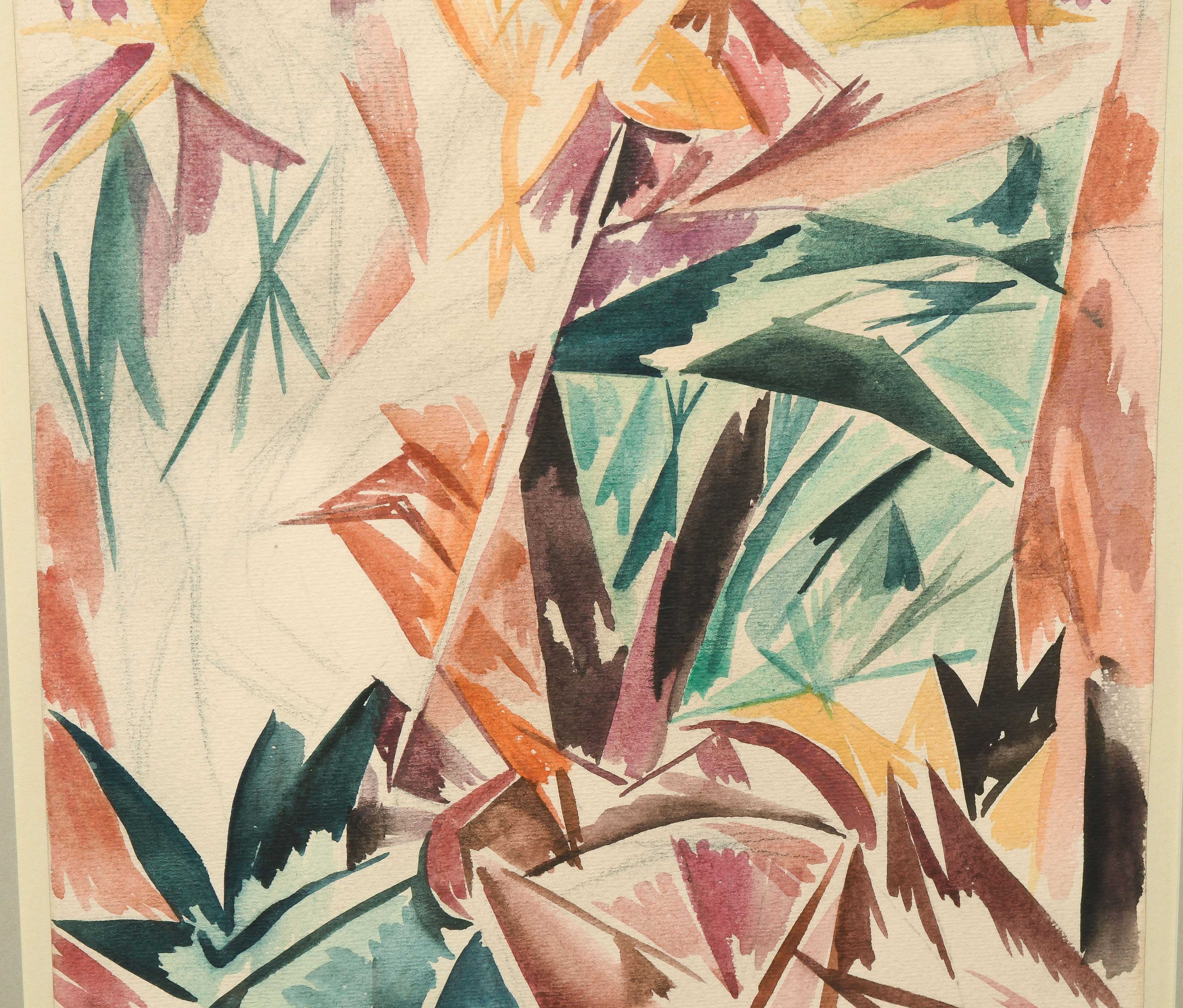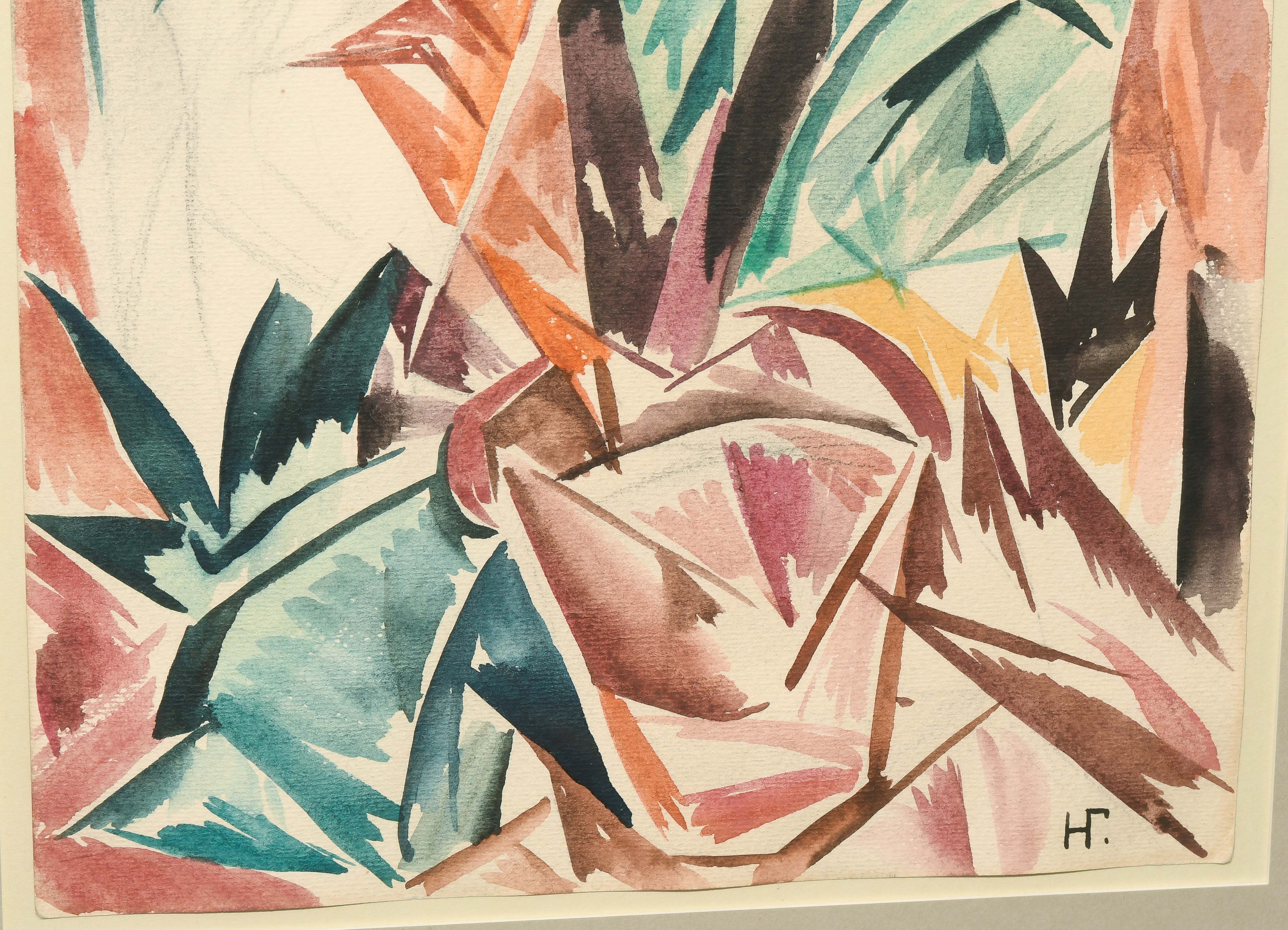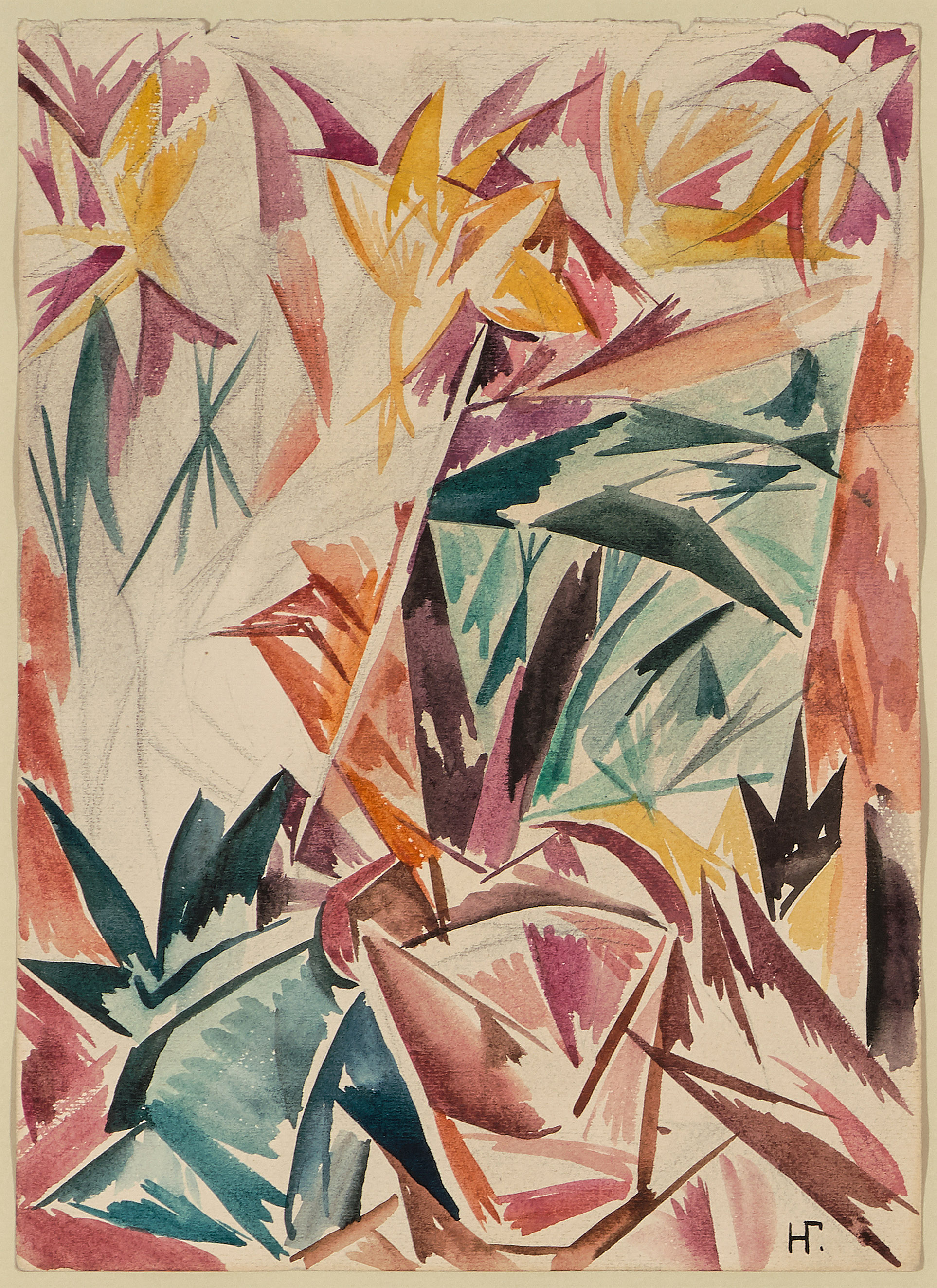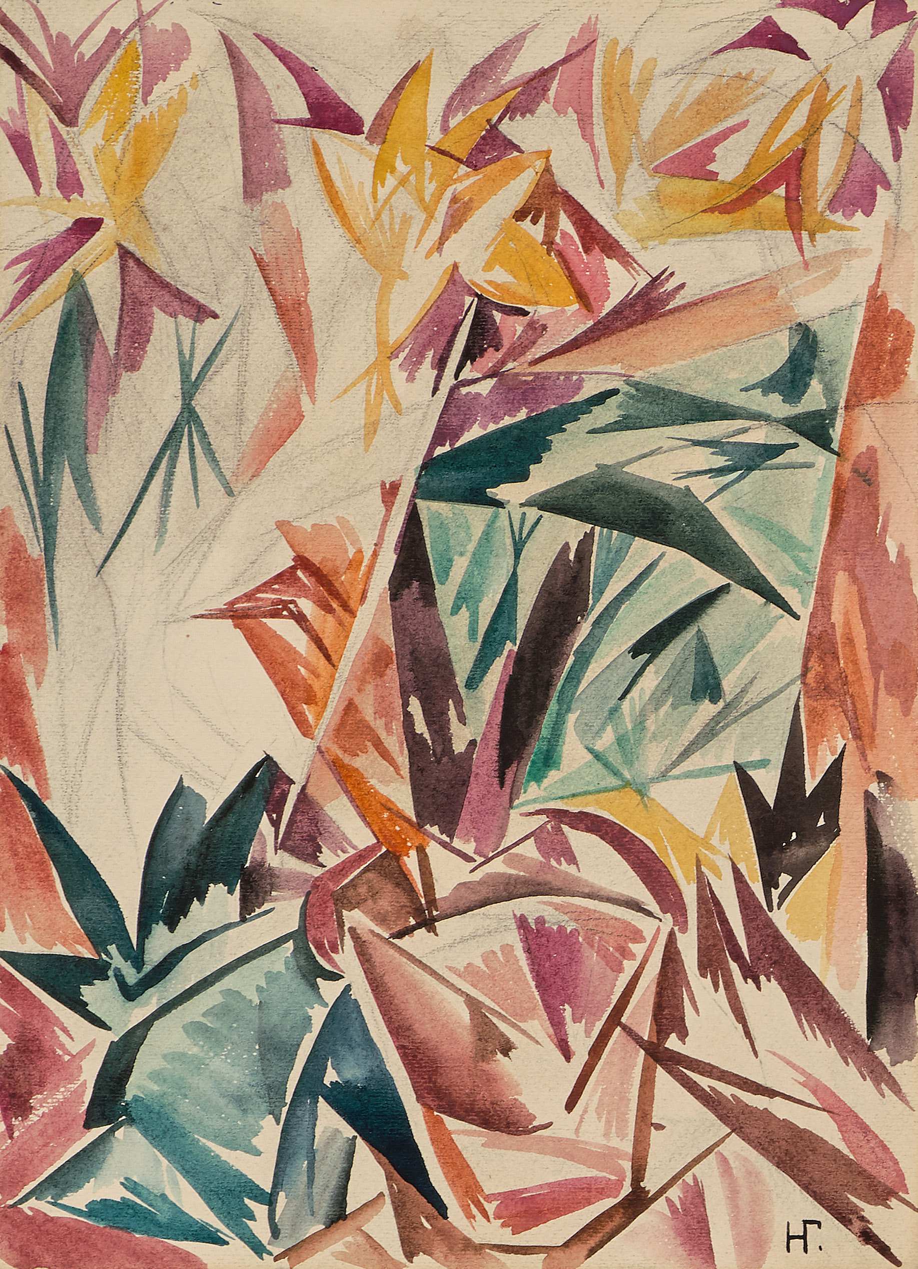 "Forêt (étude pour la toile conservée au Musée de Perm)". 1913/14. Bleistift, Aquarell und Gouache auf Papier. Unten rechts in Tusche kyrillisch monogrammiert. Blattgrösse 29,5x21,3 cm. Gerahmt. -Blatt leicht gebräunt. Ränder und Ecken leicht bestossen. Am oberen Rand Abrissspuren. Verso partiell an Rückwand montiert.