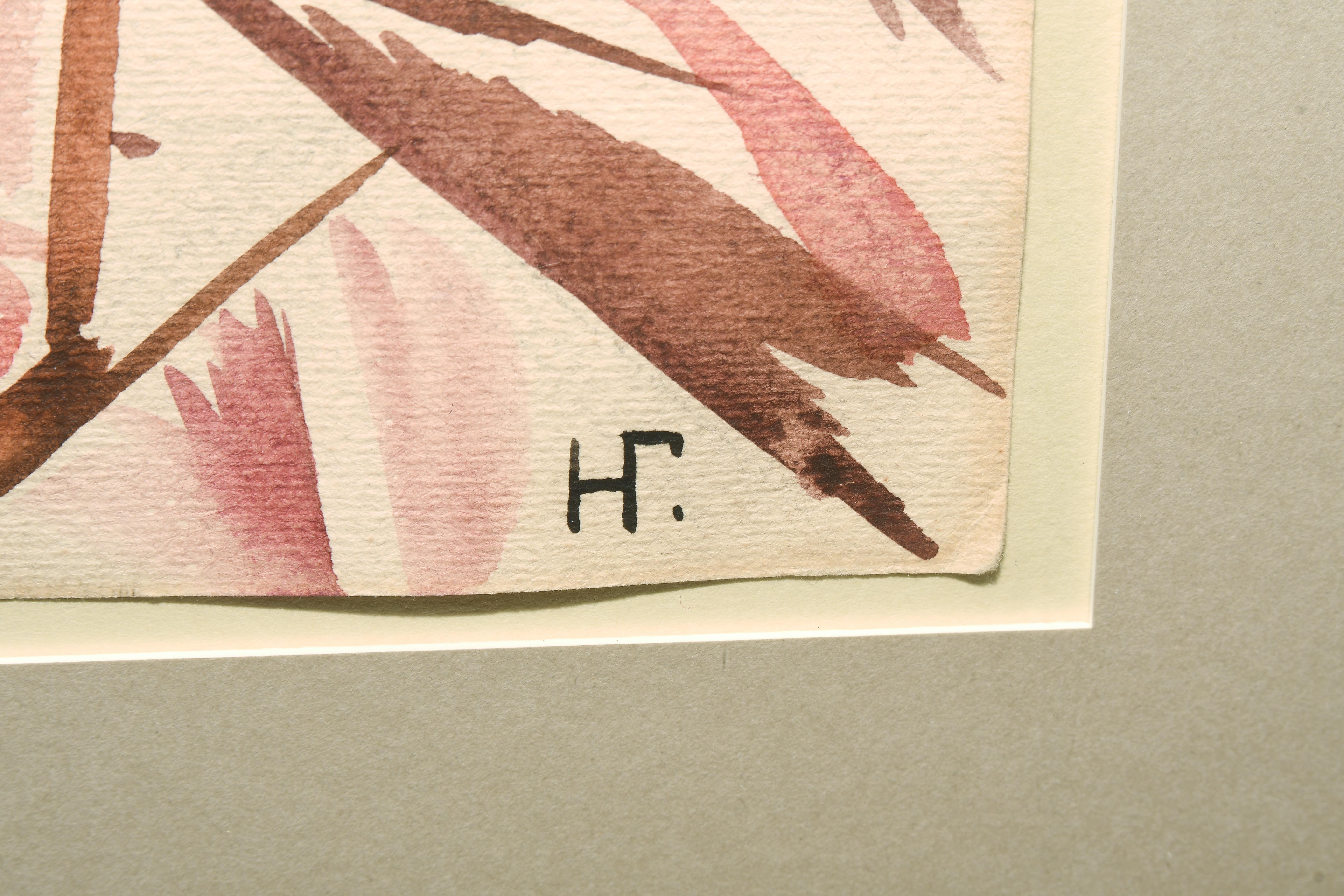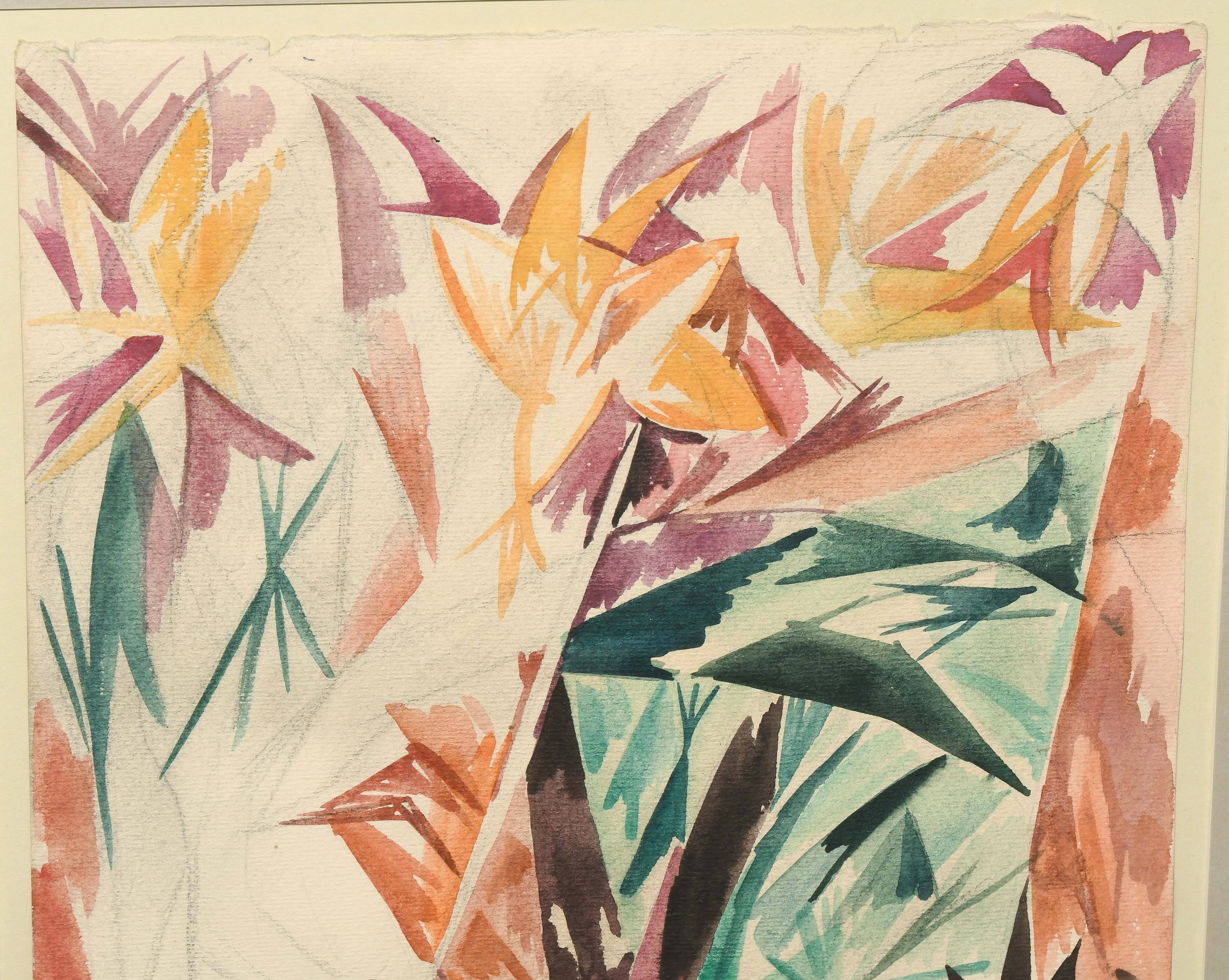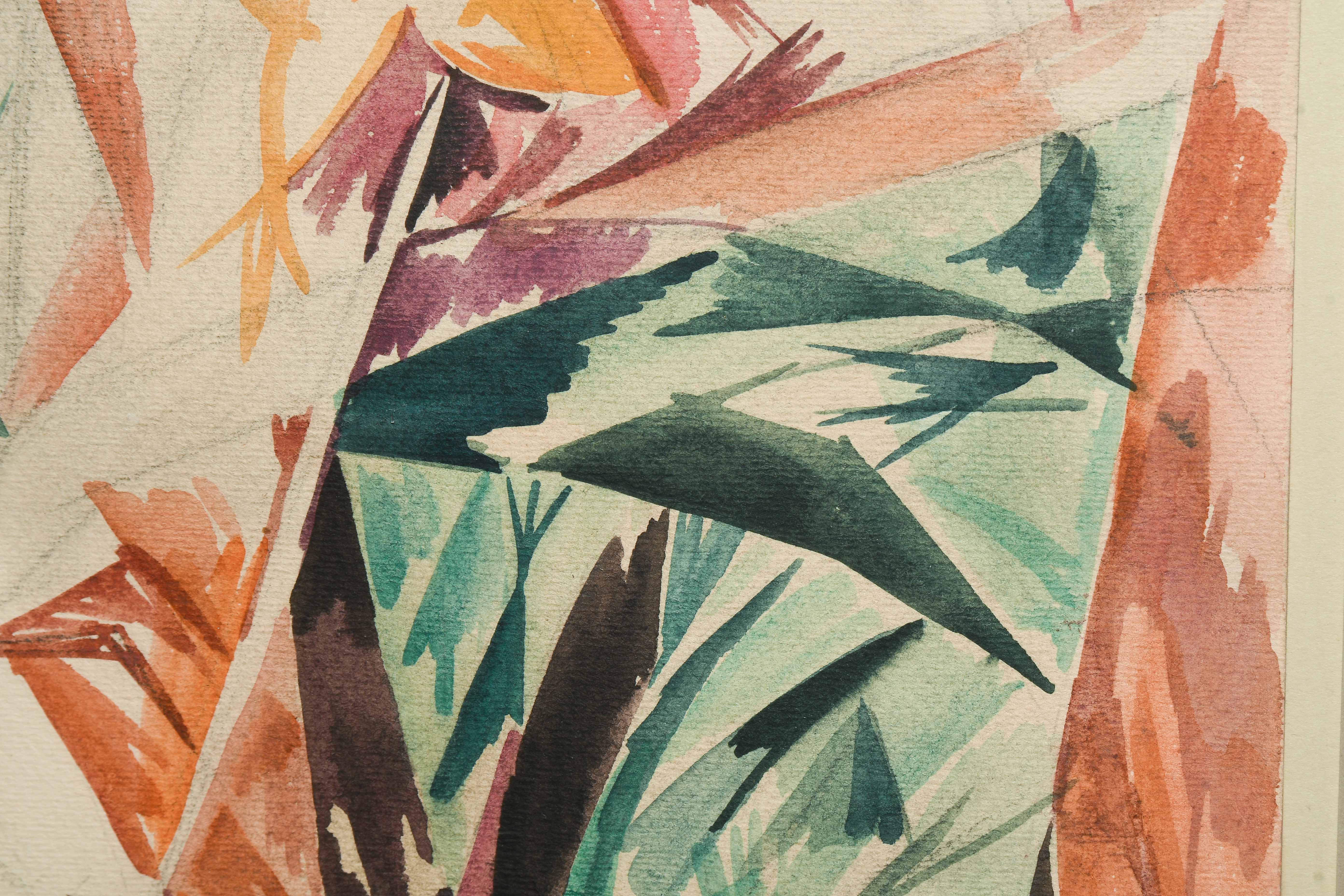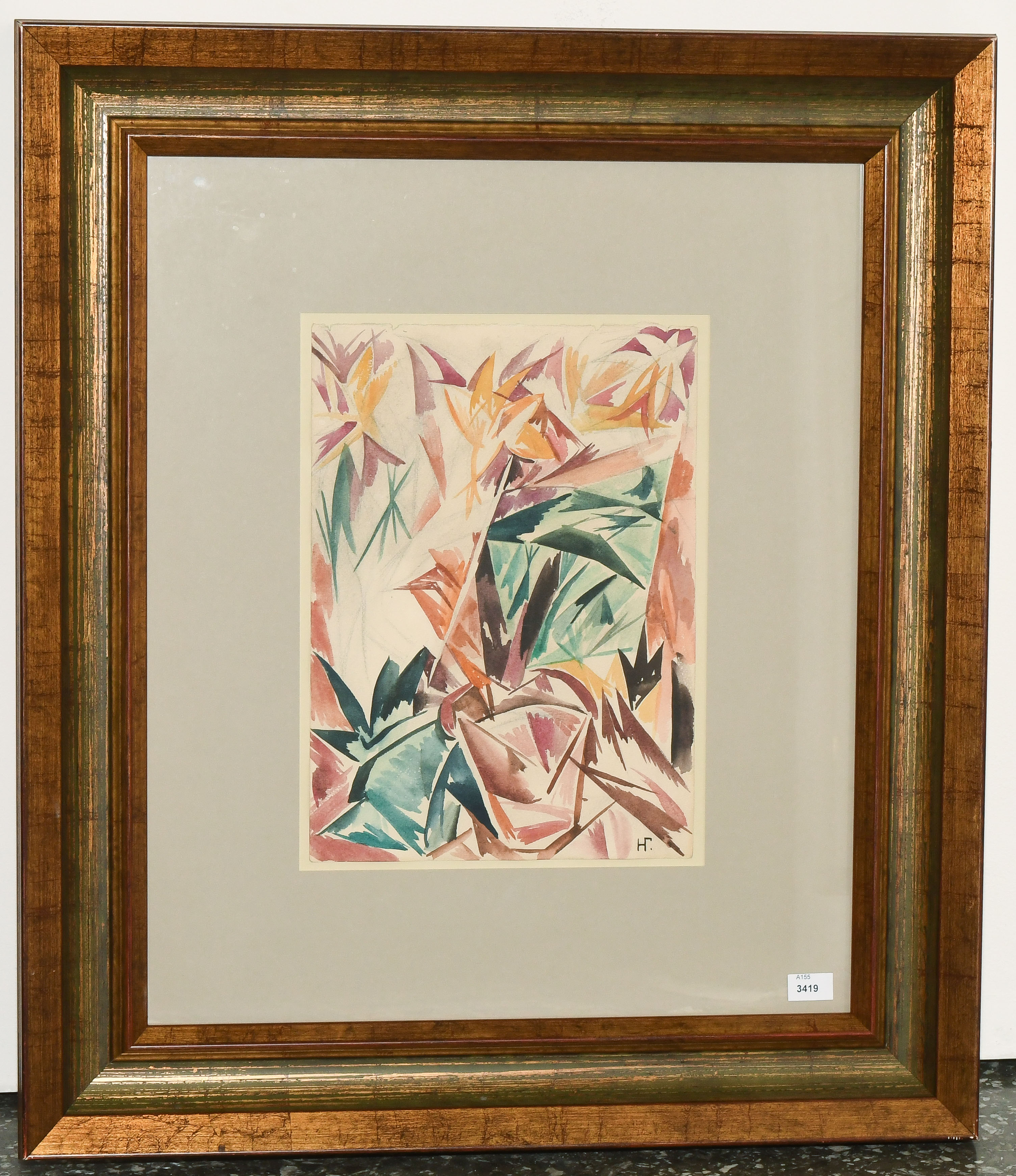 "Forêt (étude pour la toile conservée au Musée de Perm)". 1913/14. Bleistift, Aquarell und Gouache auf Papier. Unten rechts in Tusche kyrillisch monogrammiert. Blattgrösse 29,5x21,3 cm. Gerahmt. -Blatt leicht gebräunt. Ränder und Ecken leicht bestossen. Am oberen Rand Abrissspuren. Verso partiell an Rückwand montiert.