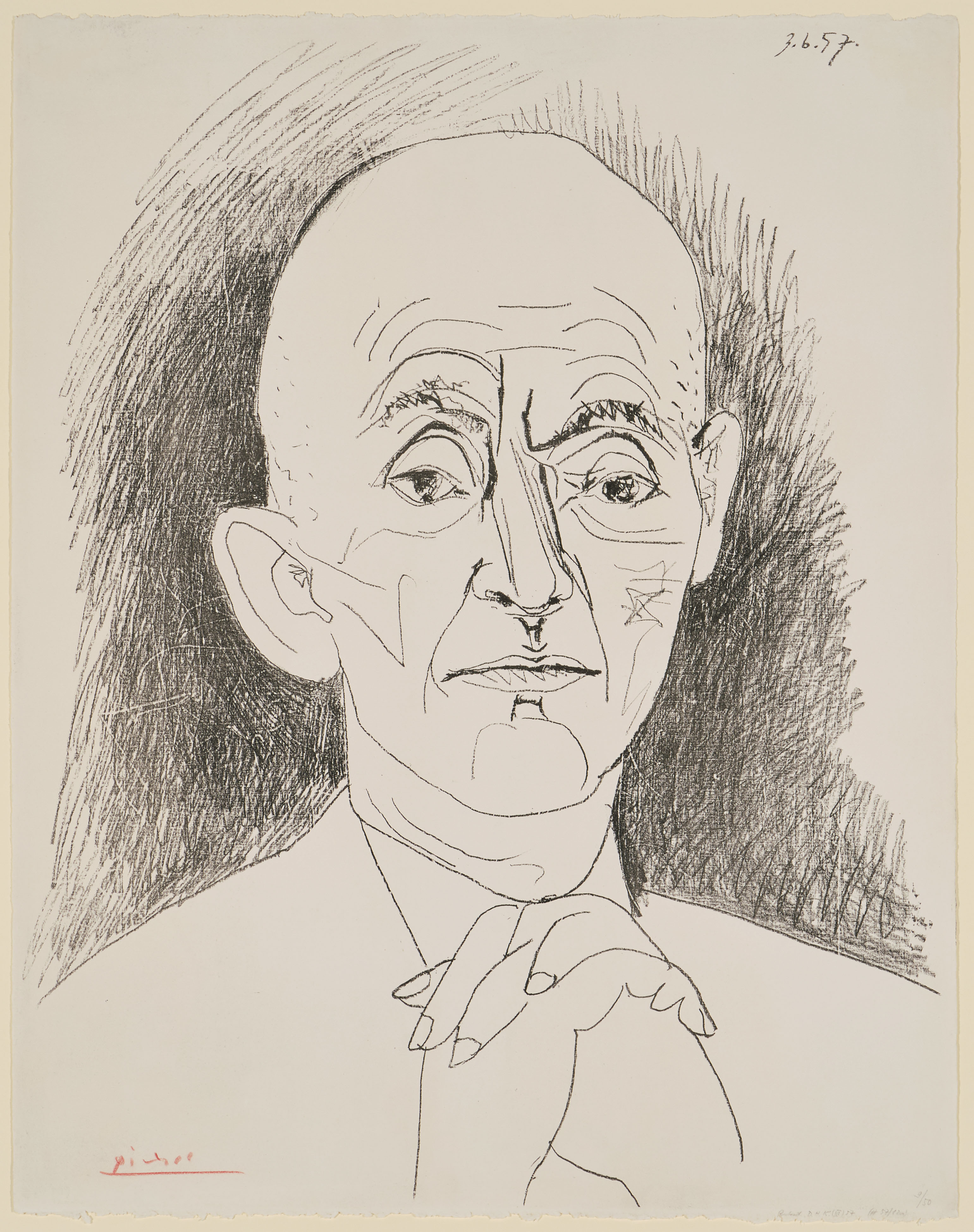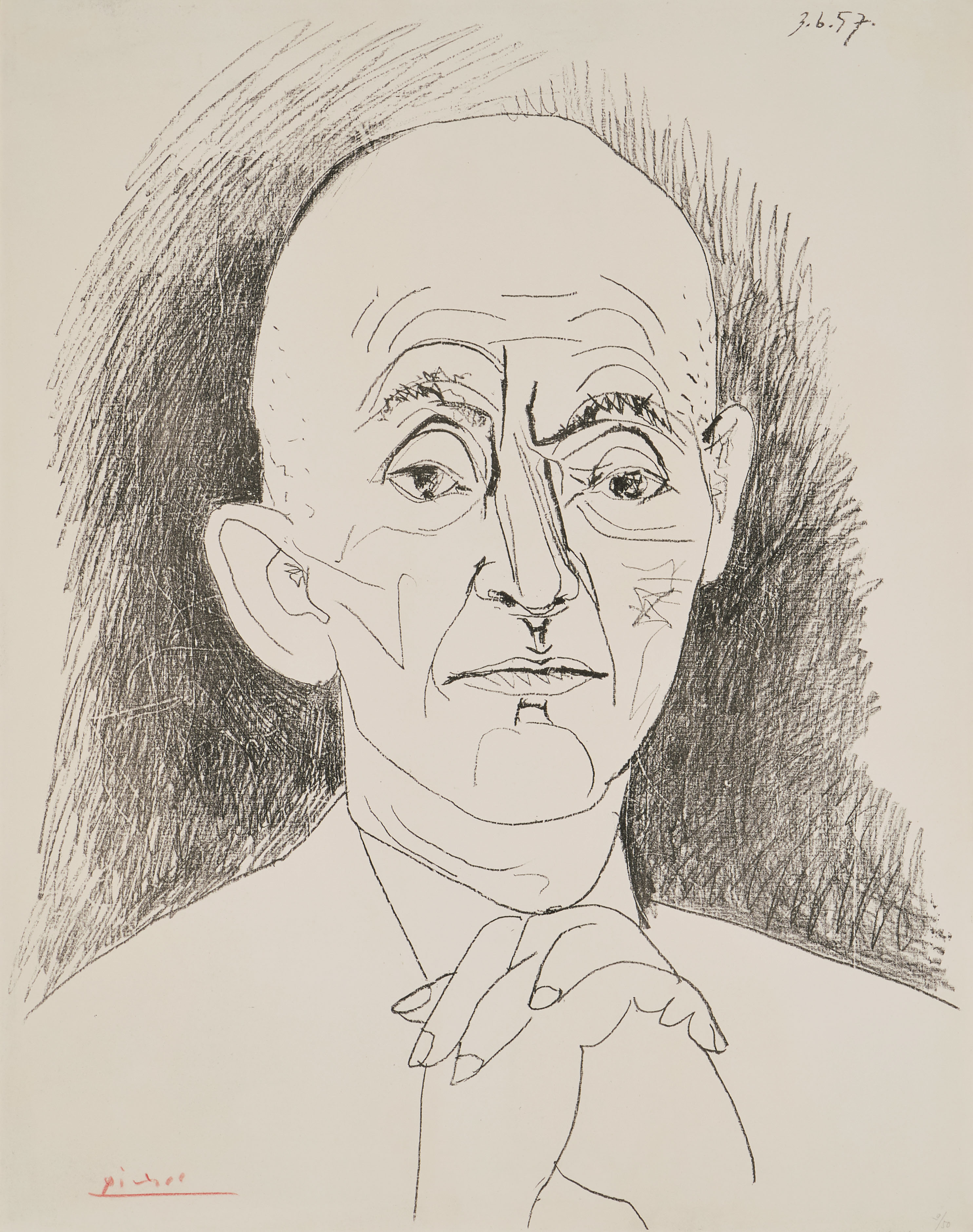 "Portrait de D.H. Kahnweiler, III". 1957. Lithographie. 9/50. Unten links in rotem Buntstift signiert. Oben links im Druck datiert: "3.6.57". Blattgrösse 65,5x50,4 cm. -Blatt minimst gebräunt. Ränder und Ecken leicht bestossen. Verso partiell an Rückkarton montiert.