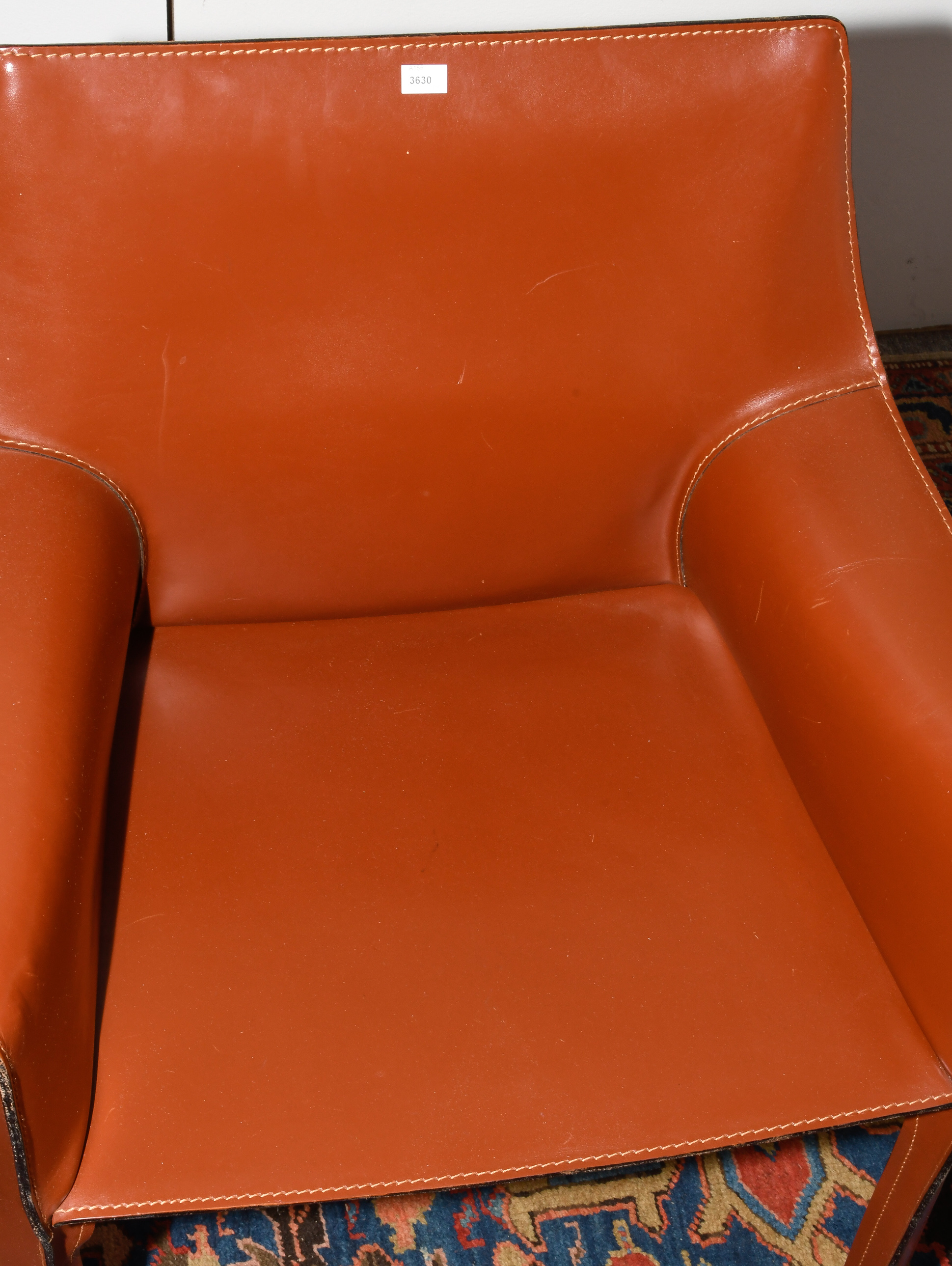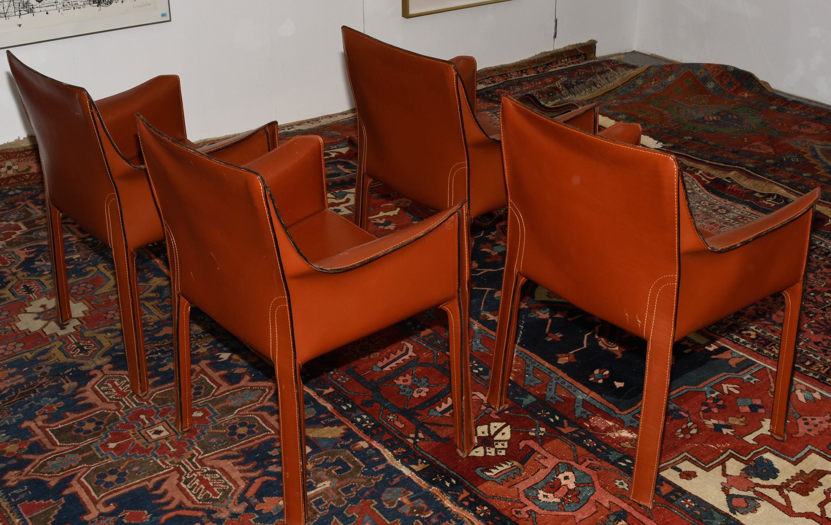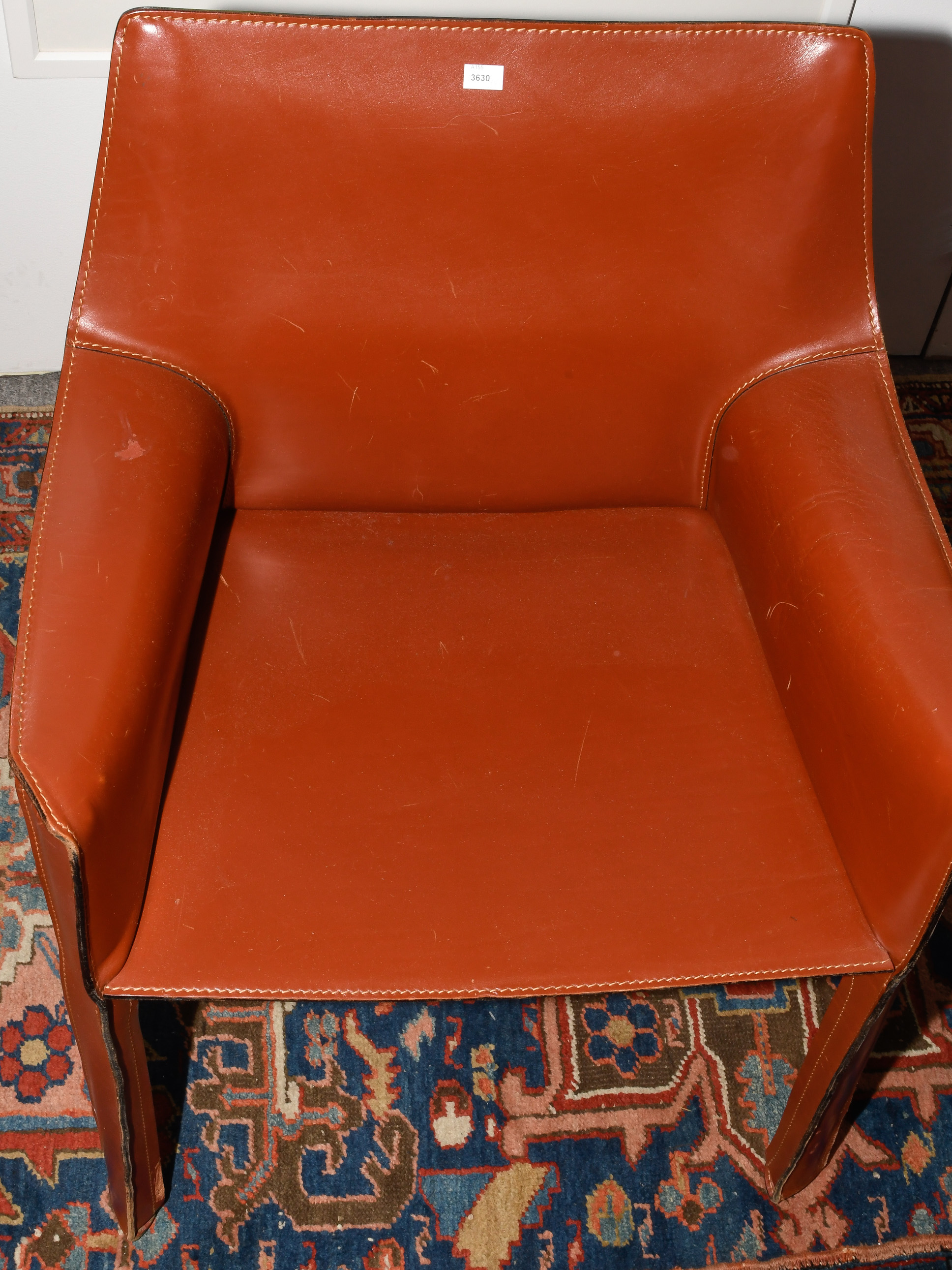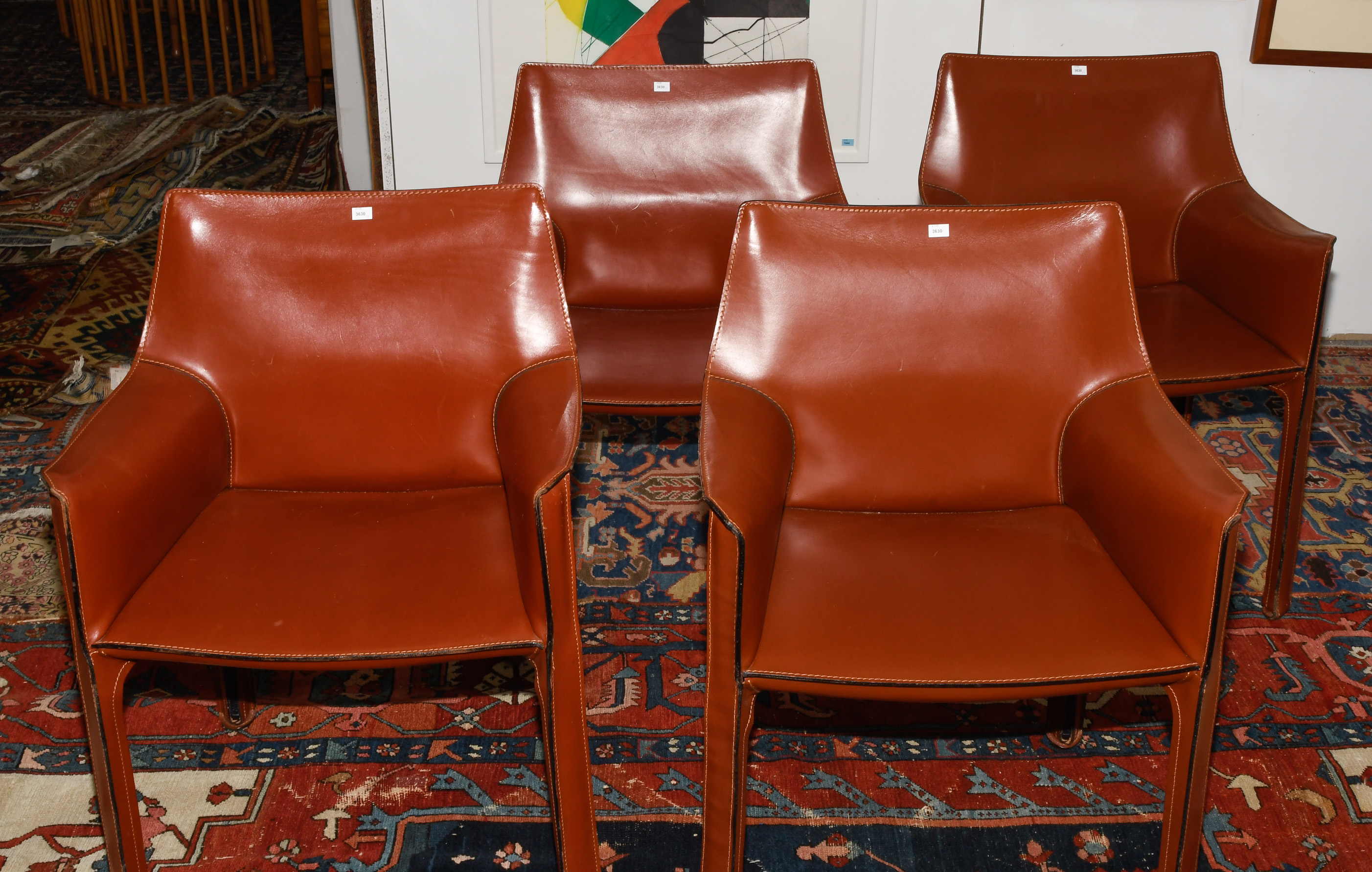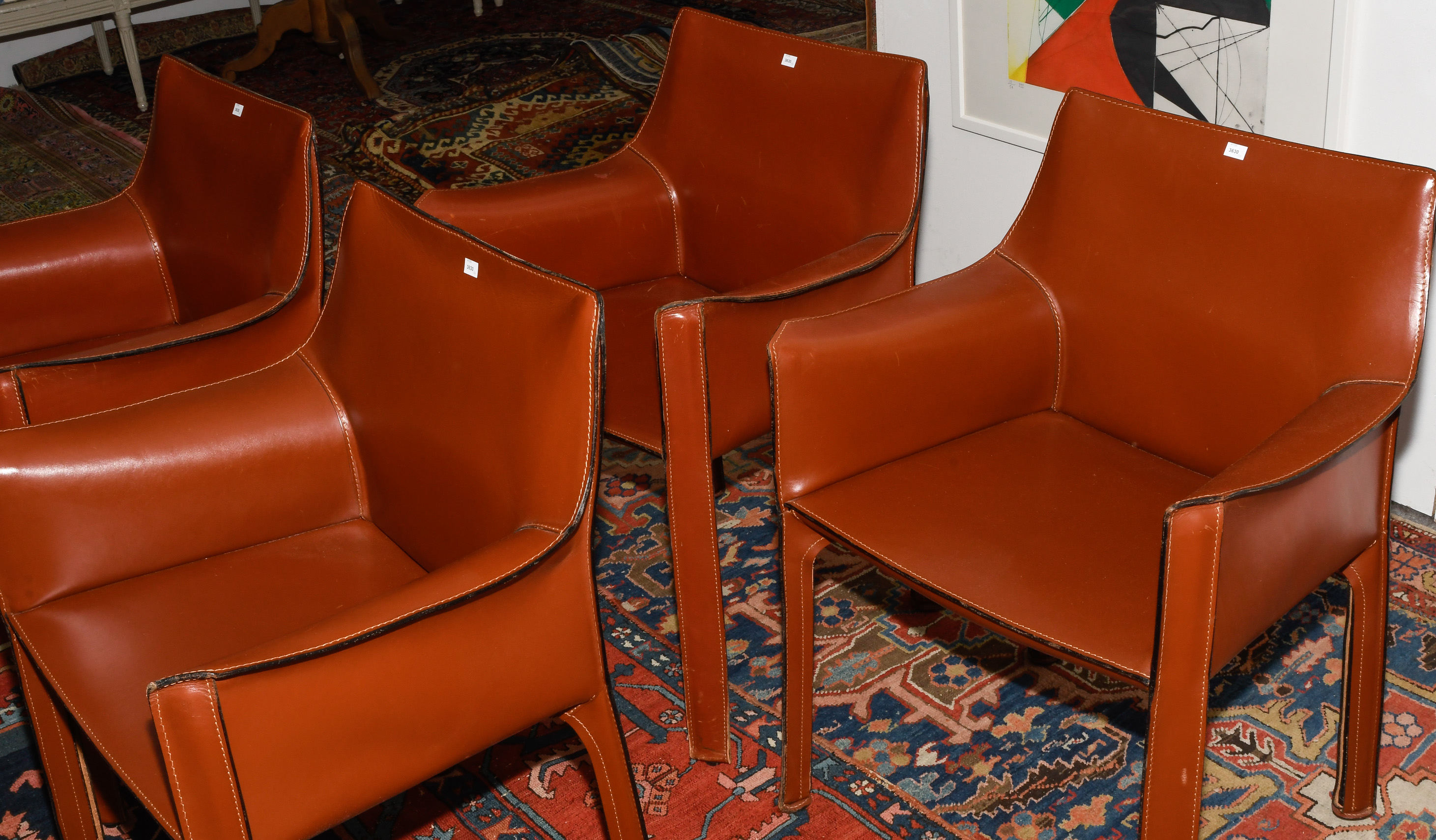 4 Armlehnsessel "Cab". Italien. Entwurf: 1977. Stahlgestell, Lederbezug mit Reissverschluss. Bezeichnet: Cassina. 61x50x82.