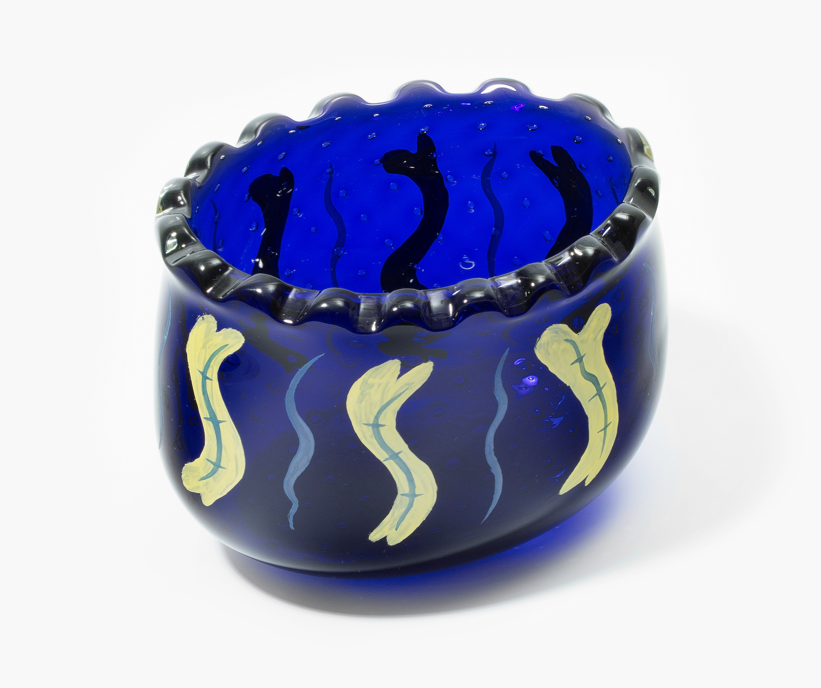 Vase "Pandora". Milano, ab 1993. Blaues Glas mit Luftblasen, emaillierter Dekor in Gelb und Grau. Bezeichnet: M. GIACON PER MEMPHIS EXTRA. H 17,5 cm.