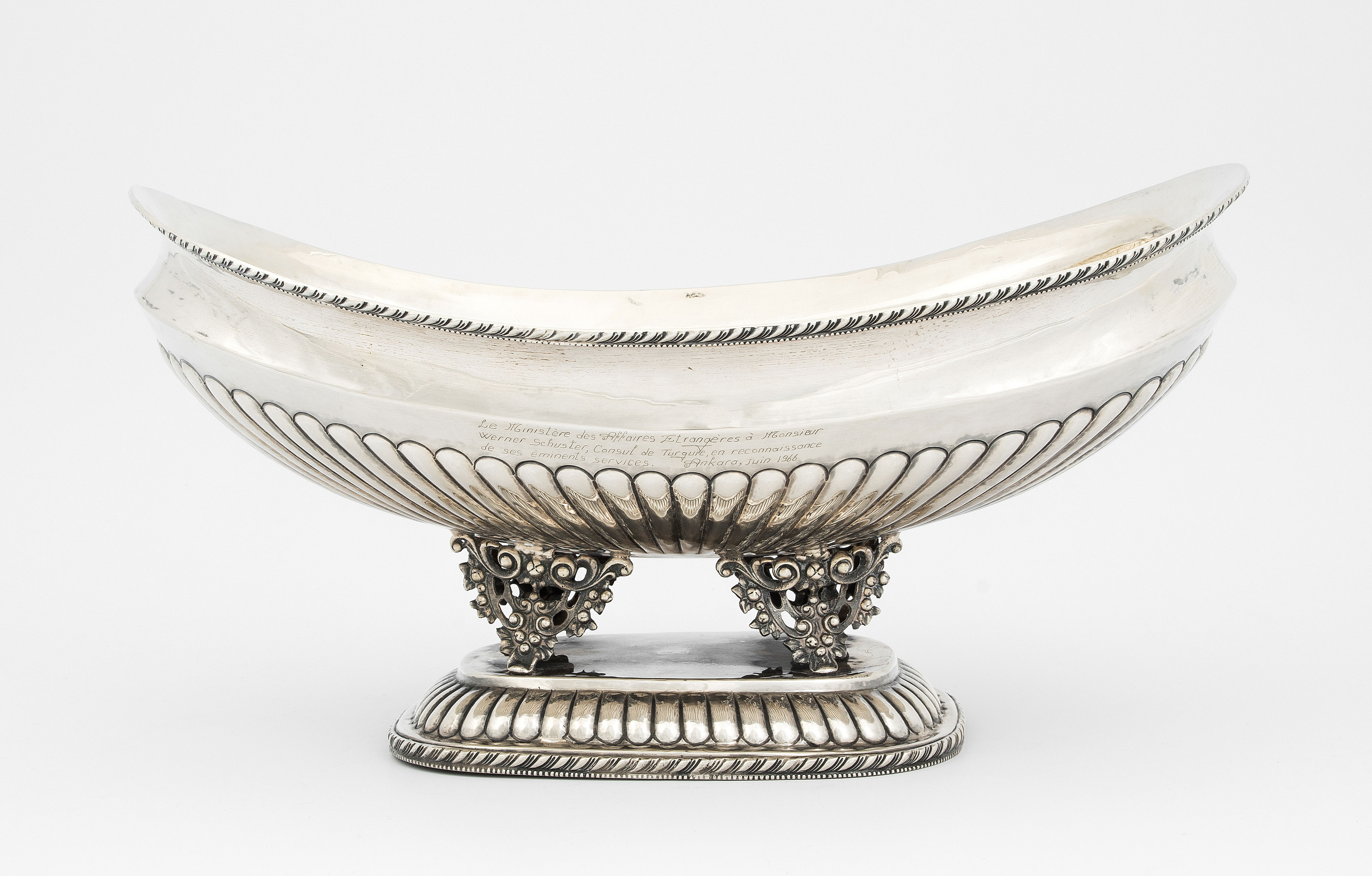 20.Jh. Silber, innen vergoldet. Gemarkt SK. Ovale, geschweifte Form über reliefierten, durchbrochenen Füssen auf gerundetem Podest. Schale und Podest teilweise godroniert. Wandung mit gravierter Widmung. Feingehalt 900. 37x19x21 cm, ca. 1130 g.