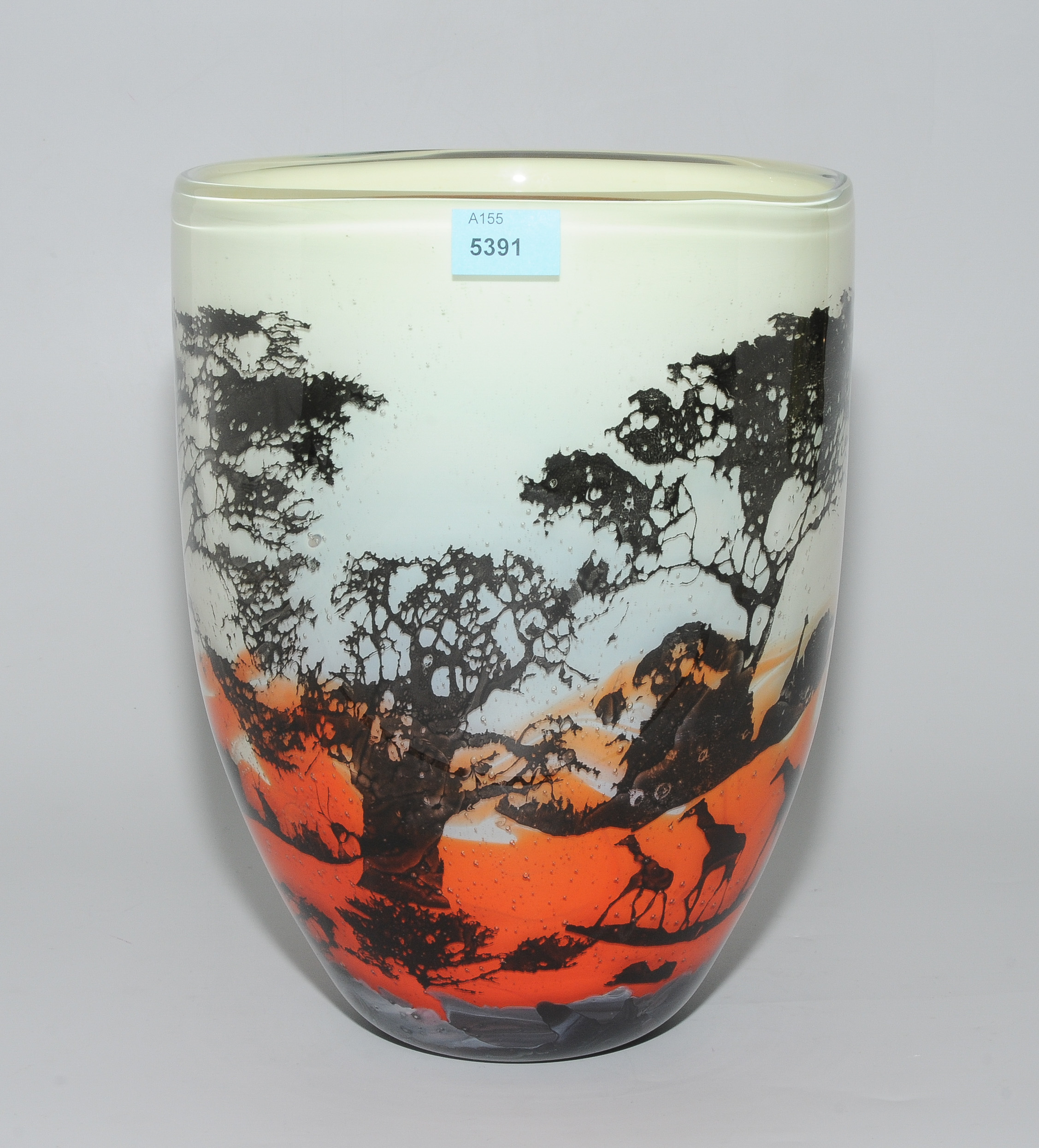 Ulrich Precht, Lauscha, 2011. Modell "Savanne". Farbloses Glas, tlw. grau marmoriert, beige und rot im Verlauf unterfangen. Landschaftsdekor in Schwarz. Runder, tiefer Gefässkörper. Bezeichnet: Ulrich Precht 2011. Savanne. (graviert). H 23 cm.
