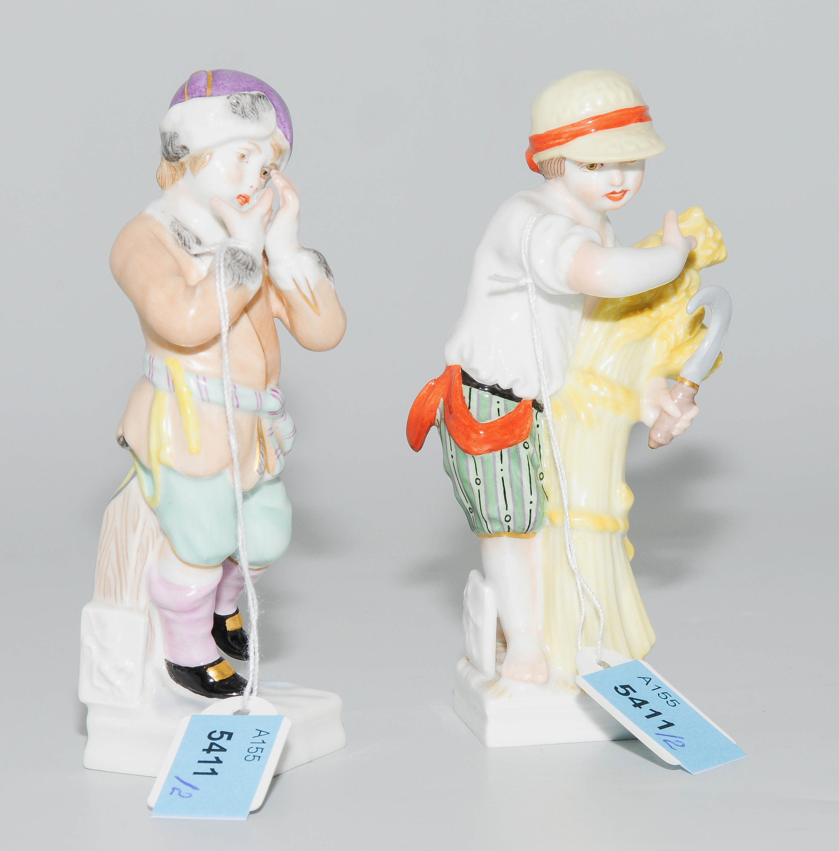 KPM Berlin, 20.Jh. Modell von Friedrich Elias Meyer, um 1775. Porzellan, polychrom bemalt und mit Goldstaffierungen. Monatsfiguren mit Sternzeichen: Jungfrau und Wassermann. Bezeichnet: Reichsapfel in Rot und Zepter in Blau. H 10,5 bzw. 11 cm.