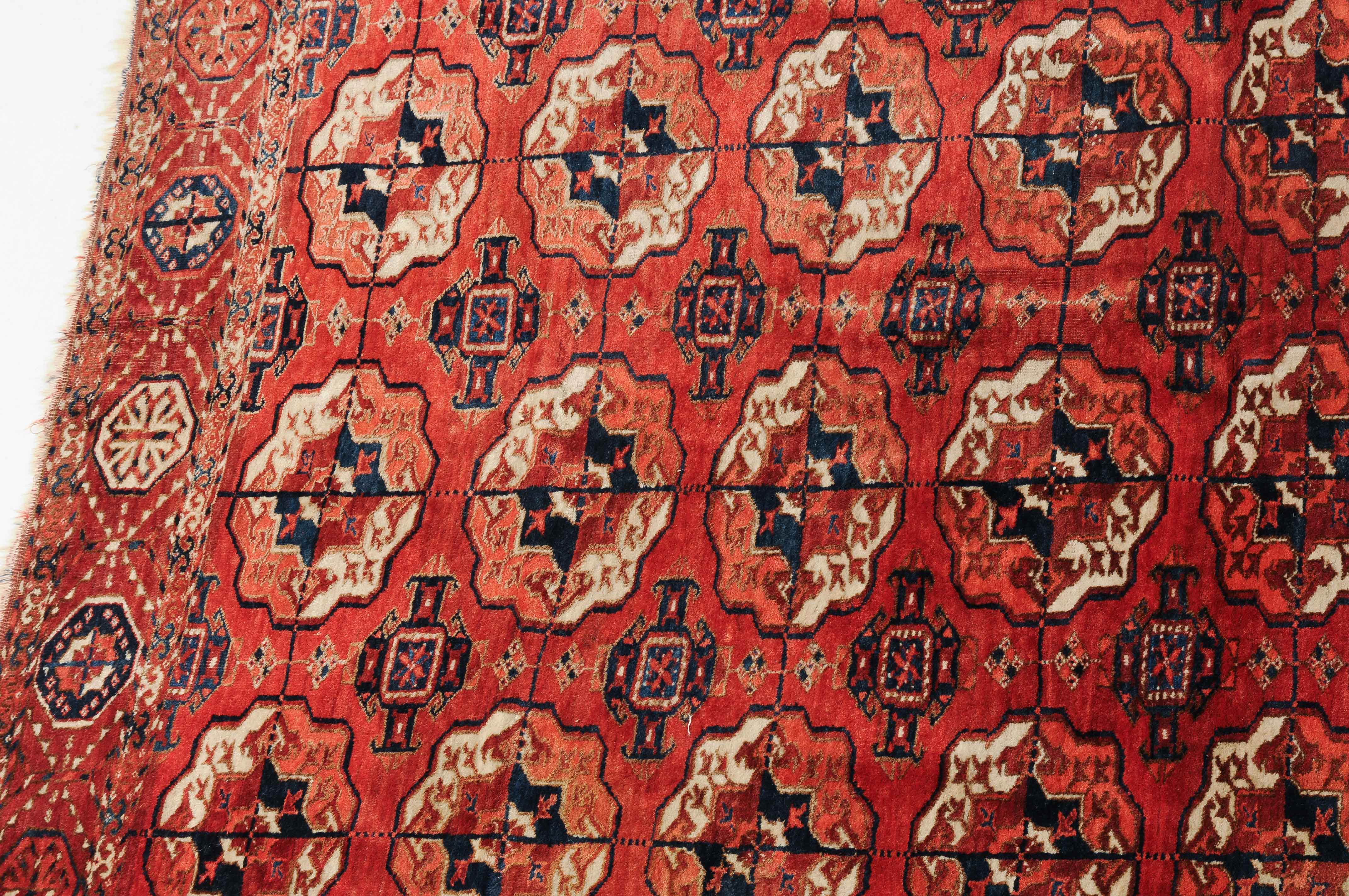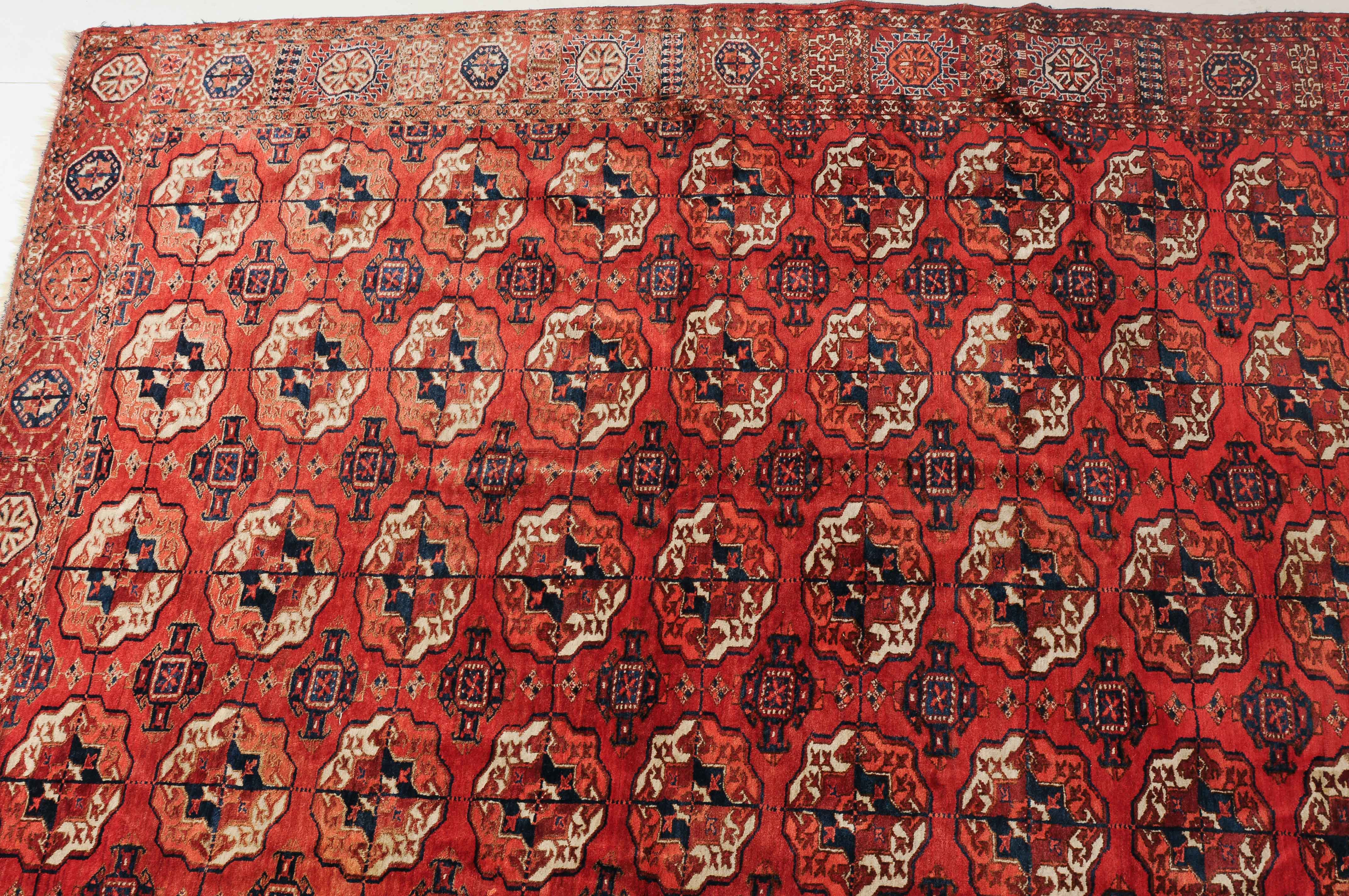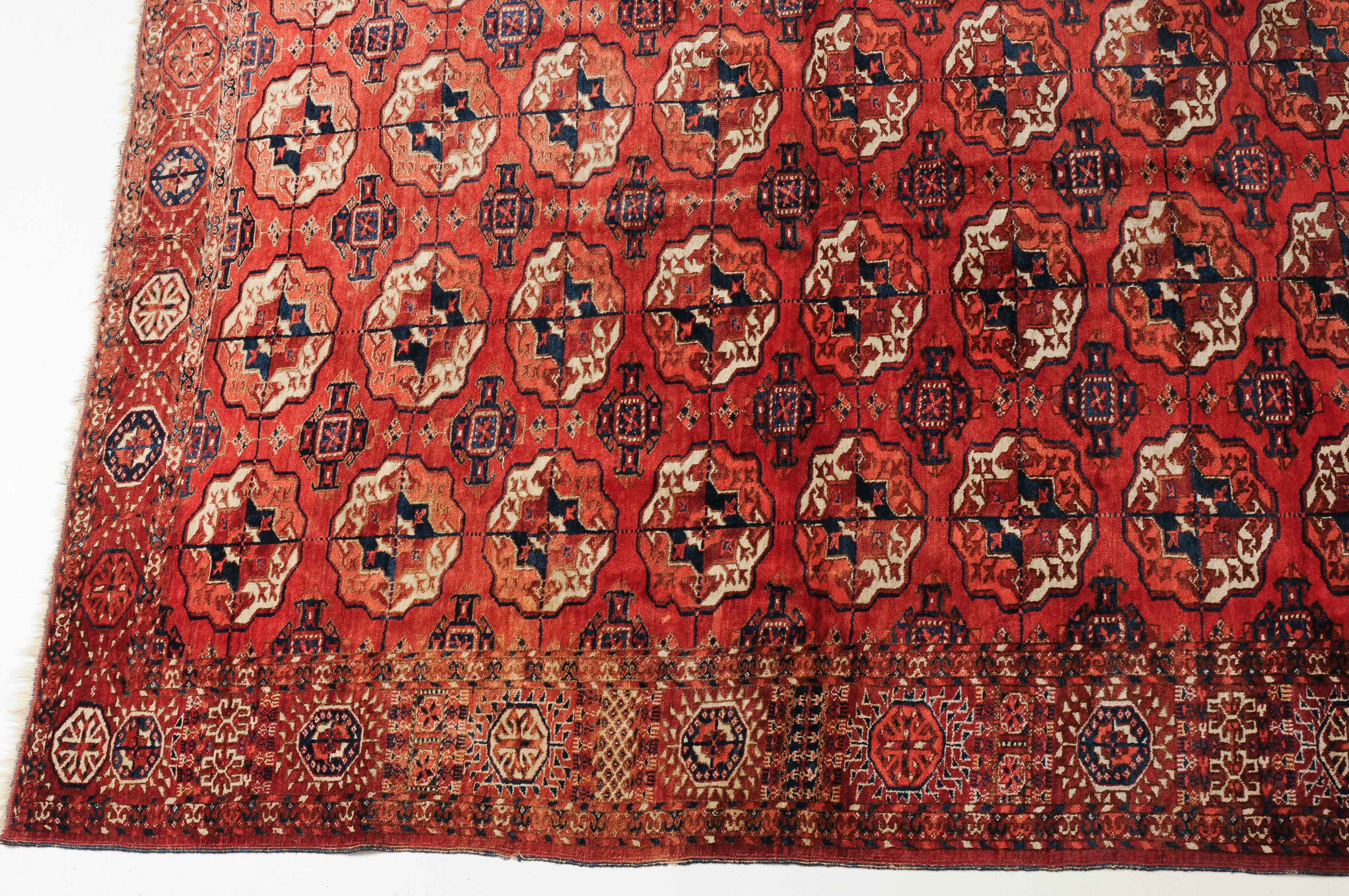 Turkmenistan, um 1900. Auf ziegelrotem Grund liegen 4 Hauptreihen mit je 10 Tekke-Buchara-Göls, begleitet von 3 Reihen mit sekundären Göls. Die Kassetten-Hauptbordüre ist mit alternierenden Oktogonen dekorativ belegt. Gebrauchsspuren. 200x255 cm (ft.6.6x8.4).