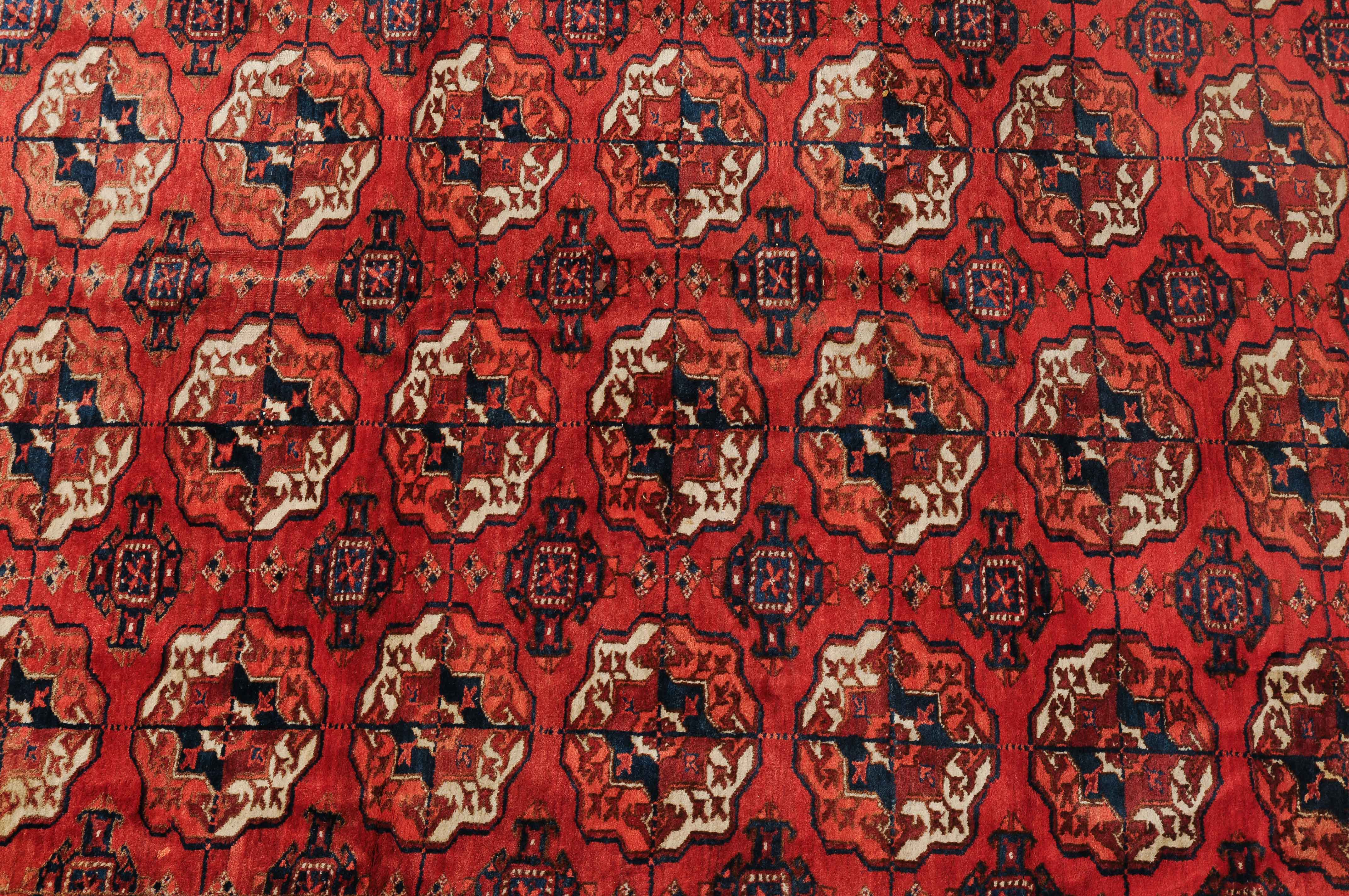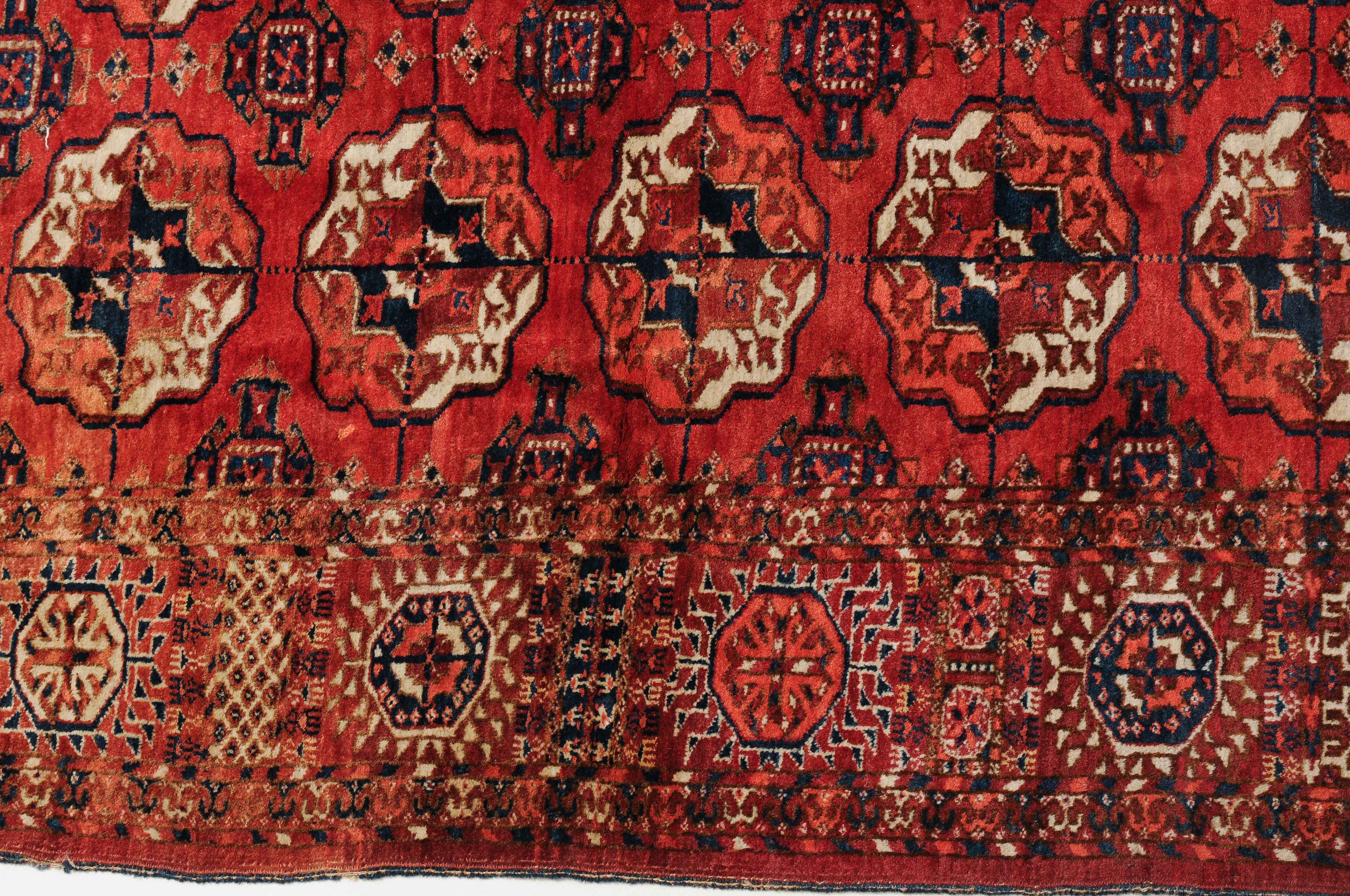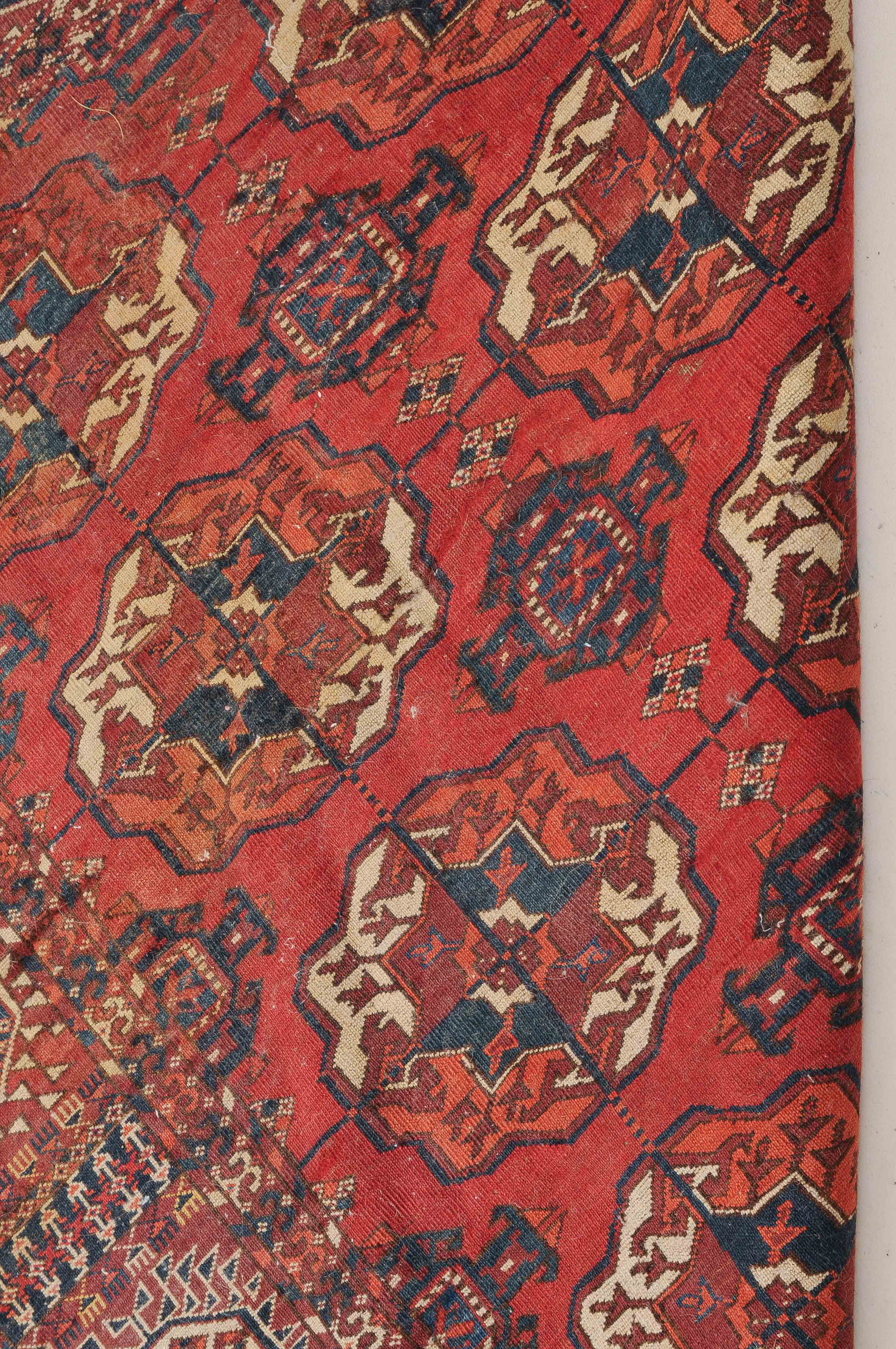 Turkmenistan, um 1900. Auf ziegelrotem Grund liegen 4 Hauptreihen mit je 10 Tekke-Buchara-Göls, begleitet von 3 Reihen mit sekundären Göls. Die Kassetten-Hauptbordüre ist mit alternierenden Oktogonen dekorativ belegt. Gebrauchsspuren. 200x255 cm (ft.6.6x8.4).