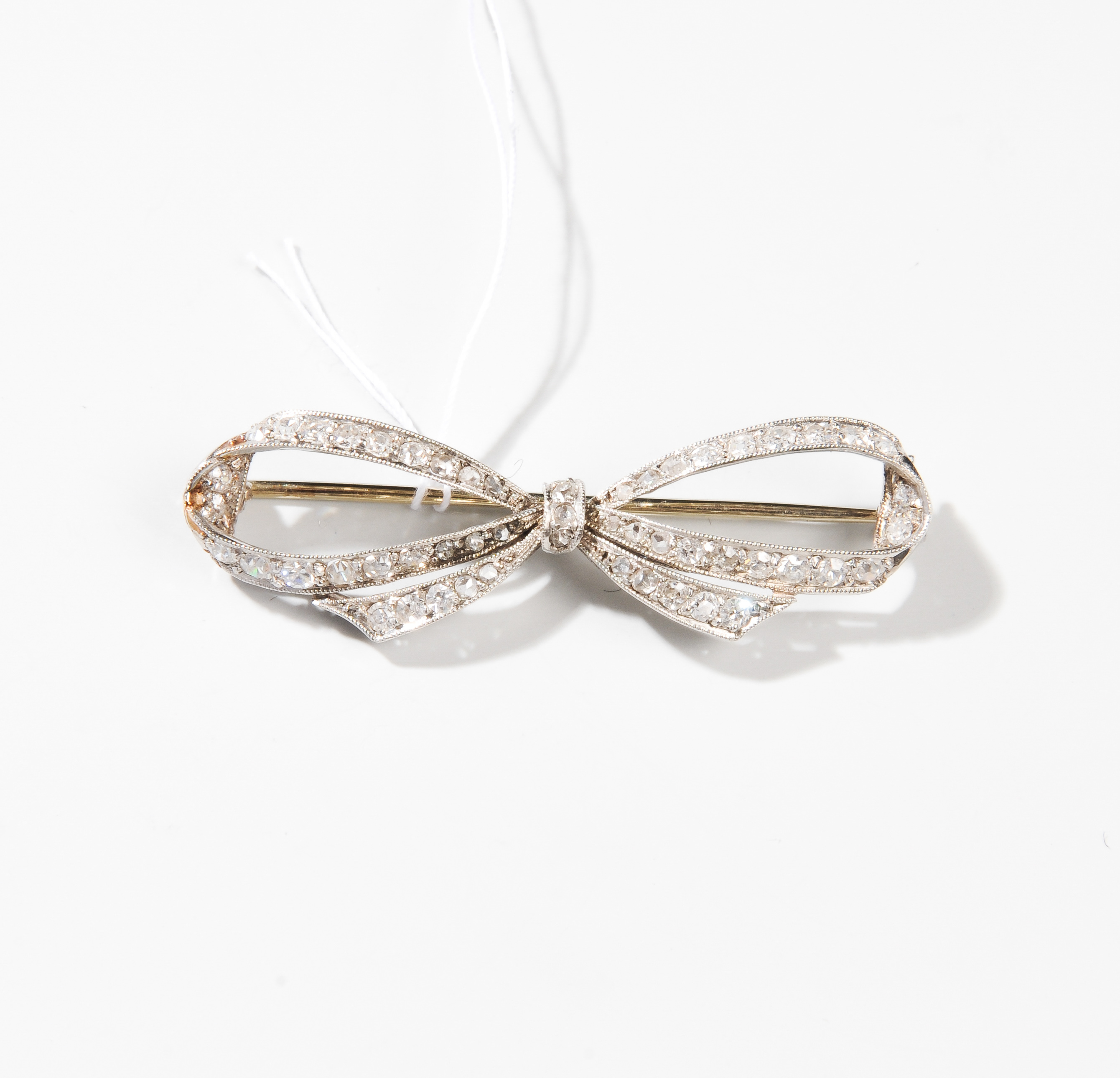 Um 1920. 750 Weissgold/Platin. Schleifenmotiv besetzt mit div. kl. Achtkant-Diamanten und Diamant-Rosen ca. 0.20 ct. 4x1,2 cm, 4,1 g.
