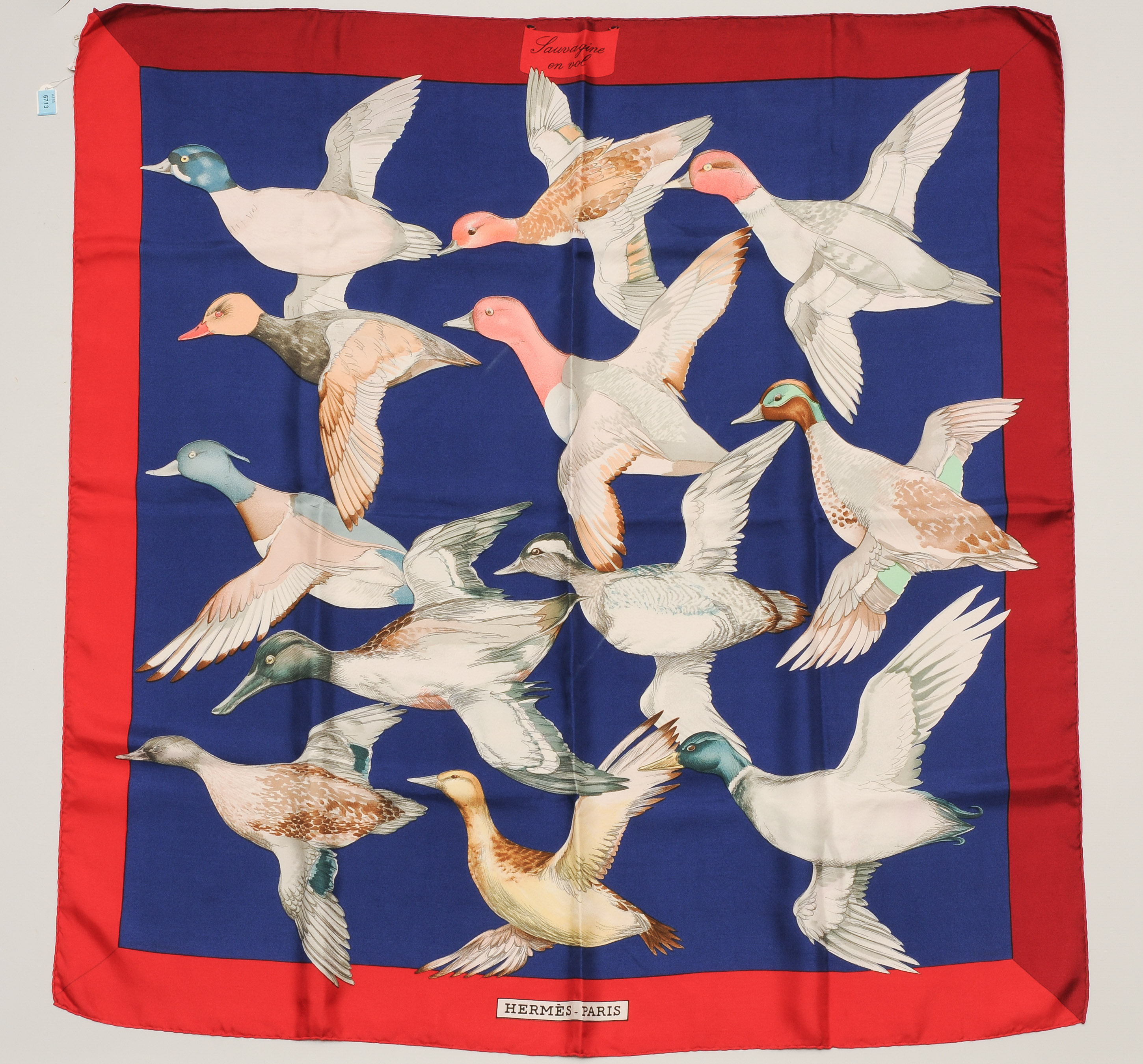 Seide. Rote Umrandung und blauer Grund. 87x87 cm.