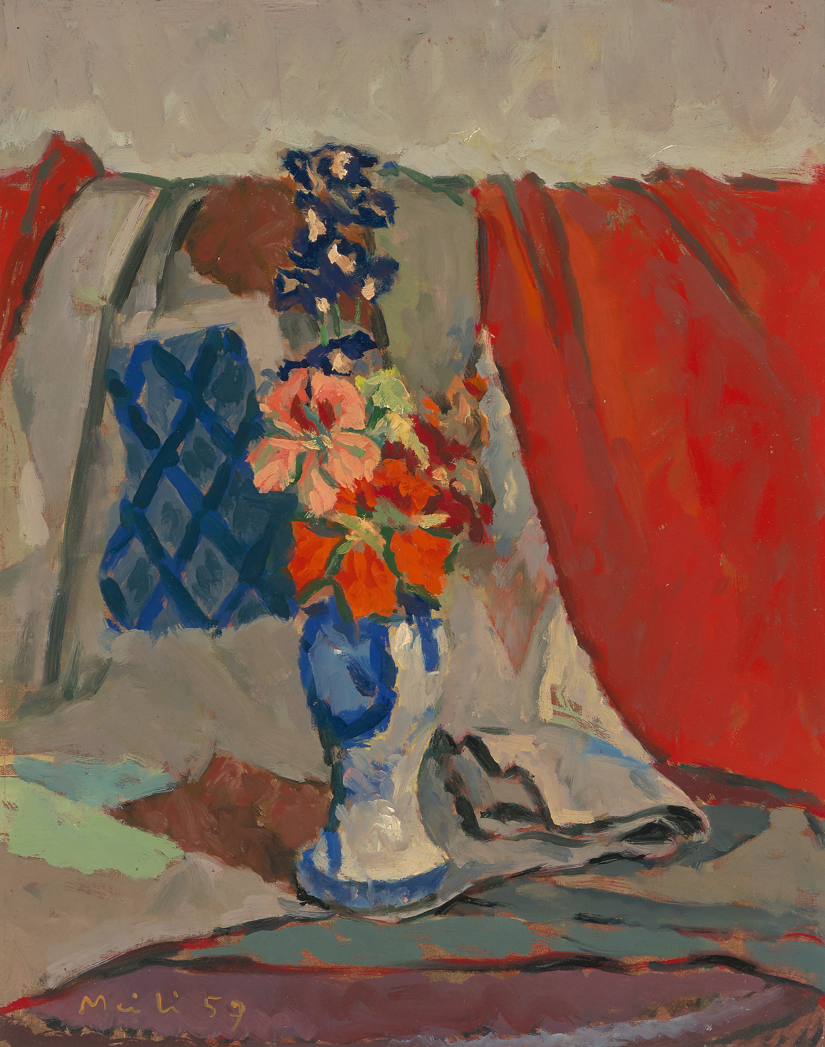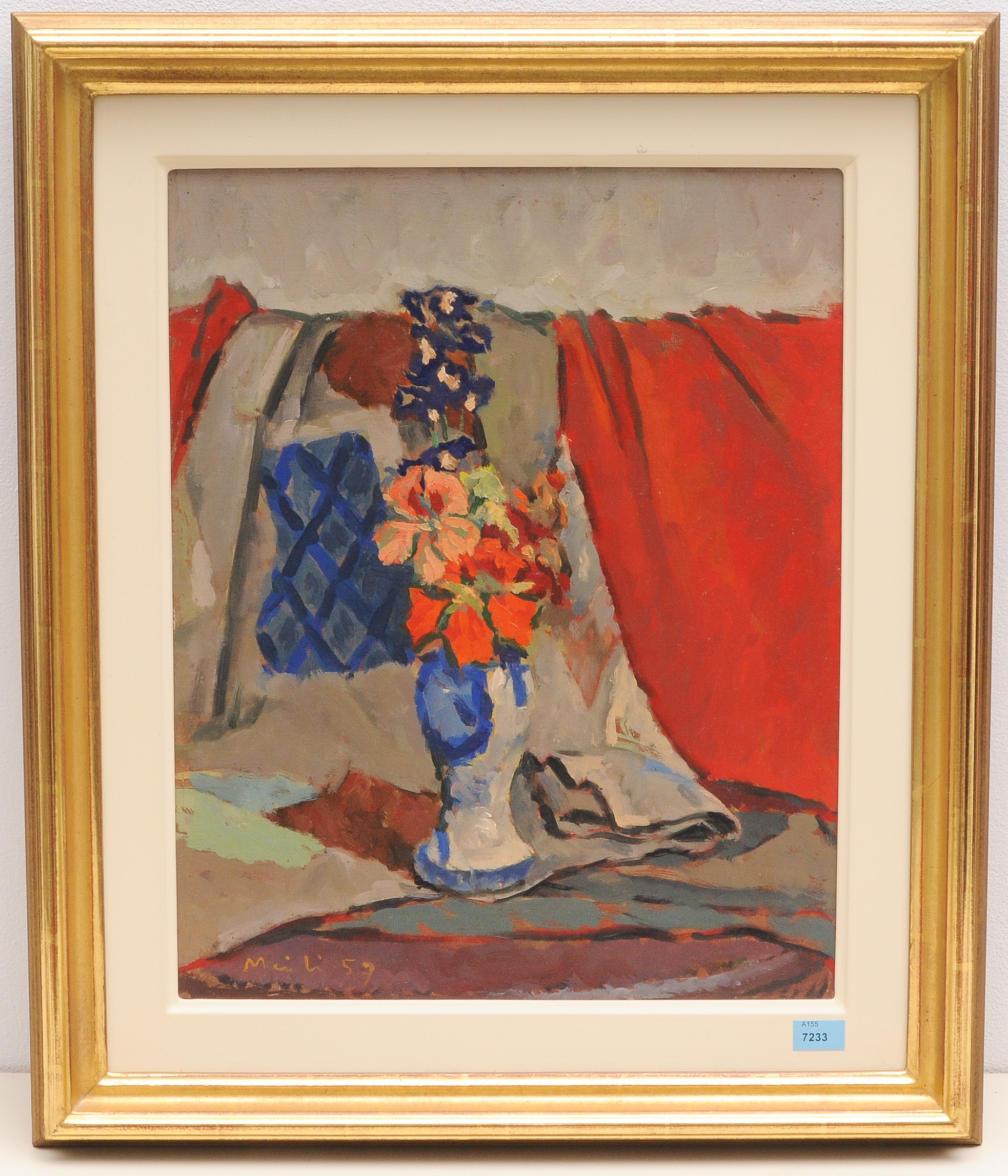 "Bouquet rouge et bleu, petit Bouquet", 1957. Öl auf Karton. Unten links signiert und datiert, verso bezeichnet. 41x33 cm.