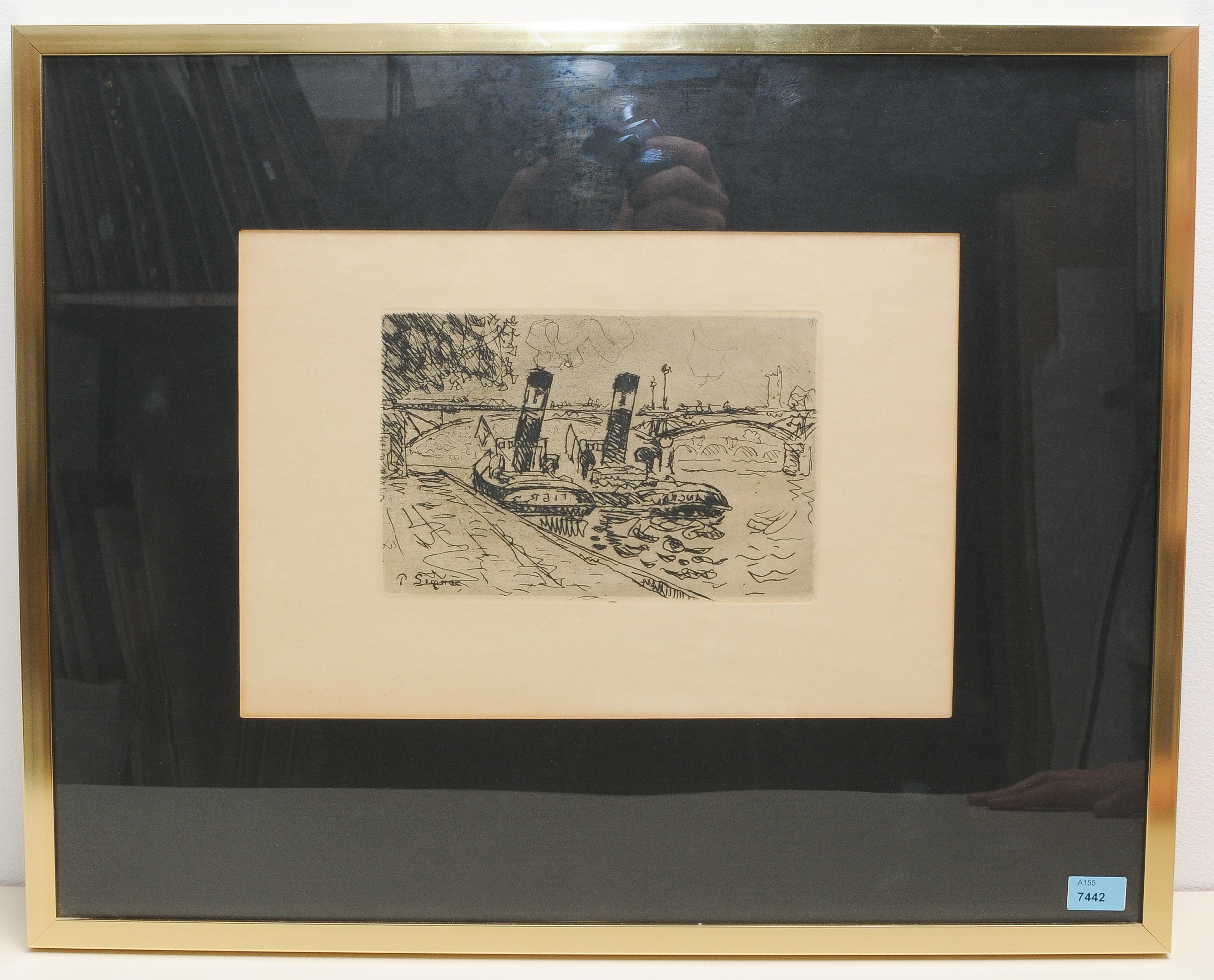 "Paris: Le Pont des Arts avec Remorqueurs". Ca. 1927. Radierung. Unten links im Druck signiert. Lichtmass 21x31 cm. Gerahmt.