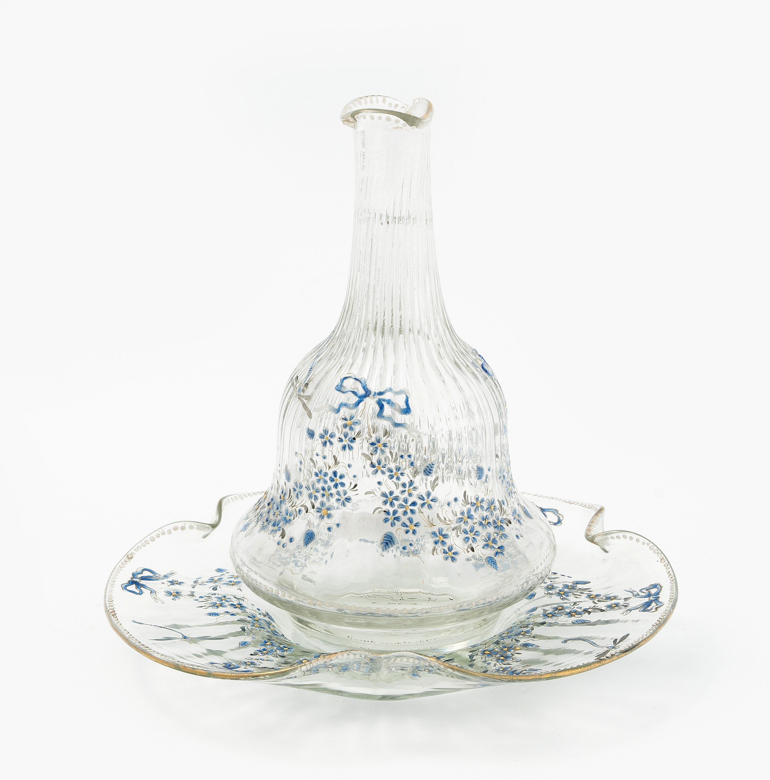 Kleine Karaffe mit Unterschale. Nancy/F, um 1880. Farbloses optisches Glas, Vergissmeinnicht-Dekor (Myosotis) in Emailmalerei. Bezeichnet: Cristallerie d'Emile Gallé Nancy, Modèle et décor déposés (in braunroter Schrift). H (Karaffe) 18 cm.