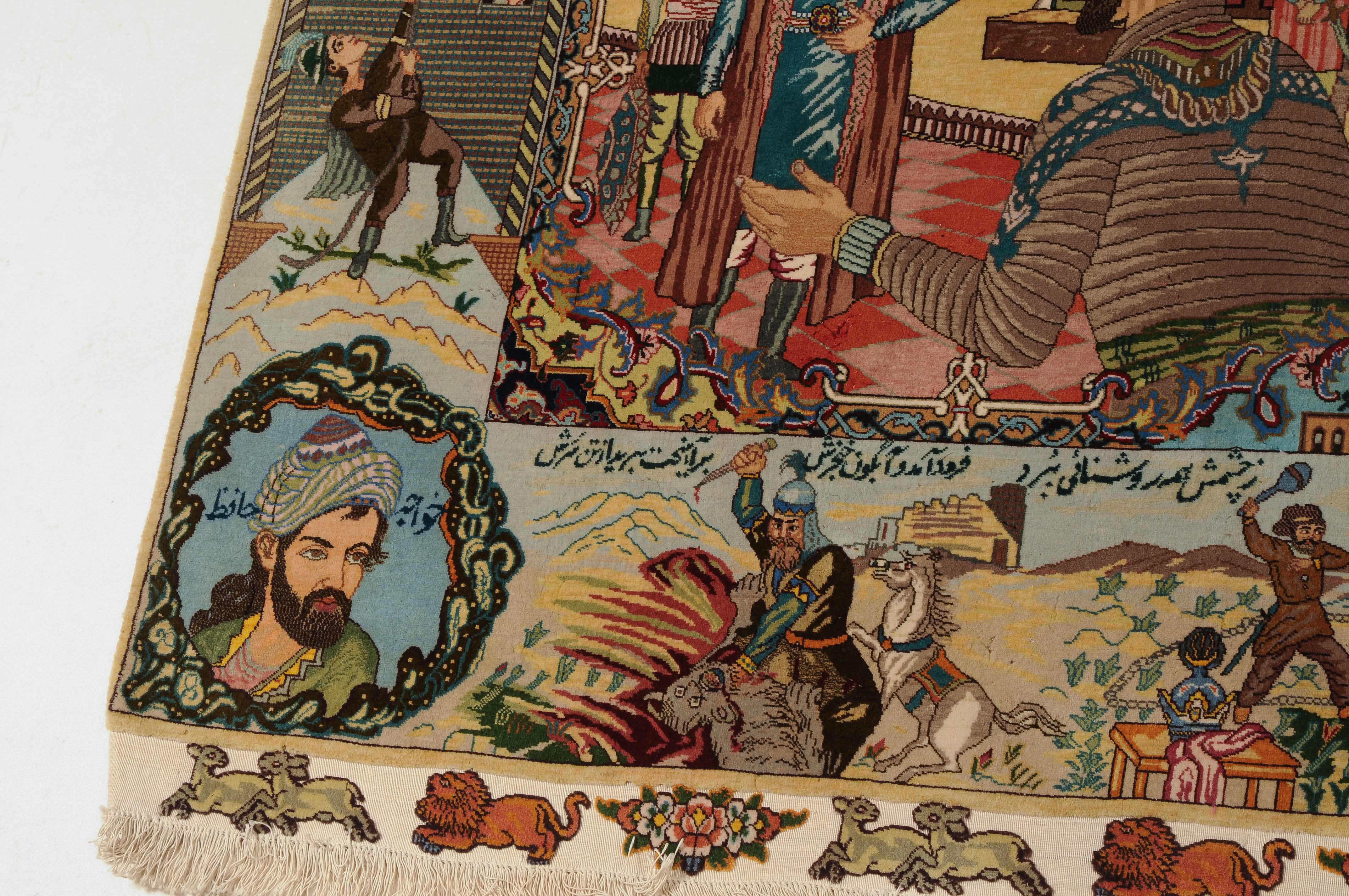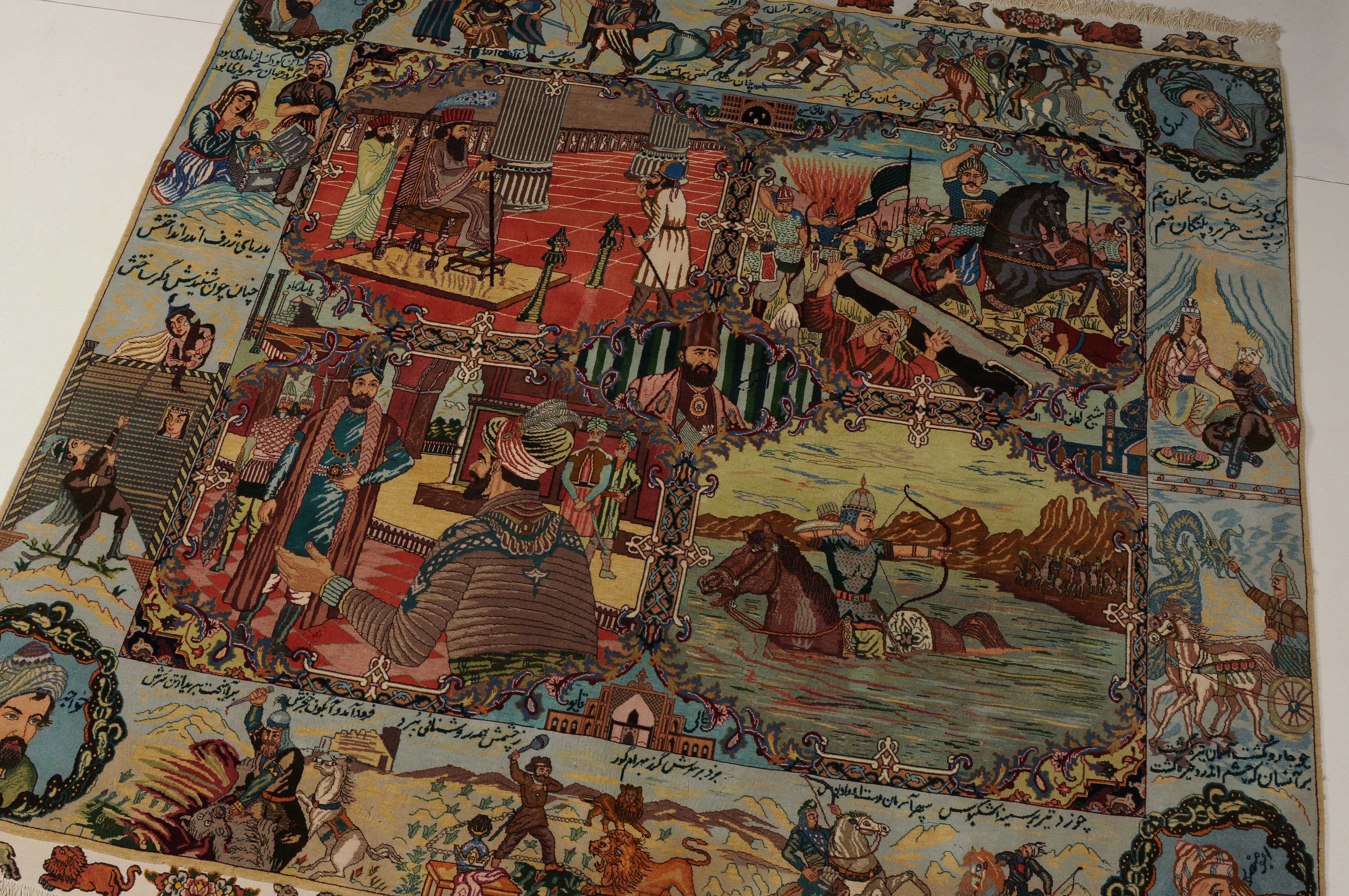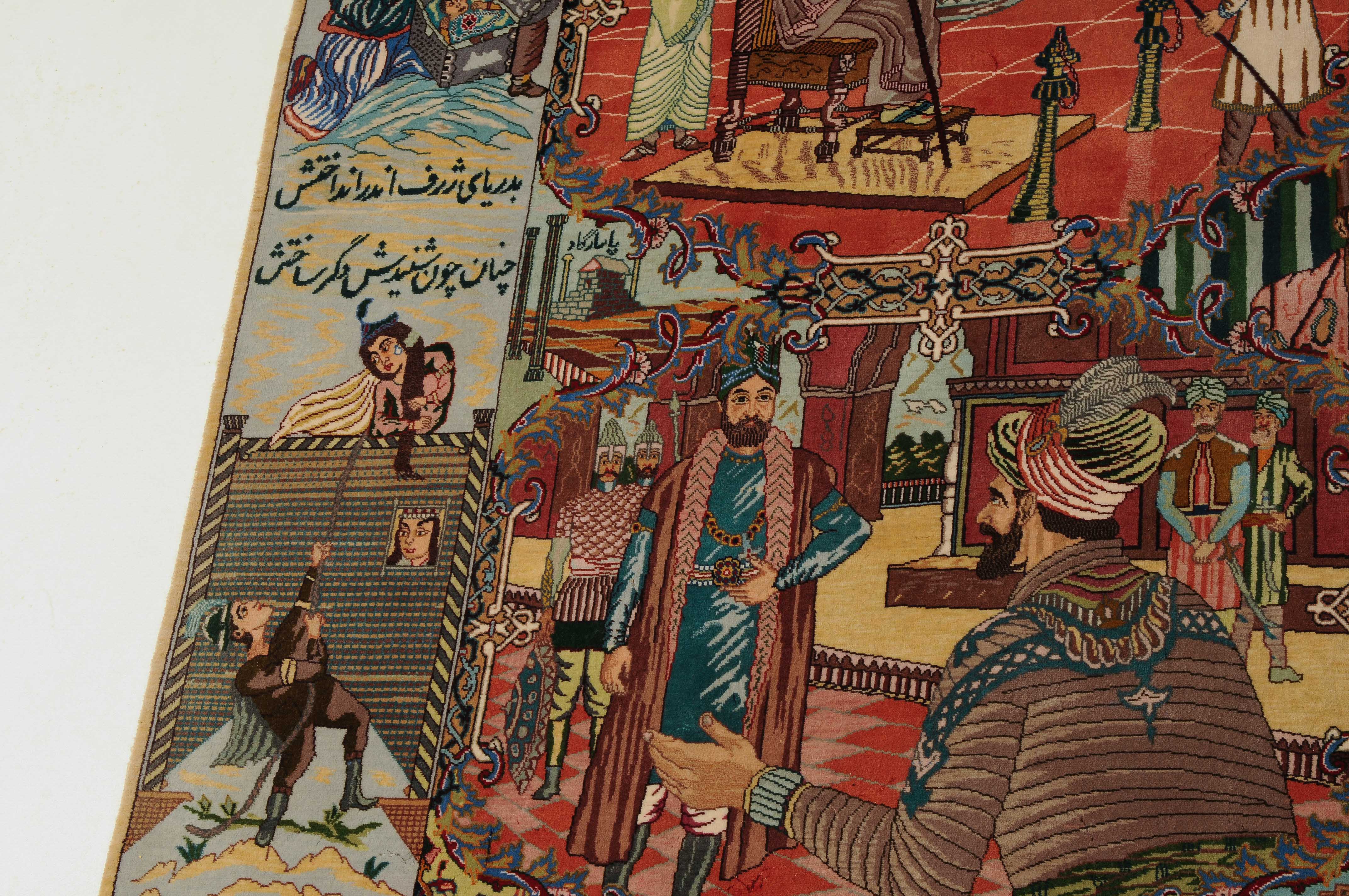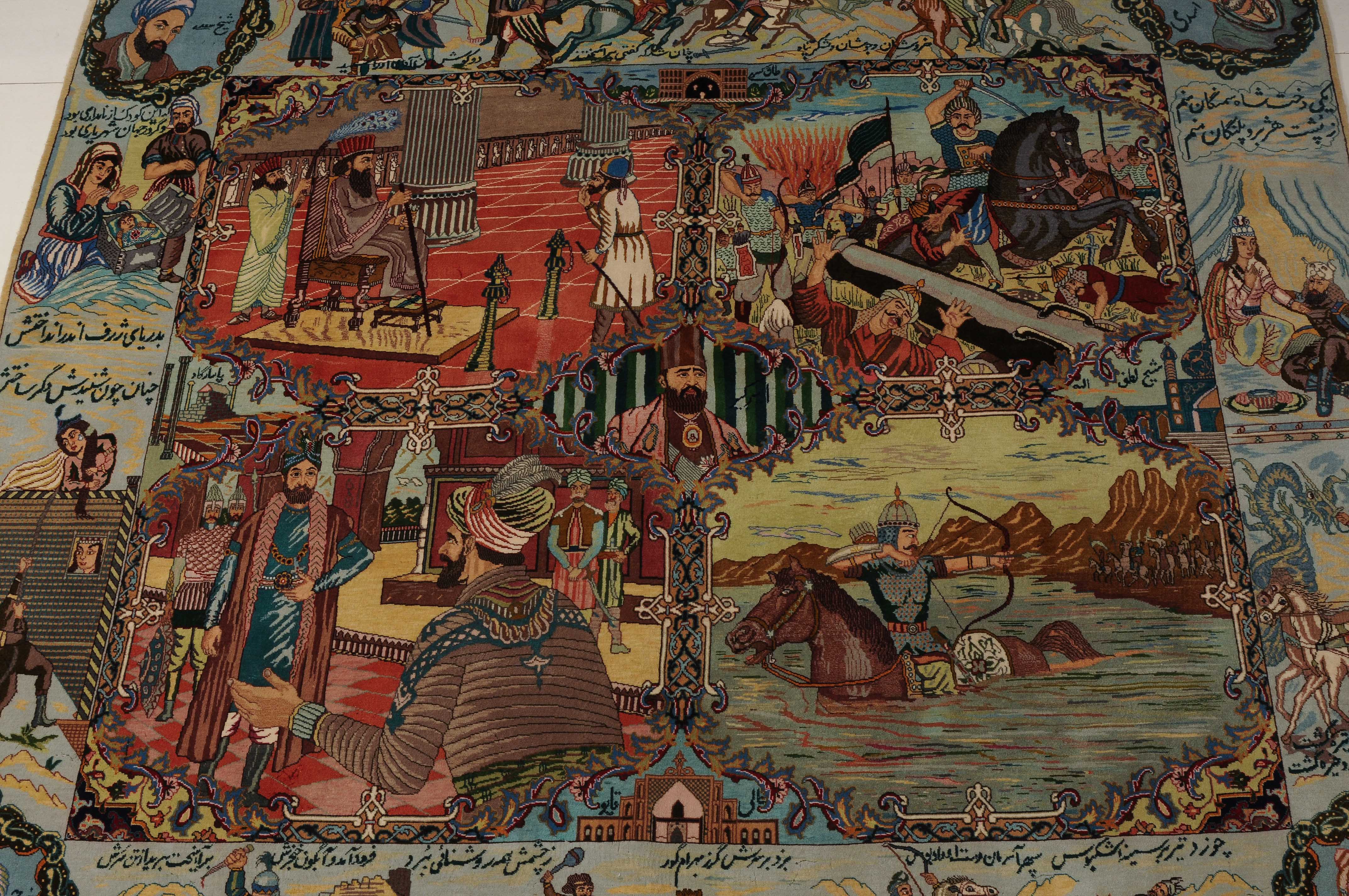 NW-Persien, um 1970. Sehr feine Knüpfung. Ein fein gezeichnetes Konturband teilt das Innenfeld in 4 Felder, die aus verschiedenen alten persischen Geschichten erzählen. Im Zentrum ist eine Bildkartusche des grossen Wesirs Amir Kabir dargestellt. Die breite Bordüre ist wiederum mit Geschichten verziert und die 4 Ecken sind mit Porträts von grossen persischen Dichtern belegt. Sehr gute Erhaltung. 180x195 cm (ft. 5.9x6.4).