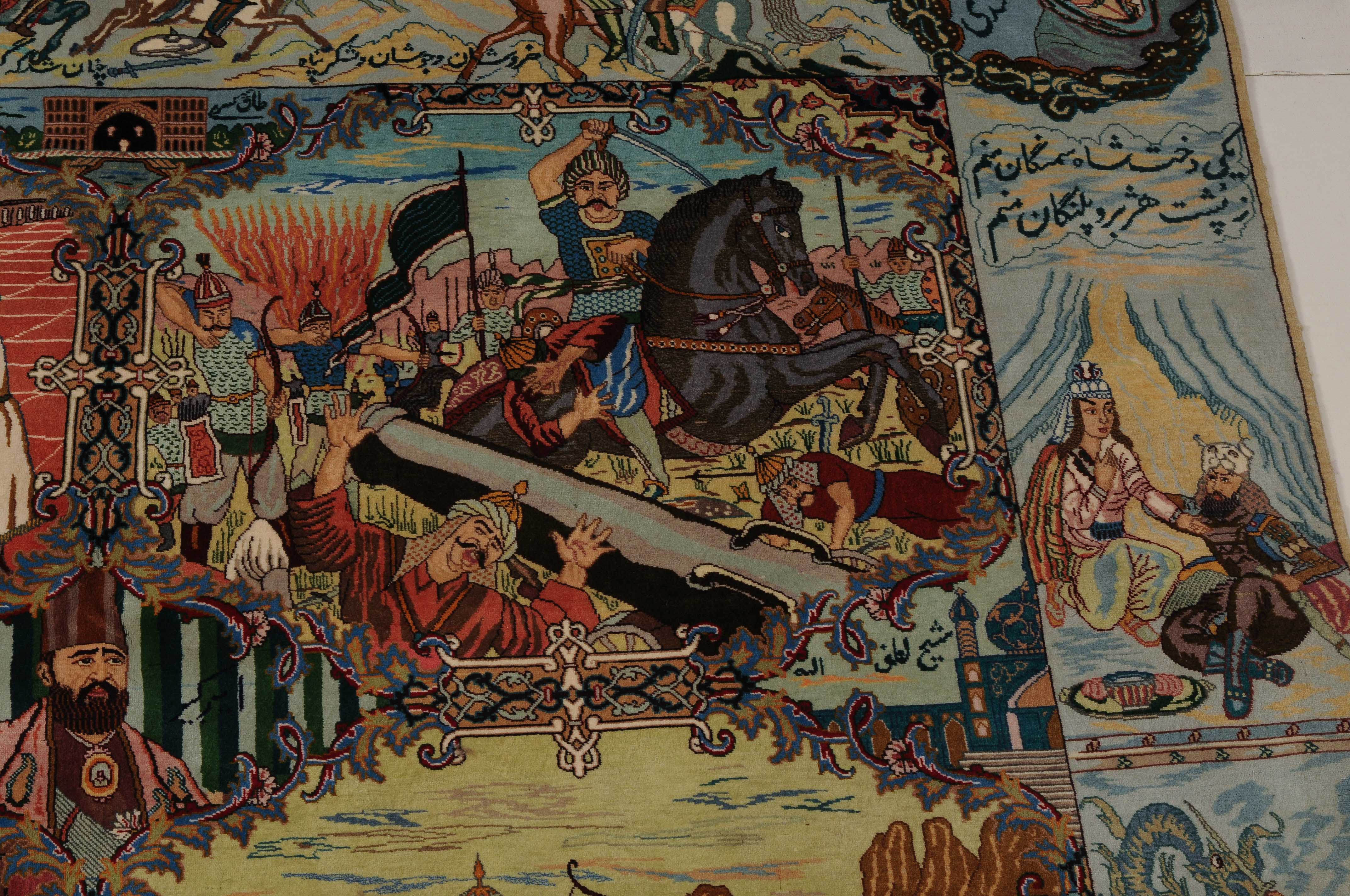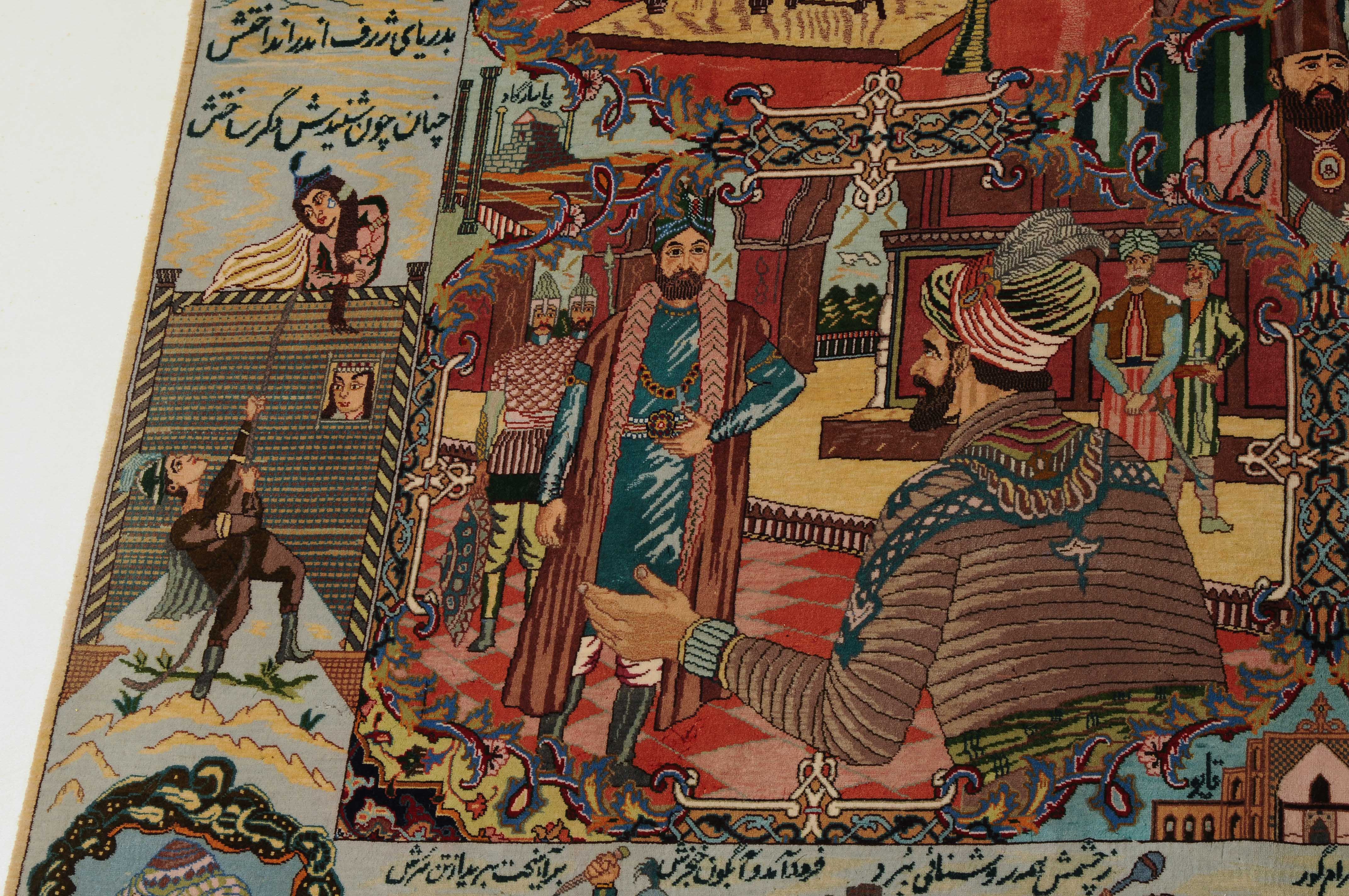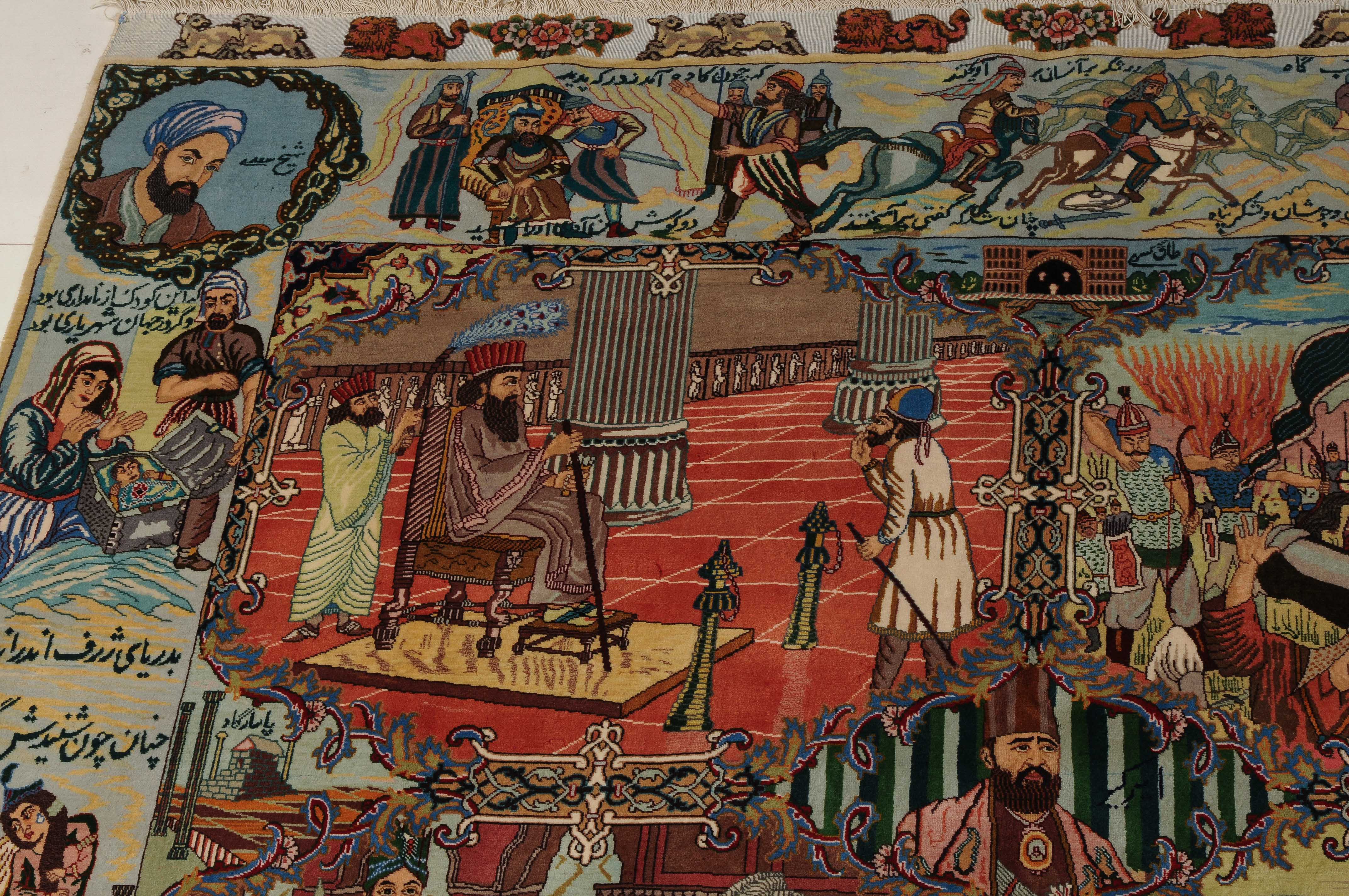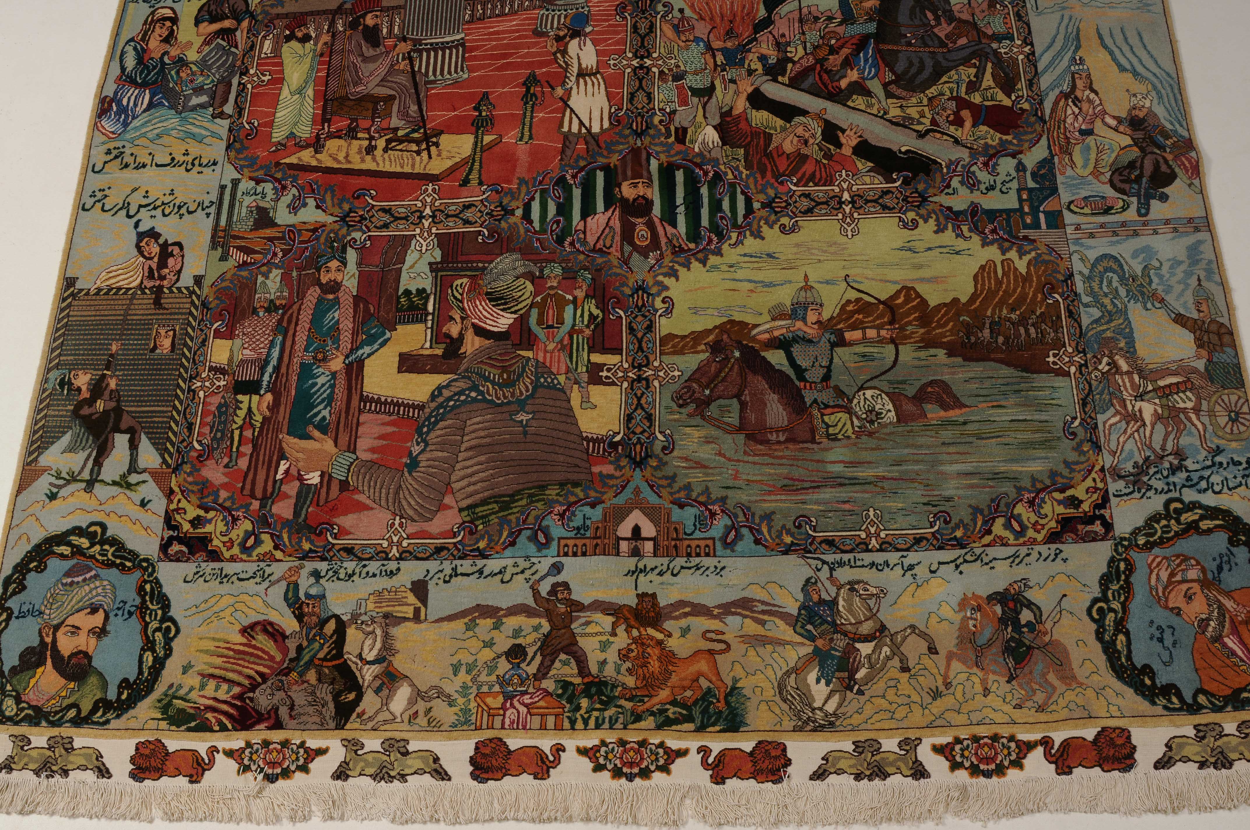 NW-Persien, um 1970. Sehr feine Knüpfung. Ein fein gezeichnetes Konturband teilt das Innenfeld in 4 Felder, die aus verschiedenen alten persischen Geschichten erzählen. Im Zentrum ist eine Bildkartusche des grossen Wesirs Amir Kabir dargestellt. Die breite Bordüre ist wiederum mit Geschichten verziert und die 4 Ecken sind mit Porträts von grossen persischen Dichtern belegt. Sehr gute Erhaltung. 180x195 cm (ft. 5.9x6.4).
