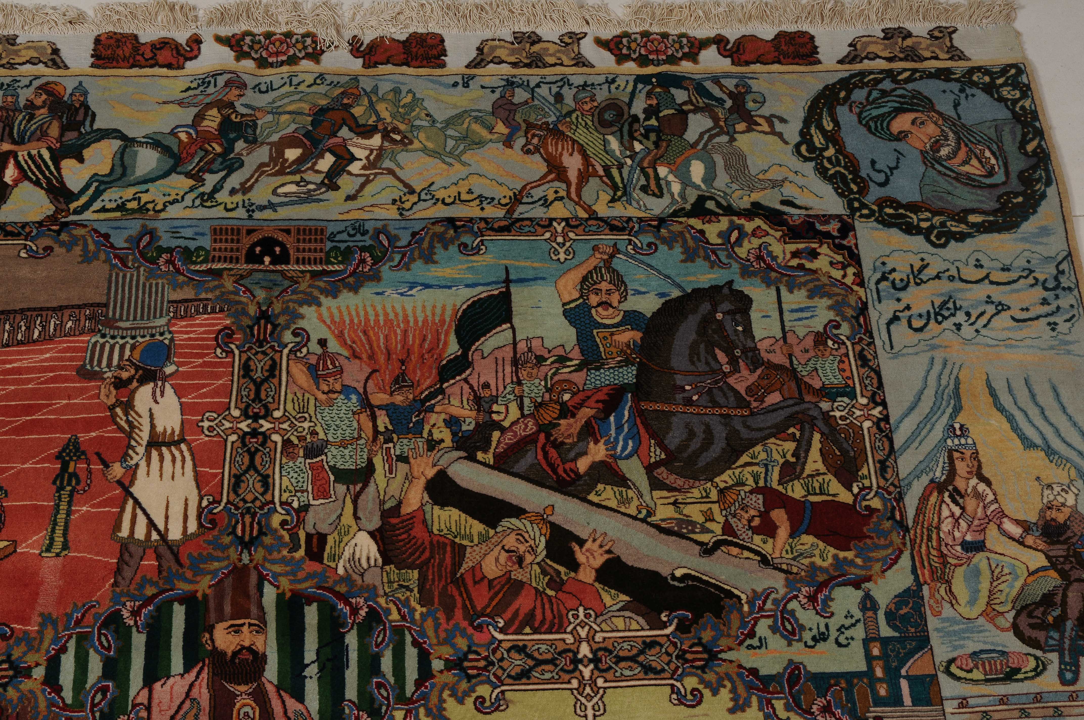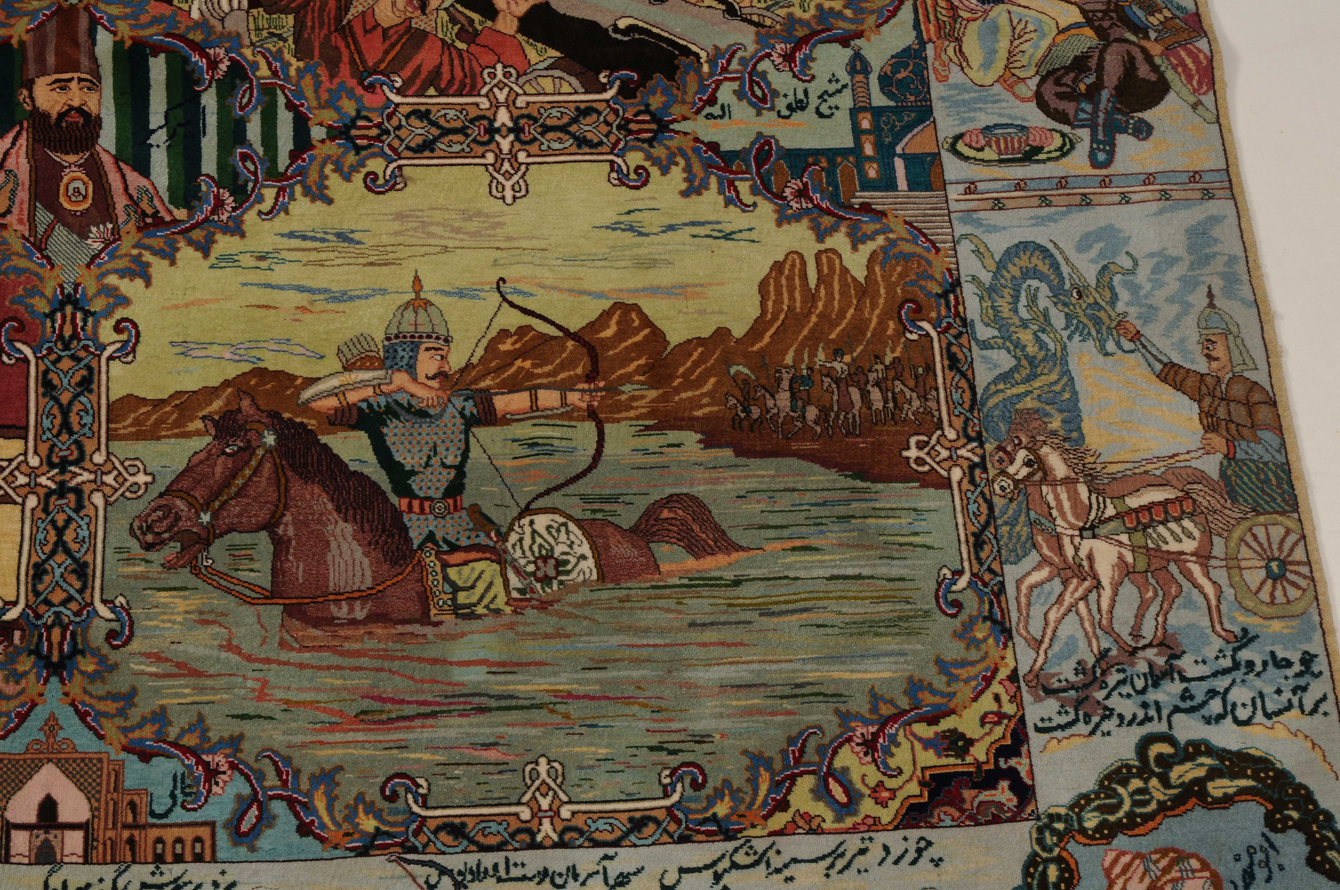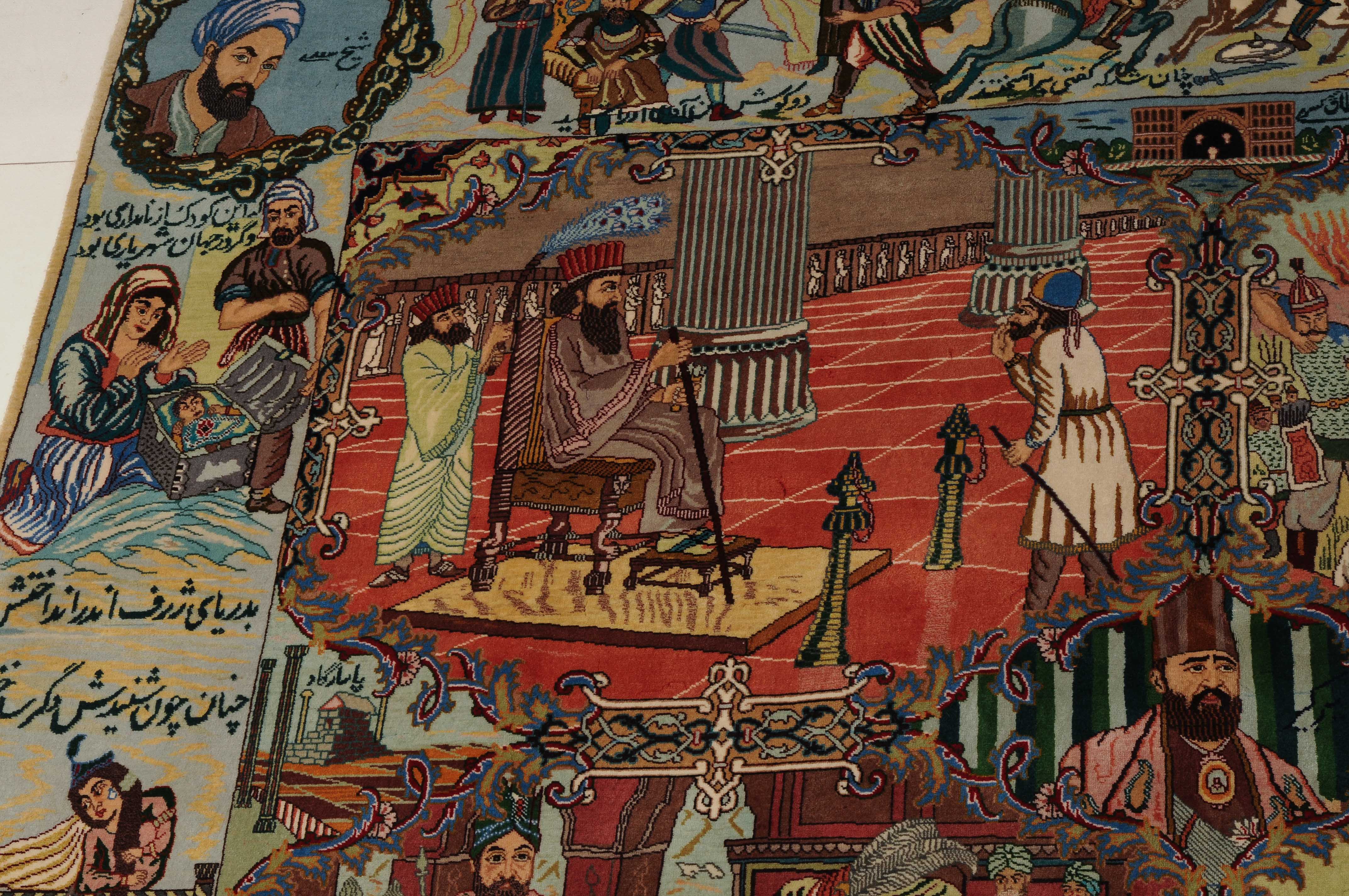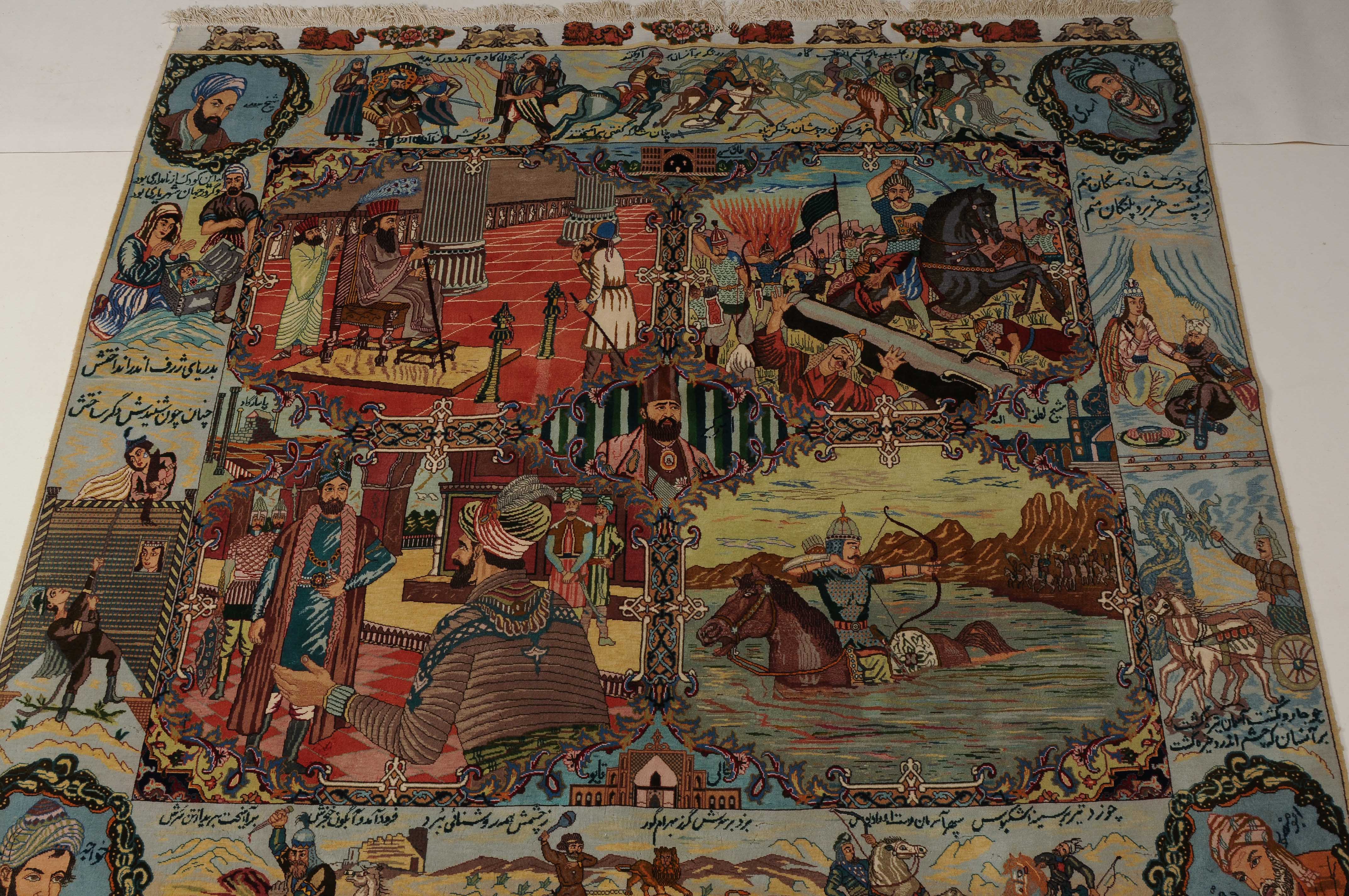 NW-Persien, um 1970. Sehr feine Knüpfung. Ein fein gezeichnetes Konturband teilt das Innenfeld in 4 Felder, die aus verschiedenen alten persischen Geschichten erzählen. Im Zentrum ist eine Bildkartusche des grossen Wesirs Amir Kabir dargestellt. Die breite Bordüre ist wiederum mit Geschichten verziert und die 4 Ecken sind mit Porträts von grossen persischen Dichtern belegt. Sehr gute Erhaltung. 180x195 cm (ft. 5.9x6.4).