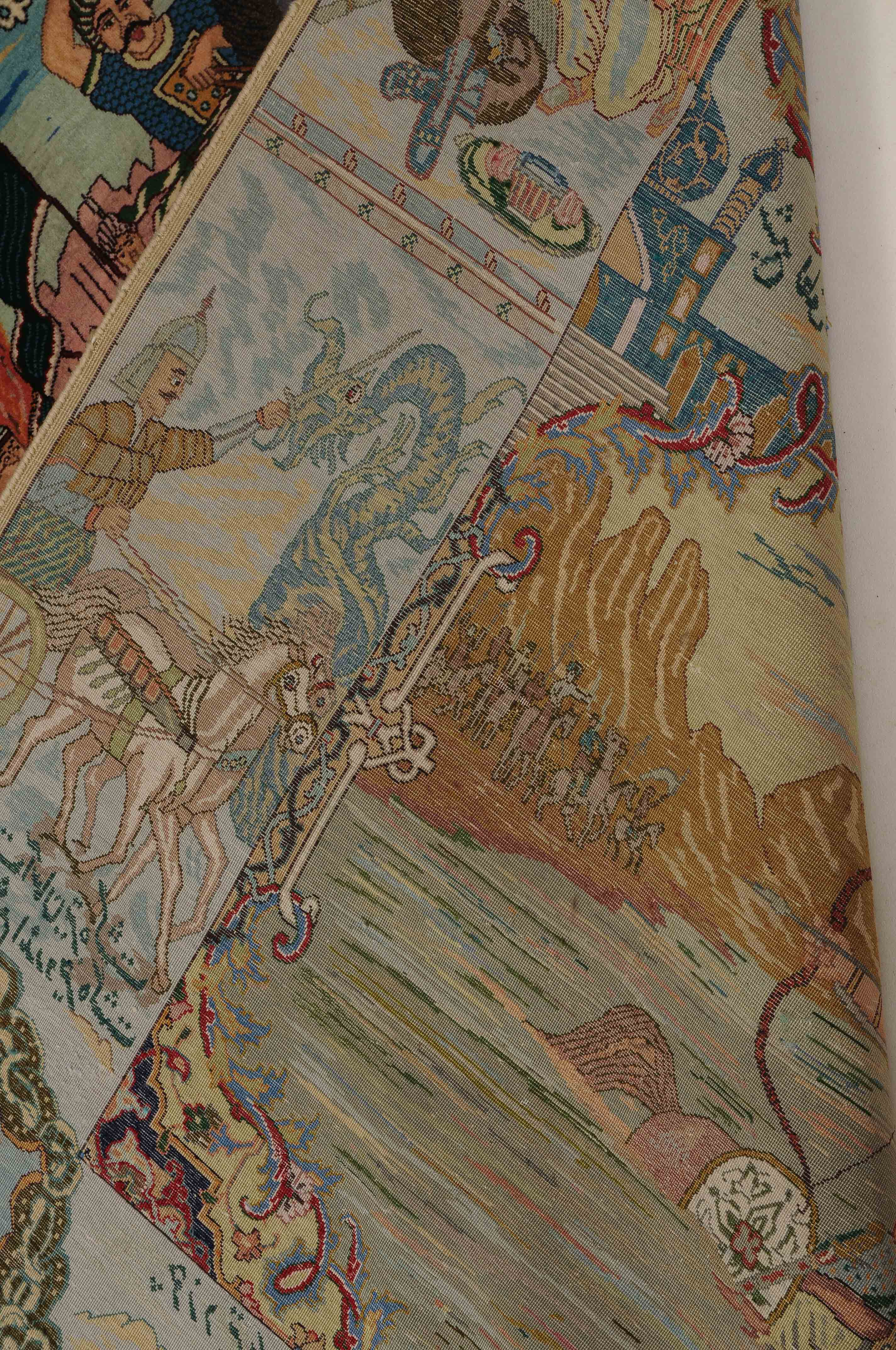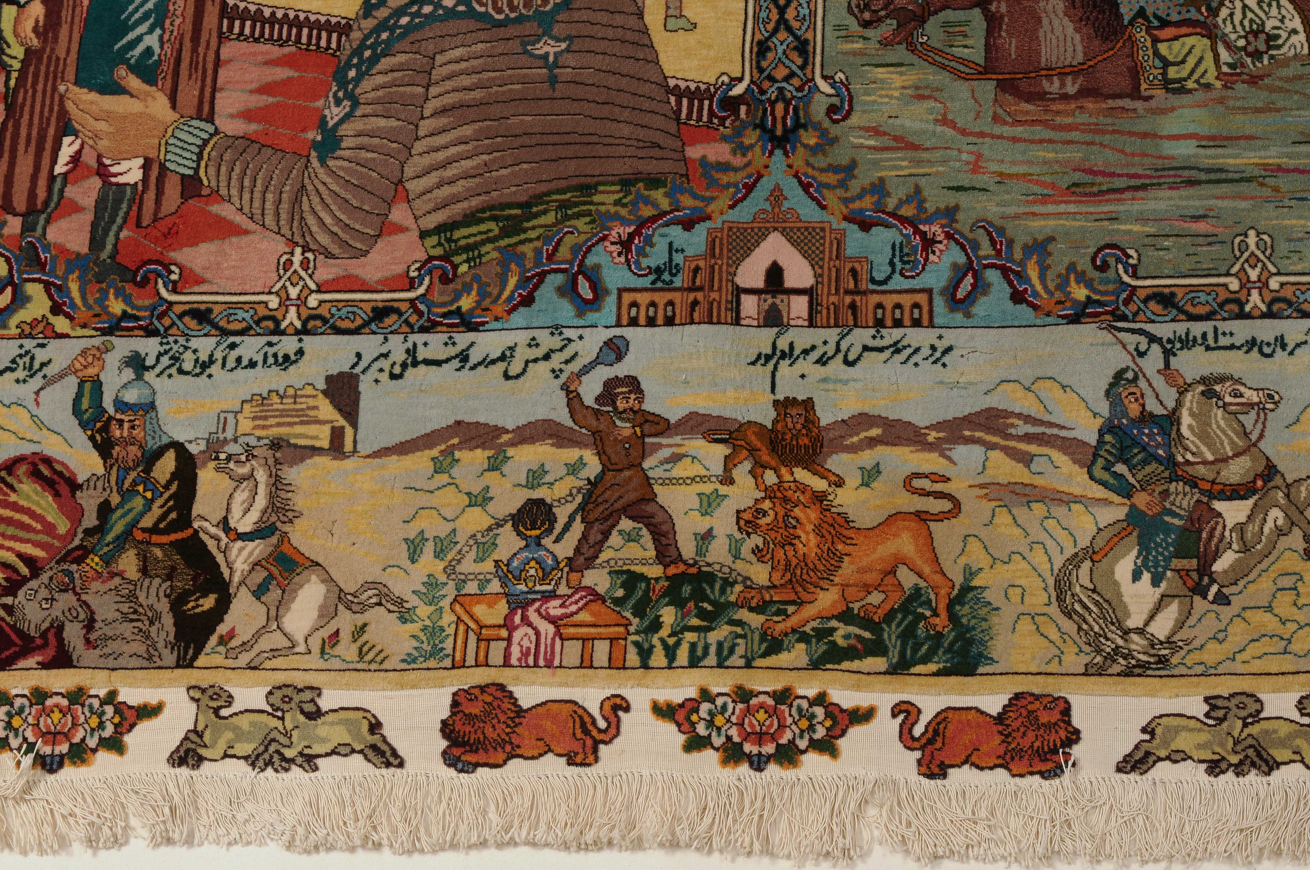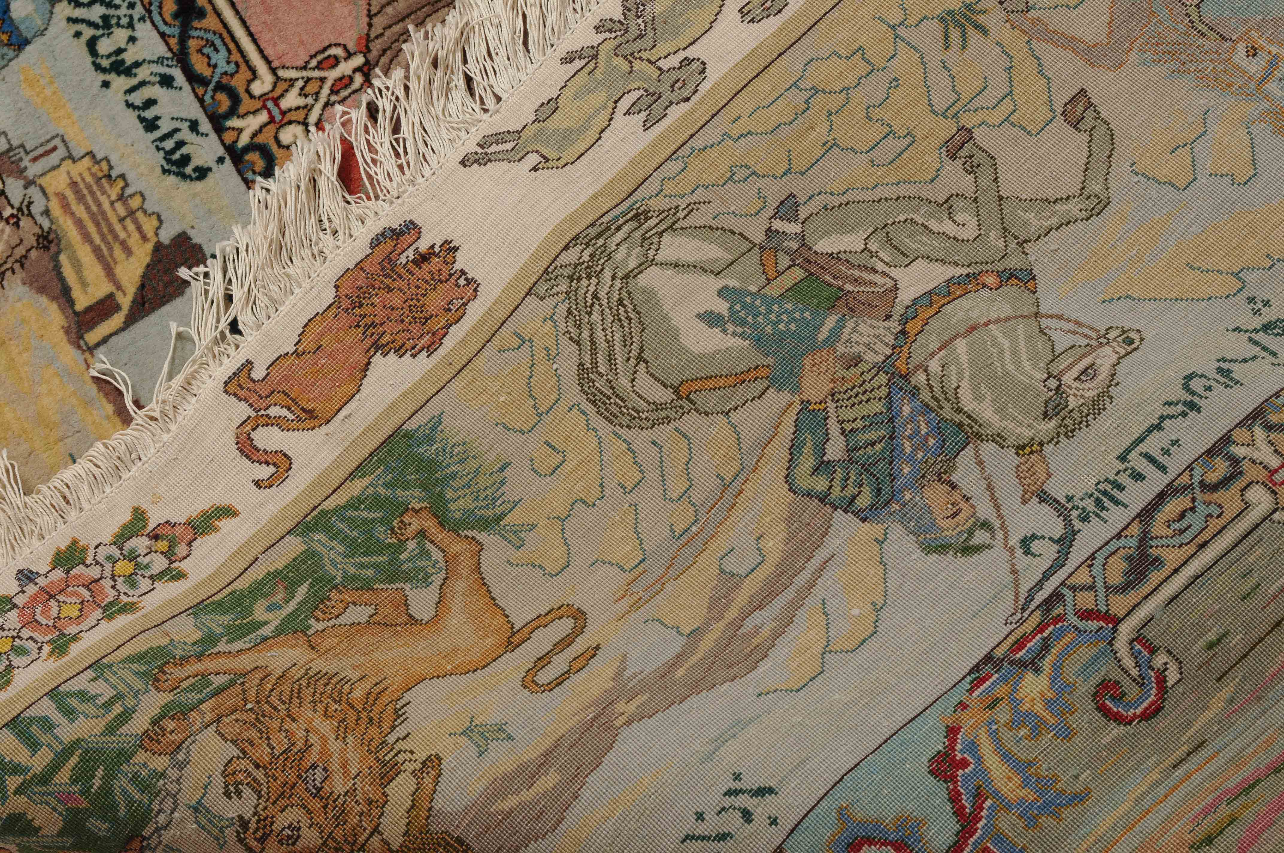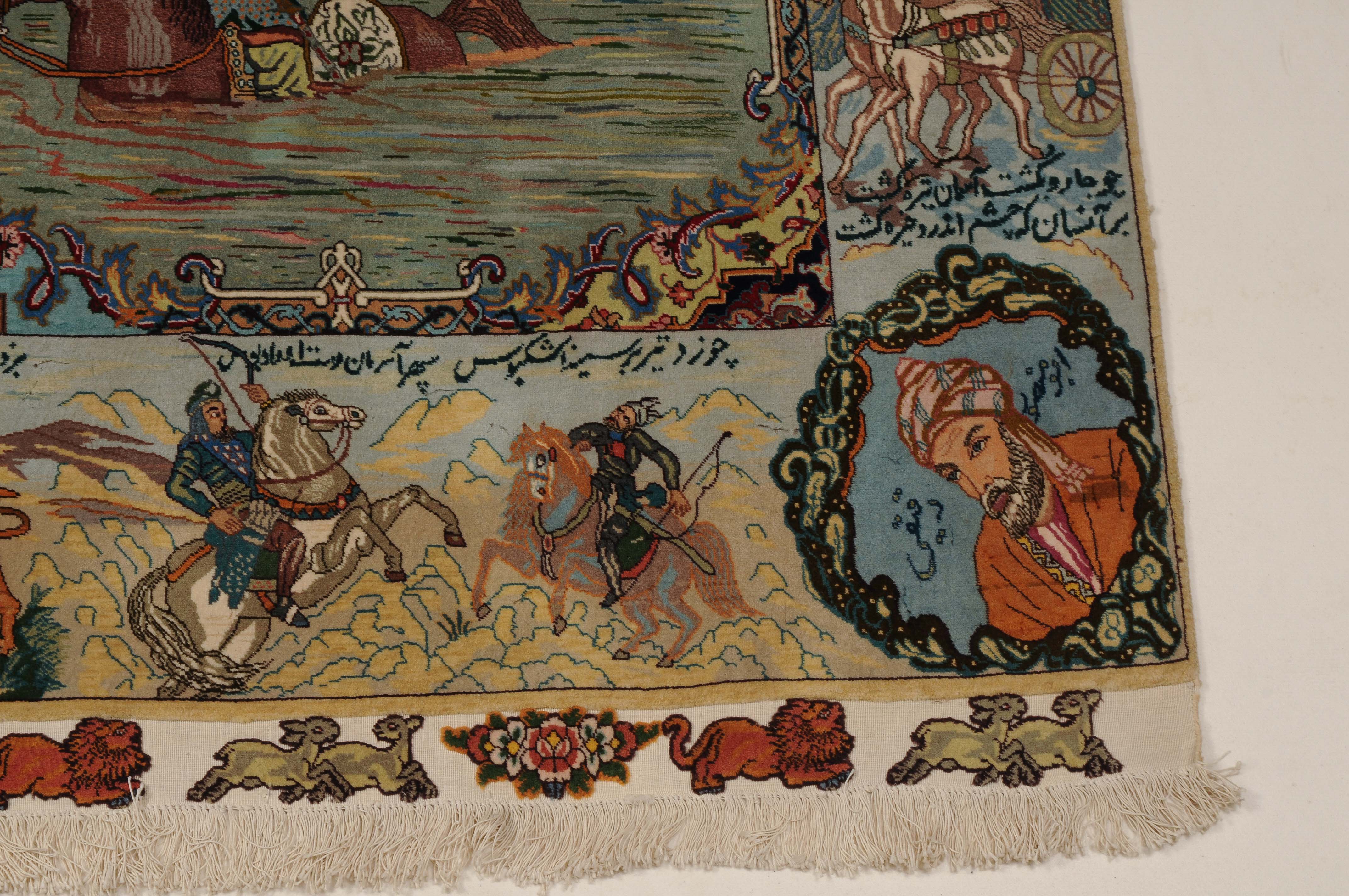 NW-Persien, um 1970. Sehr feine Knüpfung. Ein fein gezeichnetes Konturband teilt das Innenfeld in 4 Felder, die aus verschiedenen alten persischen Geschichten erzählen. Im Zentrum ist eine Bildkartusche des grossen Wesirs Amir Kabir dargestellt. Die breite Bordüre ist wiederum mit Geschichten verziert und die 4 Ecken sind mit Porträts von grossen persischen Dichtern belegt. Sehr gute Erhaltung. 180x195 cm (ft. 5.9x6.4).