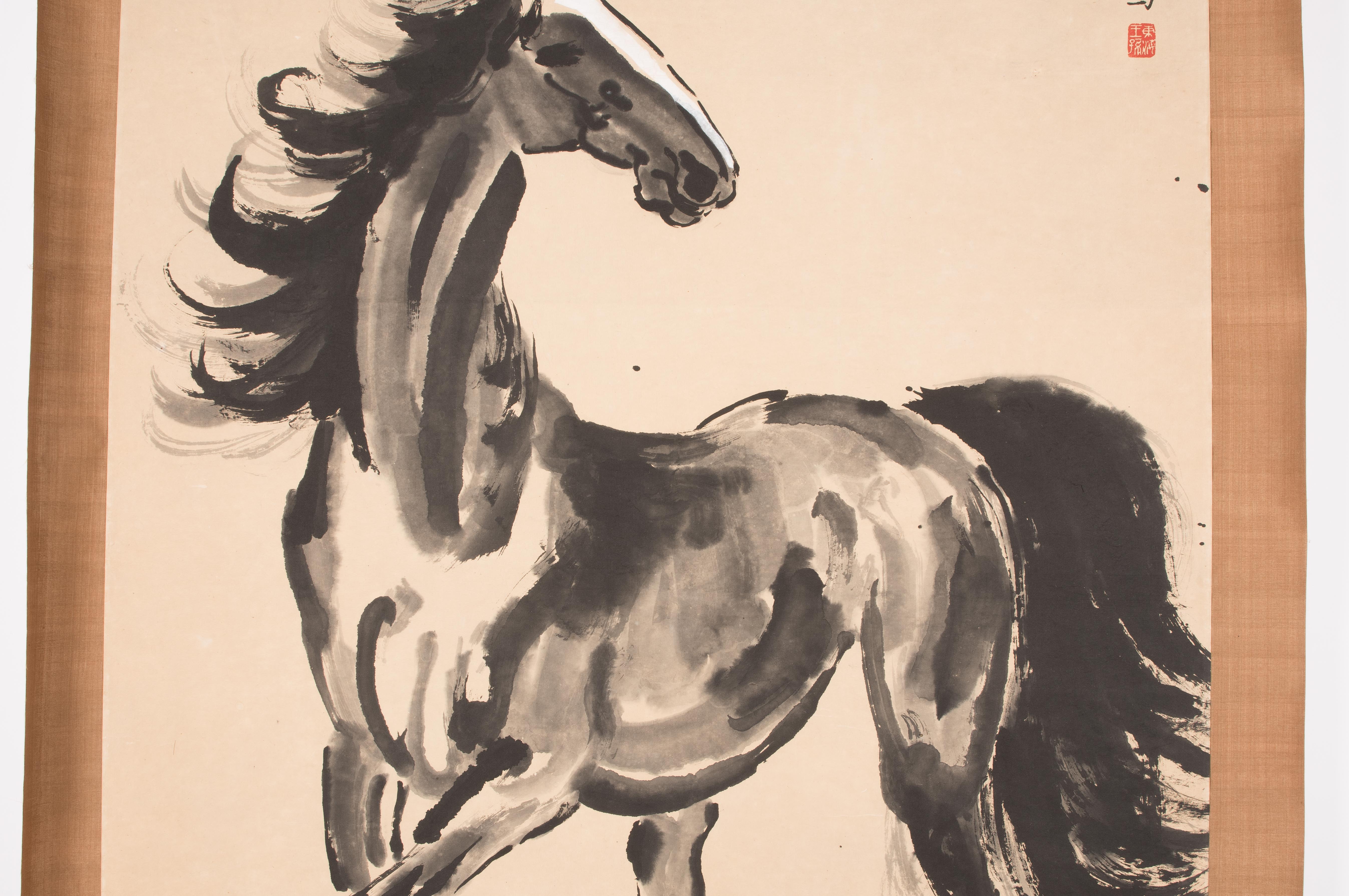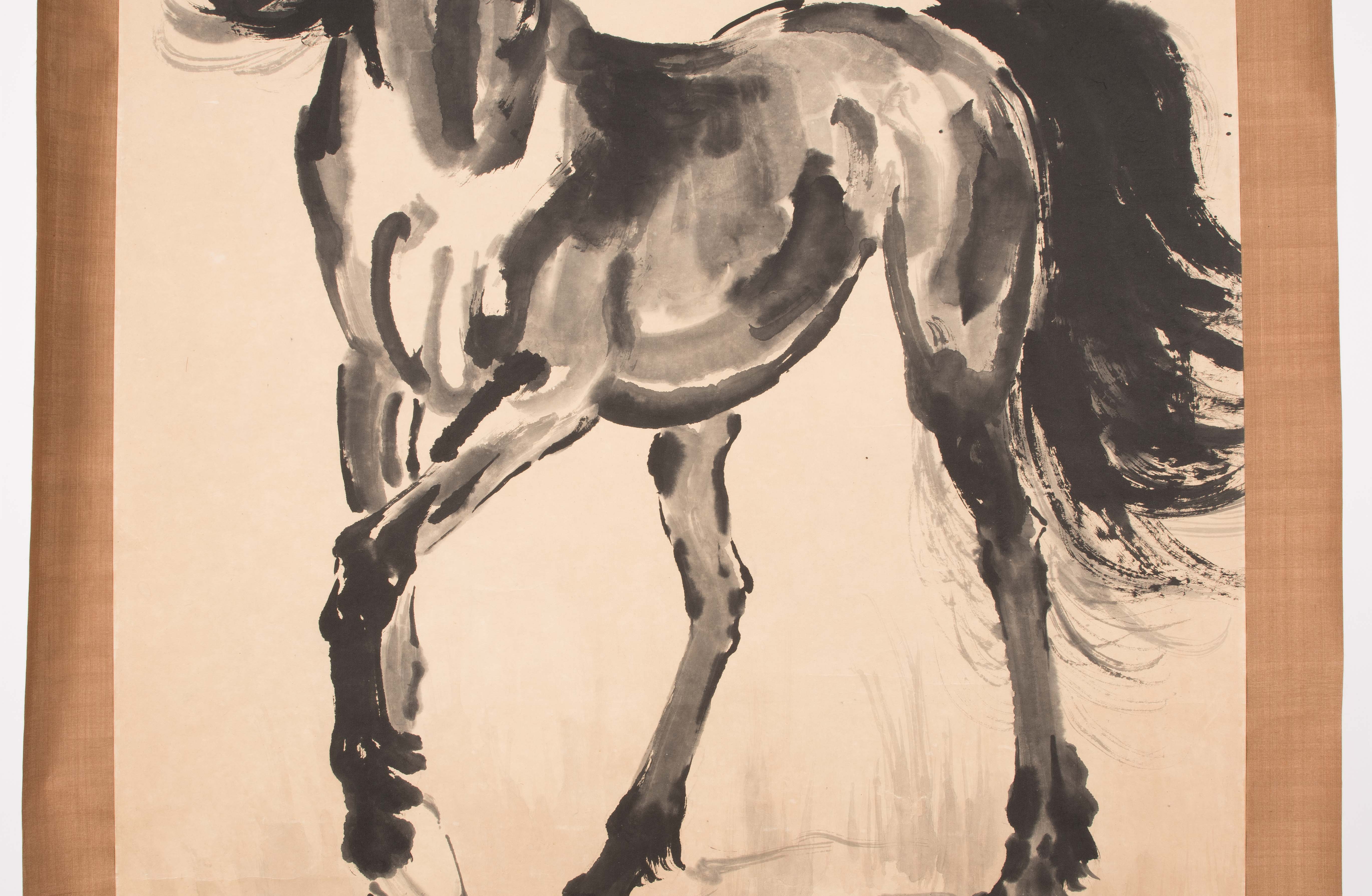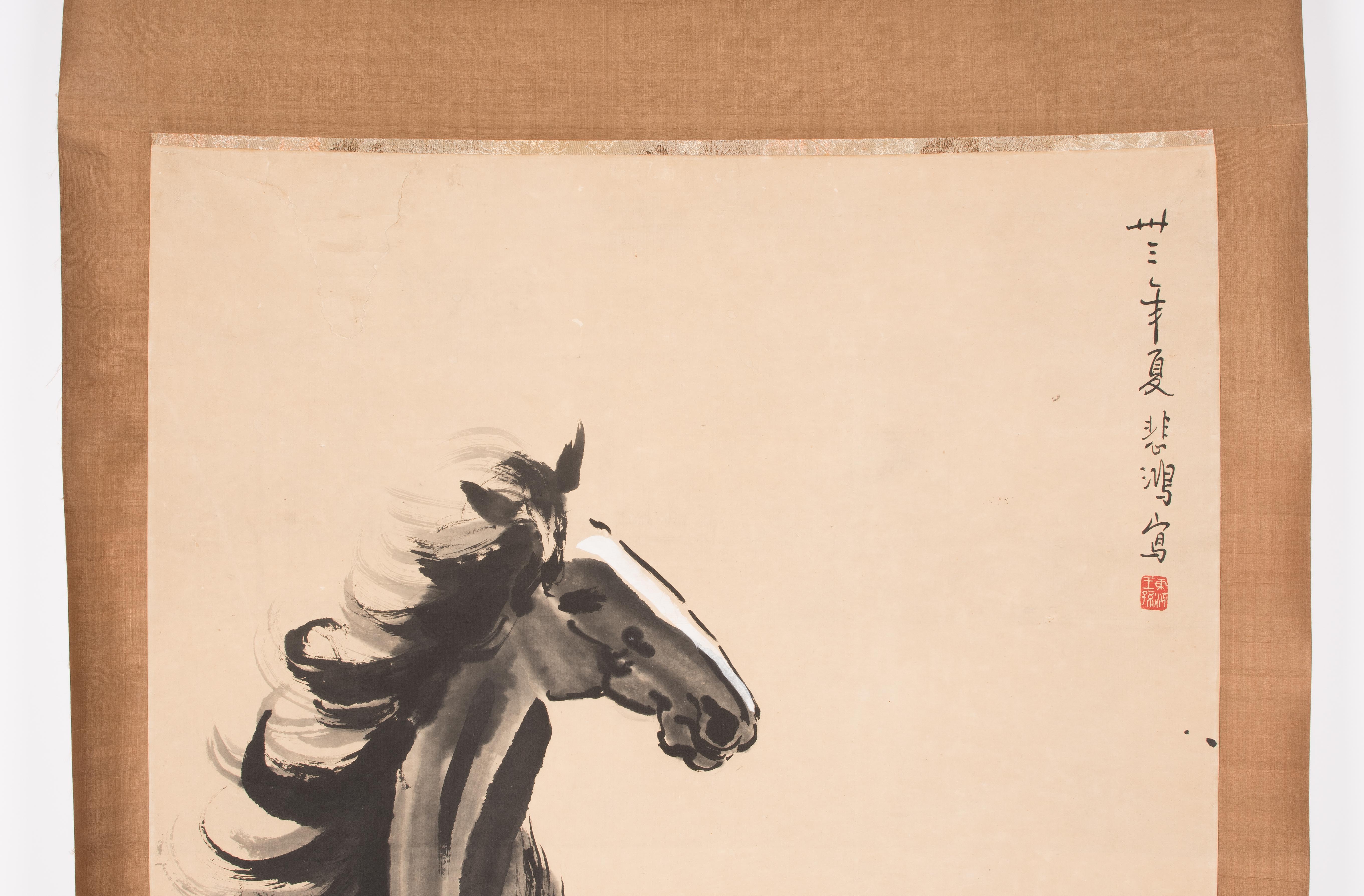 Tusche und Farbe auf Papier. Datiert Sommer, im Jahre 33 (der Republik,1944). Signiert: Beihong. Künstlersiegel: Donghai Wang Sun. Pferd mit erhobenem Vorderlauf. 118x65,2. Als Rollbild aufgezogen: 181x76 cm.