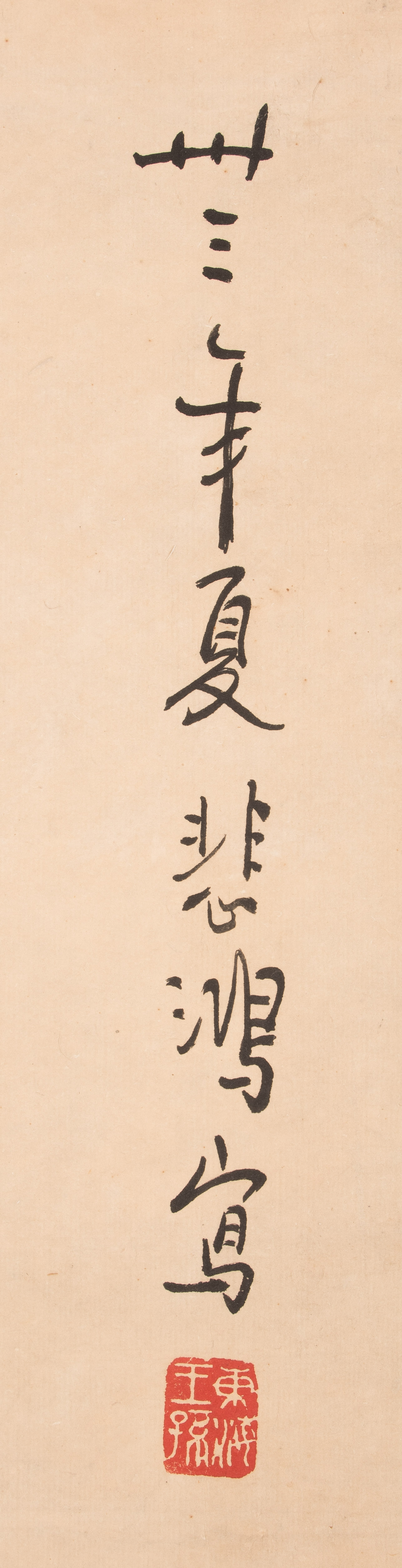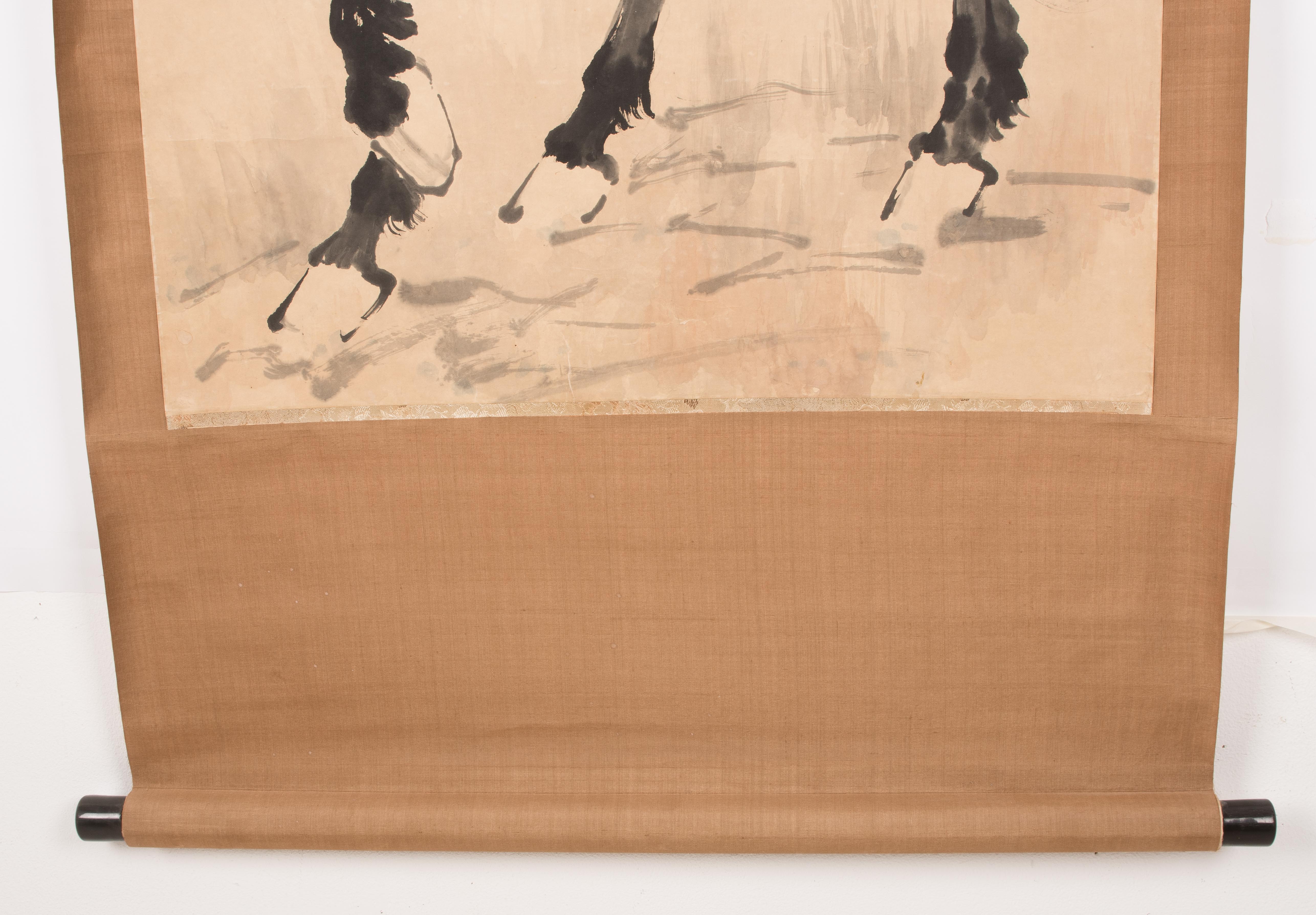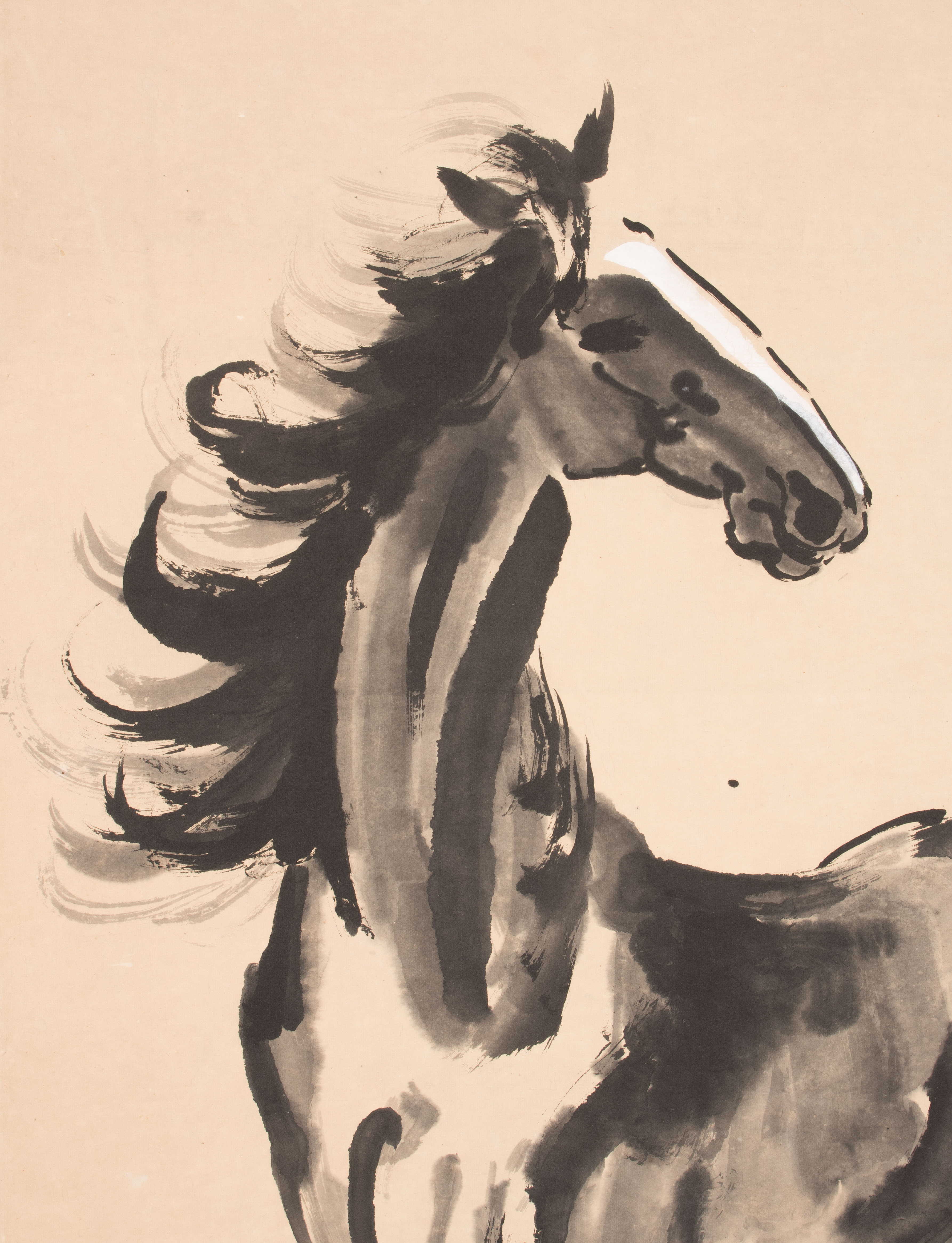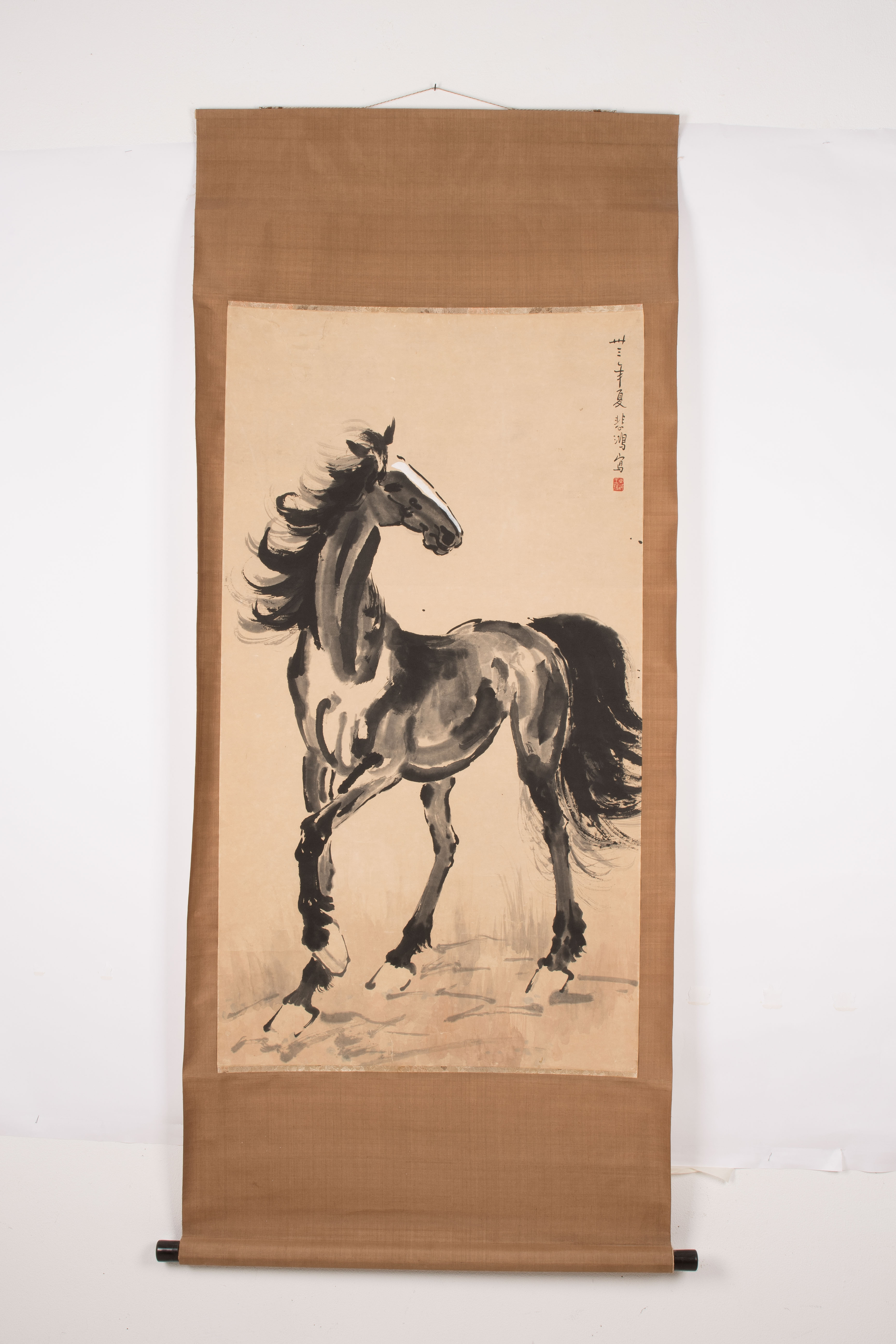 Tusche und Farbe auf Papier. Datiert Sommer, im Jahre 33 (der Republik,1944). Signiert: Beihong. Künstlersiegel: Donghai Wang Sun. Pferd mit erhobenem Vorderlauf. 118x65,2. Als Rollbild aufgezogen: 181x76 cm.