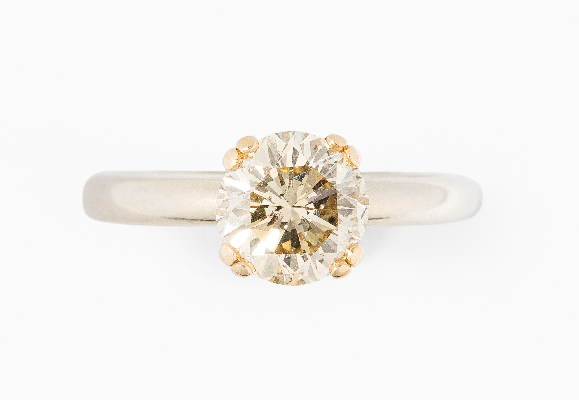 750 Gelb- und Weissgold. Solitaire-Modell mit 1 Brillanten ca. 1.50 ct getönt gelb/P1/2. Gr. 53, 4,6 g.