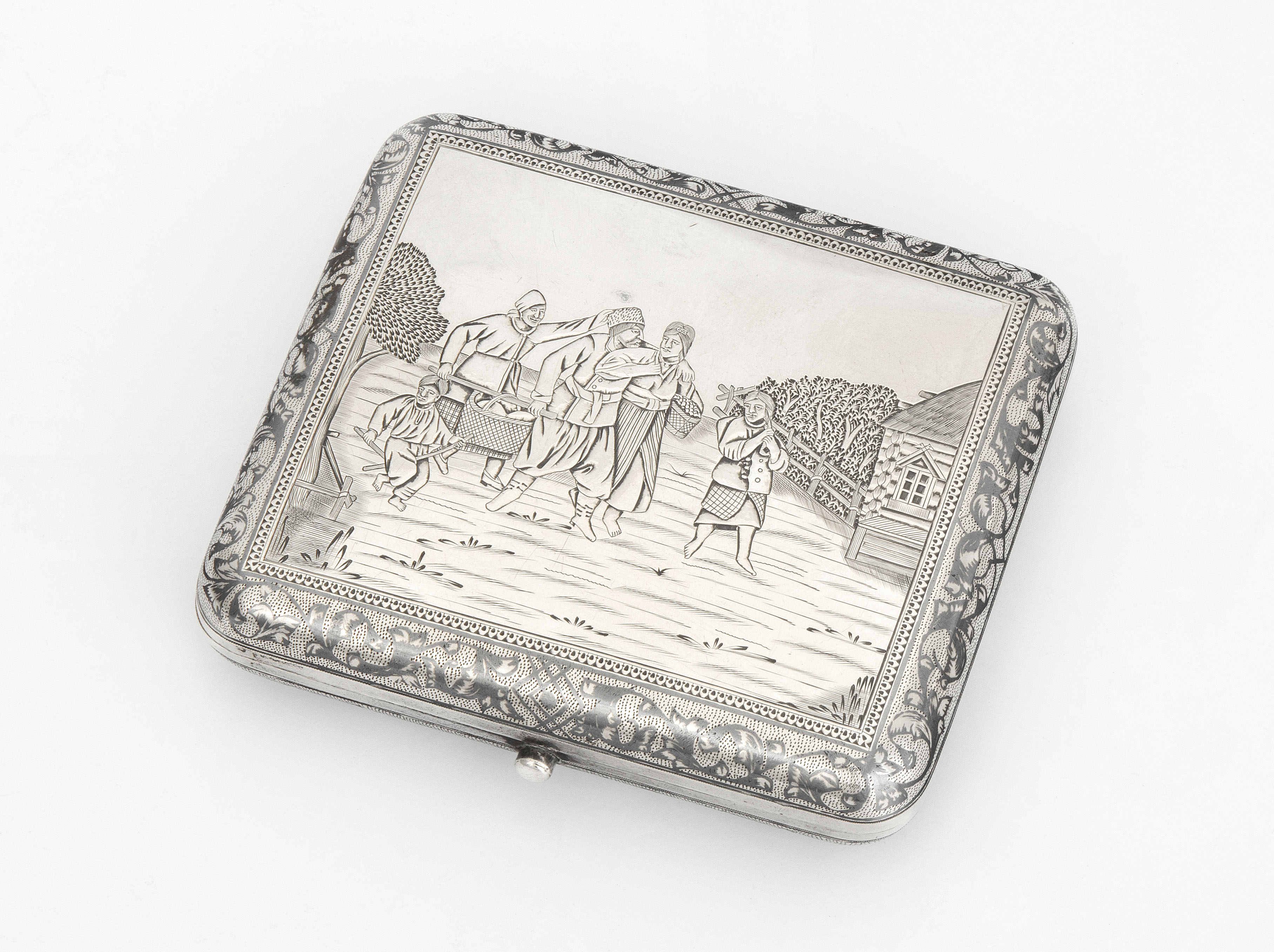 1891. Silber, innen vergoldet. Meistermarke FI (kyrillisch). Gerundete Rechteckform mit scharniertem Deckel. Schauseite mit graviertem Dekor: Bauern bei der Feldarbeit darstellend, Umrandung und Boden mit ornamentalem Niellodekor. Moskauer Beschau-, Meistermarke. 9x8 cm, ca. 163 g.