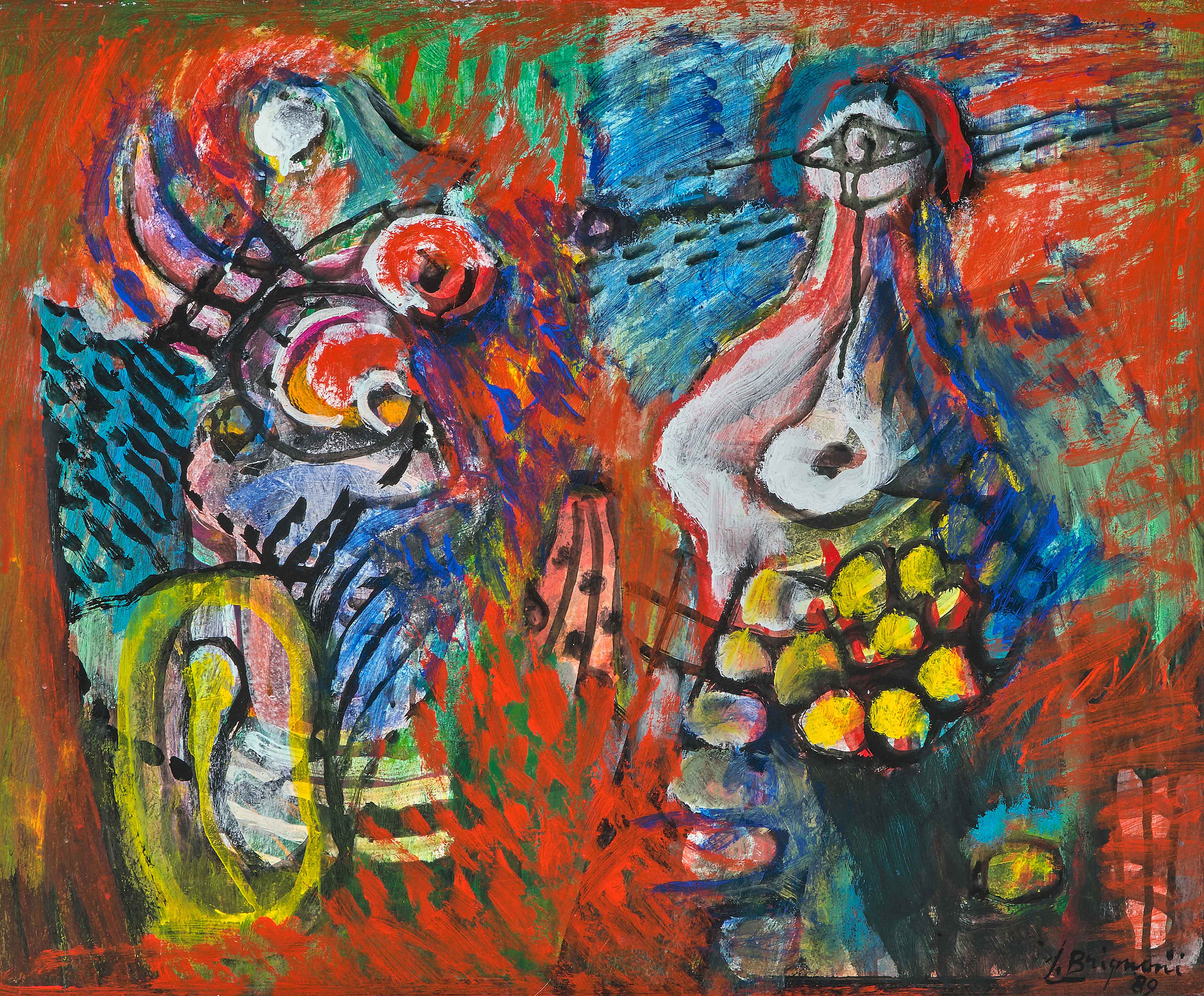 "Femme oiseaux", 1989. Öl und Tempera auf Hartfaserplatte. Unten rechts signiert und datiert. 48x59 cm.