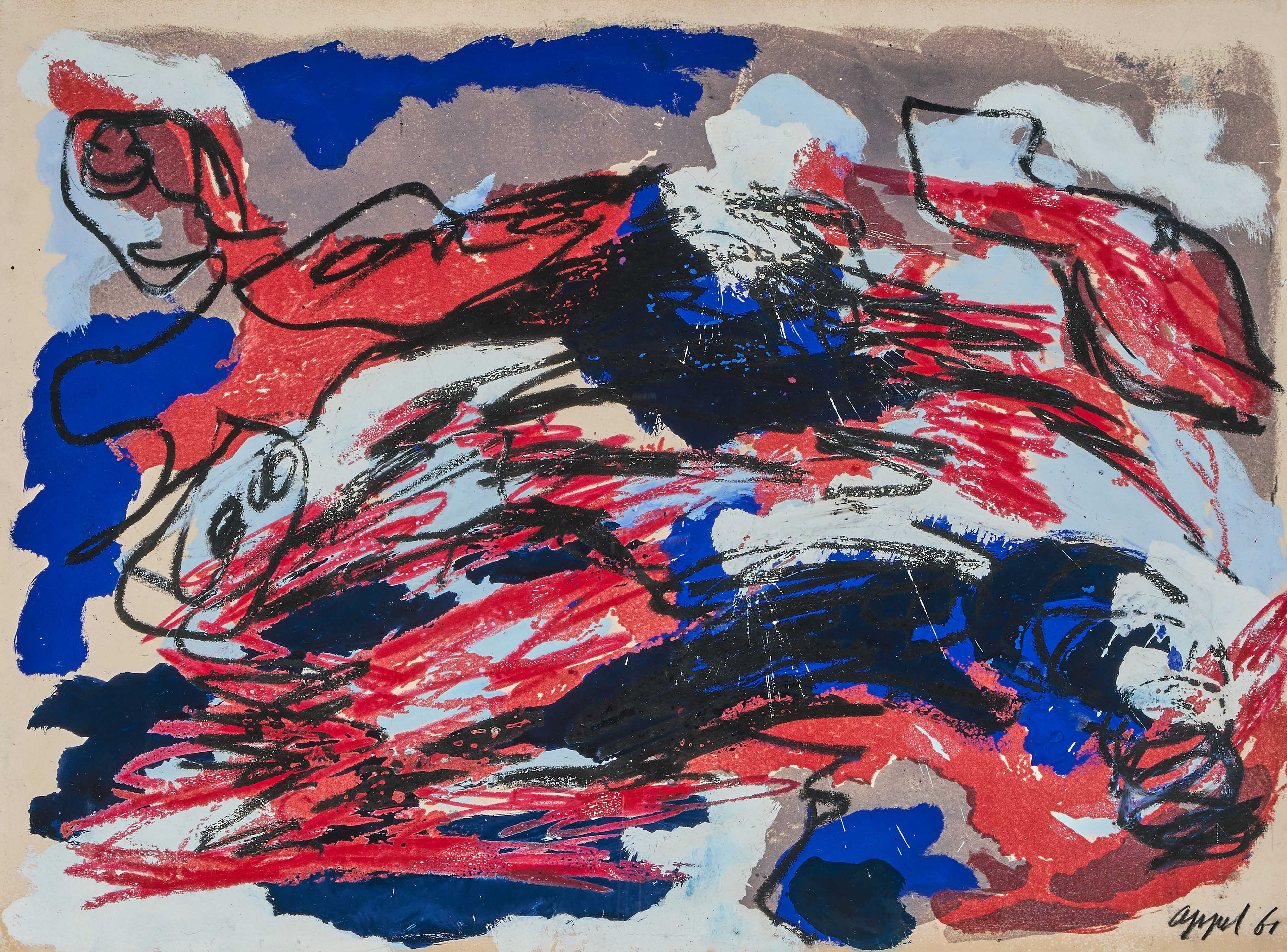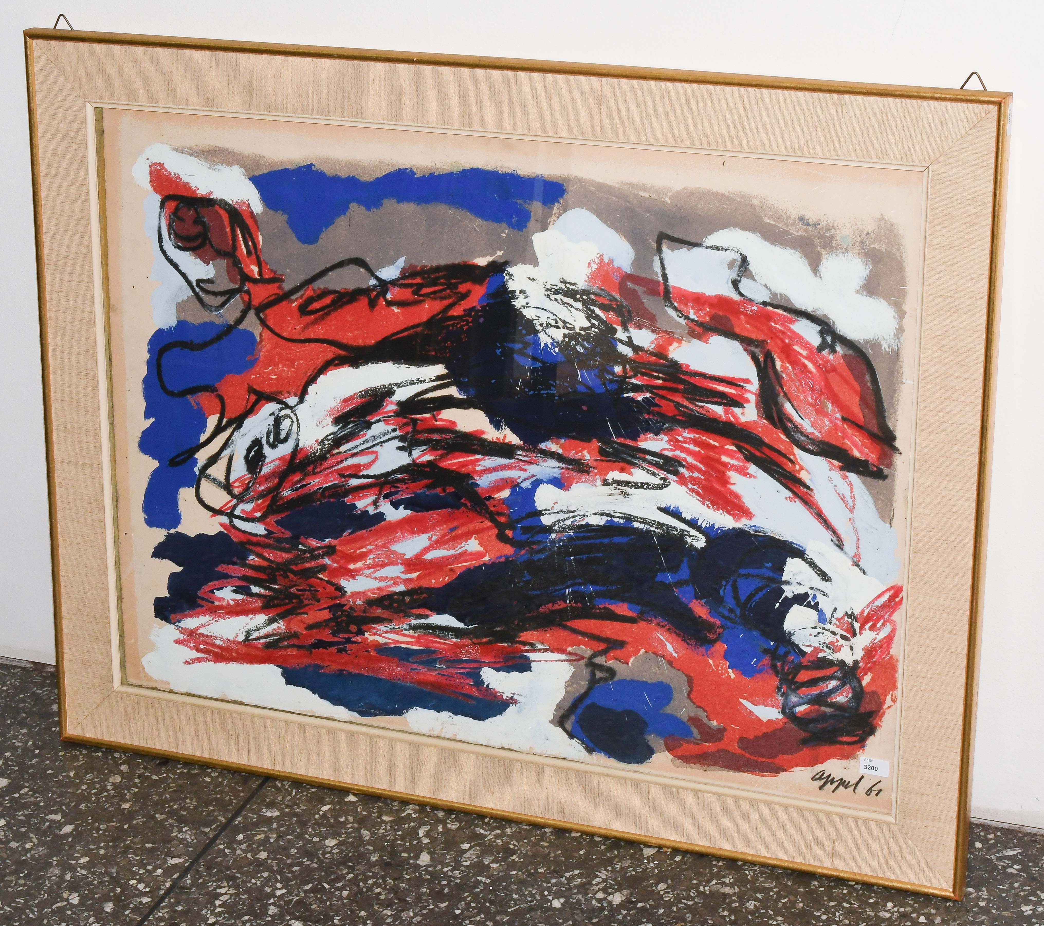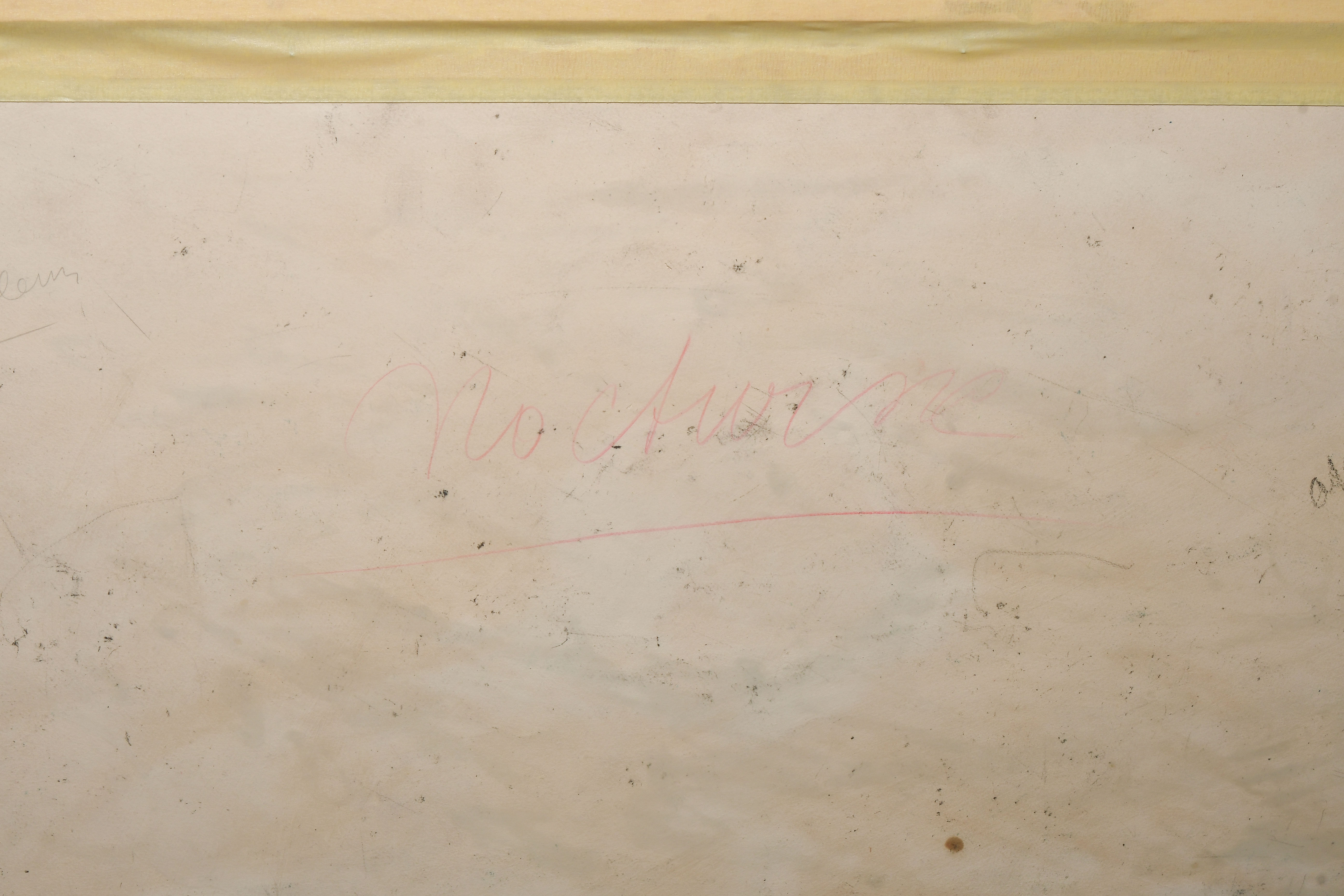 "Nocturne". 1961. Farblithographie mit Ölkreide und Gouache überarbeitet. Unten rechts signiert und datiert. Verso betitelt und in Bleistift bezeichnet: "Jacometti". Blattgrösse 56,5x76,3 cm. Gerahmt. -Blatt leicht gebräunt. Dunkler Lichtrand. Ränder und Ecken leicht bestossen. Wenige Knitter.