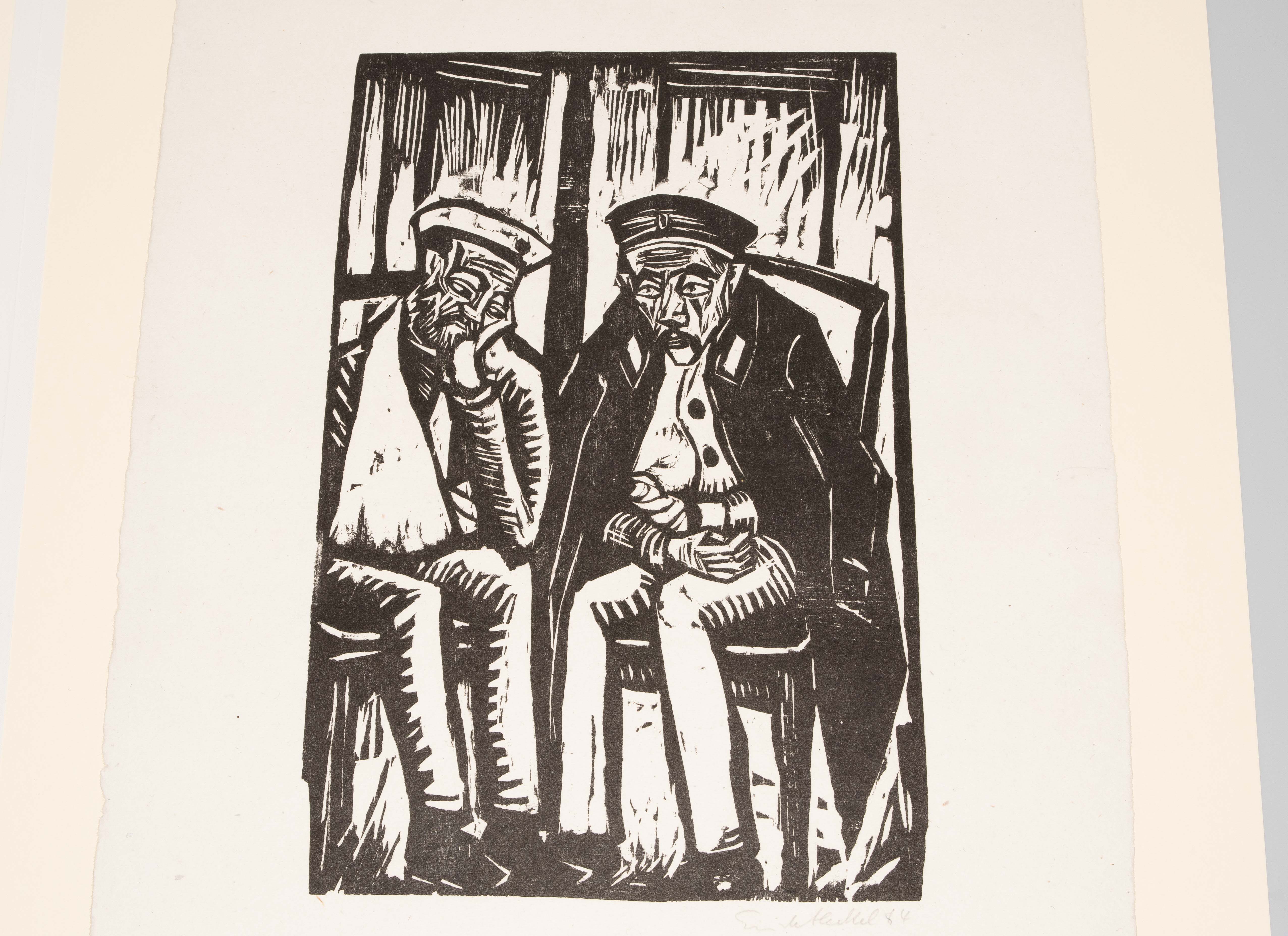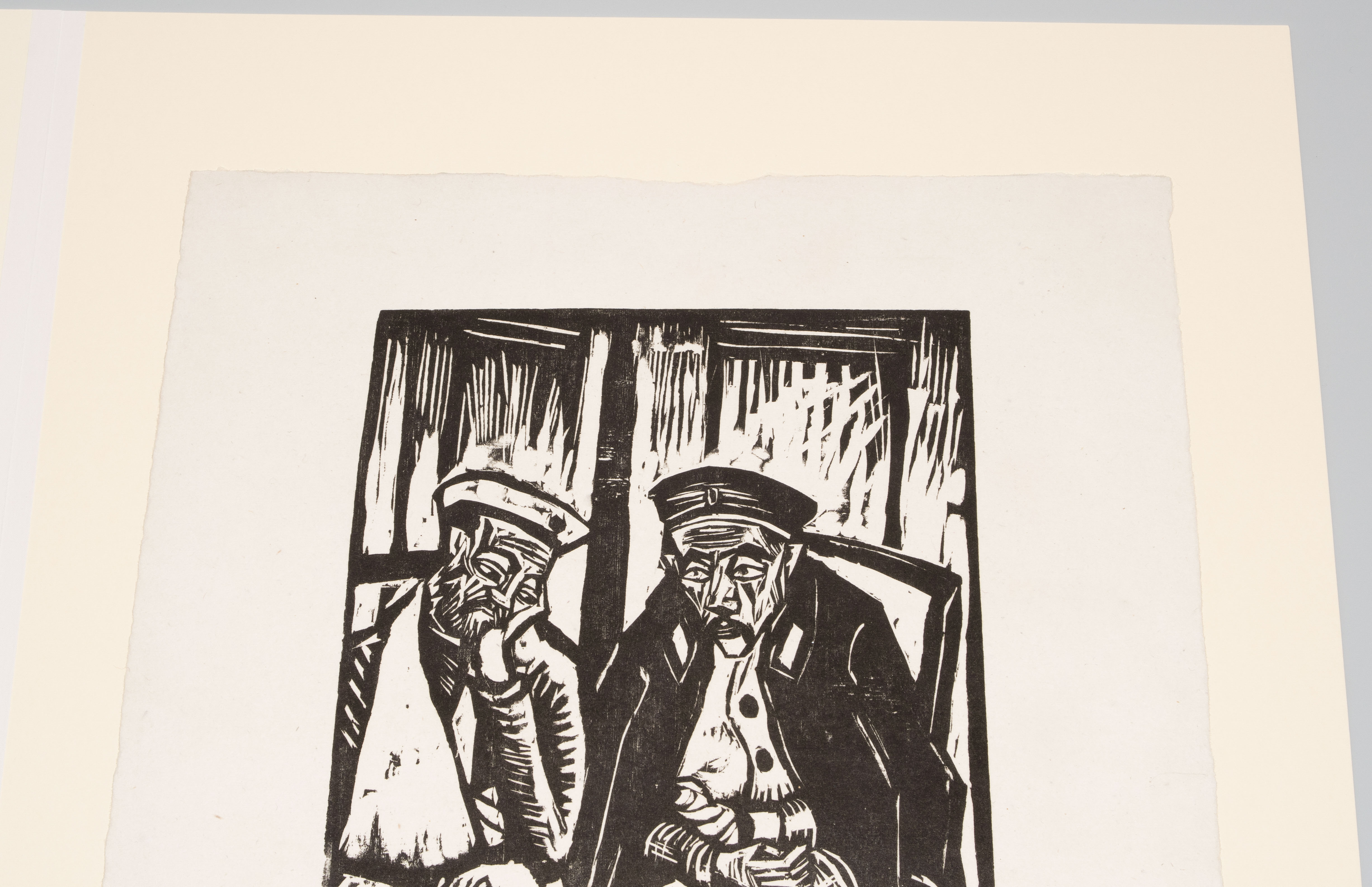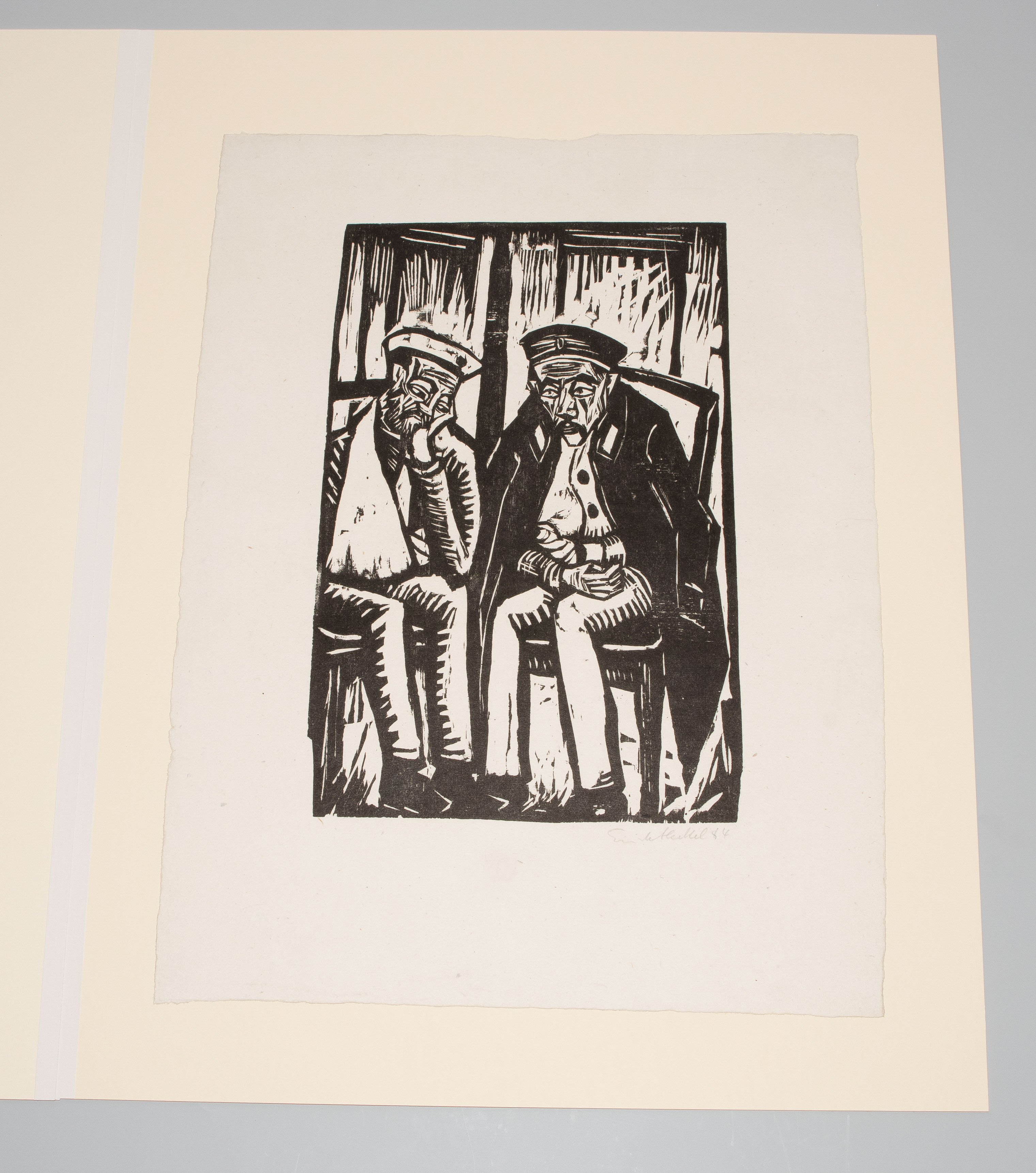 "Zwei Verwundete". 1914. Holzschnitt. Unten rechts in Bleistift signiert und datiert. Plattengrösse 42,5x26,5/28 cm. Blattgrösse 62x46 cm. -Blatt minimst gebräunt. Ränder und Ecken minimst bestossen. Verso am oberen Rand partiell an Rückkarton montiert.