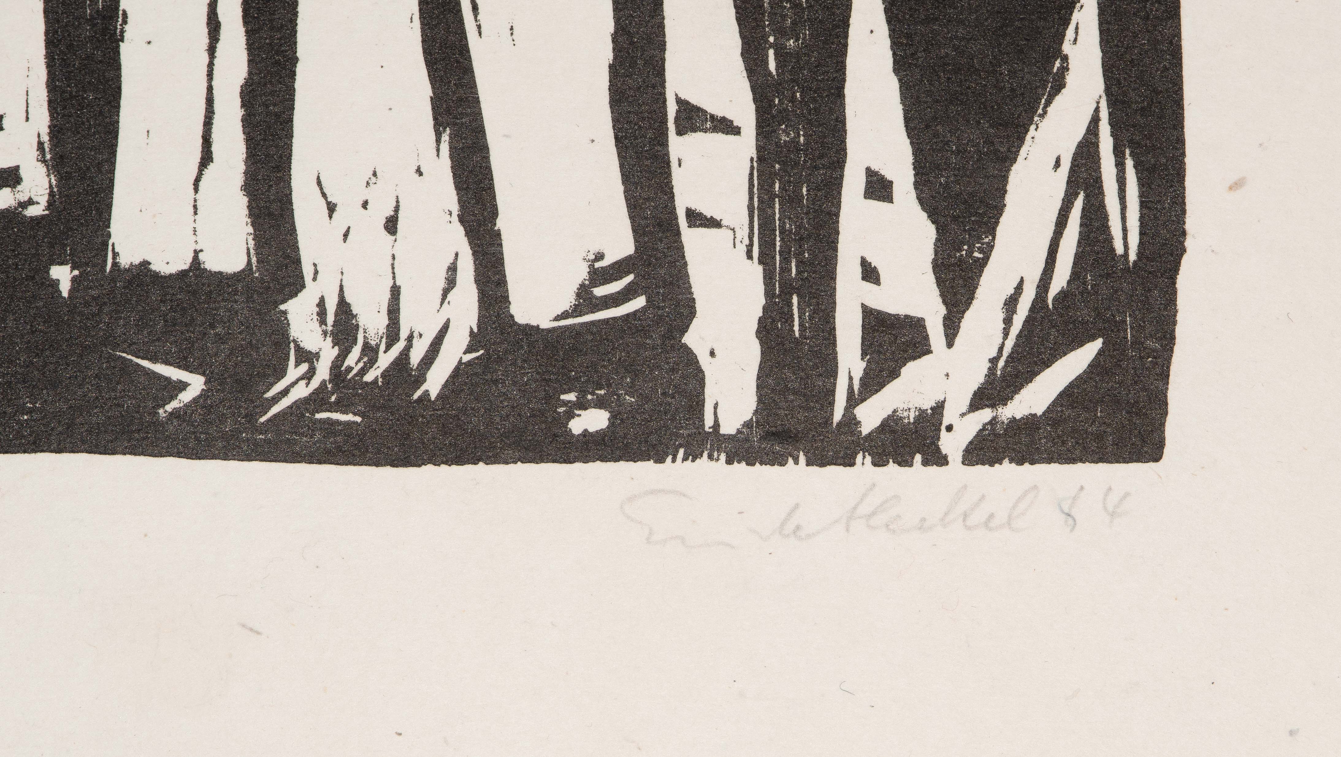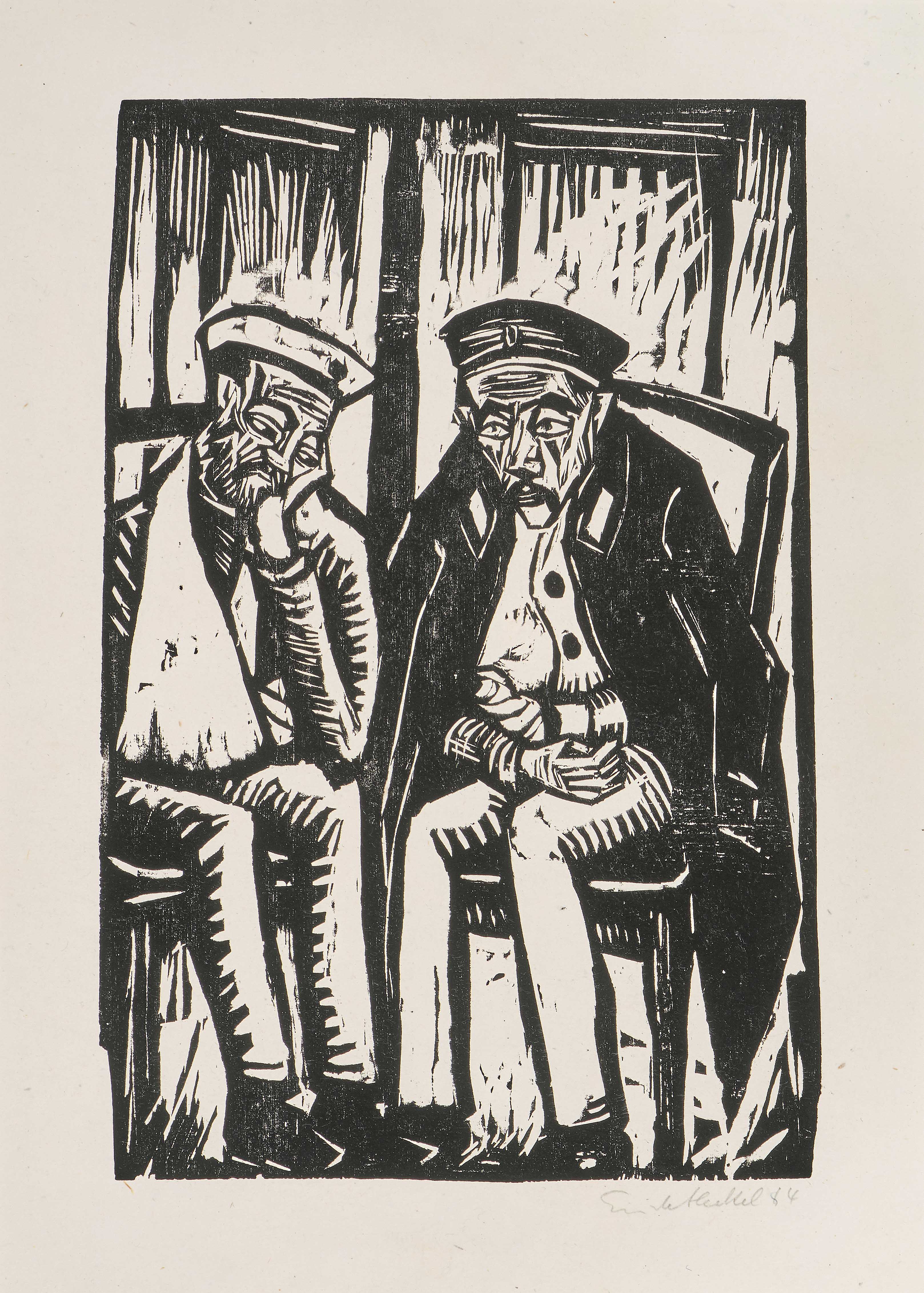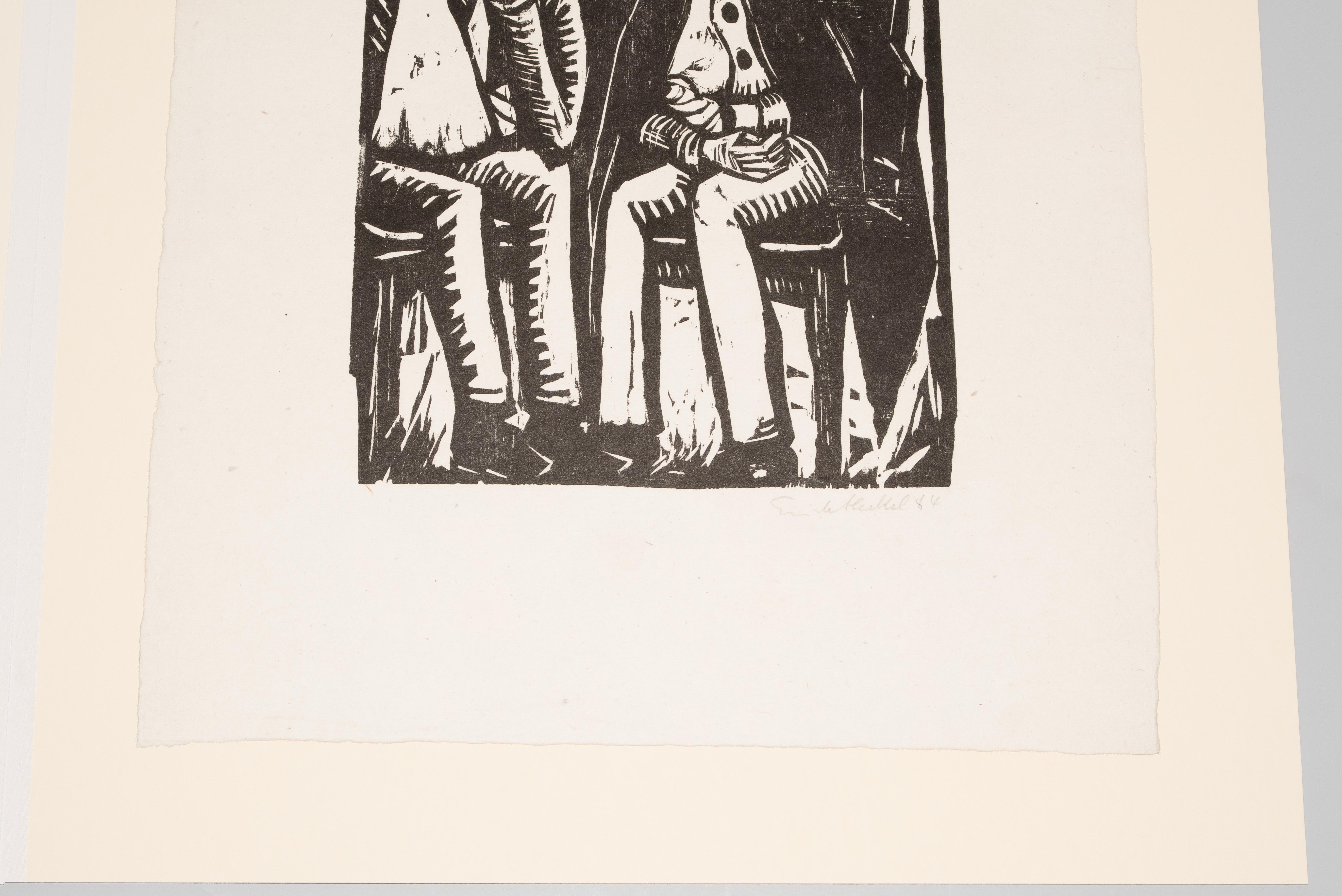 "Zwei Verwundete". 1914. Holzschnitt. Unten rechts in Bleistift signiert und datiert. Plattengrösse 42,5x26,5/28 cm. Blattgrösse 62x46 cm. -Blatt minimst gebräunt. Ränder und Ecken minimst bestossen. Verso am oberen Rand partiell an Rückkarton montiert.