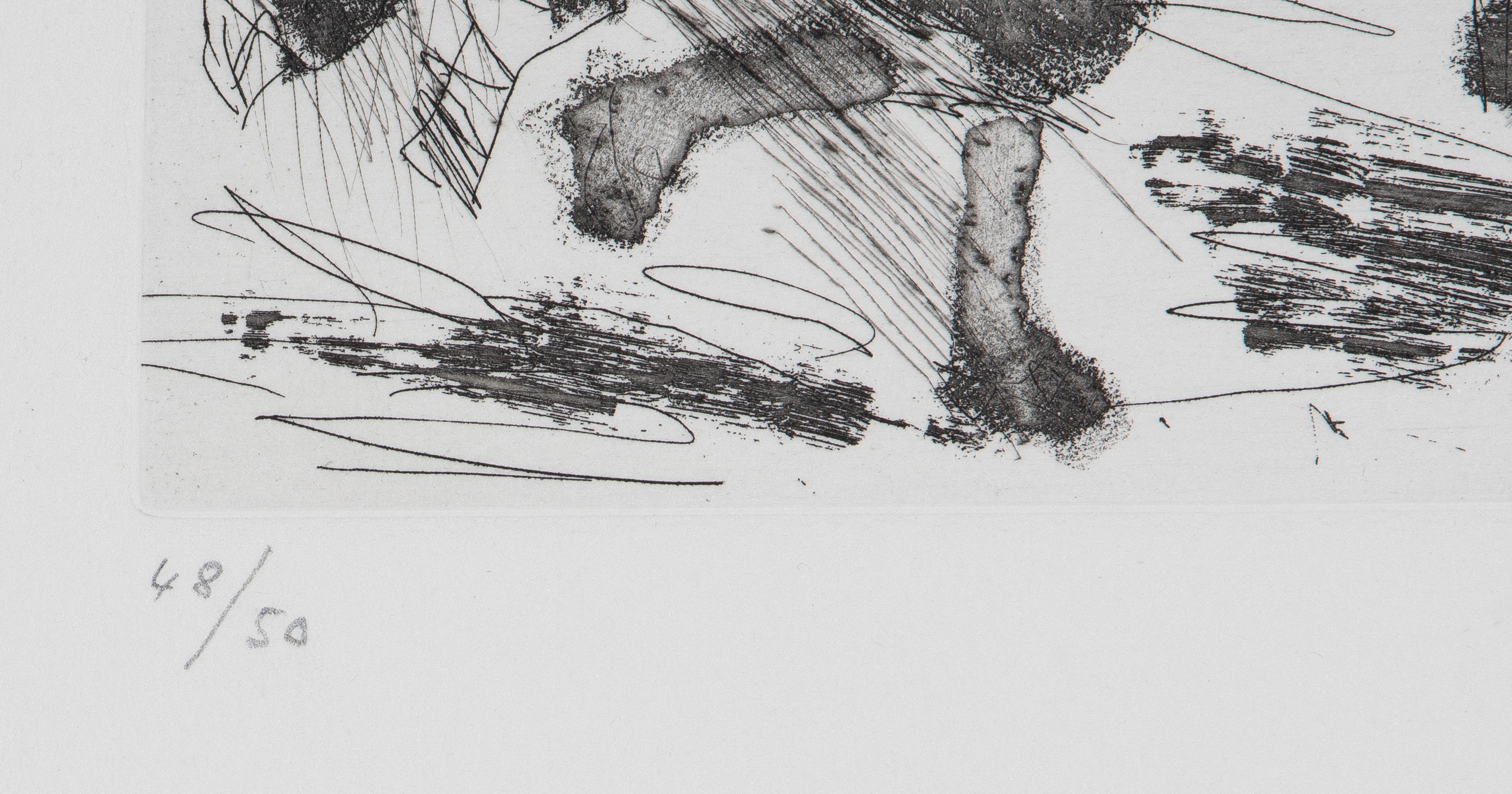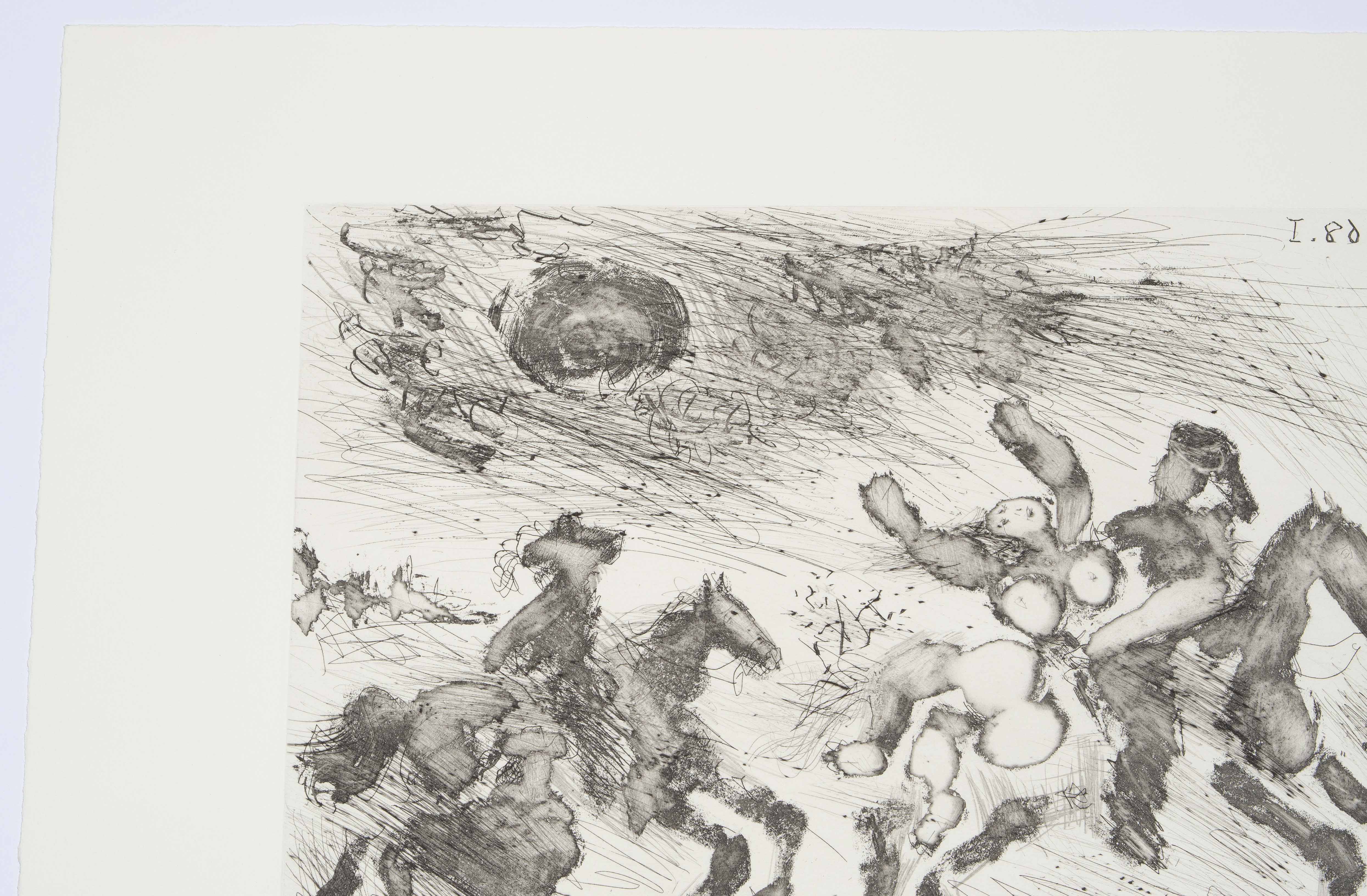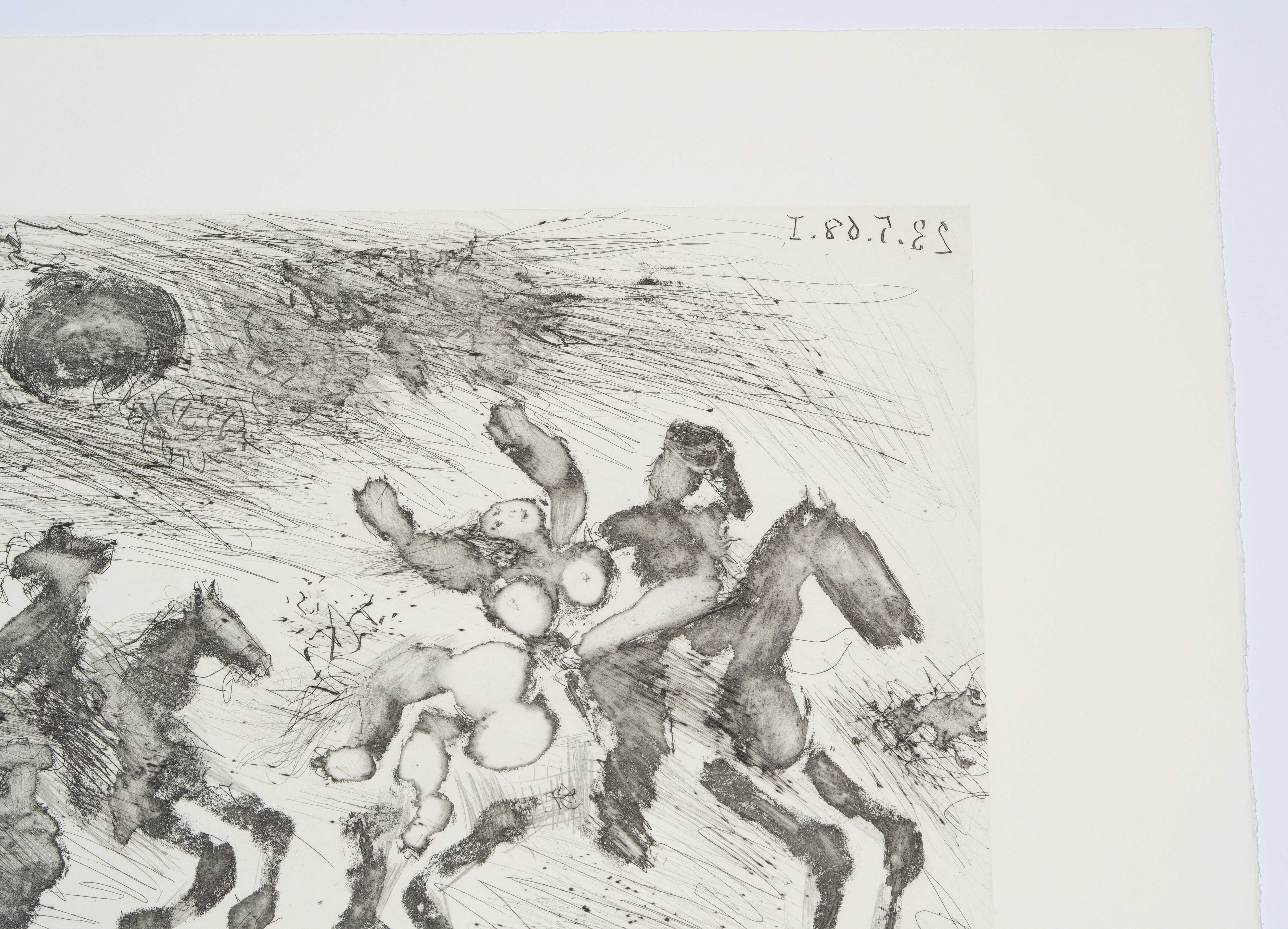 Aus: "347 gravures". "23.5.68 I". Aquatintaradierung. 48/50. Unten rechts in Bleistift signiert. Oben rechts im Druck spiegelverkehrt datiert: "23.5.68 I". Plattengrösse 23,5x33 cm. Blattgrösse 36,2x47,2 cm. -Blatt minimst gebräunt. Ränder und Ecken minimst bestossen. Verso am oberen Rand partiell an Rückkarton montiert.