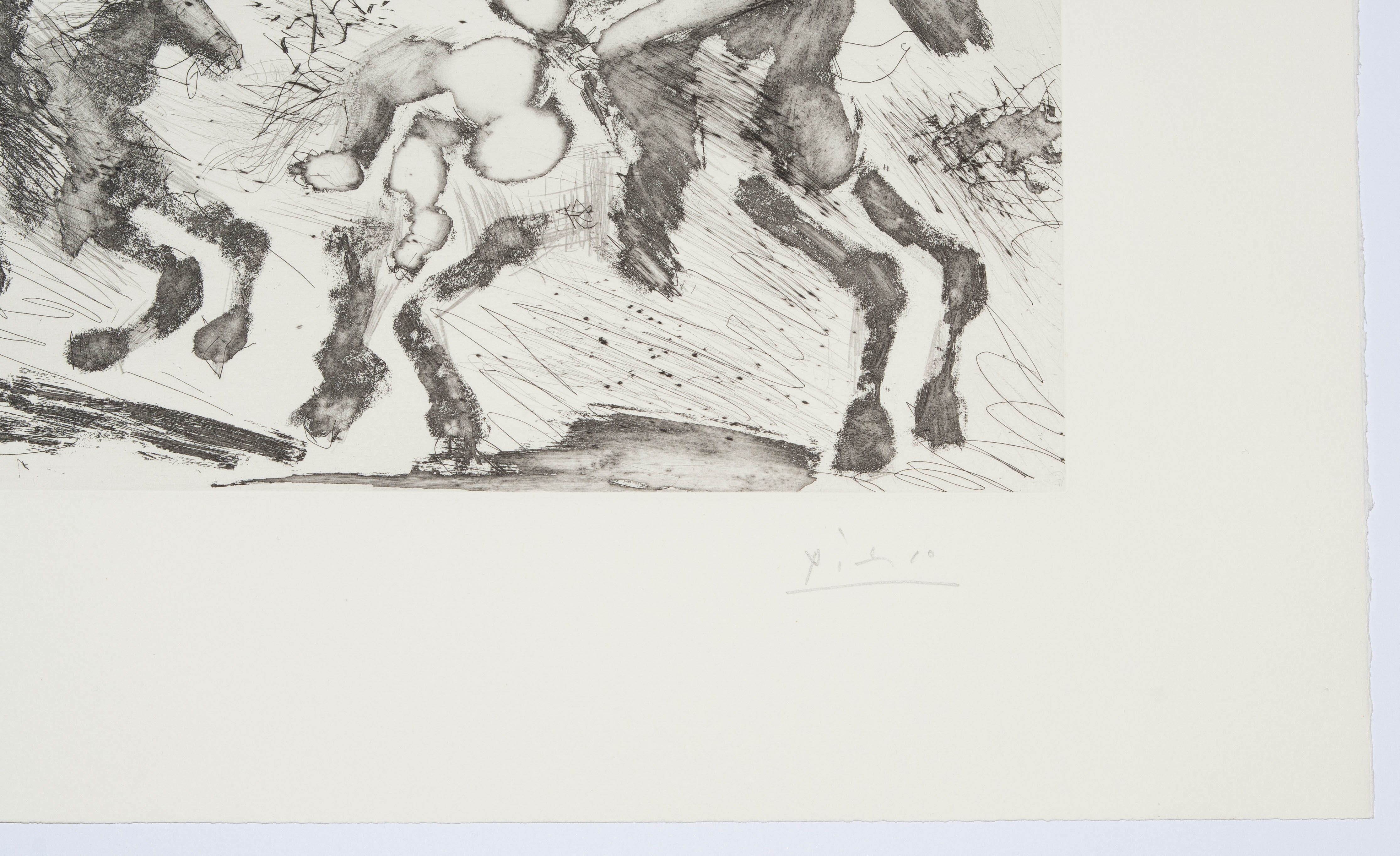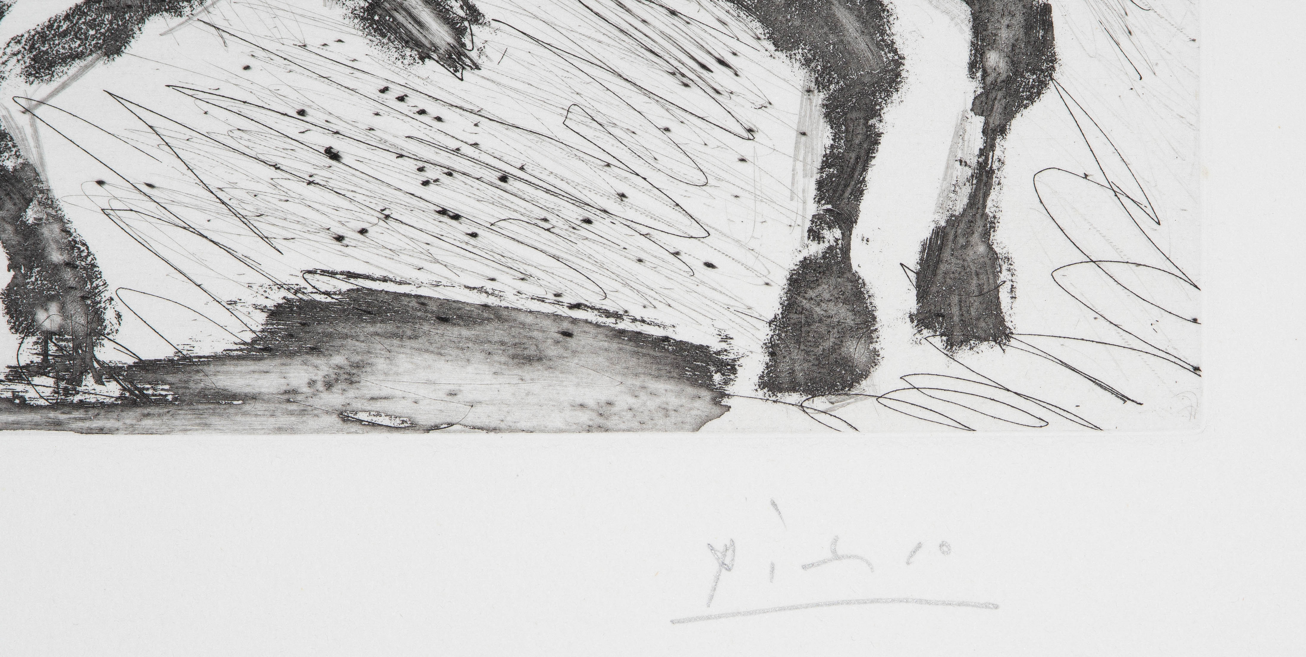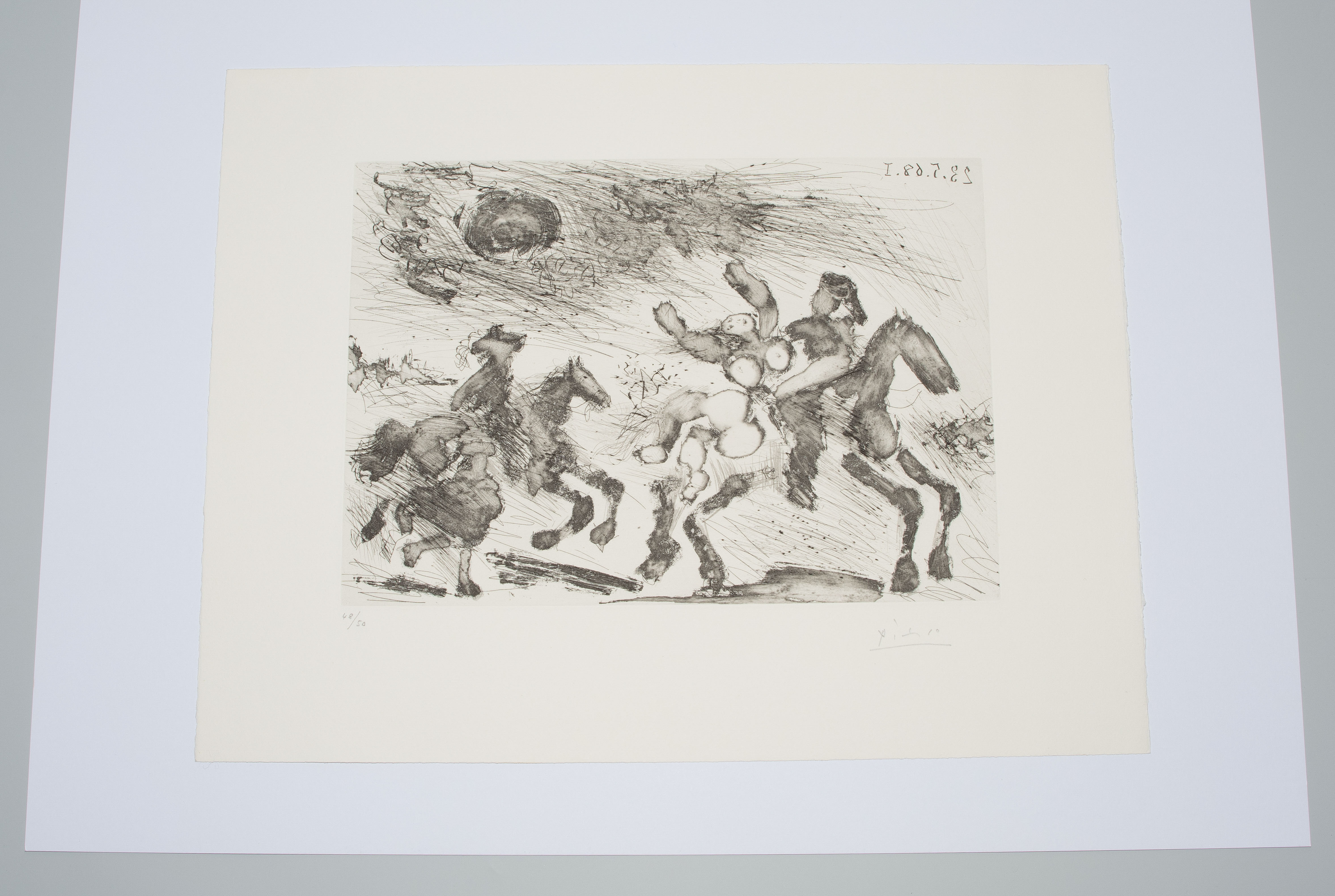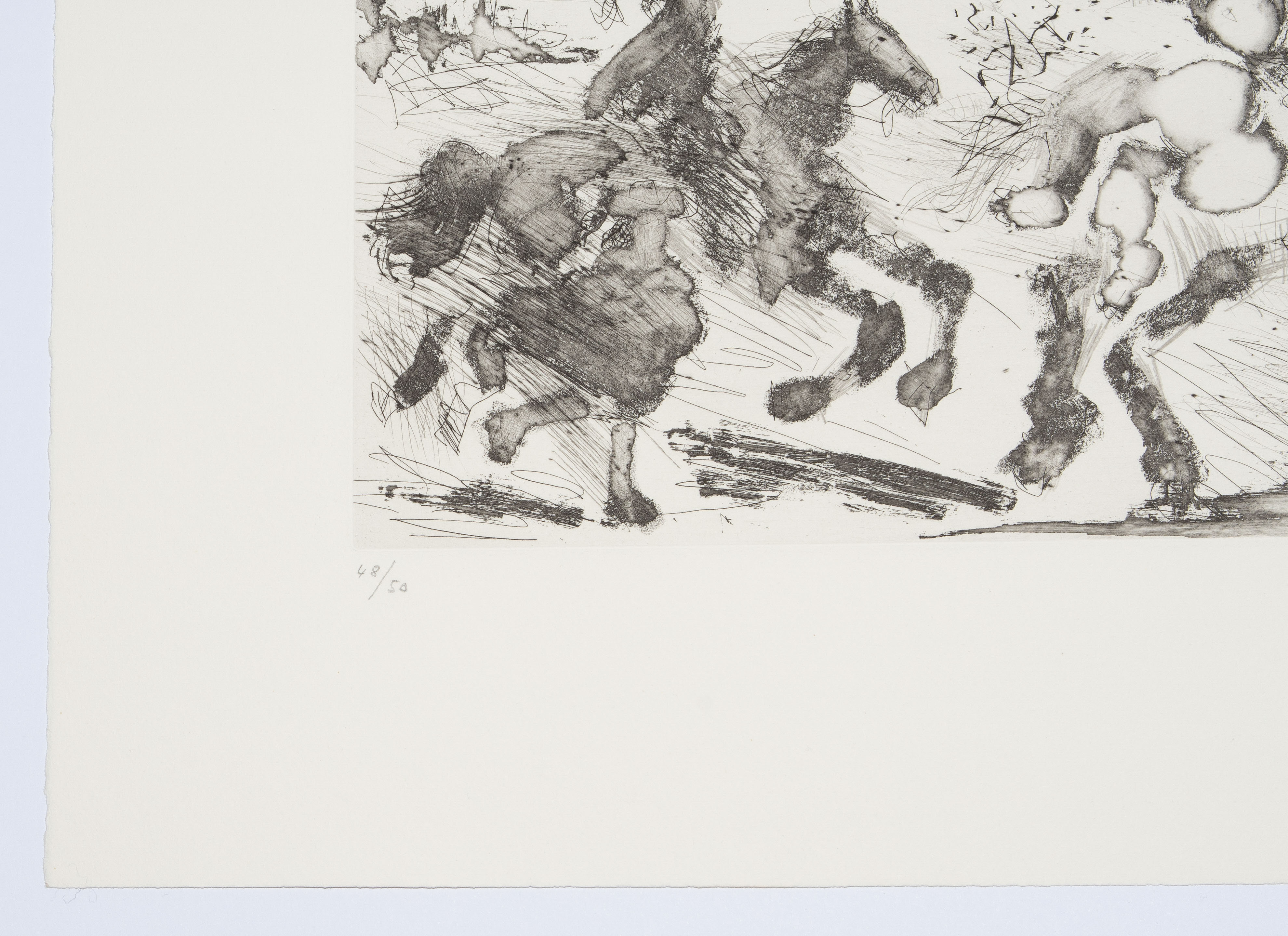 Aus: "347 gravures". "23.5.68 I". Aquatintaradierung. 48/50. Unten rechts in Bleistift signiert. Oben rechts im Druck spiegelverkehrt datiert: "23.5.68 I". Plattengrösse 23,5x33 cm. Blattgrösse 36,2x47,2 cm. -Blatt minimst gebräunt. Ränder und Ecken minimst bestossen. Verso am oberen Rand partiell an Rückkarton montiert.