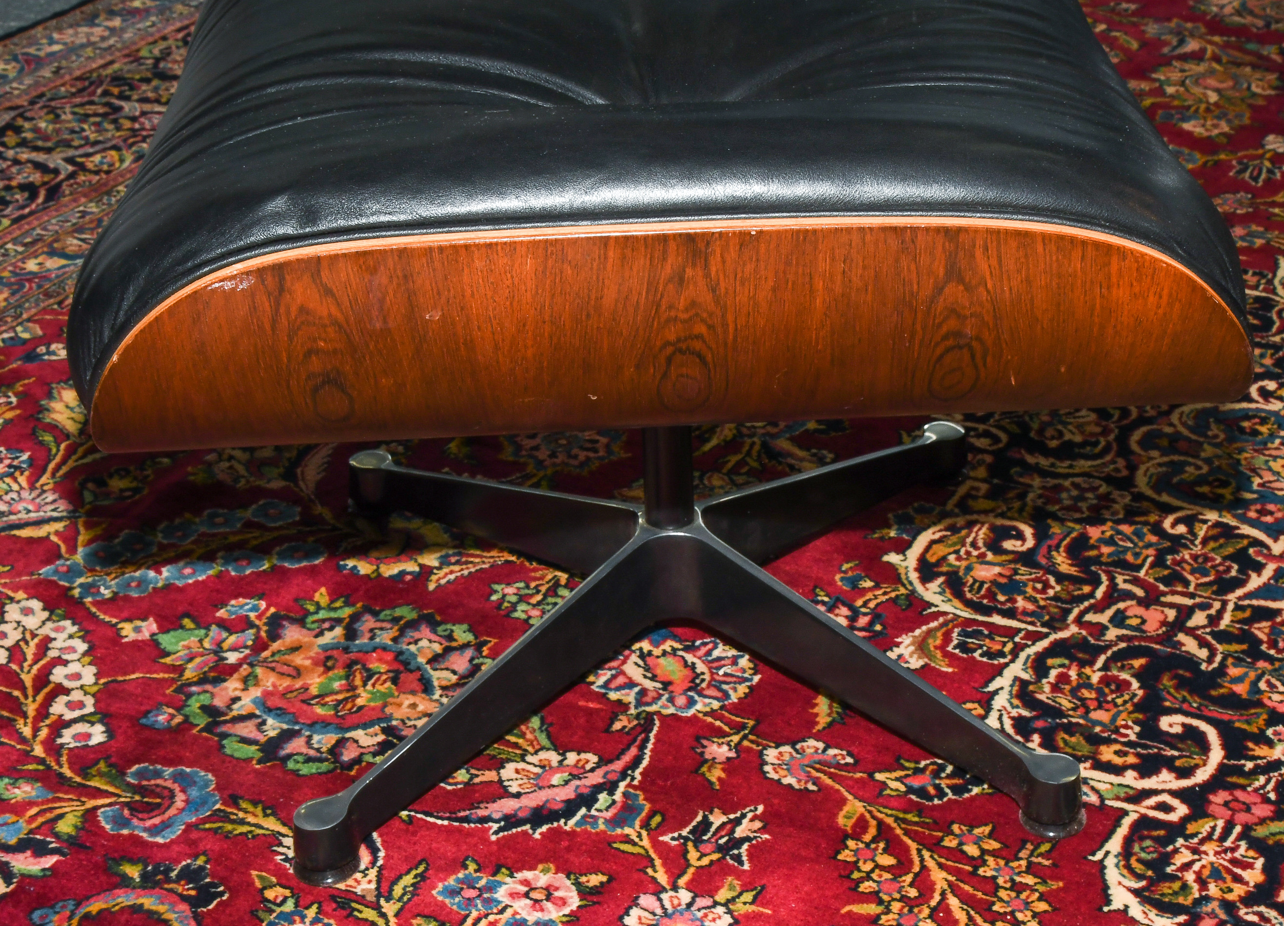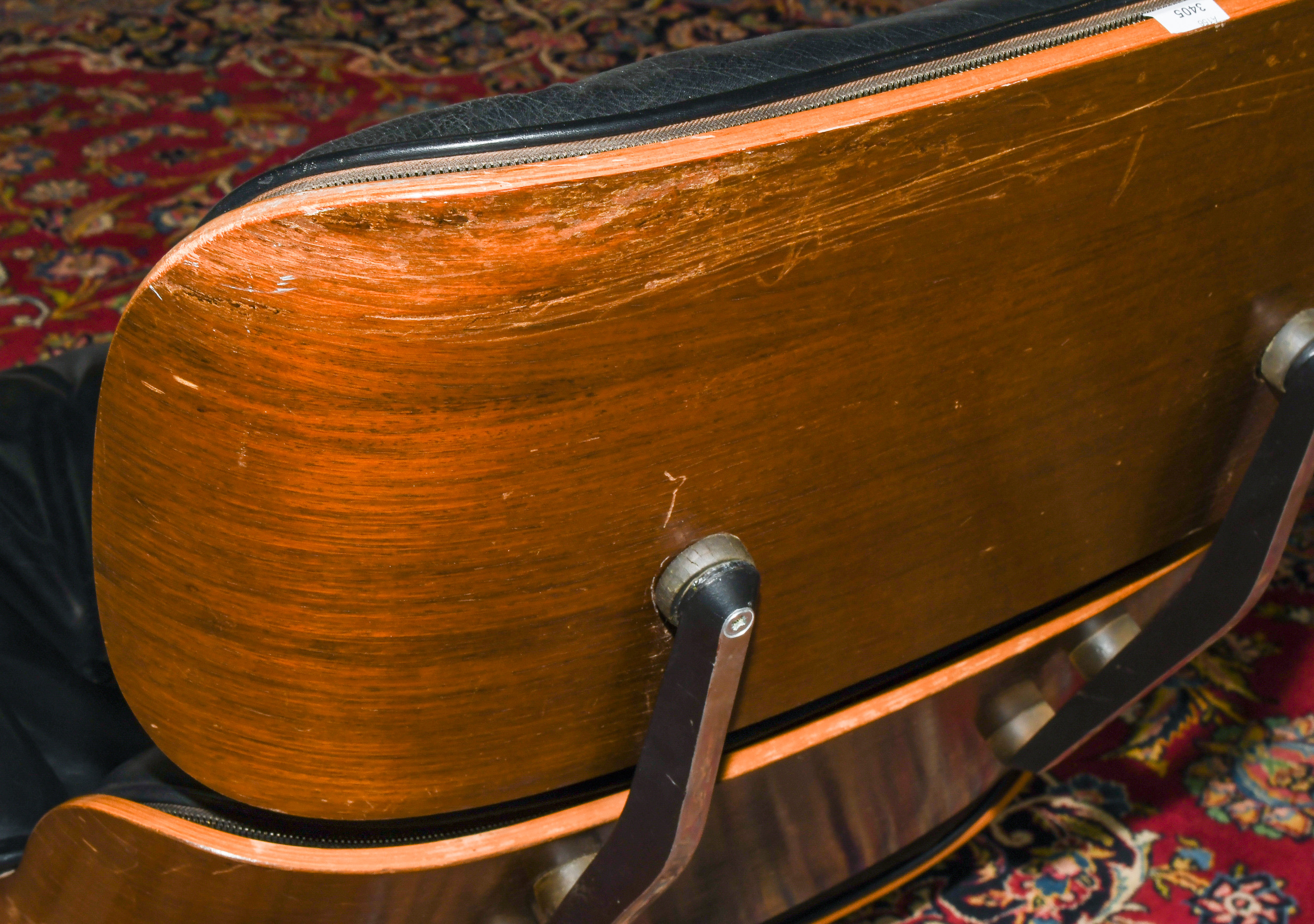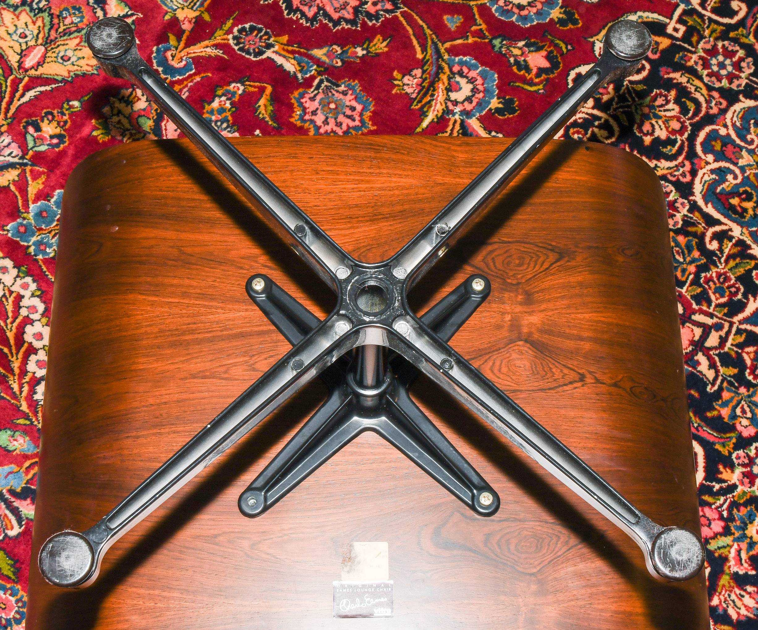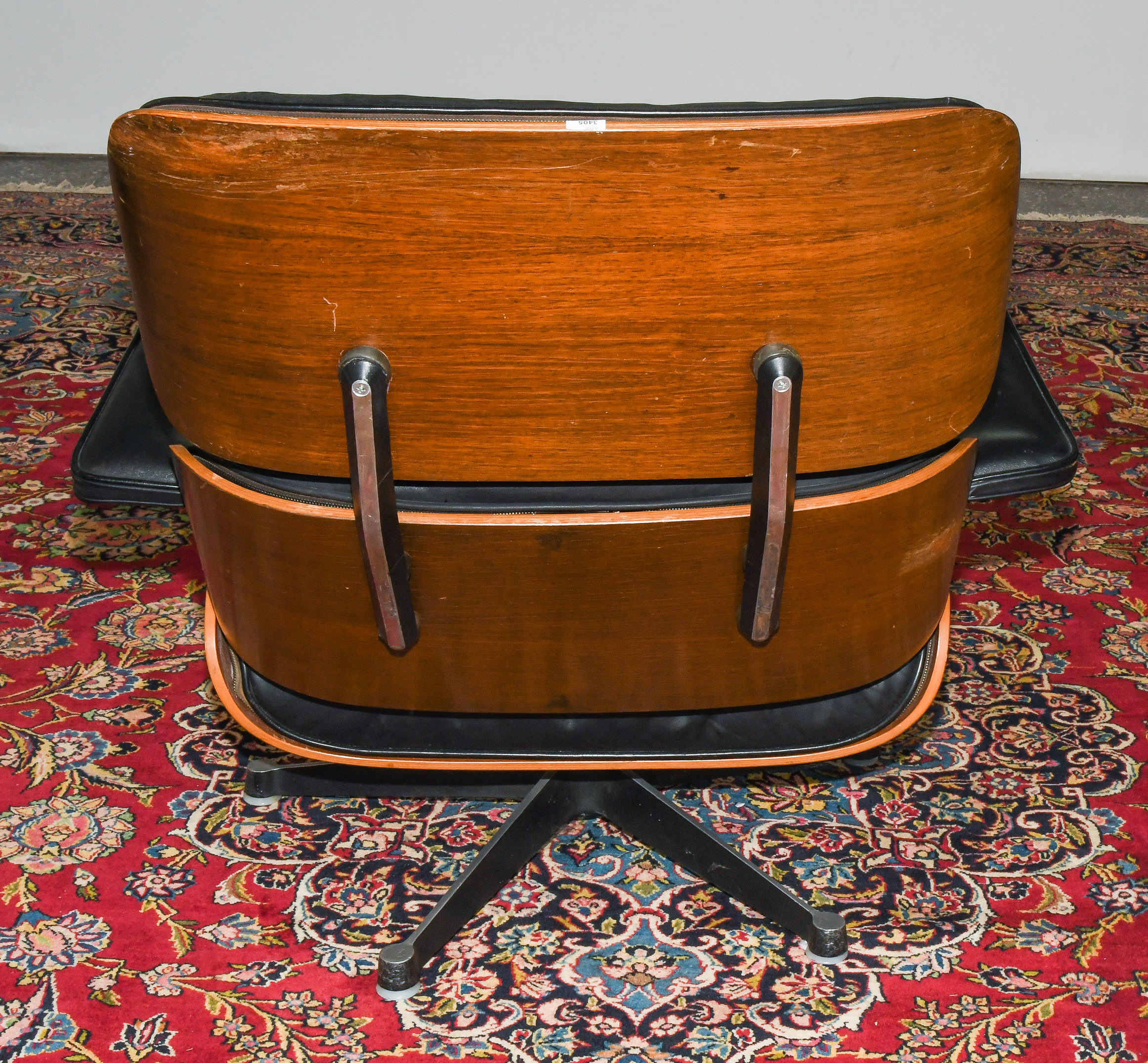 Lounge Chair und Ottoman. Entwurfsjahr: 1956. Ausführung Lounge Chair: Wohl Herman Miller; Ausführung Ottoman: Vitra. Schale Formschichtholz, Untergestell Aluminium. Lounge Chair nicht bezeichnet, Ottoman bezeichnet: ORIGINAL EAMES LOUNGE CHAIR Charles Eames vitra. B 84 cm; T 92 cm; H 82 cm; Sitzhöhe 32 cm.