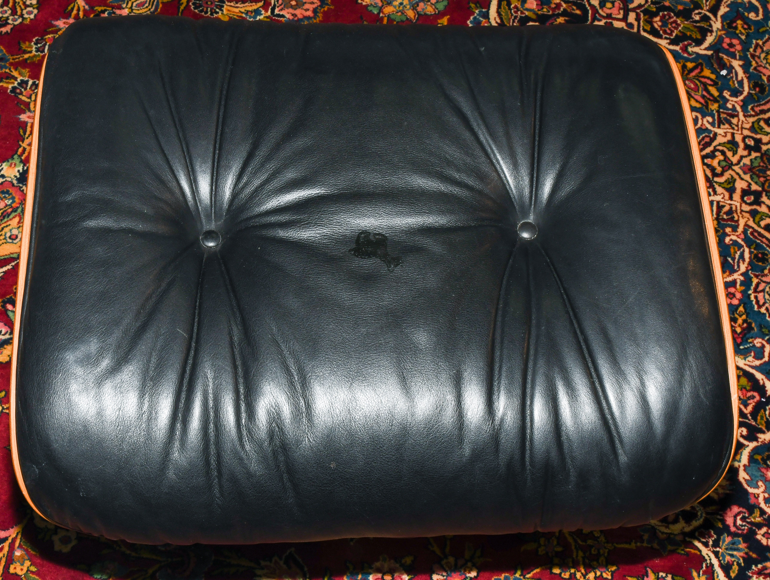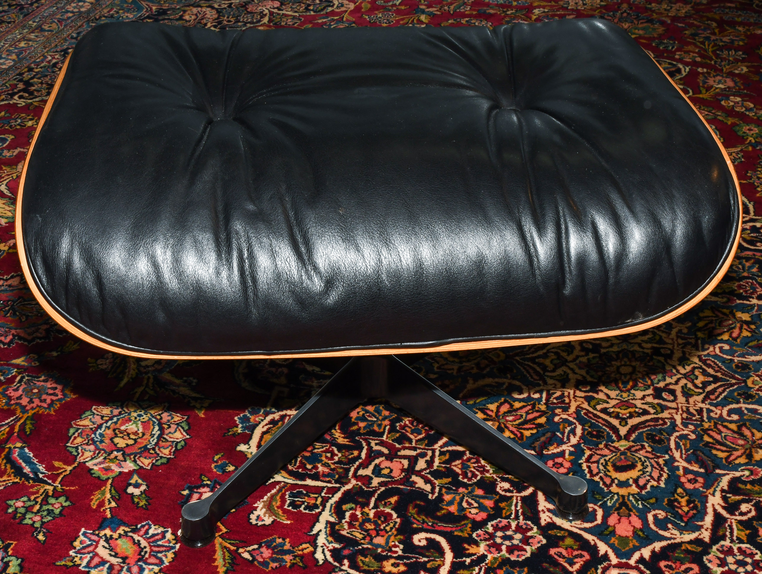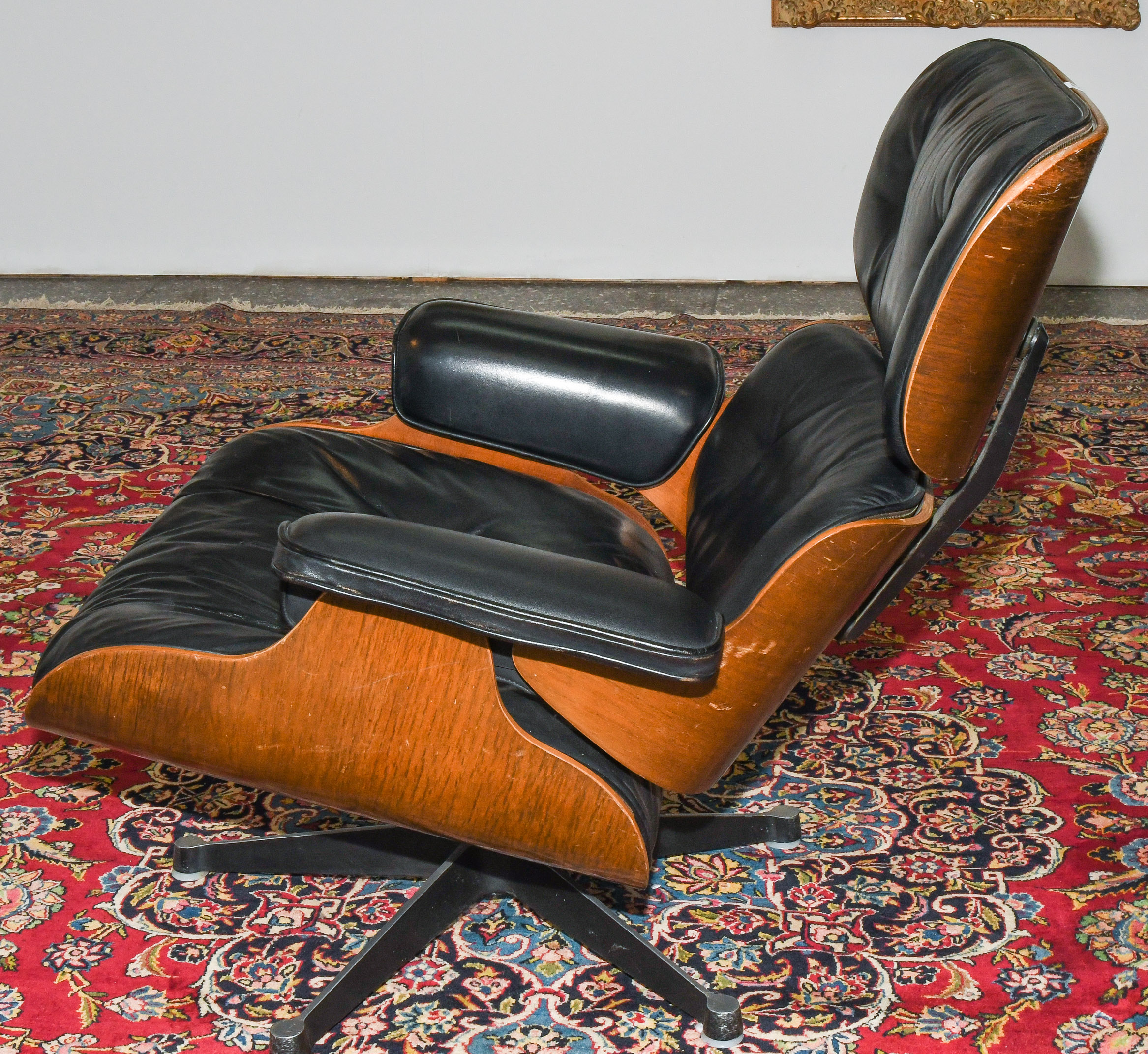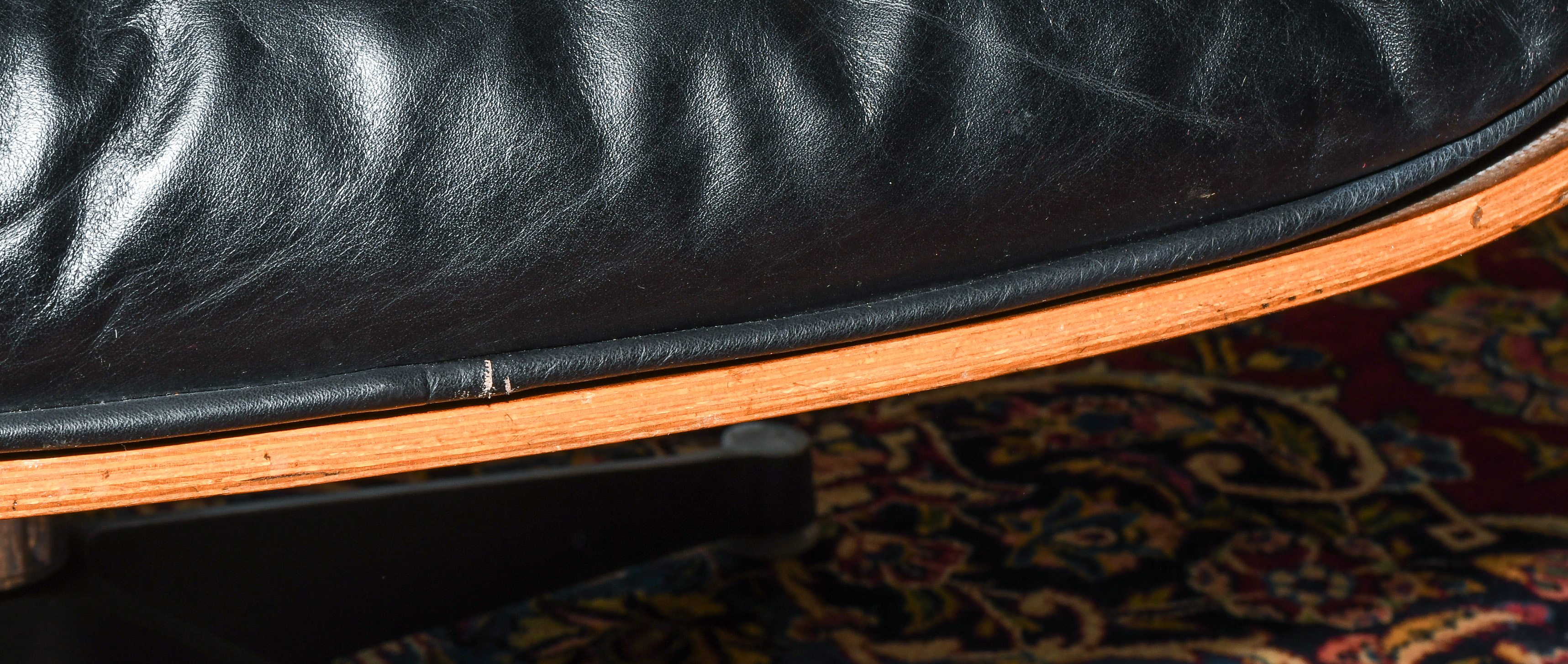 Lounge Chair und Ottoman. Entwurfsjahr: 1956. Ausführung Lounge Chair: Wohl Herman Miller; Ausführung Ottoman: Vitra. Schale Formschichtholz, Untergestell Aluminium. Lounge Chair nicht bezeichnet, Ottoman bezeichnet: ORIGINAL EAMES LOUNGE CHAIR Charles Eames vitra. B 84 cm; T 92 cm; H 82 cm; Sitzhöhe 32 cm.