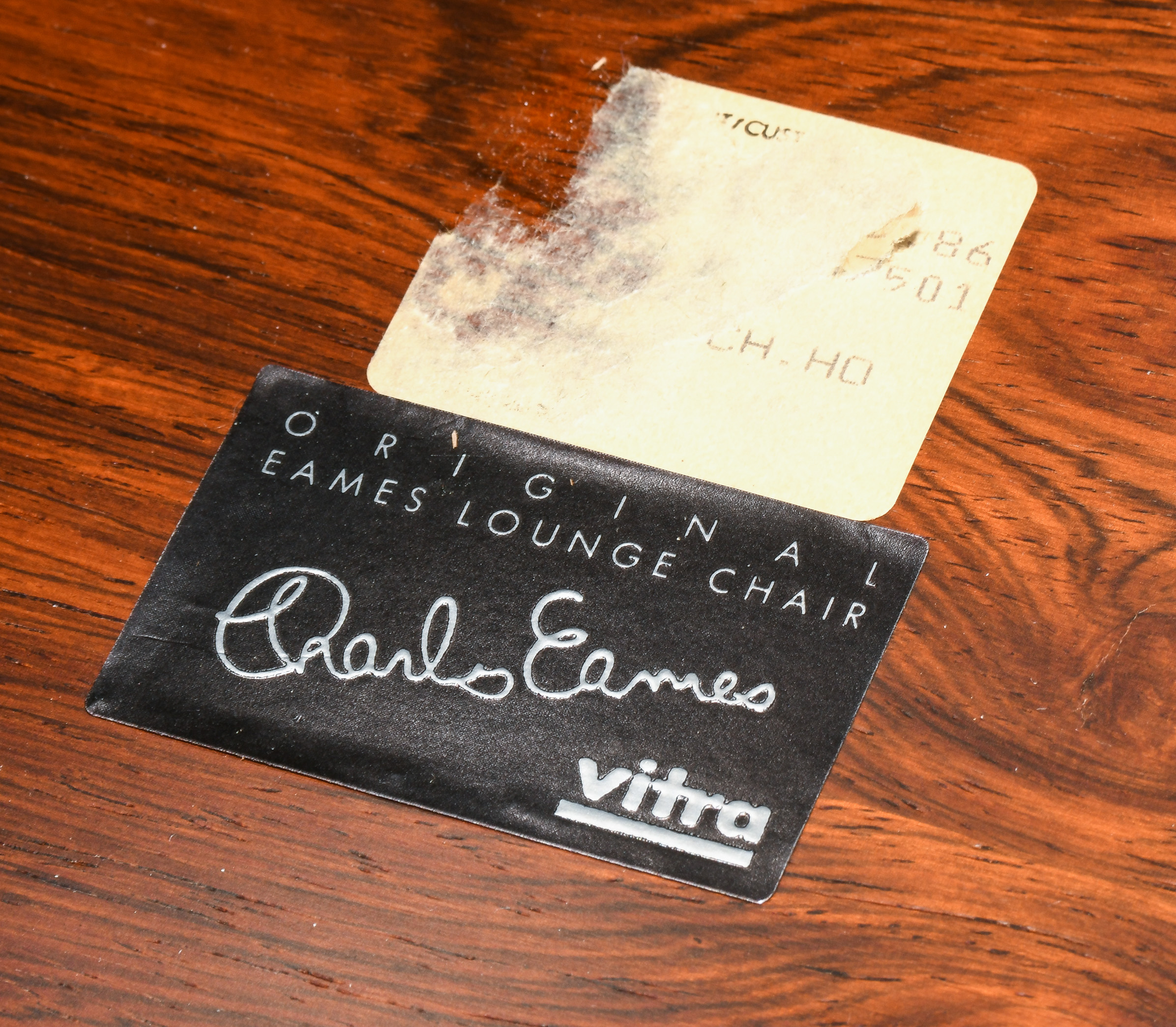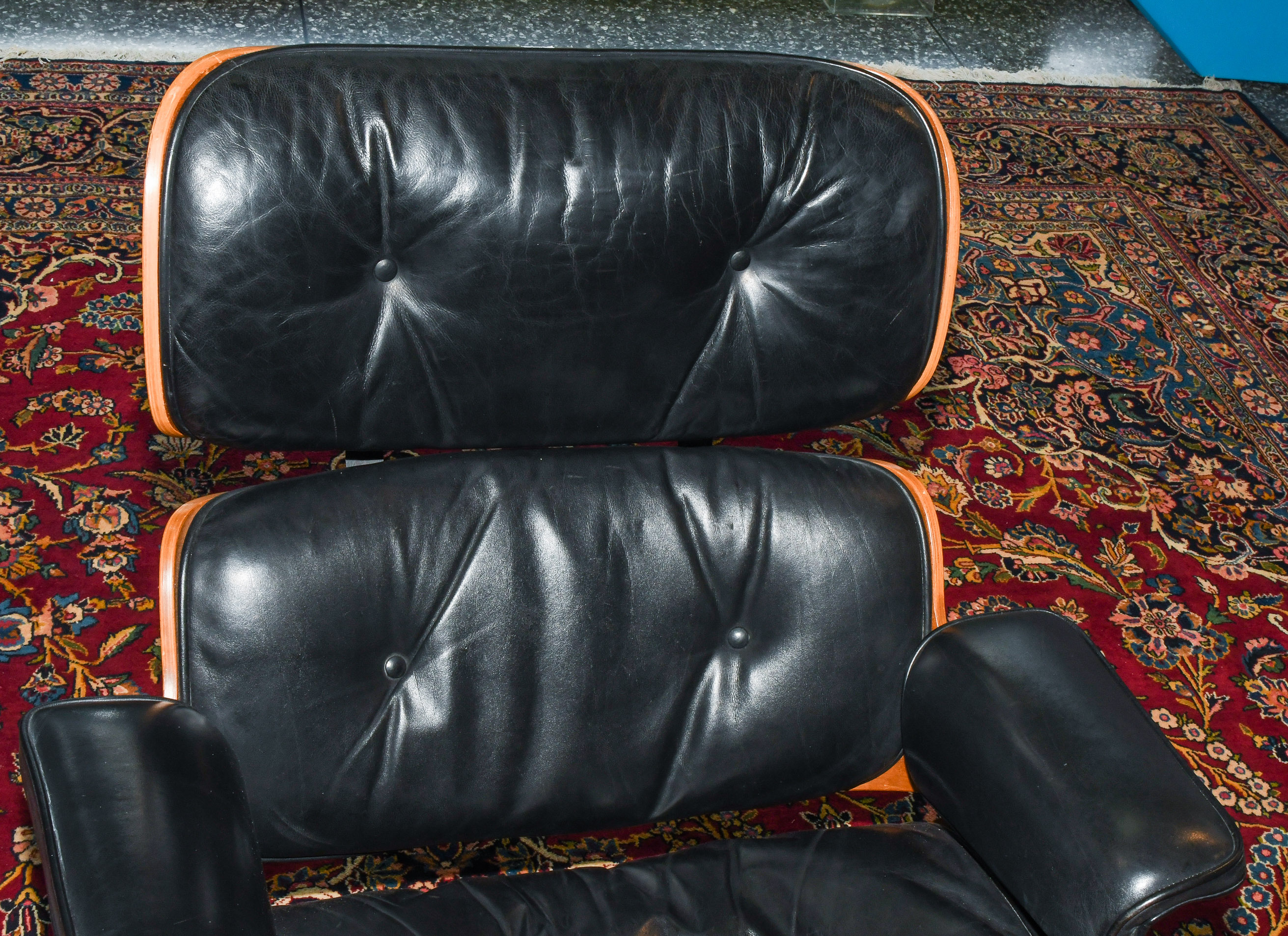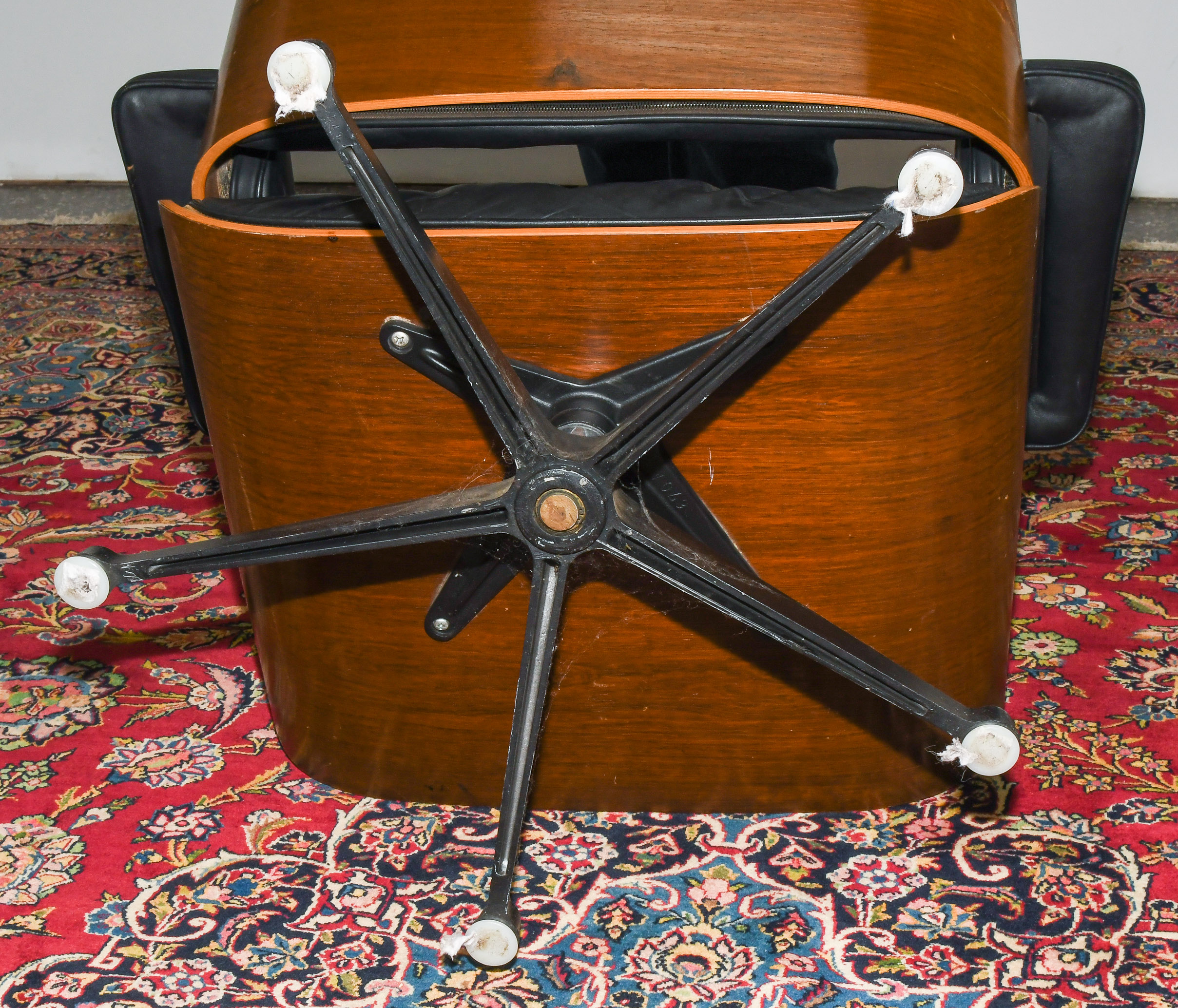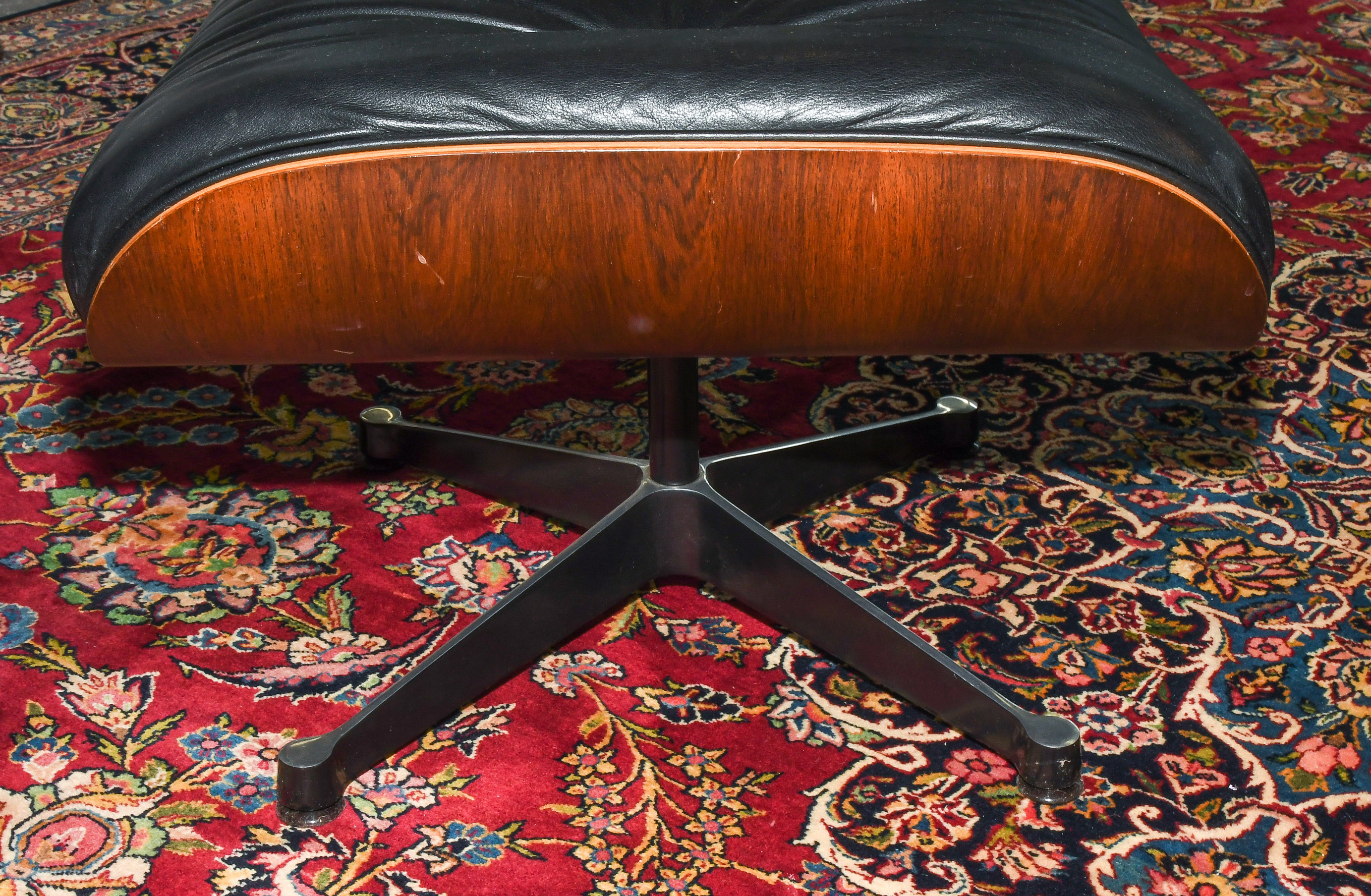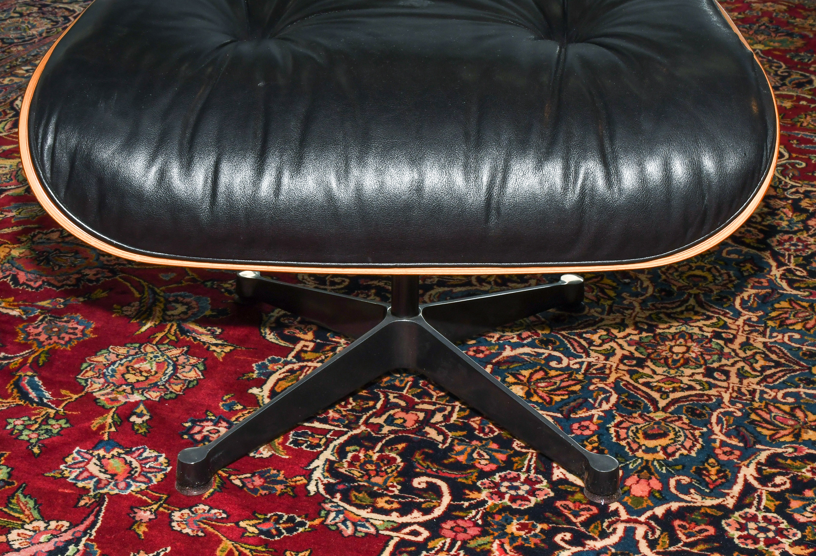 Lounge Chair und Ottoman. Entwurfsjahr: 1956. Ausführung Lounge Chair: Wohl Herman Miller; Ausführung Ottoman: Vitra. Schale Formschichtholz, Untergestell Aluminium. Lounge Chair nicht bezeichnet, Ottoman bezeichnet: ORIGINAL EAMES LOUNGE CHAIR Charles Eames vitra. B 84 cm; T 92 cm; H 82 cm; Sitzhöhe 32 cm.