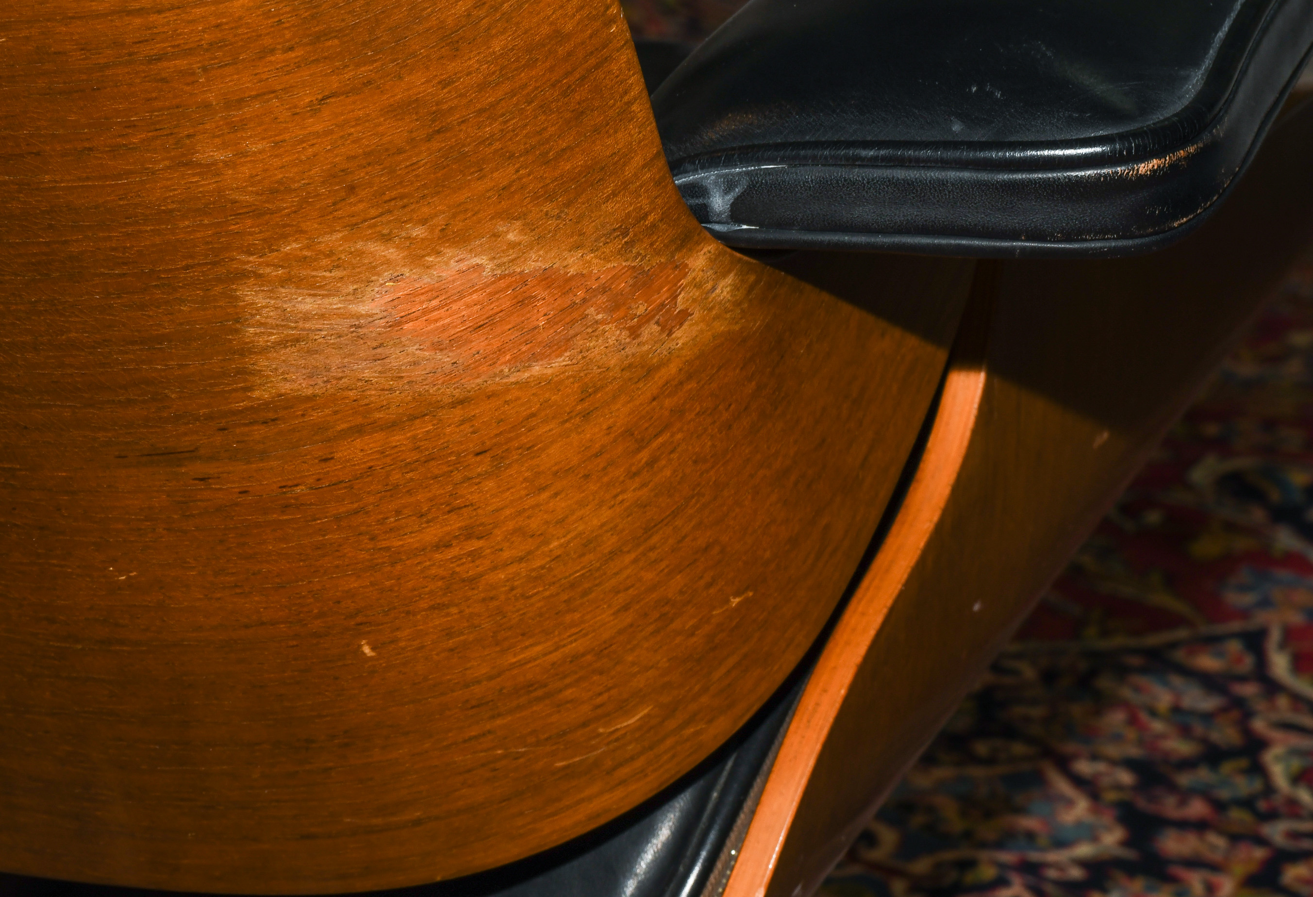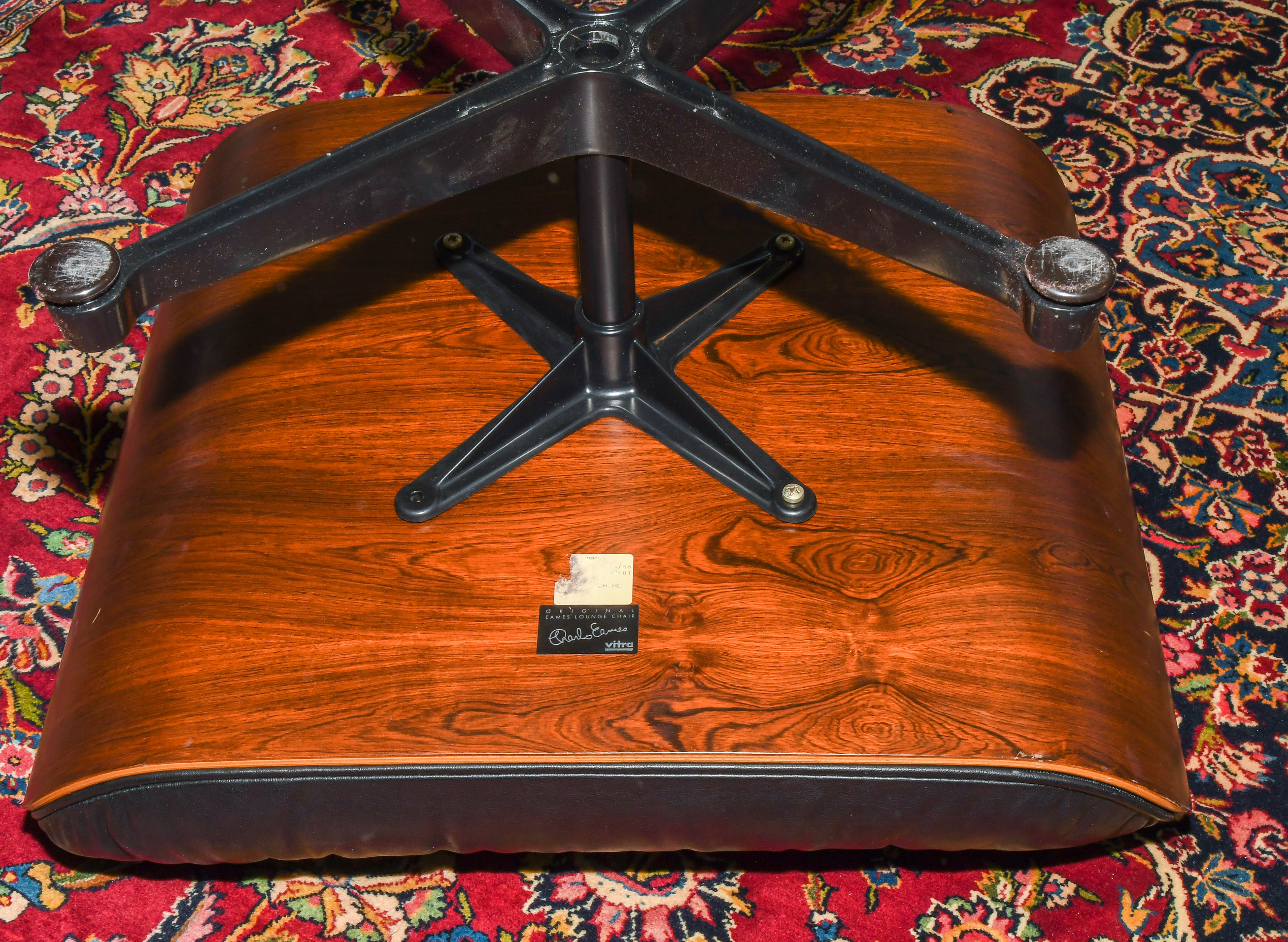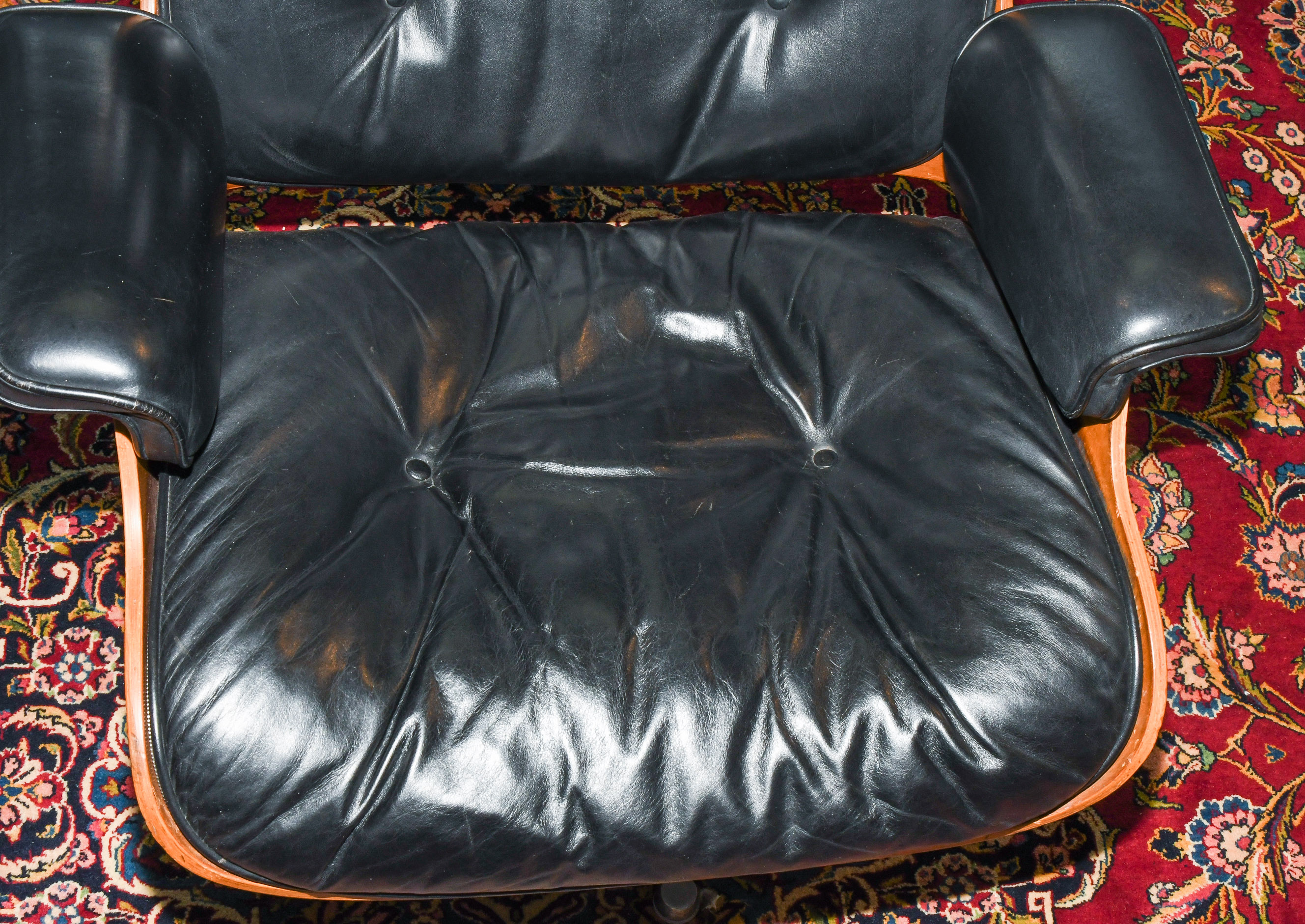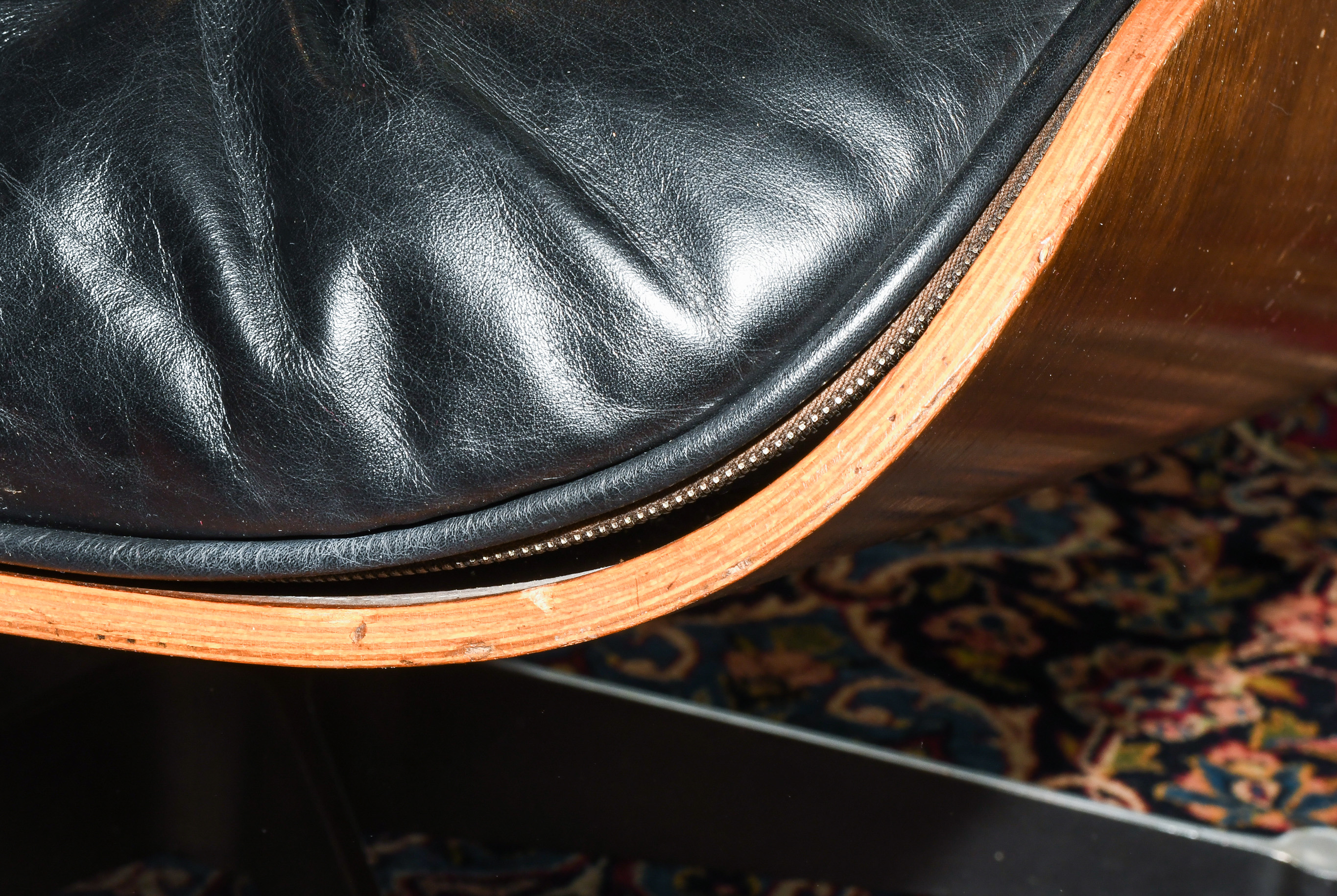 Lounge Chair und Ottoman. Entwurfsjahr: 1956. Ausführung Lounge Chair: Wohl Herman Miller; Ausführung Ottoman: Vitra. Schale Formschichtholz, Untergestell Aluminium. Lounge Chair nicht bezeichnet, Ottoman bezeichnet: ORIGINAL EAMES LOUNGE CHAIR Charles Eames vitra. B 84 cm; T 92 cm; H 82 cm; Sitzhöhe 32 cm.