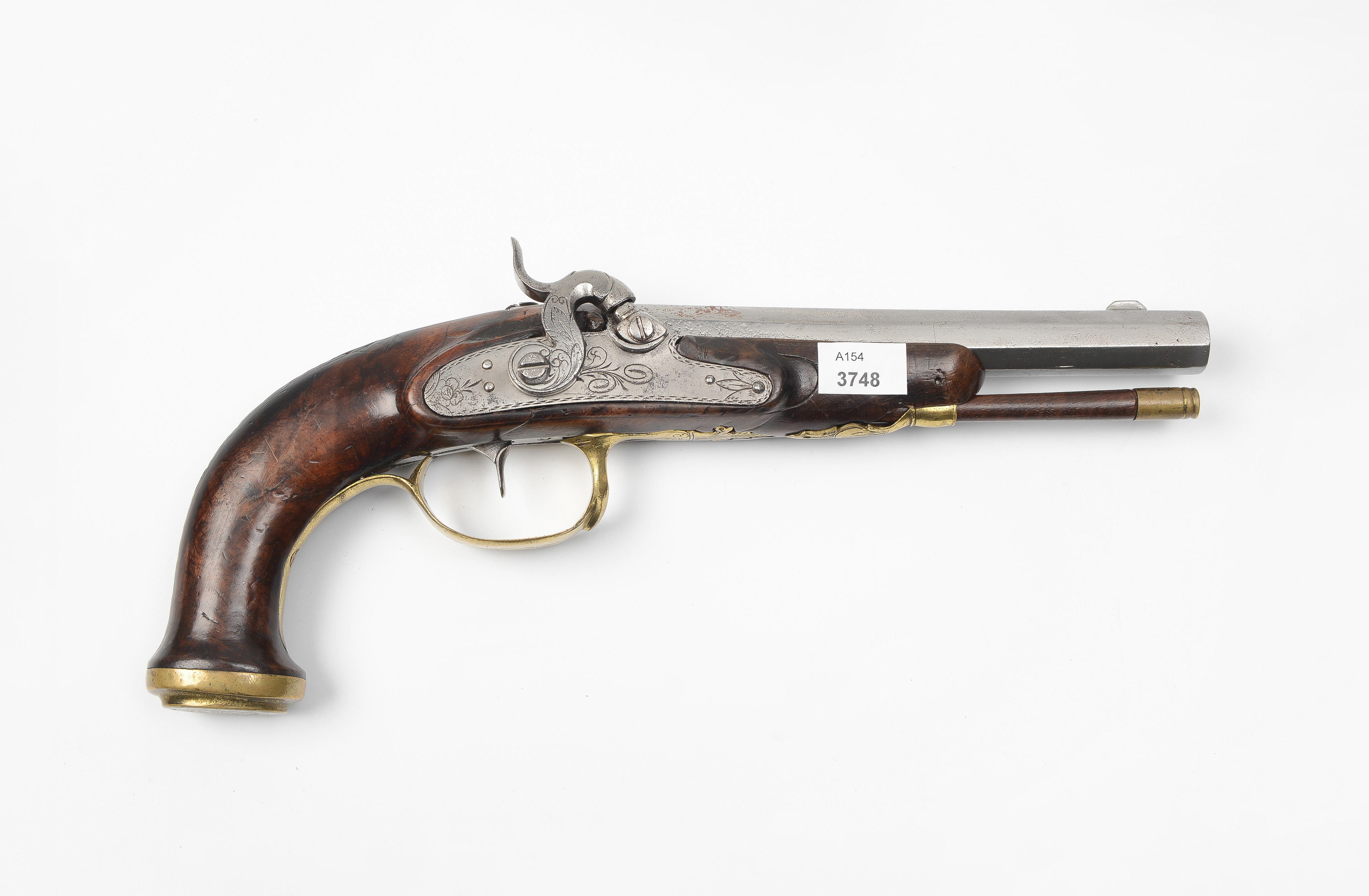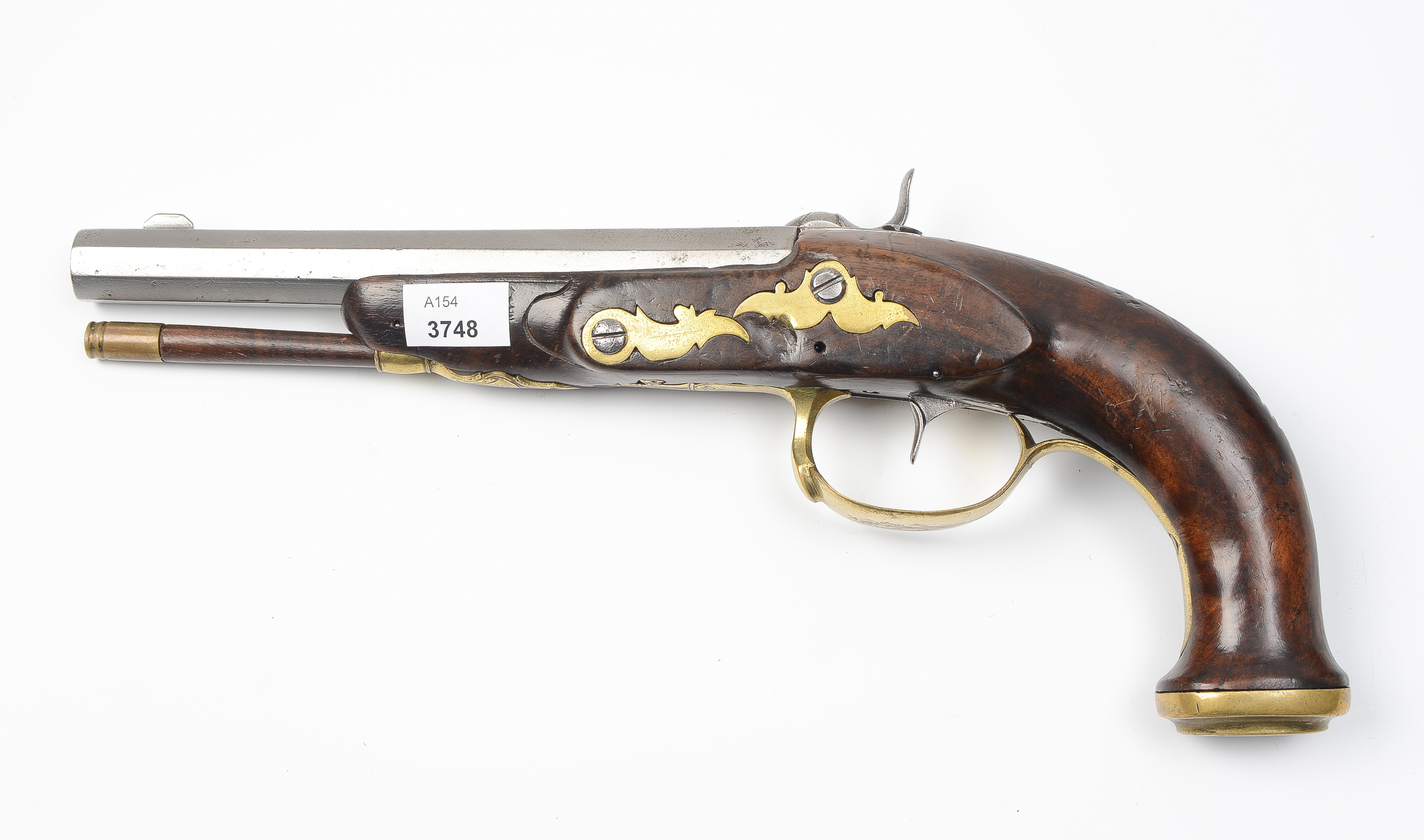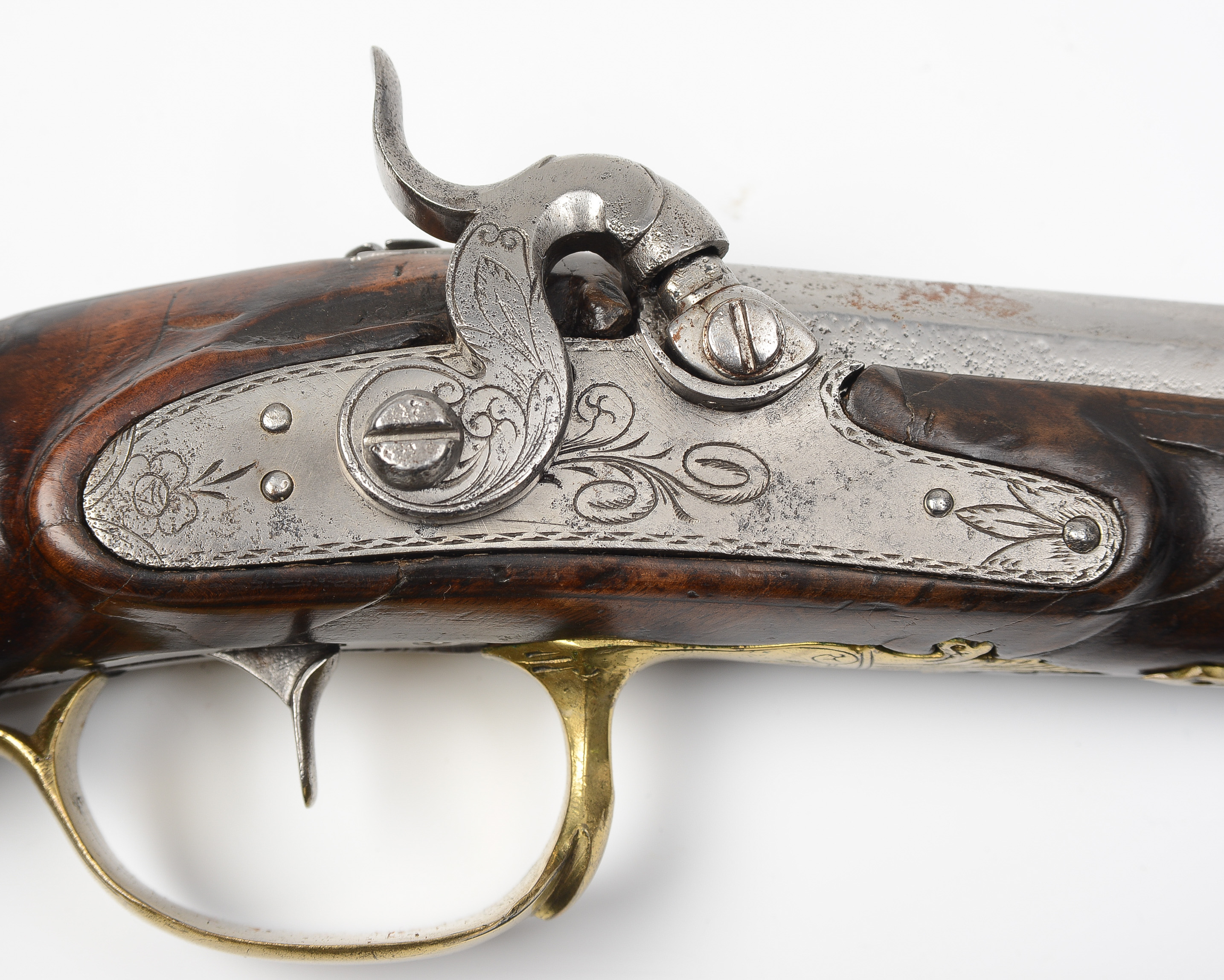 Belgien, 19.Jh. Oktogonaler Lauf, (L ca. 17 cm), Kal. 15 mm, Korn. Schlossplatte und Hahn flach, florale Gravuren. Ziselierte und vergoldete Messinggarnituren, Nussbaumschaft, Griff mit Messingkappe. Holzladestock. L ca. 30 cm.