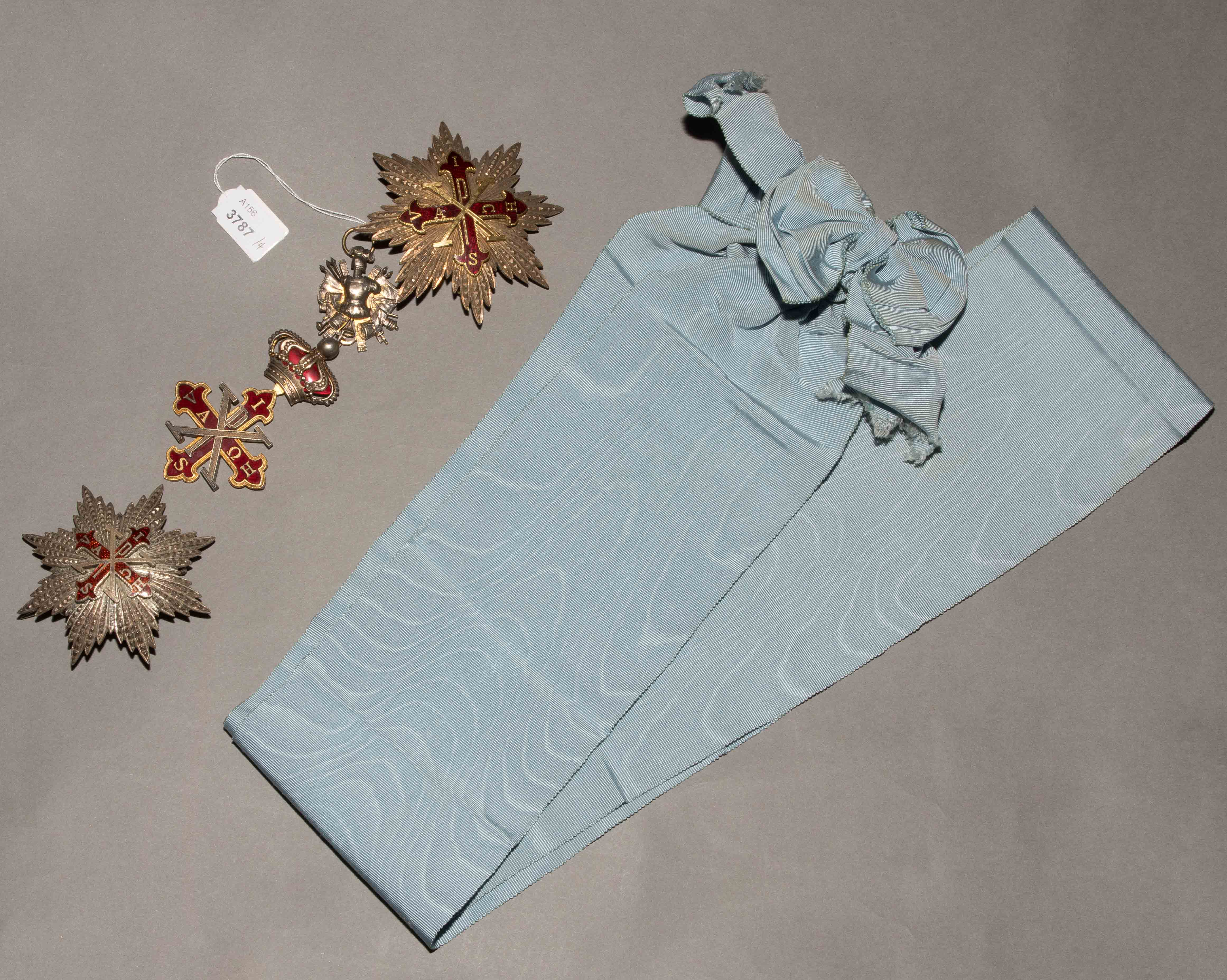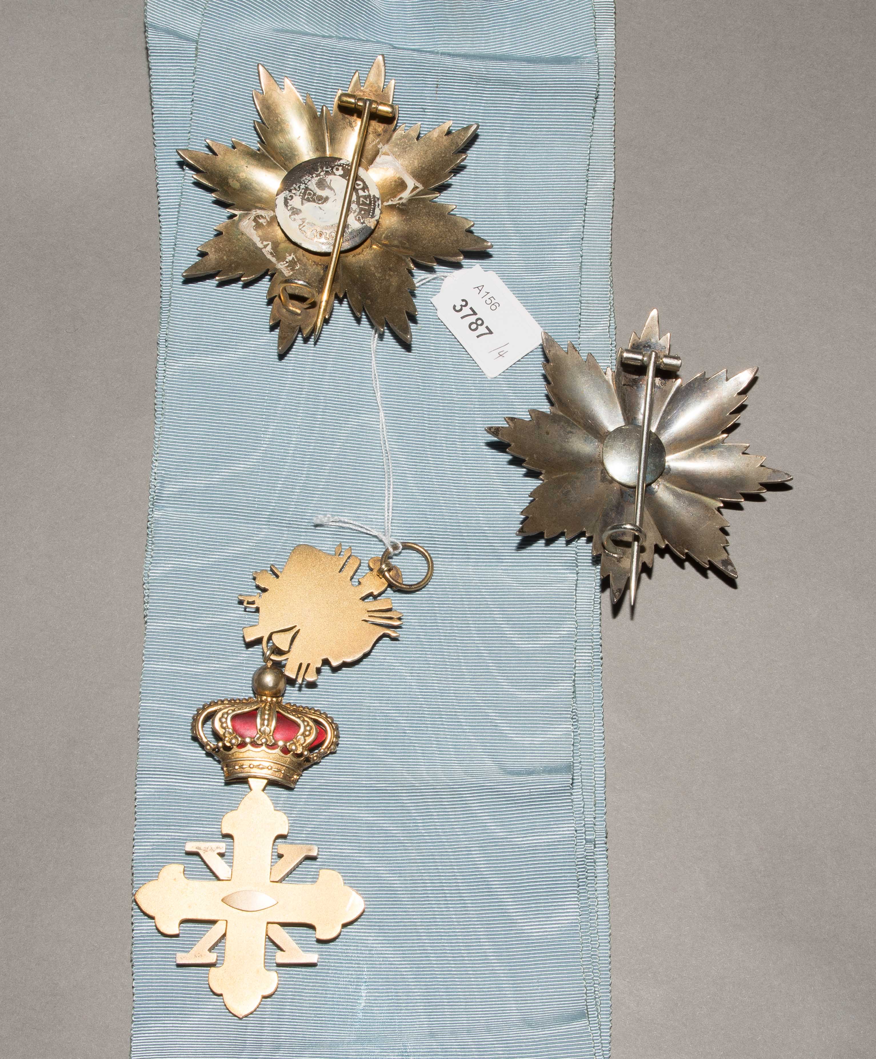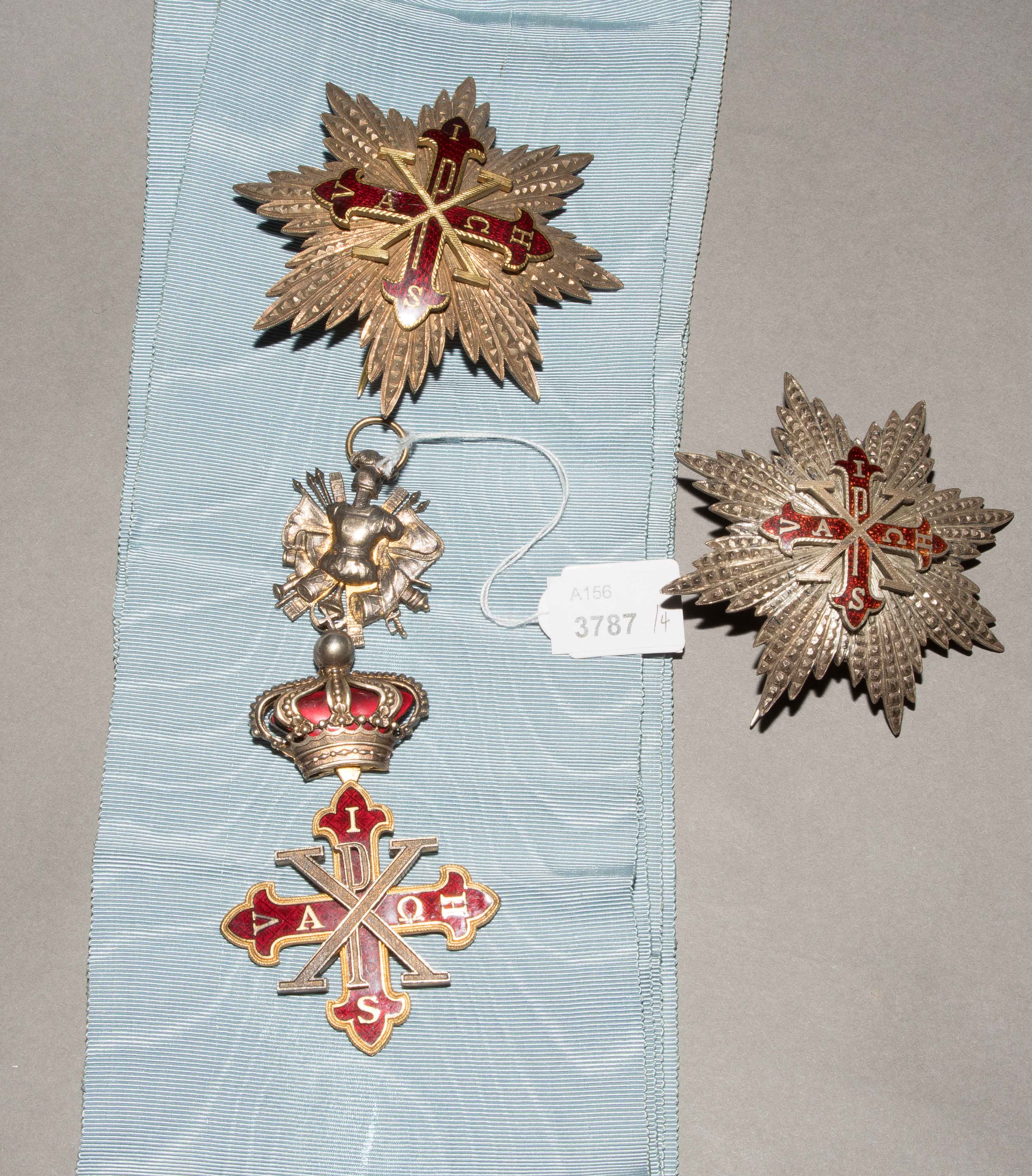 Silber teilweise vergoldet. Bestehend aus Grosskreuz und 2 Bruststernen. Rot emailliertes Lilienkreuz mit gefüllter Krone und Verzierung dazu 2 Bruststerne. Mit hellblauem Schulterband. 5x12 cm und D 8, bzw. 7,5 cm. zus. 156 g.