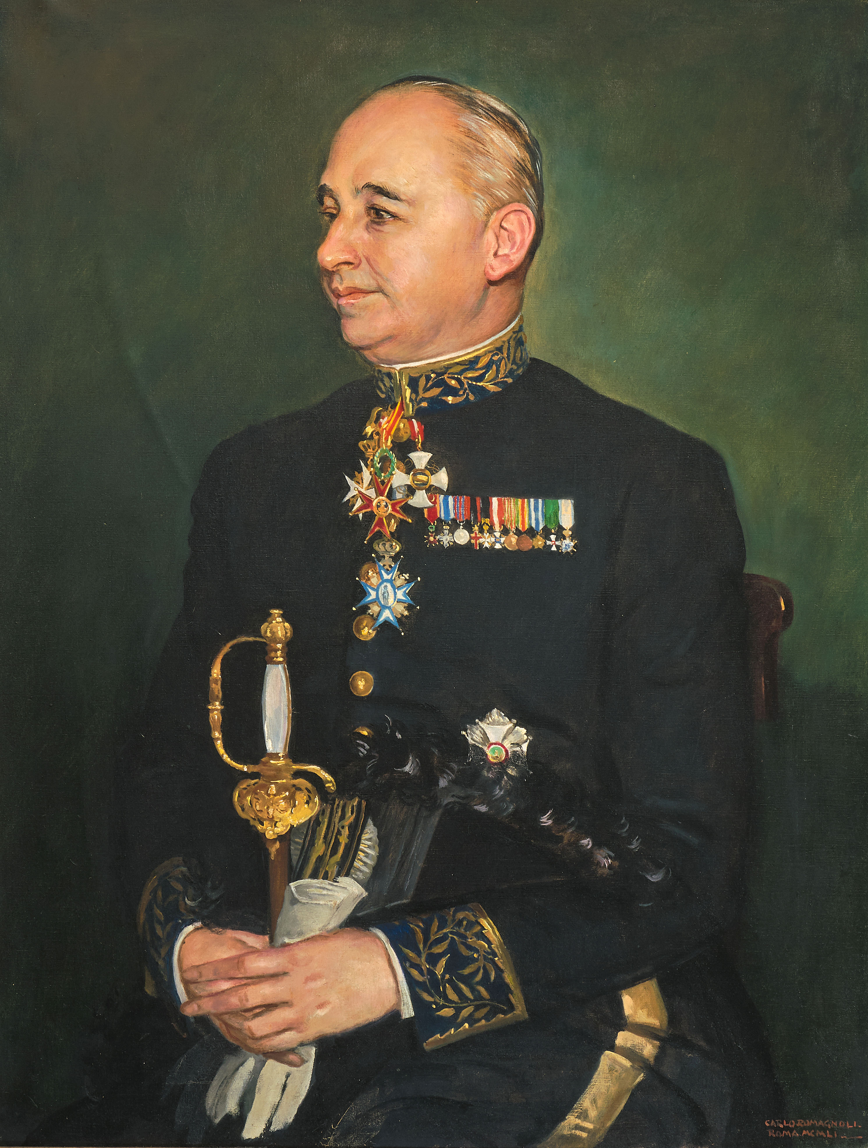 Portrait von Conte Camillo Paolo Antonini, Kämmerer der Päpste Pius XI, Pius XII, Johannes XXII und Paul VI. Öl auf Leinwand. Unten rechts signiert und datiert 1951. 88x66 cm.