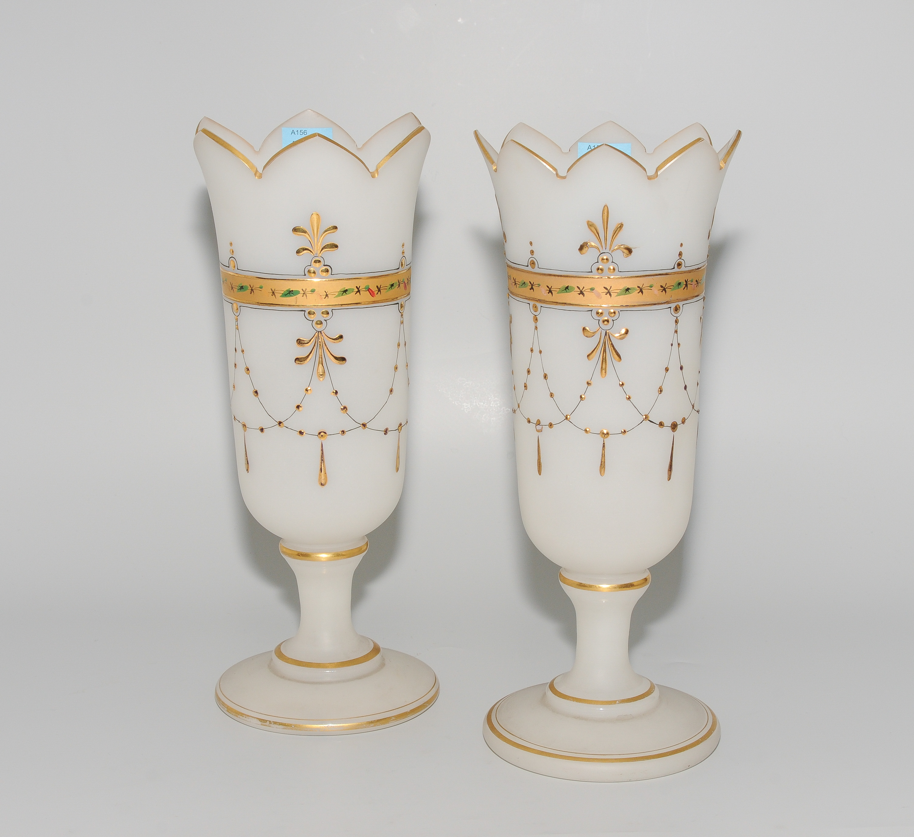 Um 1920. Milchiges, satiniertes Glas. Wandung mit umlaufender goldfarbener Bordüre, darunter Girlanden und Palmetten. Konischer Gefässkörper über rundem Fuss. H 28,7 cm.